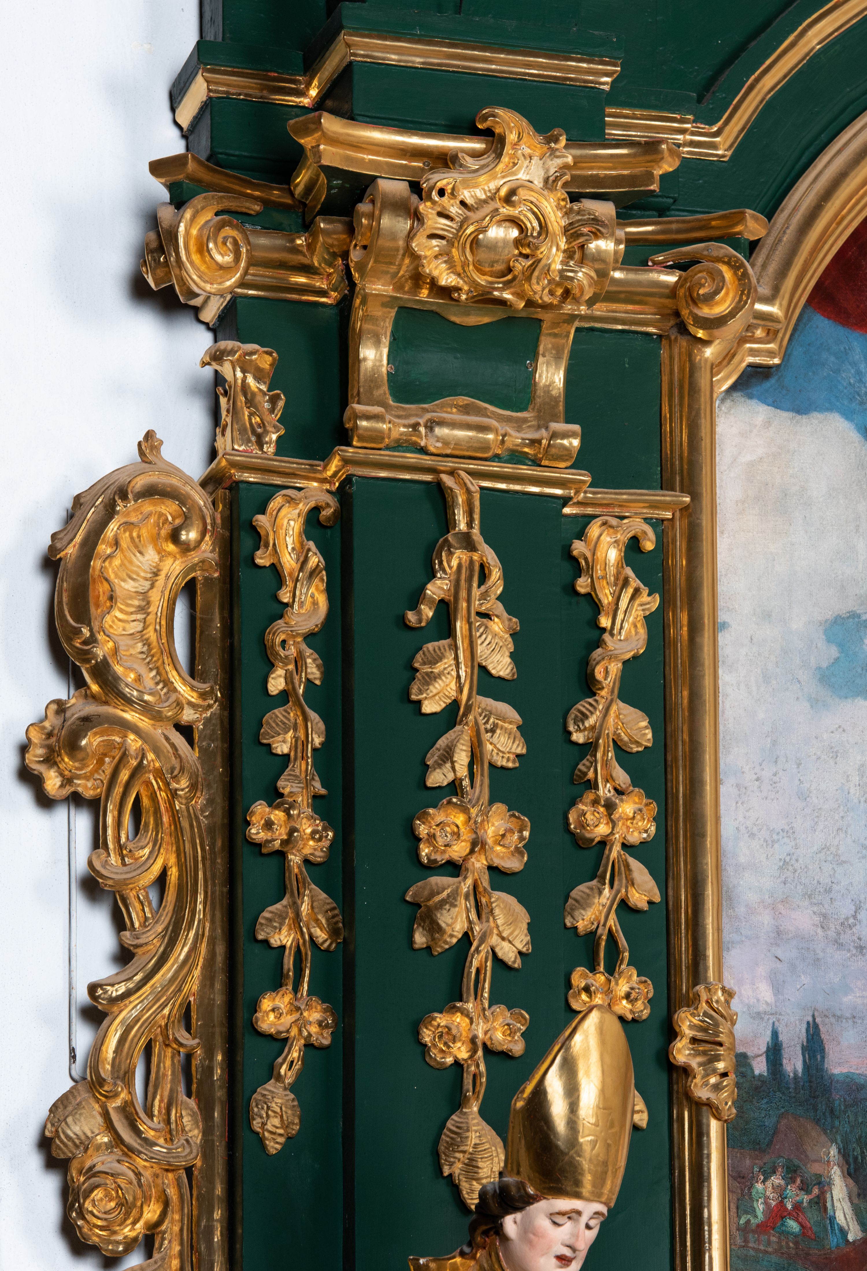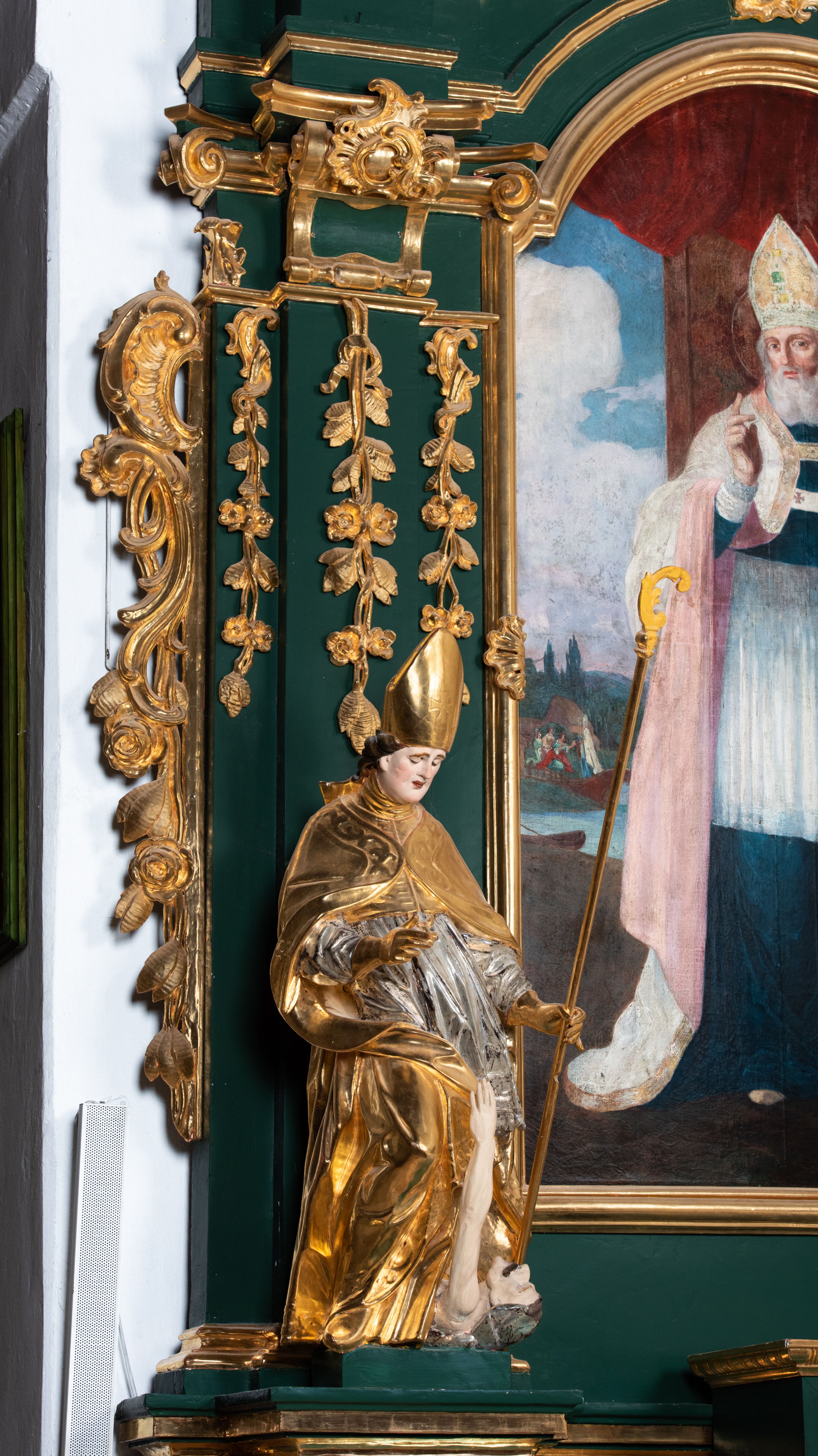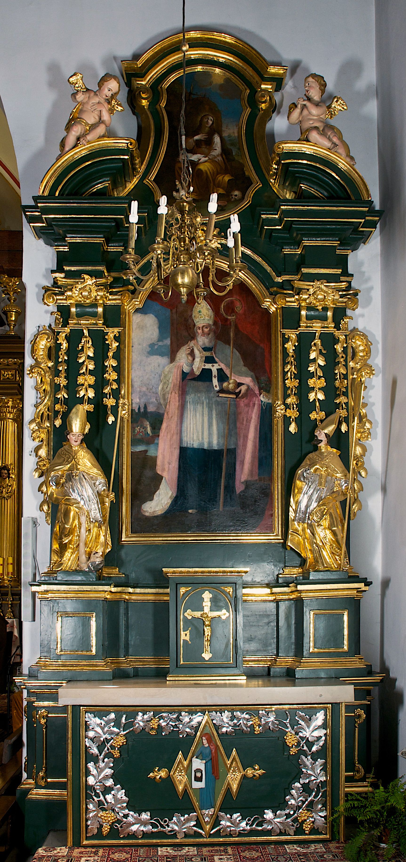 Ołtarz przyścienny, architektoniczny, jednokondygnacyjny, jednoosiowy ze zwieńczeniem. Umieszczony na dwustopniowym, kamiennym podwyższeniu. Mensa prostopadłościenna, z portatylem i współczesnym antepedium ozdobionym postacią św. Weroniki trzymającej chustę z odbiciem twarzy Chrystusa (veraikon) i rzeźbionym ornamentem ze srebrzonych liści i złoconych kiści winogron; tło w kolorze struktury ołtarza. Retabulum na wysokim profilowanym, dwustopniowym cokole, flankowane zwielokrotnionymi pilastrami z jońskimi kapitelami. Pilastry dźwigają przerwane belkowanie z wydatnym profilowanym gzymsem z przerwanym przyczółkiem. Zwieńczenie o wklęsłych bokach ujęte spływami wolutowymi dźwigającymi gzyms w formie nadwieszonego łuku odcinkowego. Na tle pilastrów ustawione na profilowanych impostach rzeźby: po prawej stronie św. Wojciecha, po lewej św. Stanisława. Na przyczółkach znajdują się siedzące putta. Pole środkowe o kształcie prostokąta stojącego od góry zamkniętego łukiem półkolistym nadwieszonym, w kluczu ornament z motywu rocaille. Wewnątrz pola ujęty profilowaną, złoconą ramą obraz z przedstawieniem św. Mikołaja z Miry. W zwieńczeniu obraz w ramie z wklęsłymi bokami i wypukłymi dolną i górną krawędzią przedstawiający św. Marię Magdalenę. Nastawę ujmują ornamentalne uszy, utworzone z motywów rocaille'owych i liściasto-kwiatowych zwisów. Na kapitele są nałożone rocaille'owe kartusze, a pod nimi podwieszone zwisające ulistnione i ukwiecone gałązki wzbogacone motywami rocaille'ów. Struktura ołtarza polichromowana w kolorze ciemnozielonym. Bazy pilastrów, kapitele, uszy, ornamenty, profilowania, obramienia płycin i ramy obrazów złocone. Rzeźby świętych złocone, srebrzone i polichromowane. Rzeźby aniołków złocone i polichromowane.