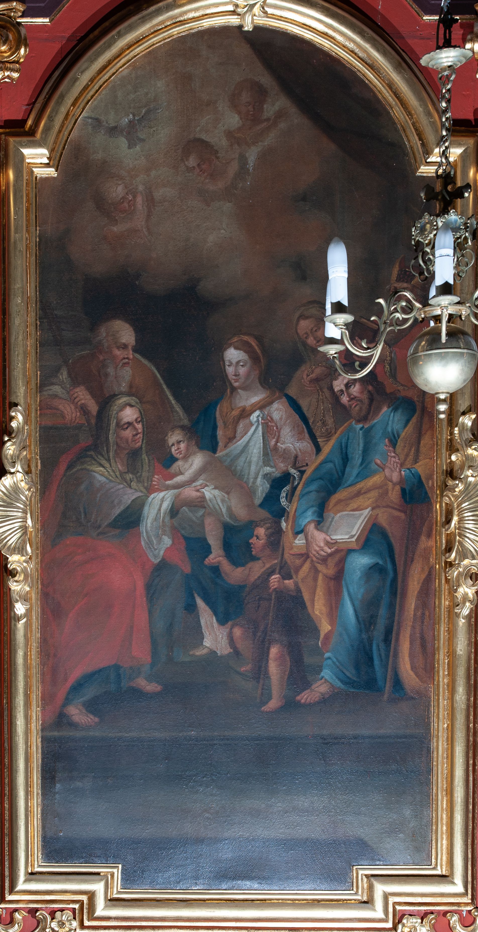W polu środkowym wycięta wnęka ujęta profilowaną ramą w kształcie stojącego prostokąta, zamkniętego łukiem nadwieszonym. We wnęce obraz z przedstawieniem Świętej Rodziny, nad którym rzeźbiony kartusz formowany z ornamentu rocaille'owego.