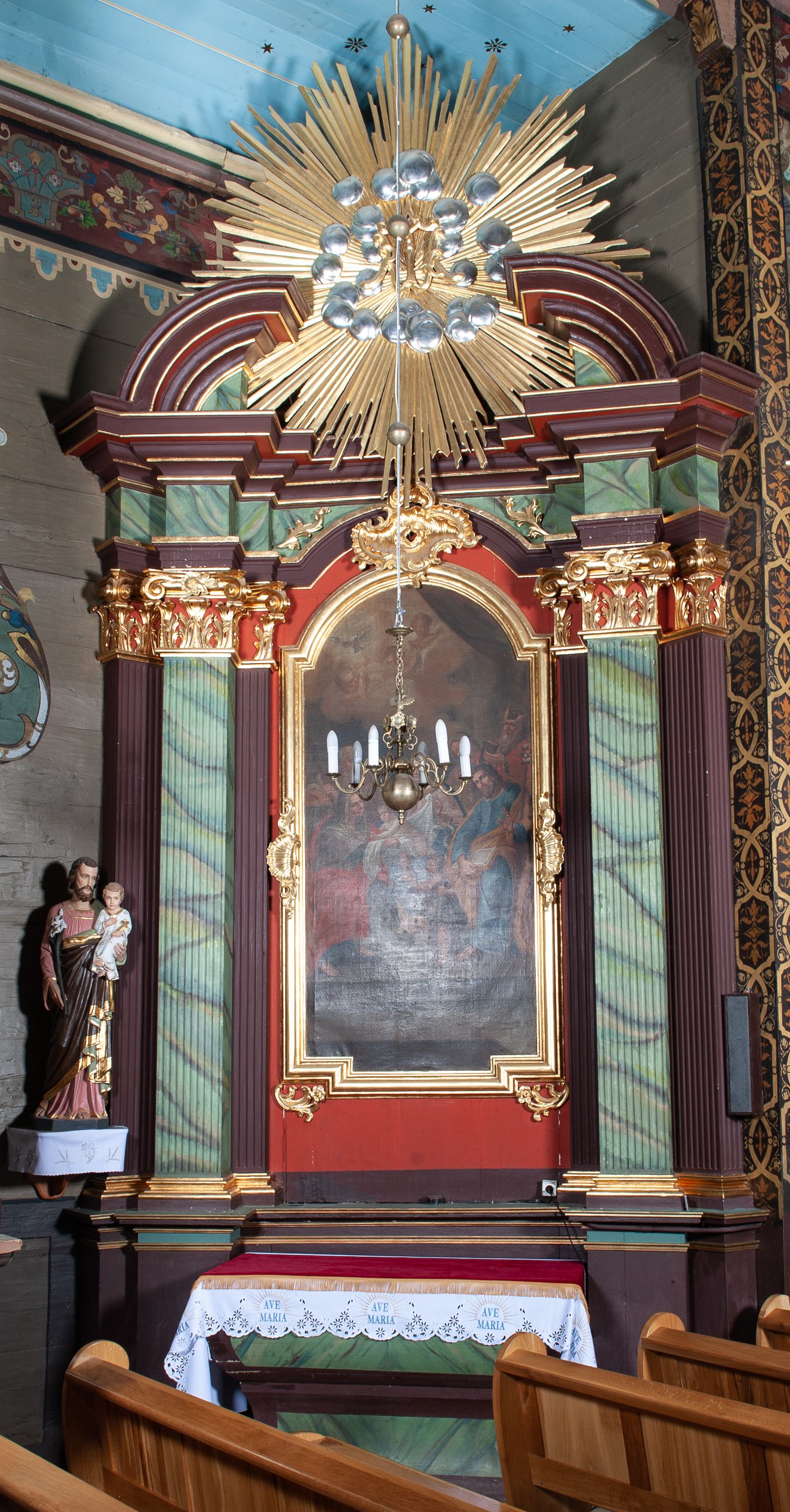 Całość struktury ołtarza malowana w kolorze ciemnobrązowym, Półfilary, fryz oraz mensa pokryte malowaną marmoryzacją w odcieniach zieleni, pole środkowe ciemnoczerwone, detal architektoniczny i profilowania pozłacane.