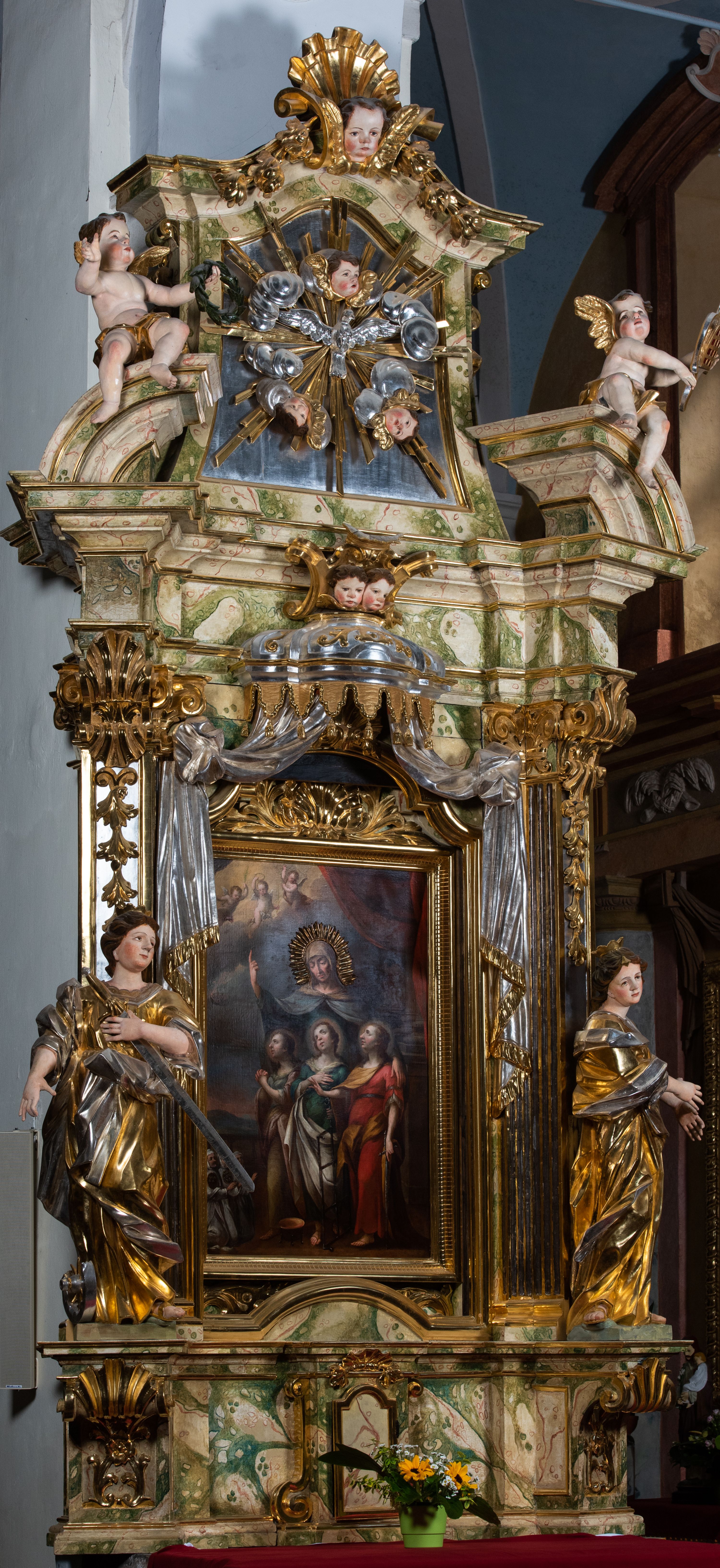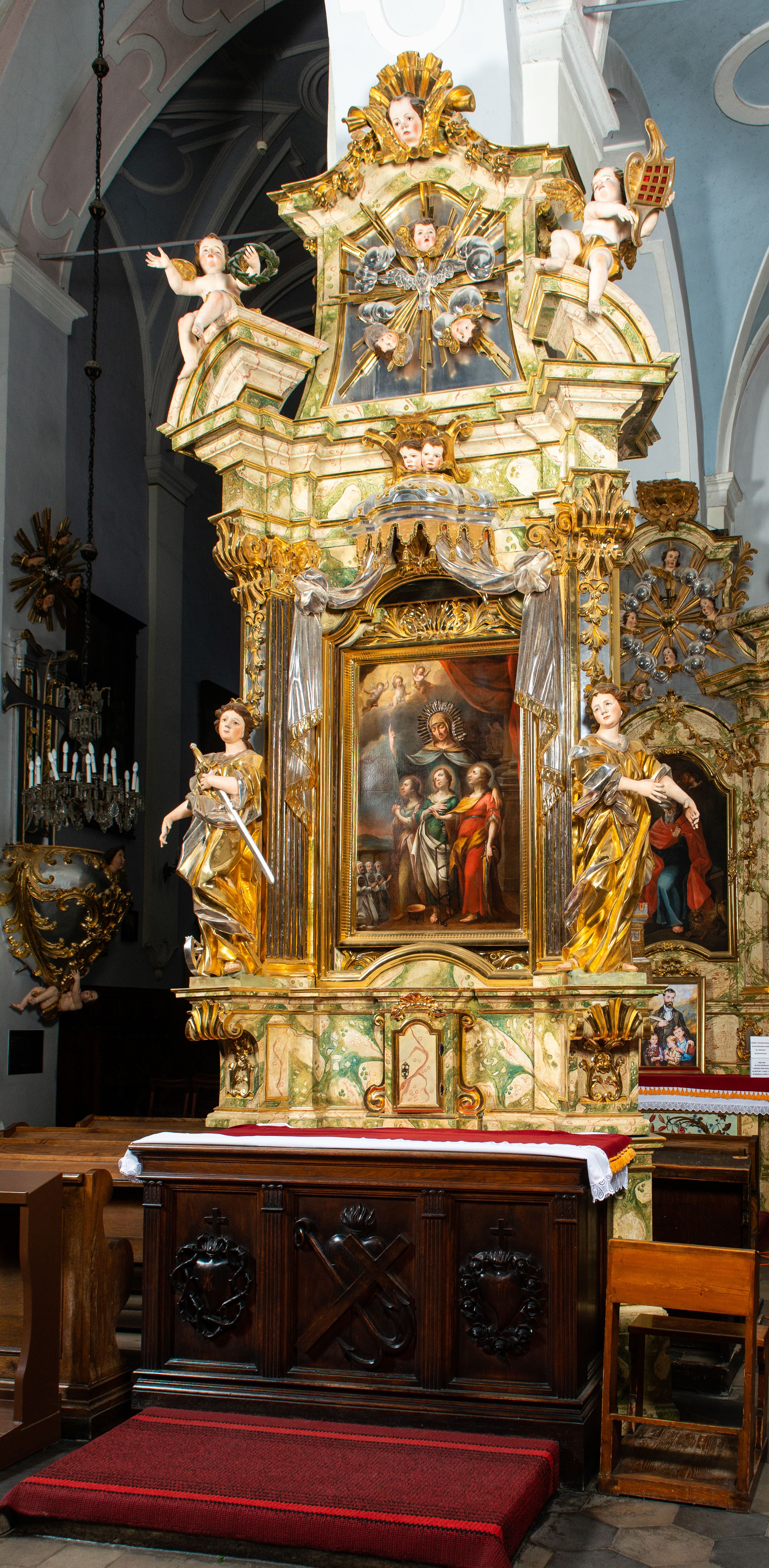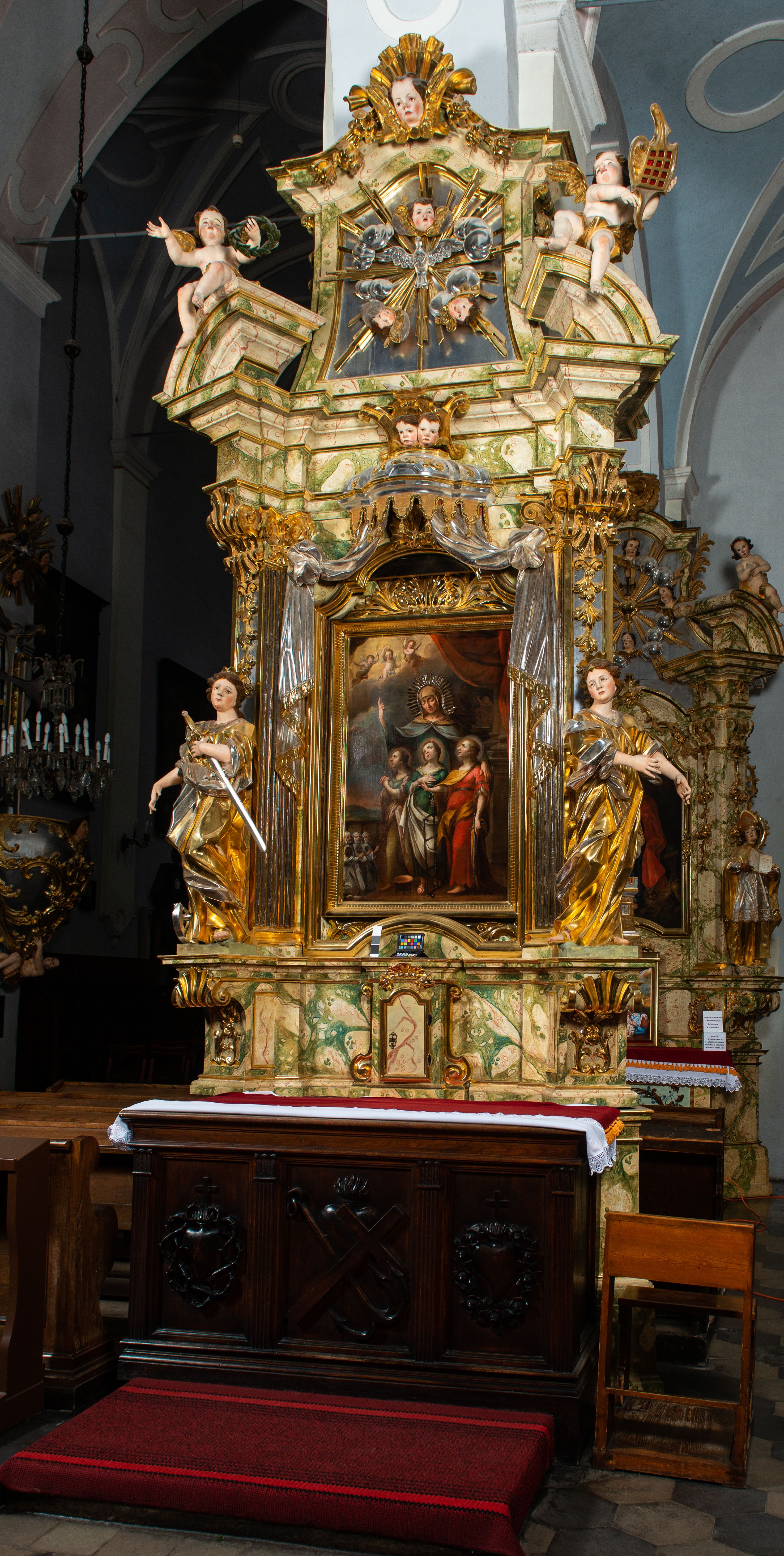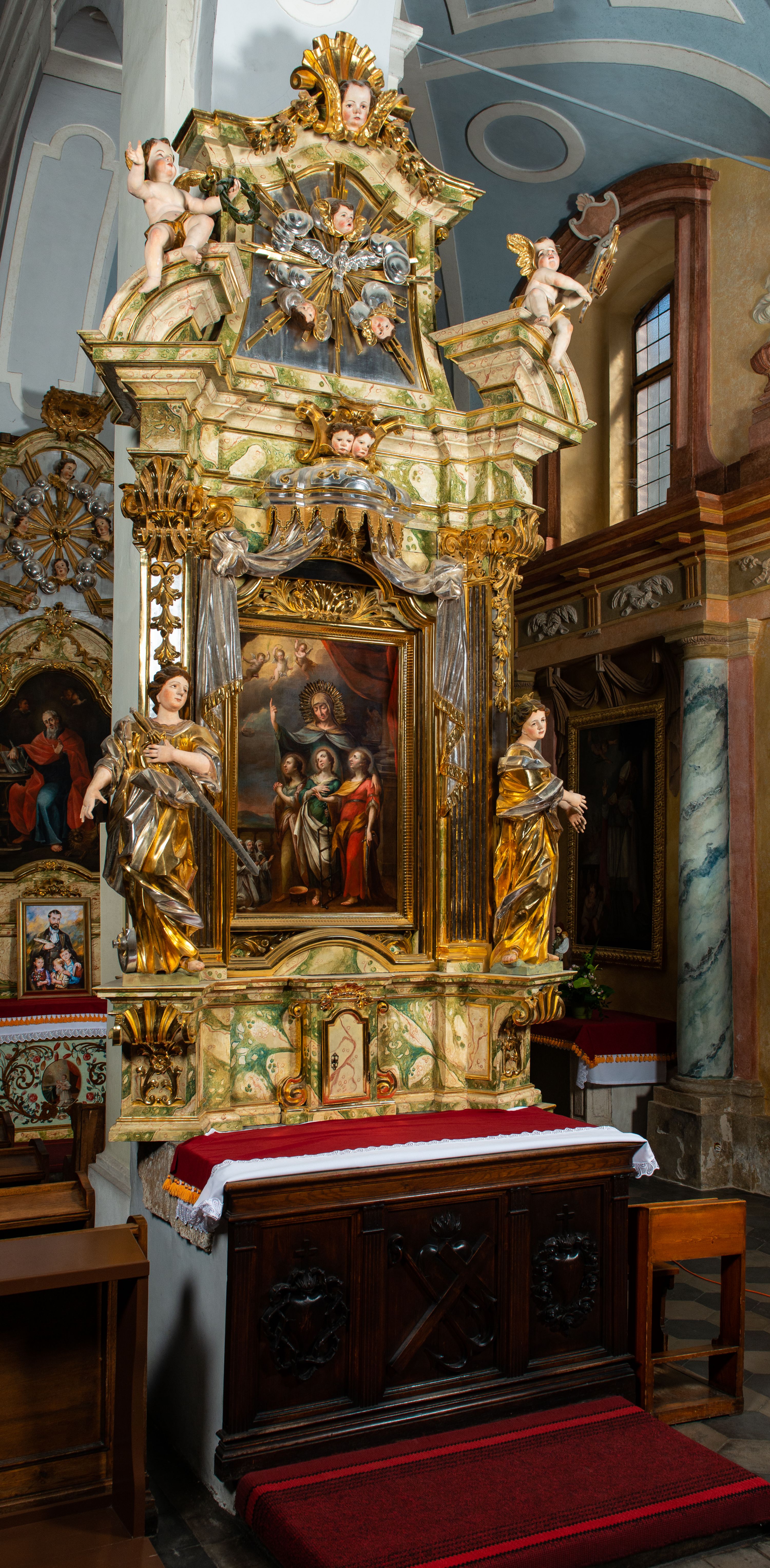 Ołtarz drewniany, prostopadłościenny z kamienną mensą, z kamiennym portatylem. Antepedium drewniane podzielone na trzy płyciny za pomocą pilastrów: w środkowej krzyż, kotwica i gorejące serce, w bocznych gorejące serce w koronie cierniowej i wieńcu z róż. Nastawa ołtarzowa architektoniczna, jednoosiowa, jednokondygnacyjna ze zwieńczeniem na cokole. Retabulum flankowane parą zdwojonych pilastrów zakończonych konsolami, które dźwigają pełne belkowanie oraz fragmenty przerwanego półkolistego przyczółka z siedzącymi puttami. Na tle pilastrów, na konsolach ustawione 2 figury: św. Katarzyny oraz Barbary. Trzony pilastrów dekorowane kampanulami. W Polu środkowym wnęka w formie stojącego prostokąta zamkniętego łukiem segmentowym nadwieszonego z uskokiem ujęta profilowaną ramą, z obrazem świętej Zofii z córkami, w osobnej ramie. Nad wnęką baldachim dekorowany lambrekinem, z podwieszoną tkaniną po dwóch stronach, lamowaną frędzlą. Nam baldachimem kartusz z uskrzydlonymi główkami anielskimi i zwieńczony koroną. Zwieńczenie w formie zbliżonej do trapezu o wklęsłych bokach zamknięte falistym gzymsem, dekorowanym uskrzydloną główką anielską, ujętą wolutami na tle muszli, z podwieszonymi kampanulami. W polu gołębica w otoku z obłoków i uskrzydlonych główek anielskich, w glorii promienistej. Struktura polichromowana w sposób imitujący marmoryzację w kolorze beżowo-zielonym. Ornamentyka i profile złocone, detal i zwieńczenie srebrzone.