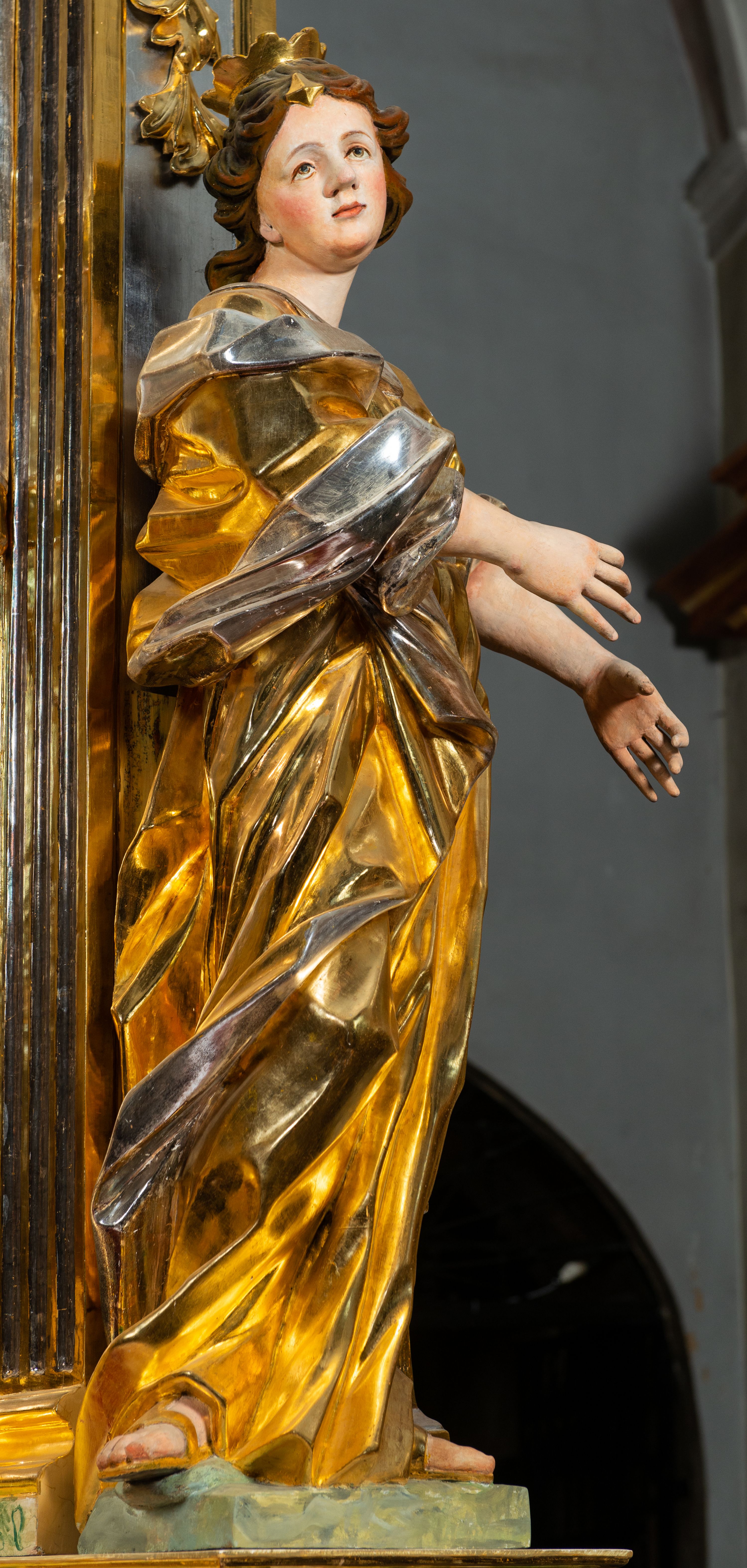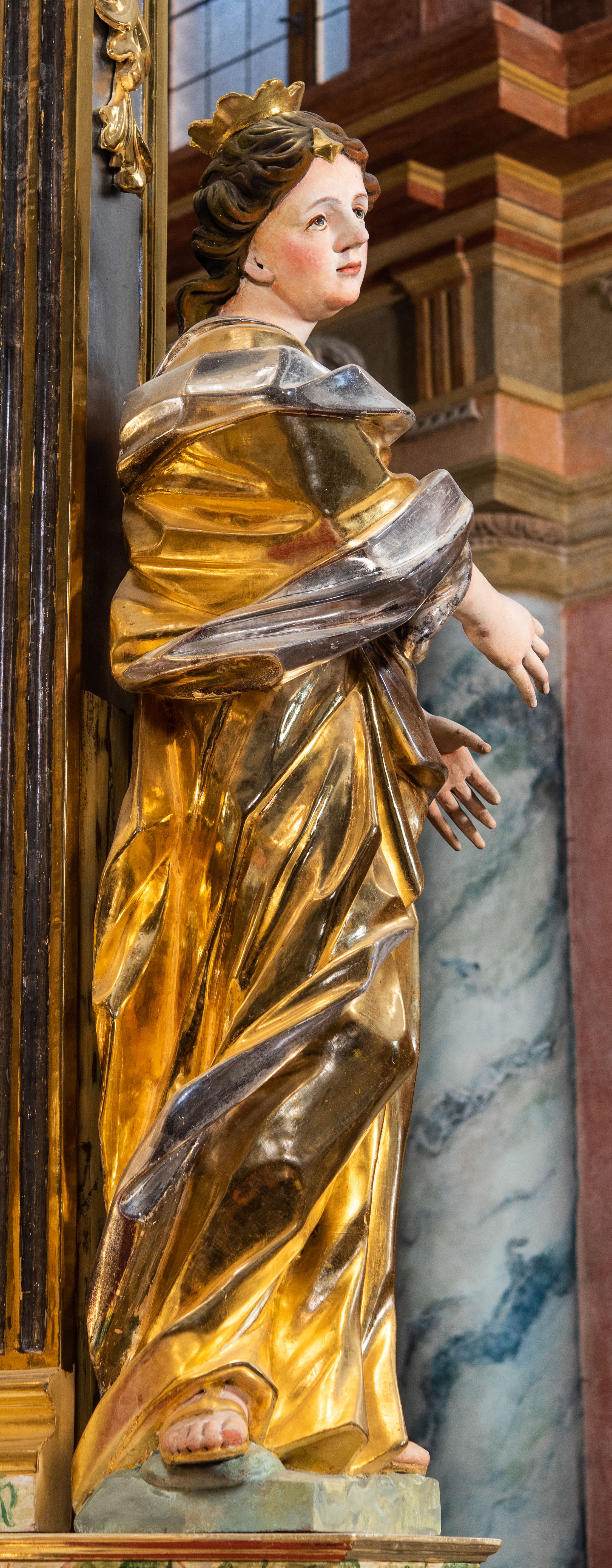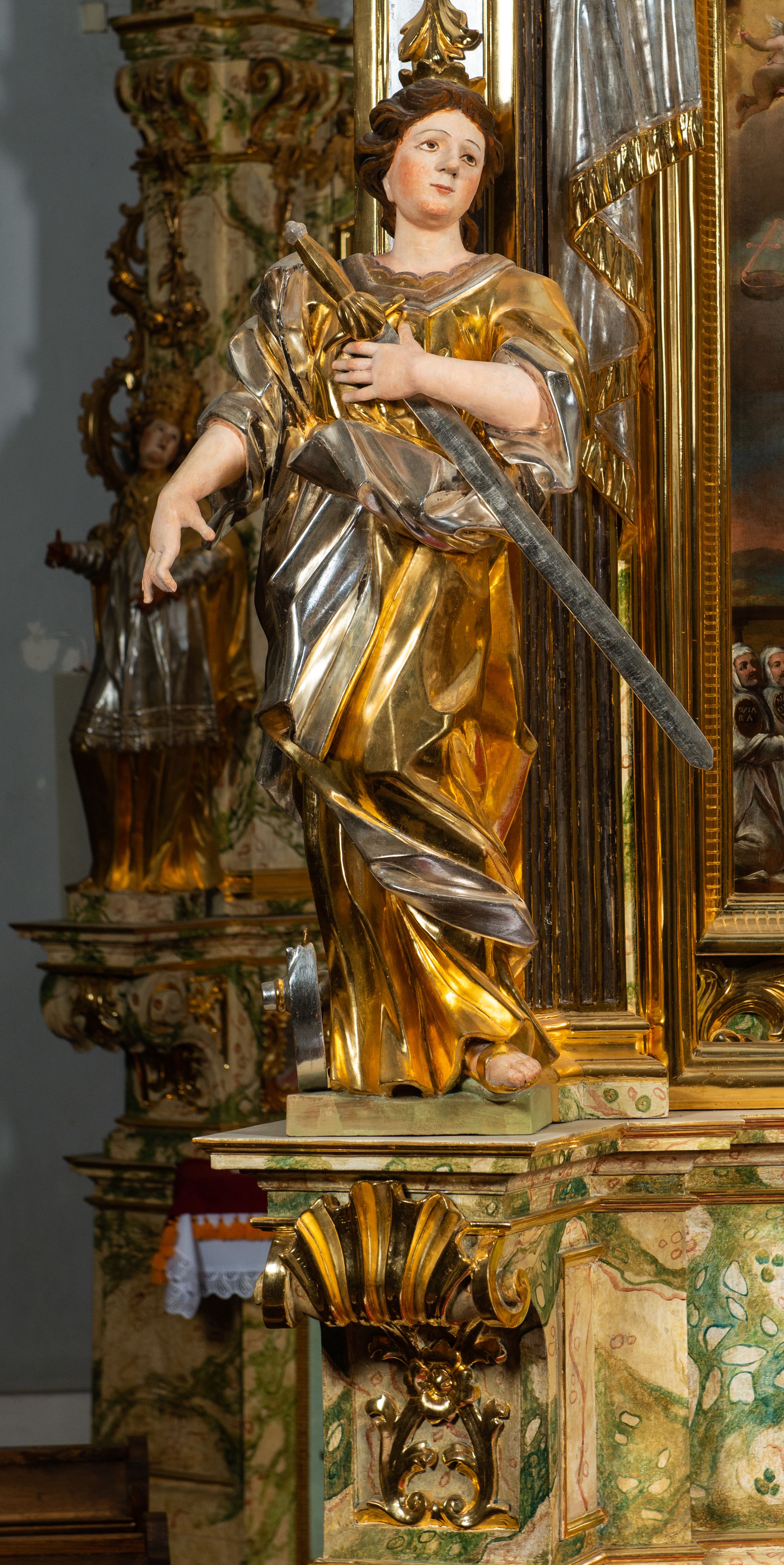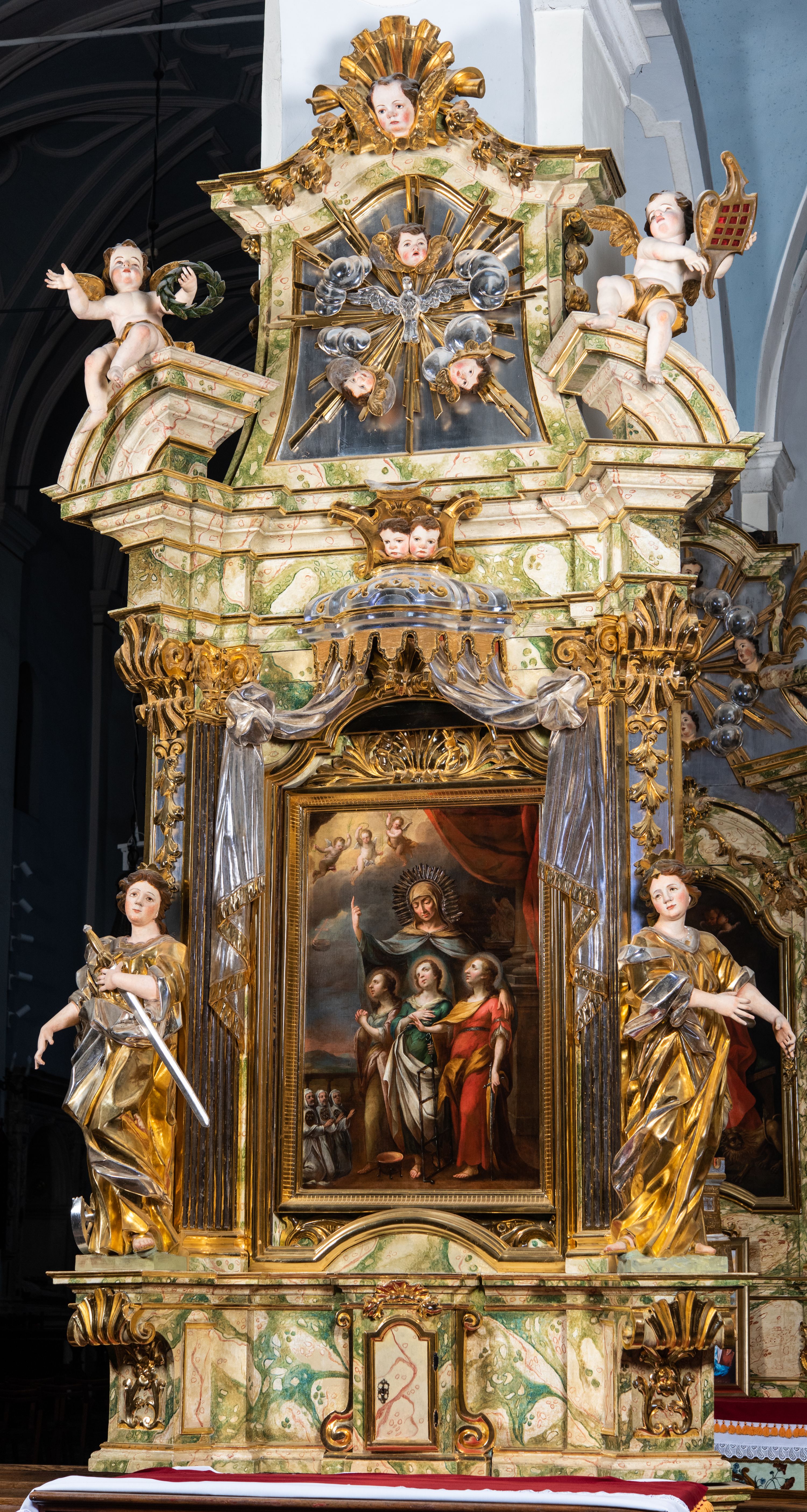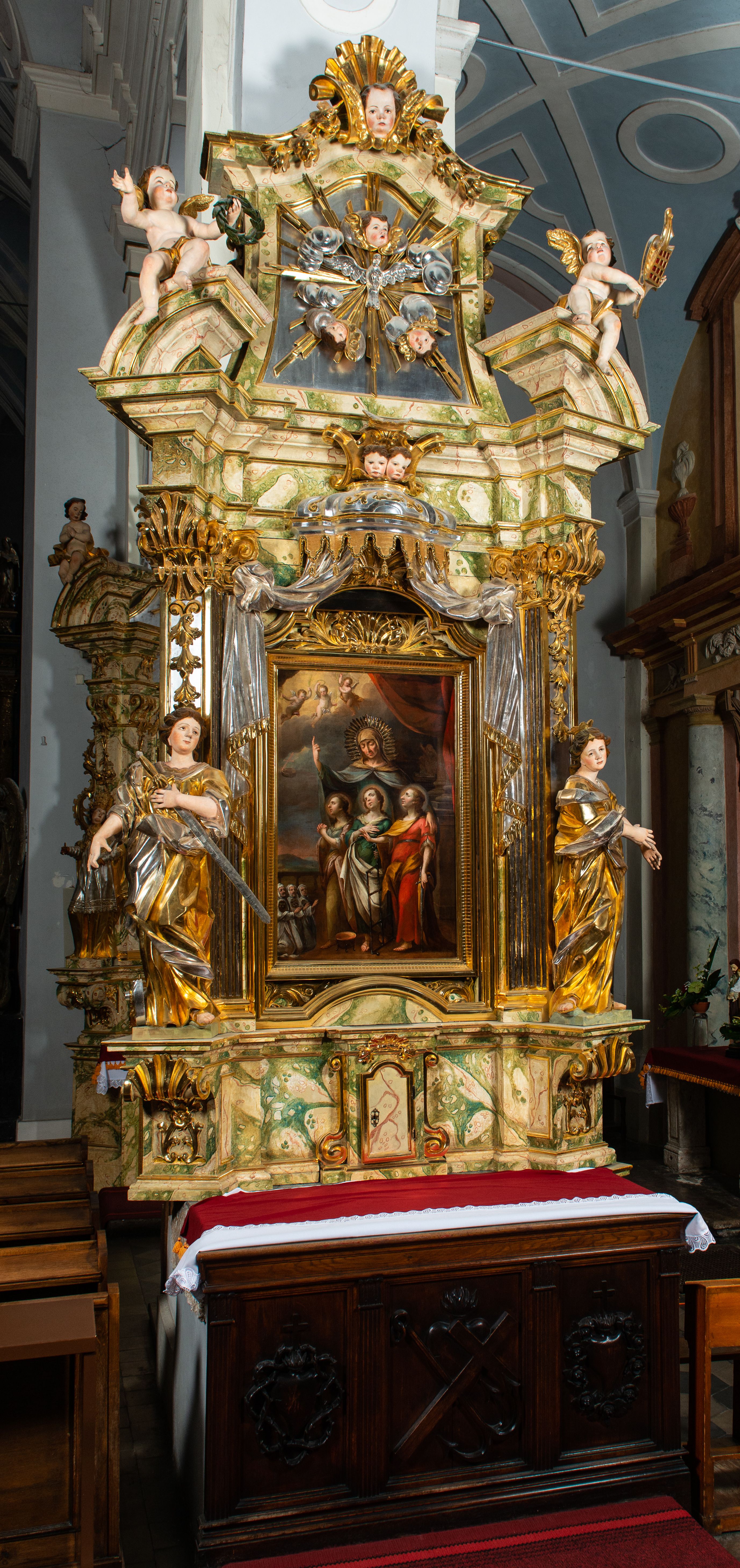 Ołtarz drewniany, prostopadłościenny z kamienną mensą, z kamiennym portatylem. Antepedium drewniane podzielone na trzy płyciny za pomocą pilastrów: w środkowej krzyż, kotwica i gorejące serce, w bocznych gorejące serce w koronie cierniowej i wieńcu z róż. Nastawa ołtarzowa architektoniczna, jednoosiowa, jednokondygnacyjna ze zwieńczeniem na cokole. Retabulum flankowane parą zdwojonych pilastrów zakończonych konsolami, które dźwigają pełne belkowanie oraz fragmenty przerwanego półkolistego przyczółka z siedzącymi puttami. Na tle pilastrów, na konsolach ustawione 2 figury: św. Katarzyny oraz Barbary. Trzony pilastrów dekorowane kampanulami. W Polu środkowym wnęka w formie stojącego prostokąta zamkniętego łukiem segmentowym nadwieszonego z uskokiem ujęta profilowaną ramą, z obrazem świętej Zofii z córkami, w osobnej ramie. Nad wnęką baldachim dekorowany lambrekinem, z podwieszoną tkaniną po dwóch stronach, lamowaną frędzlą. Nam baldachimem kartusz z uskrzydlonymi główkami anielskimi i zwieńczony koroną. Zwieńczenie w formie zbliżonej do trapezu o wklęsłych bokach zamknięte falistym gzymsem, dekorowanym uskrzydloną główką anielską, ujętą wolutami na tle muszli, z podwieszonymi kampanulami. W polu gołębica w otoku z obłoków i uskrzydlonych główek anielskich, w glorii promienistej. Struktura polichromowana w sposób imitujący marmoryzację w kolorze beżowo-zielonym. Ornamentyka i profile złocone, detal i zwieńczenie srebrzone.