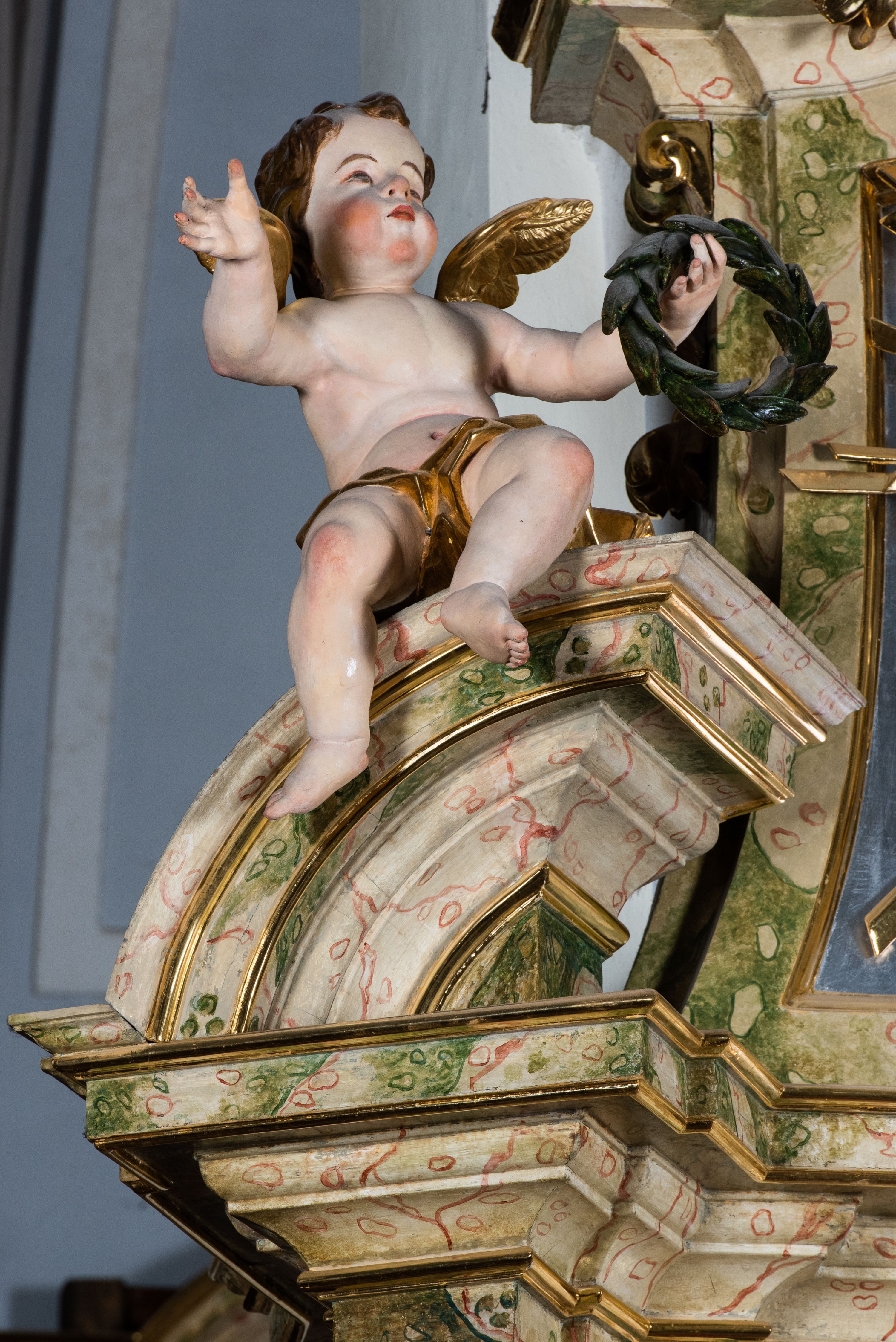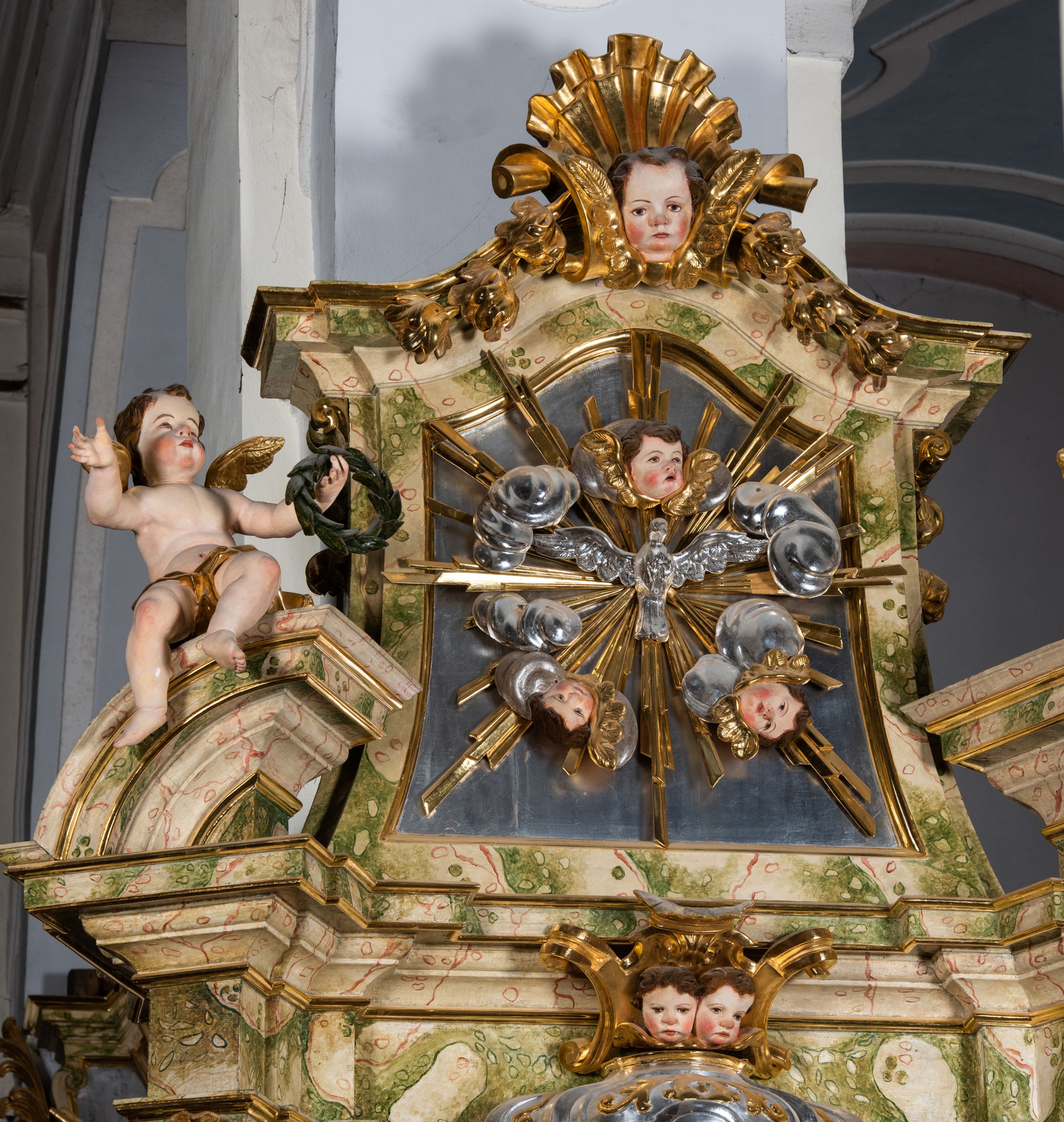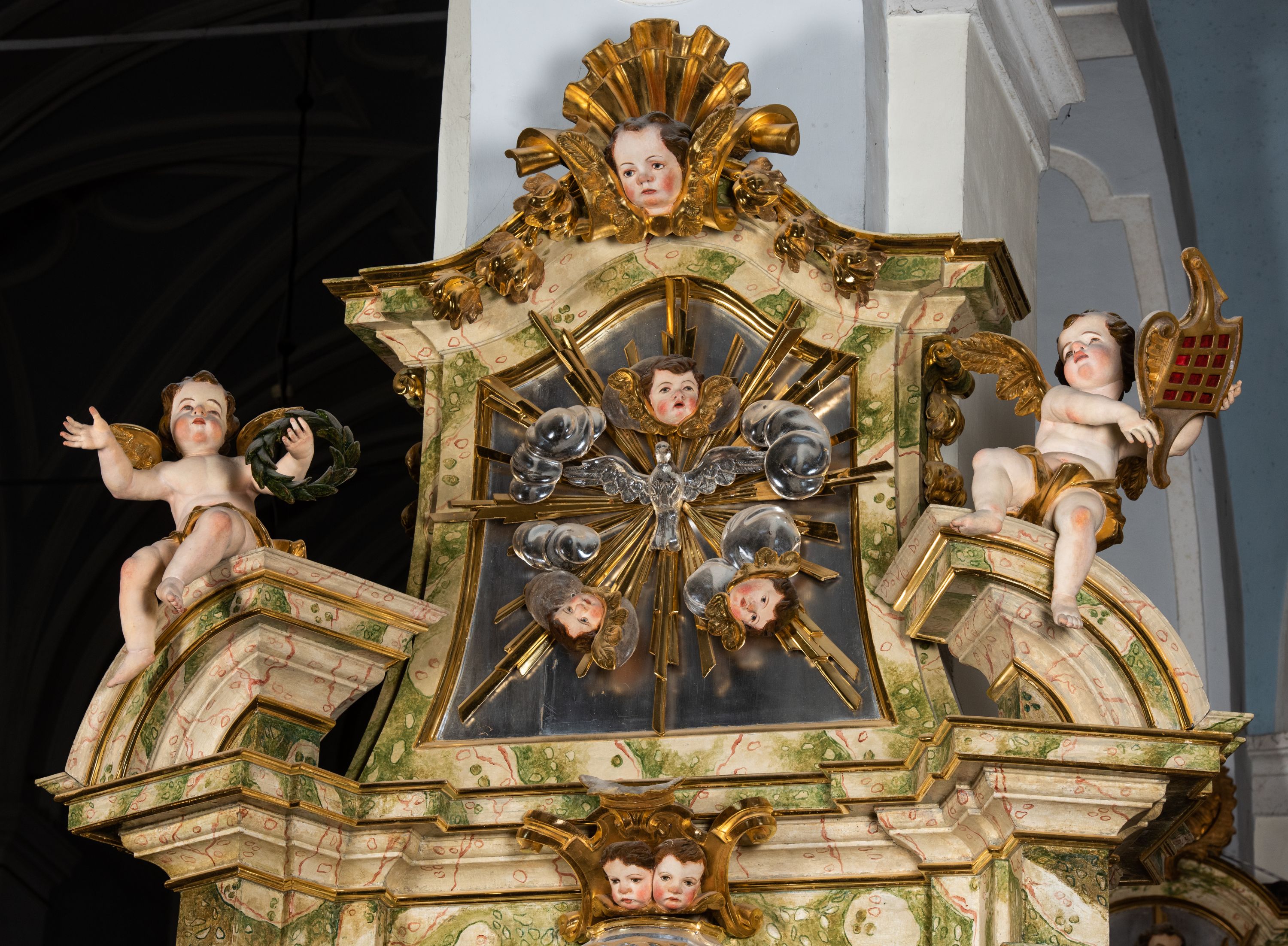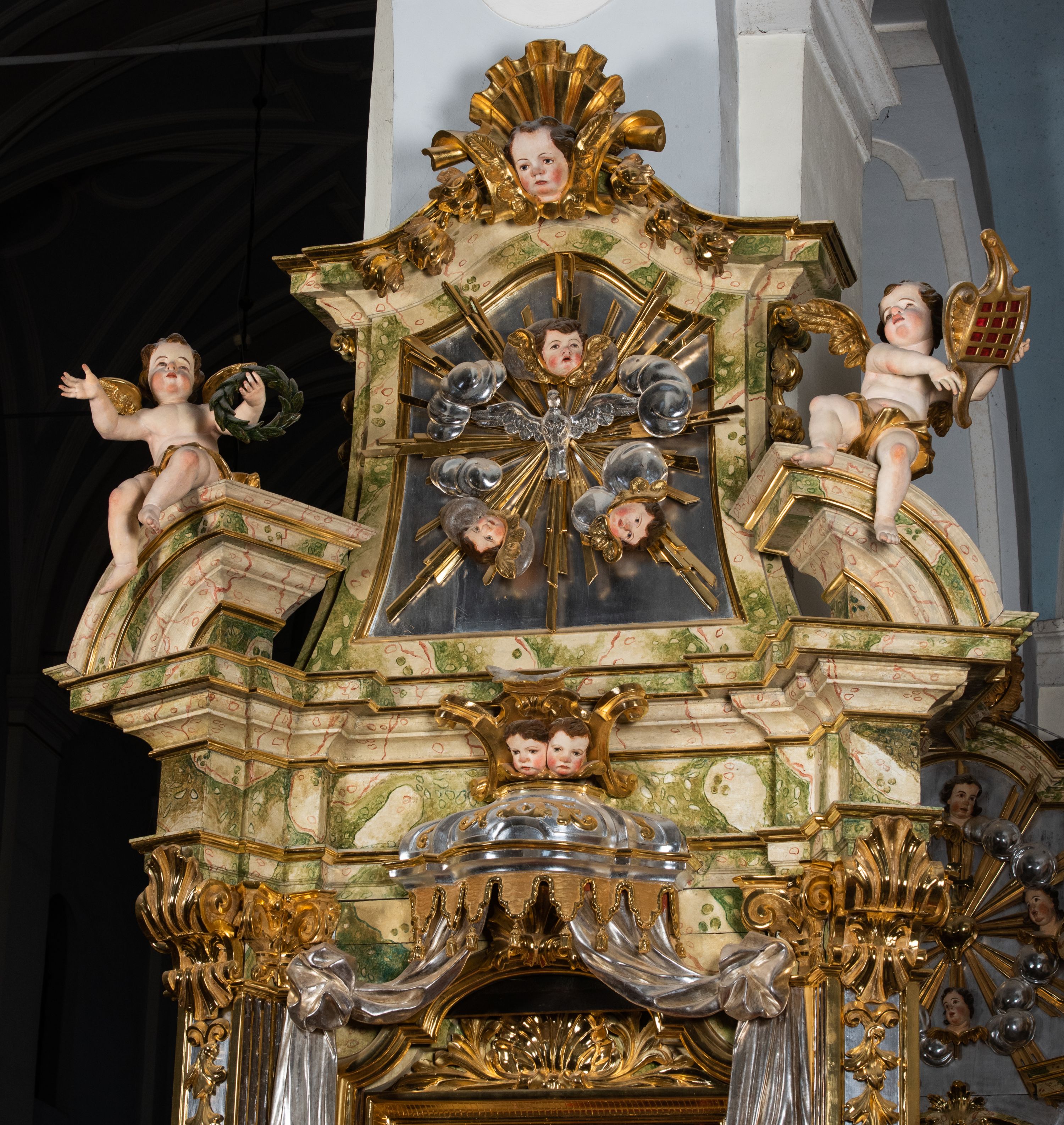 Ołtarz drewniany, prostopadłościenny z kamienną mensą, z kamiennym portatylem. Antepedium drewniane podzielone na trzy płyciny za pomocą pilastrów: w środkowej krzyż, kotwica i gorejące serce, w bocznych gorejące serce w koronie cierniowej i wieńcu z róż. Nastawa ołtarzowa architektoniczna, jednoosiowa, jednokondygnacyjna ze zwieńczeniem na cokole. Retabulum flankowane parą zdwojonych pilastrów zakończonych konsolami, które dźwigają pełne belkowanie oraz fragmenty przerwanego półkolistego przyczółka z siedzącymi puttami. Na tle pilastrów, na konsolach ustawione 2 figury: św. Katarzyny oraz Barbary. Trzony pilastrów dekorowane kampanulami. W Polu środkowym wnęka w formie stojącego prostokąta zamkniętego łukiem segmentowym nadwieszonego z uskokiem ujęta profilowaną ramą, z obrazem świętej Zofii z córkami, w osobnej ramie. Nad wnęką baldachim dekorowany lambrekinem, z podwieszoną tkaniną po dwóch stronach, lamowaną frędzlą. Nam baldachimem kartusz z uskrzydlonymi główkami anielskimi i zwieńczony koroną. Zwieńczenie w formie zbliżonej do trapezu o wklęsłych bokach zamknięte falistym gzymsem, dekorowanym uskrzydloną główką anielską, ujętą wolutami na tle muszli, z podwieszonymi kampanulami. W polu gołębica w otoku z obłoków i uskrzydlonych główek anielskich, w glorii promienistej. Struktura polichromowana w sposób imitujący marmoryzację w kolorze beżowo-zielonym. Ornamentyka i profile złocone, detal i zwieńczenie srebrzone.