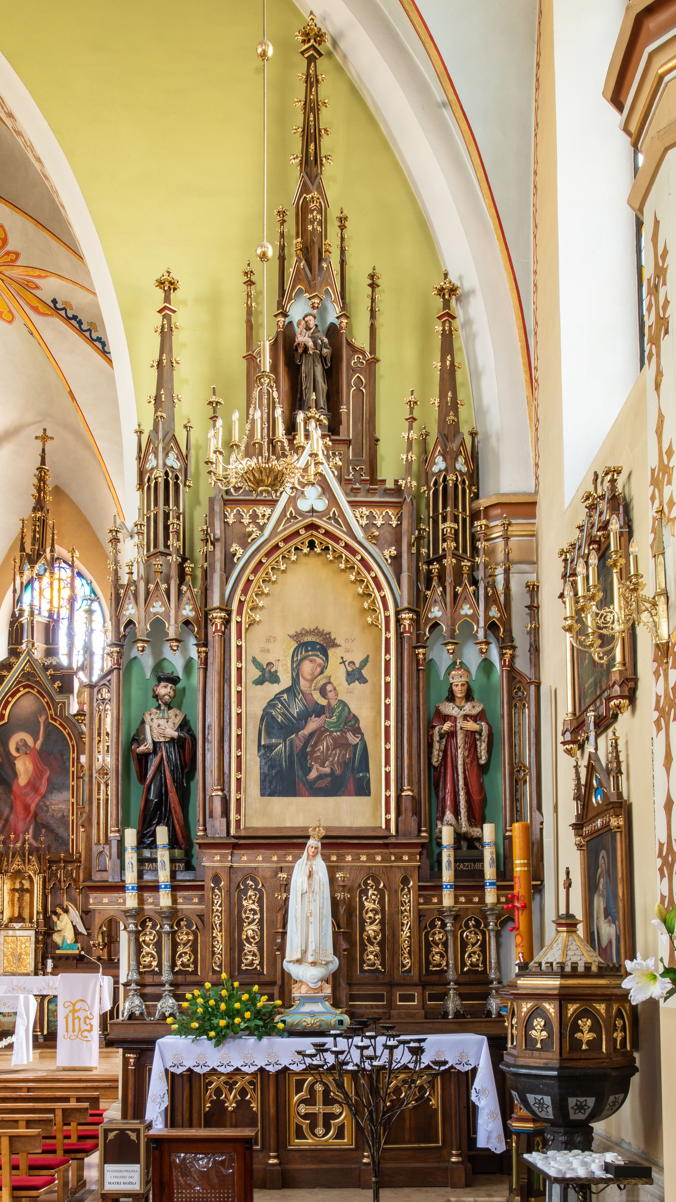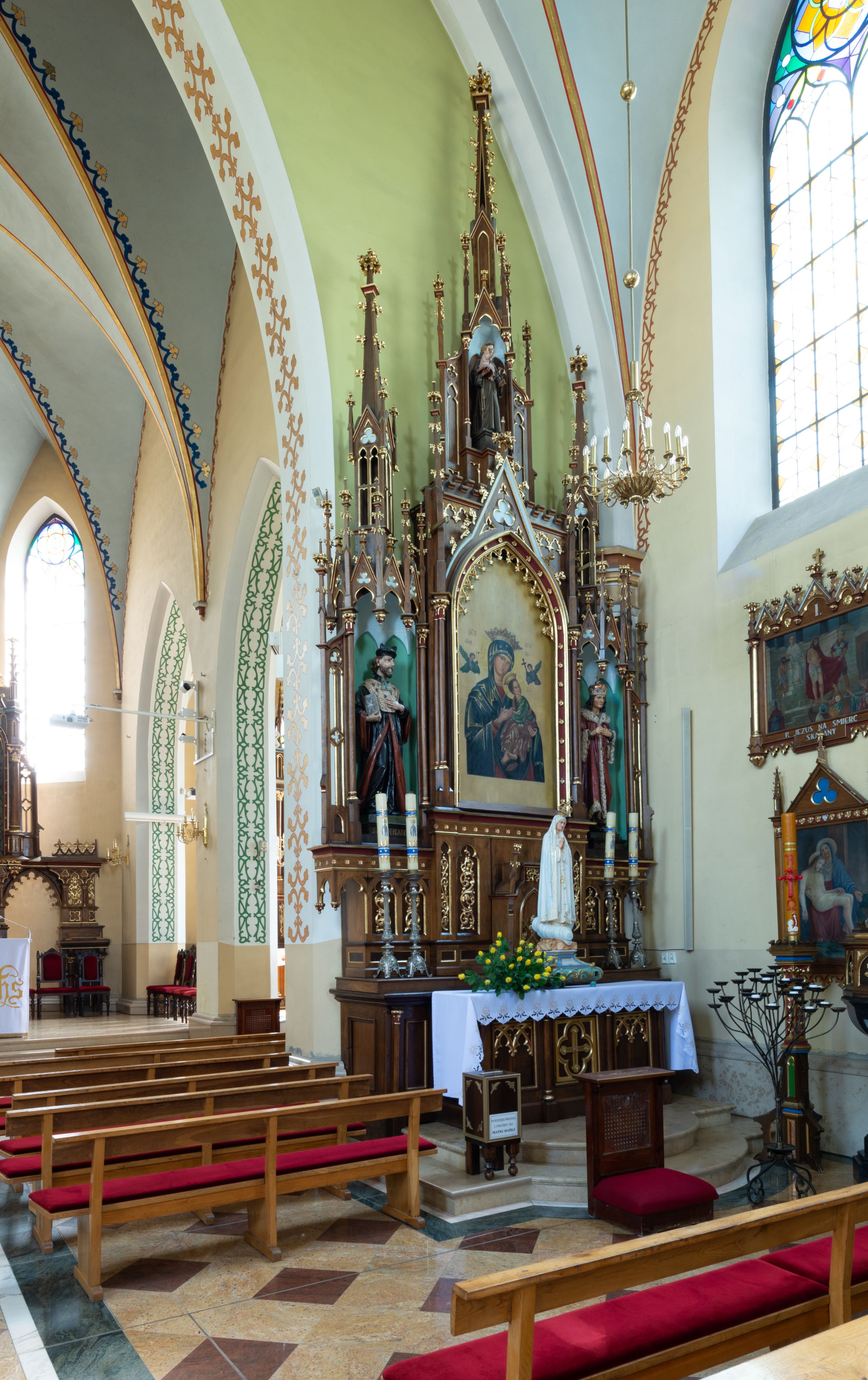 Neogotycki, przyścienny, jednokondygnacyjny ołtarz Świętej Rodziny uzyskał architektoniczną strukturę ze zwieńczeniem. Kolorystyka ołtarza utrzymana została w tonacji ciemnego, bejcowanego drewna. Detale, ornamenty zostały wyzłocone, natomiast wypełnienia maswerków i ram wimperg są białe. Z kolei pole ramy głównego obrazu wykonano jako czerwone. Retabulum ustawiono na podwójnych gradusach zaokrąglonych od przodu. Stipes ołtarzowy uzyskał kształt prostopadłościanu z trzema czworobocznymi płycinami od frontu, ujętymi złoconymi i profilowanymi obramieniami. Płyciny rozdzielają półkolumienki na wysokich cokolikach. Dwie skrajne płyciny stipesu wypełniono u góry maswerkiem, natomiast w środkowej znalazł się równoramienny krzyż wpisany w czteroliść. Stipes podtrzymuje drewnianą mensę z portatylem. Ołtarz przylega do wysokiego, prostopadłościennego cokołu flankowanego po bokach kolumienkami, na którym wspiera się cała nastawa. Widoczne jego partie zdobią prostokątne płyciny w obramieniach. Na cokole wspiera się predella podzielona płytkimi, prostokątnymi płycinami zakończonymi ostrołukowymi arkadkami z noskami, wypełnionymi płaskorzeźbionym i złoconym ornamentem roślinnym. Pośrodku, w przerwie między płycinami predelli, usytuowano prostopadłościenne tabernakulum w formie kapliczki, zwieńczone łukiem siodłowym, flankowane dwoma pinaklami. Ostrołukowe drzwiczki tabernakulum zdobi skrzyżowana z krzyżem kotwica oraz wyobrażenie Boskiego Serca Pana Jezusa. Poniżej widoczna jest girlanda różana. Nad drzwiczkami umieszczono stylizowany ornament roślinny. Predella wspiera trójosiową kondygnację ze zwieńczeniem. Na osi środkowej usytuowano płytką, prostokątną wnękę zakończoną ostrołukiem z arkaturą. Flankują ją smukłe kolumienki na wysokich cokolikach wspierające wysokie pinakle. Ponad wnęką widoczna jest wimperga z maswerkiem dekorowana czołgankami i kwiatonem. We wnęce umieszczono pełnoplastyczne rzeźby Matki Boskiej i św. Józefa, pomiędzy którymi stoi mały Jezus, a na zasuwie obraz Matki Boskiej Nieustającej Pomocy. W osiach skrajnych, pod gotyckimi baldachimami z wimpergami, rozdzielonymi pinaklami, ustawiono w niszach na postumentach figury św. Jana Kantego i św. Kazimierza Królewicza. Święci są podpisani na postumentach. Konchy nisz są jasnoniebieskie natomiast ich ścianki zielone. Boki baldachimów udekorowano małymi wimpergami rozdzielonymi smukłymi pinaklami z kwiatonami i czołgankami. Baldachimy przechodzą w smukłe, ażurowe fiale dekorowane pinaklami i czołgankami oraz kwiatonami. Zwieńczenie nastawy na osi środkowej uzyskało kształt otwartej kapliczki z niszą zakończoną smukłą fialą z iglicą, dekorowaną czołgankami i kwiatonem. Po bokach kapliczki znajdują się przypory dekorowane maswerkiem i flankowane pinaklami. W niszy umieszczono figurę św. Antoniego z Padwy, którego podpisano na postumencie. Całość retabulum flankują uszaki w formie ażurowych przypór, wypełnionych maswerkami i zdobionych parą pinakli.