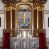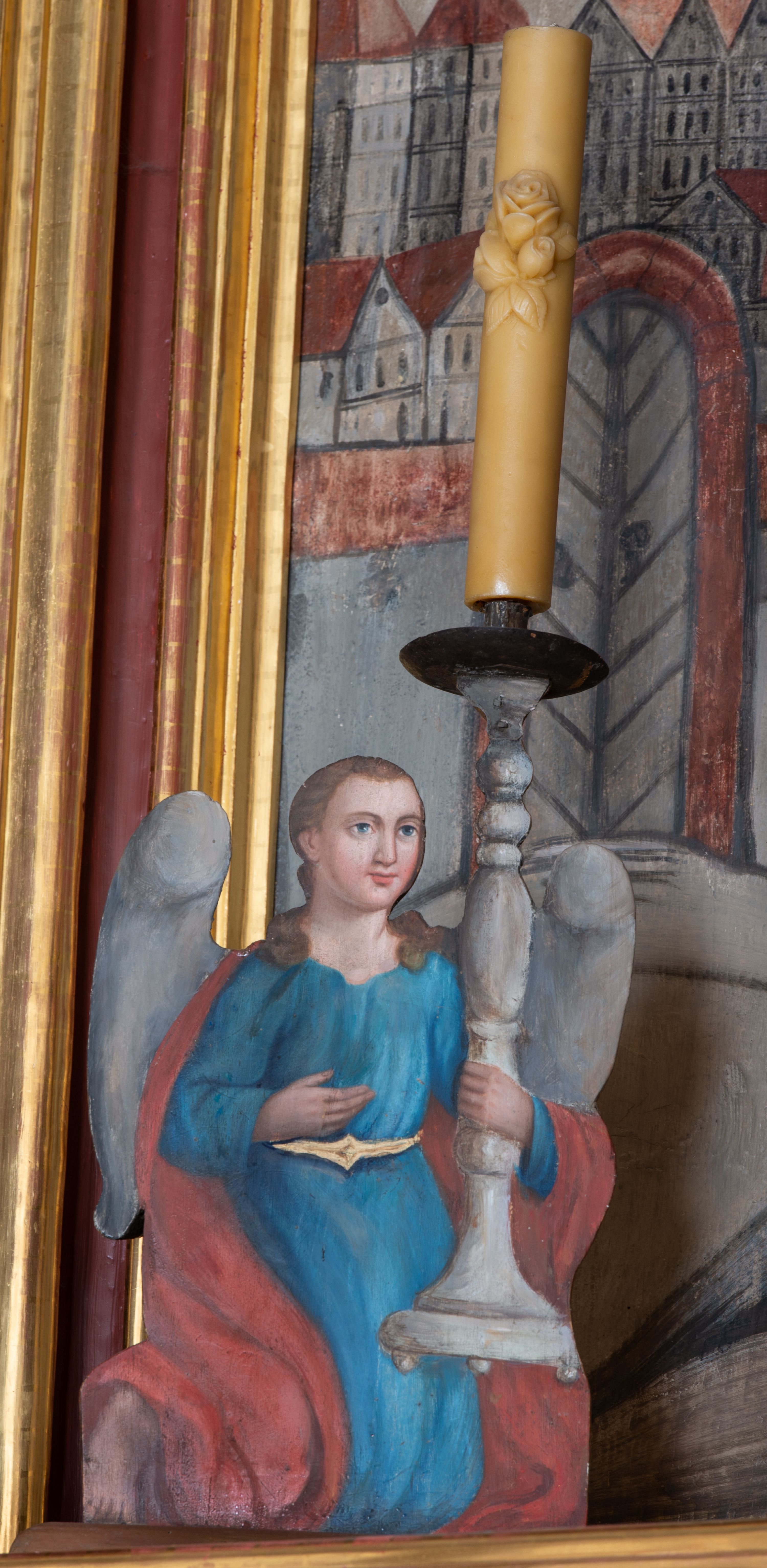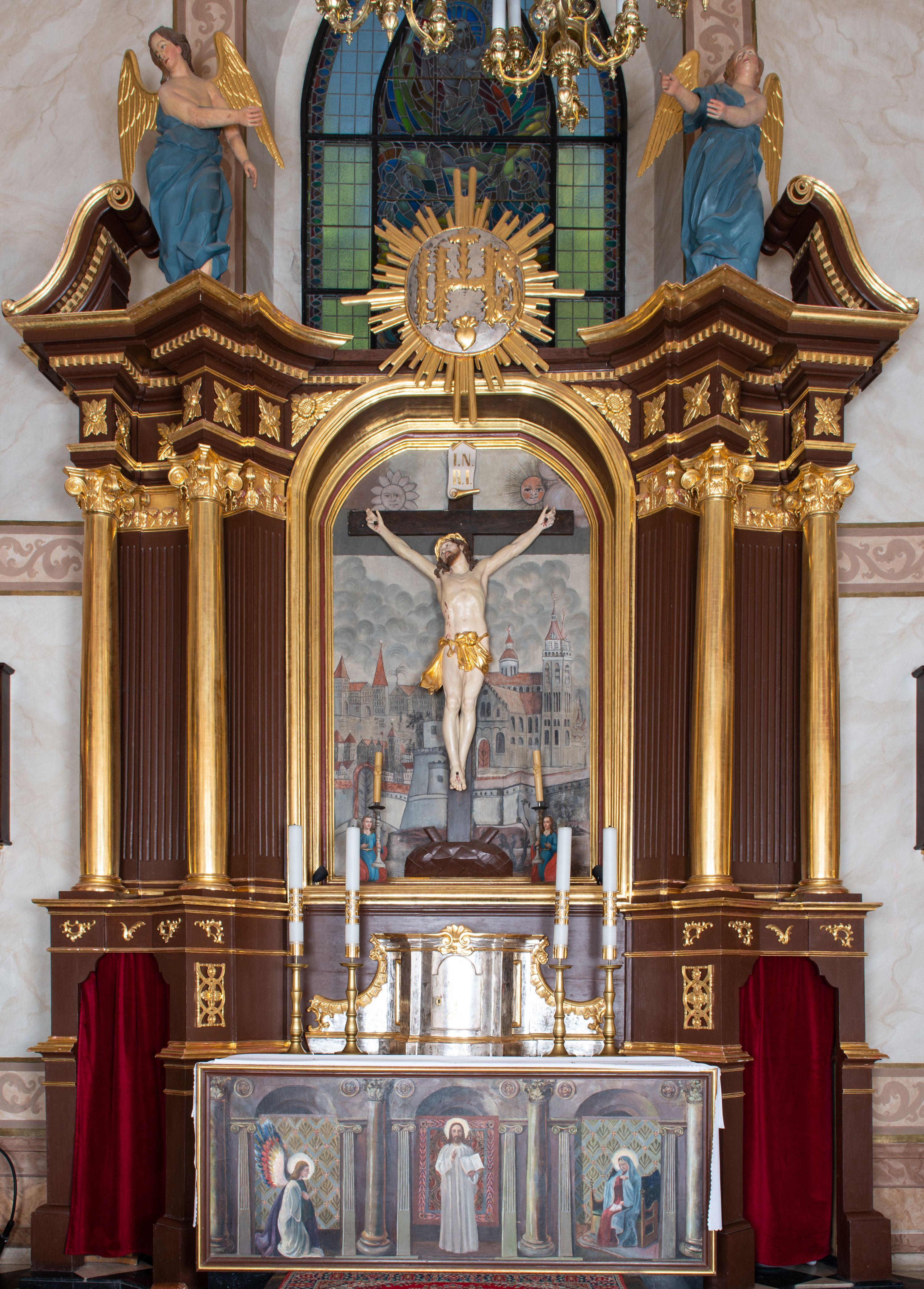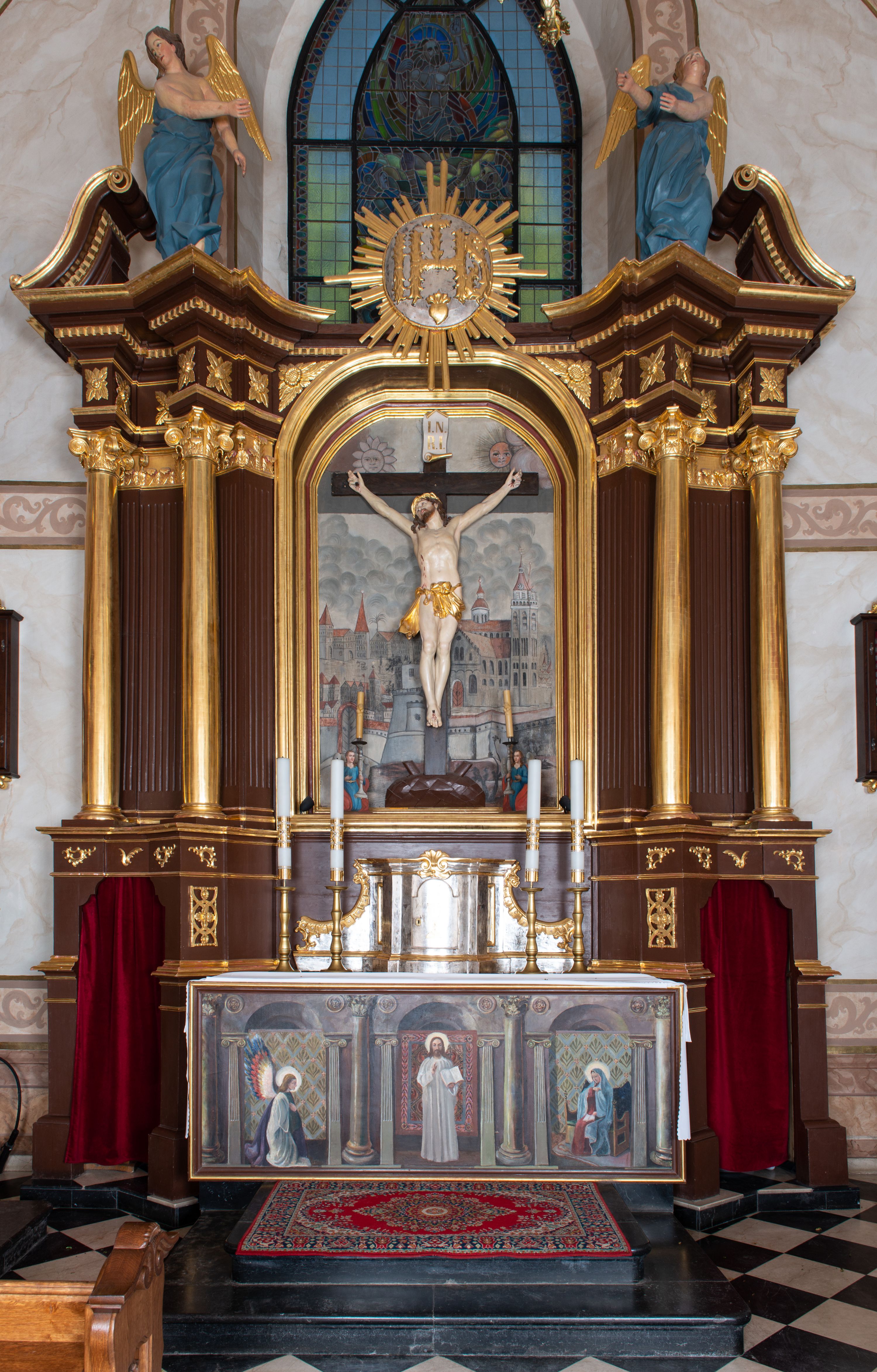 Ołtarz architektoniczny, jednokondygnacyjny, jednoosiowy ze zwieńczeniem i z parą bramek. Ołtarz murowany, prostopadłościenny z malowanym na płótnie antepedium ujętym drewnianą, profilowaną ramą. Wewnątrz przedstawienie wkomponowane w trójprzelotową arkadę z wizerunkiem Jezusa pośrodku i sceną Zwiastowania po bokach. Osadzone na niewysokim cokole tabernakulum jest w formie prostopadłościennej szafki o wypukłej ściance frontowej i narożach artykułowanych skośnie ustawionymi pilastrami wspierającymi wyłamujący się ponad nimi gzyms wieńczący przybierający po środku formę stykających się wolut z motywem konchy. Kwadratowe drzwiczki zamknięte są półkolistym łukiem nadwieszonym. Tabernakulum flankuje para wydatnych spływów wolutowych o krawędziach zdobionych motywem rocaille’owego grzebienia. Struktura jest srebrzona i złocona. Retabulum osadzone na zdwojonym, ukośnie zryzalitowanym cokole z otworami bramek na bokach. Część środkową nastawy ujmują dwie pary kolumn o kapitelach korynckich ustawione na tle pary filarów o kanelowanych trzonach, całość wspiera wyłamujące się ponad nimi przerwane w partii architrawu i fryzu belkowanie z silnie wysuniętym gzymsem. Zwieńczenie w formie przerwanego przyczółka w kształcie S-kształtnych wolut. Górną partię cokołu zdobią motywy rocaille’ów, natomiast fryz motywy rozet. Pośrodku zwieńczenia usytuowana jest okrągła, promienista gloria z monogramem imienia Jezus i gorejącym sercem pośrodku. Po bokach zwieńczenia stoi para figur aniołów ubranych w niebieskie szaty. Pole środkowe retabulum w formie wnęki w kształcie stojącego prostokąta zamkniętego łukiem koszowym. Wewnątrz krucyfiks na polichromowanym tle przestawiającym widok miasta z murami warownymi i wydatną bryłą kościoła po prawej stronie kompozycji, pokrytym skłębionymi chmurami niebem oraz tarczami - słoneczną po prawej i księżycową po lewej stronie górnej partii krucyfiksu. Struktura ołtarza jest w kolorze brązowym, detal architektoniczny i ornamentyka są złocone i srebrzone.