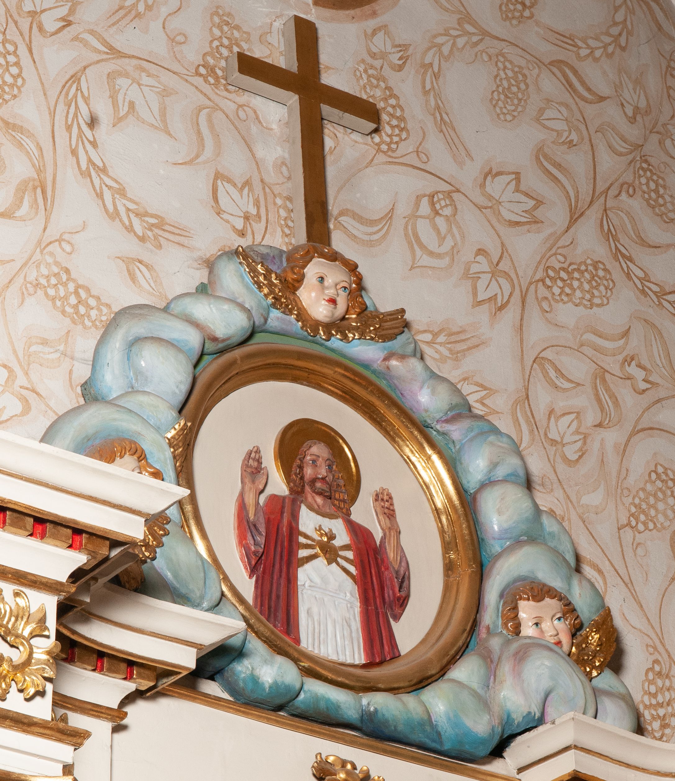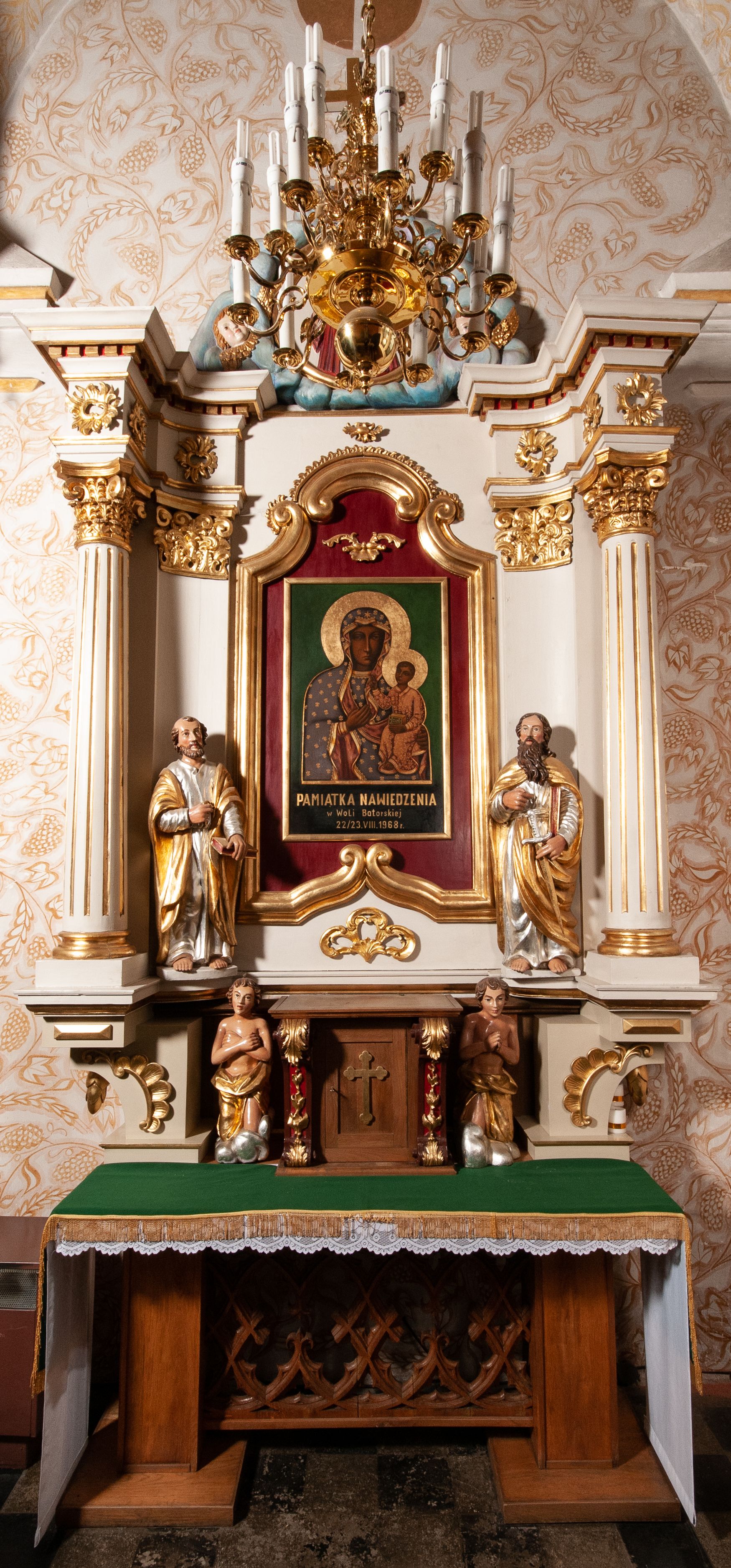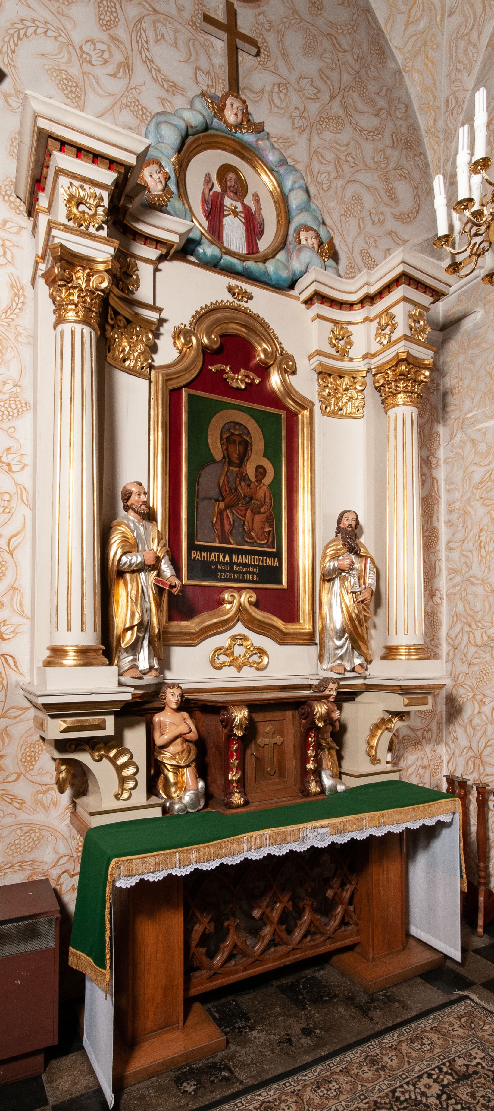 ymi przerwane belkowanie to z kolei element nawiązujący do klasycyzmu. Zwieńczenie ołtarza o współczesnych formach zostało natomiast wykonane podczas przebudowy ołtarza w 1985 roku, zapewne wraz z jego dolną partią. W polu głównym umieszczony jest obraz Matki Boskiej Częstochowskiej, na pamiątkę peregrynacji obrazu w parafii w Woli Batorskiej w 1968 roku. Wydarzenie to zostało szczegółowo opisane w kronice parafialnej.