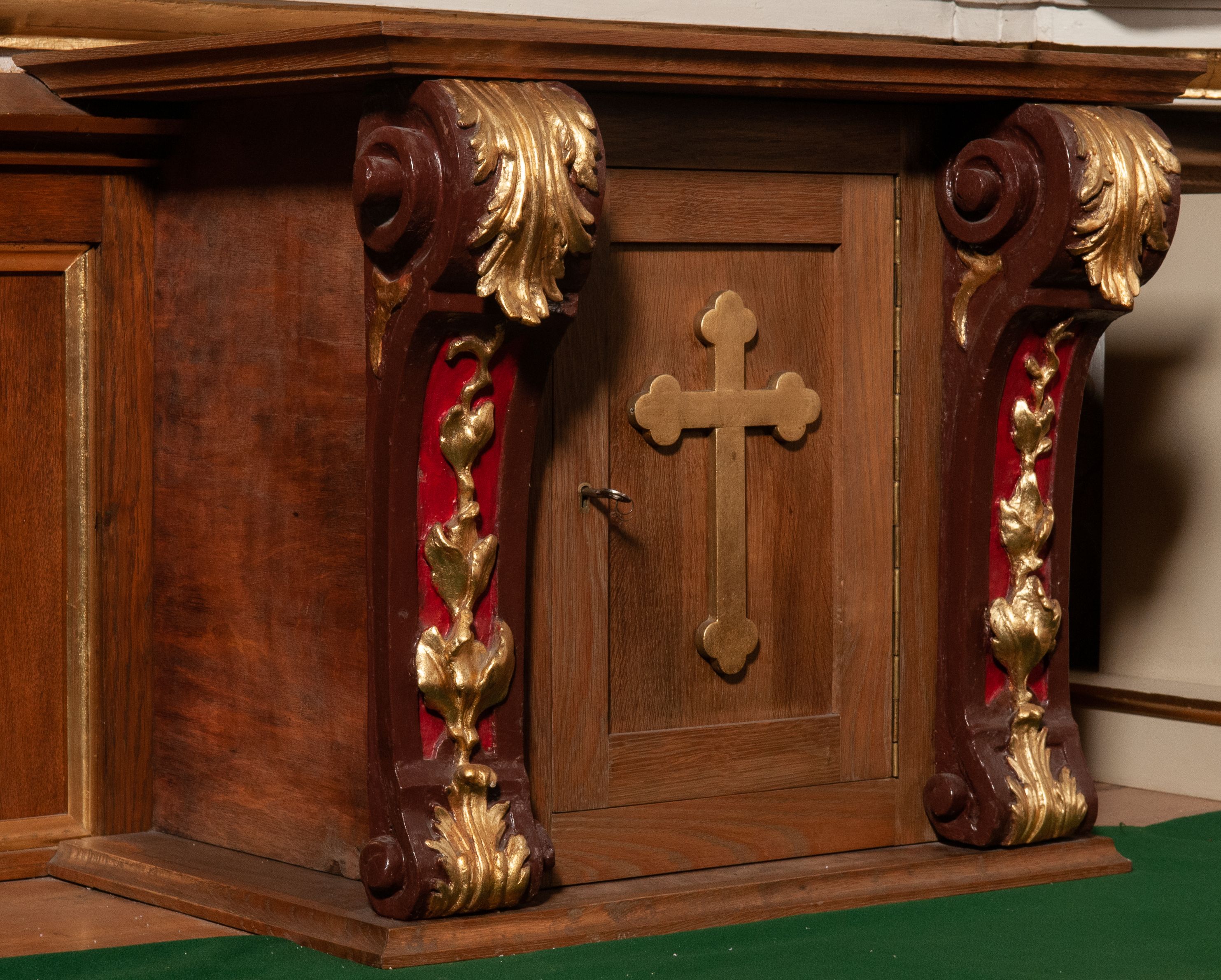 Ołtarz reprezentuje typ aediculowy, czyli jednokondygnacyjnej, jednoosiowej struktury ujętej parą podpór dźwigających przerwane belkowanie, ze zwieńczeniem. Niestety źródła archiwalne nie ujawniły twórcy retabulum. Nastawa nosi cechy neostylowe, od neogotyku, który przejawia się ozdobieniu astwerkiem kraty w dolnej części ołtarza po wykorzystanie motywu predelli i współczesnych form w zwieńczeniu. Połączenie motywów wklęsłych pilastrów z kolumnami, zdobionymi żłobkowaniem podtrzymujące