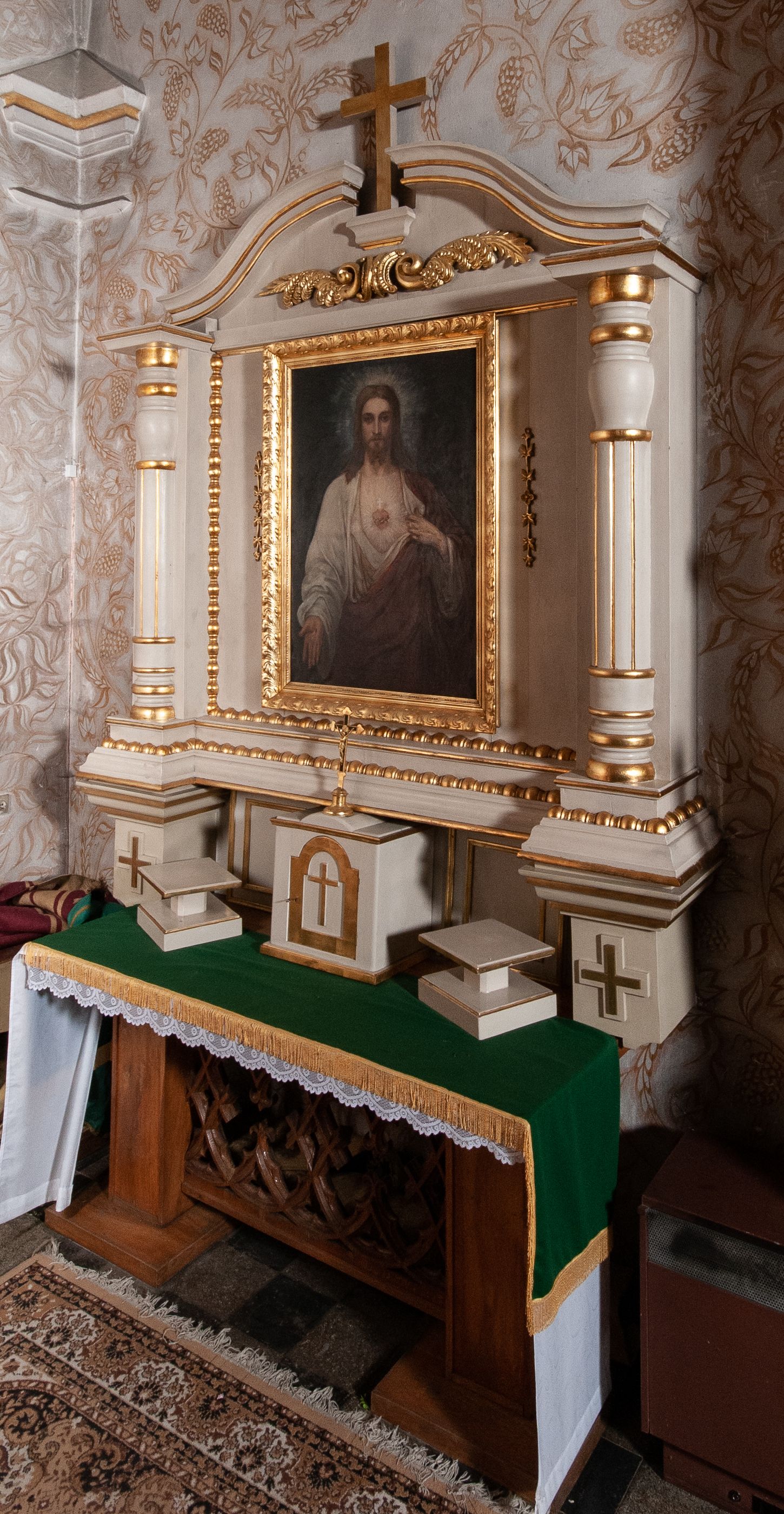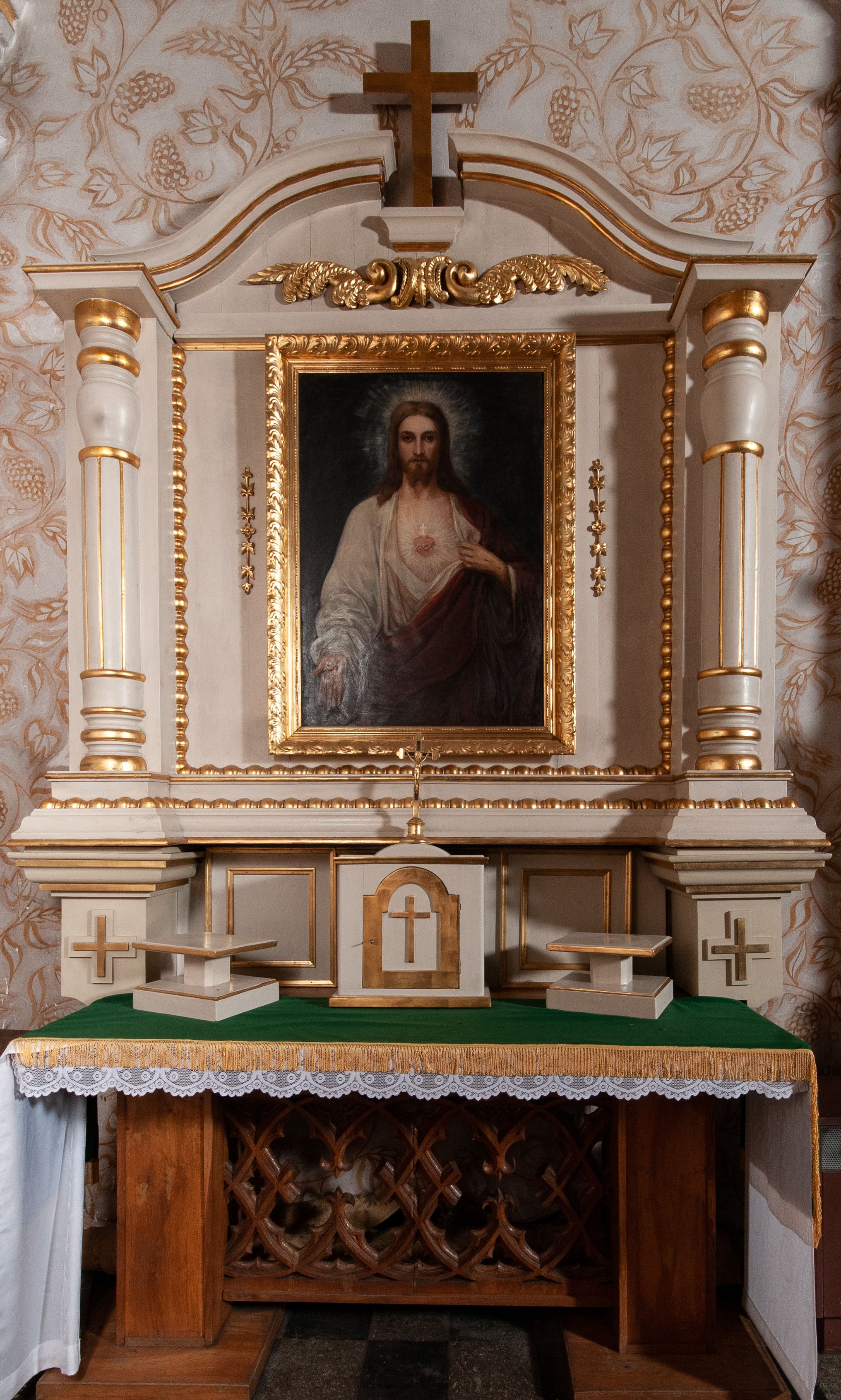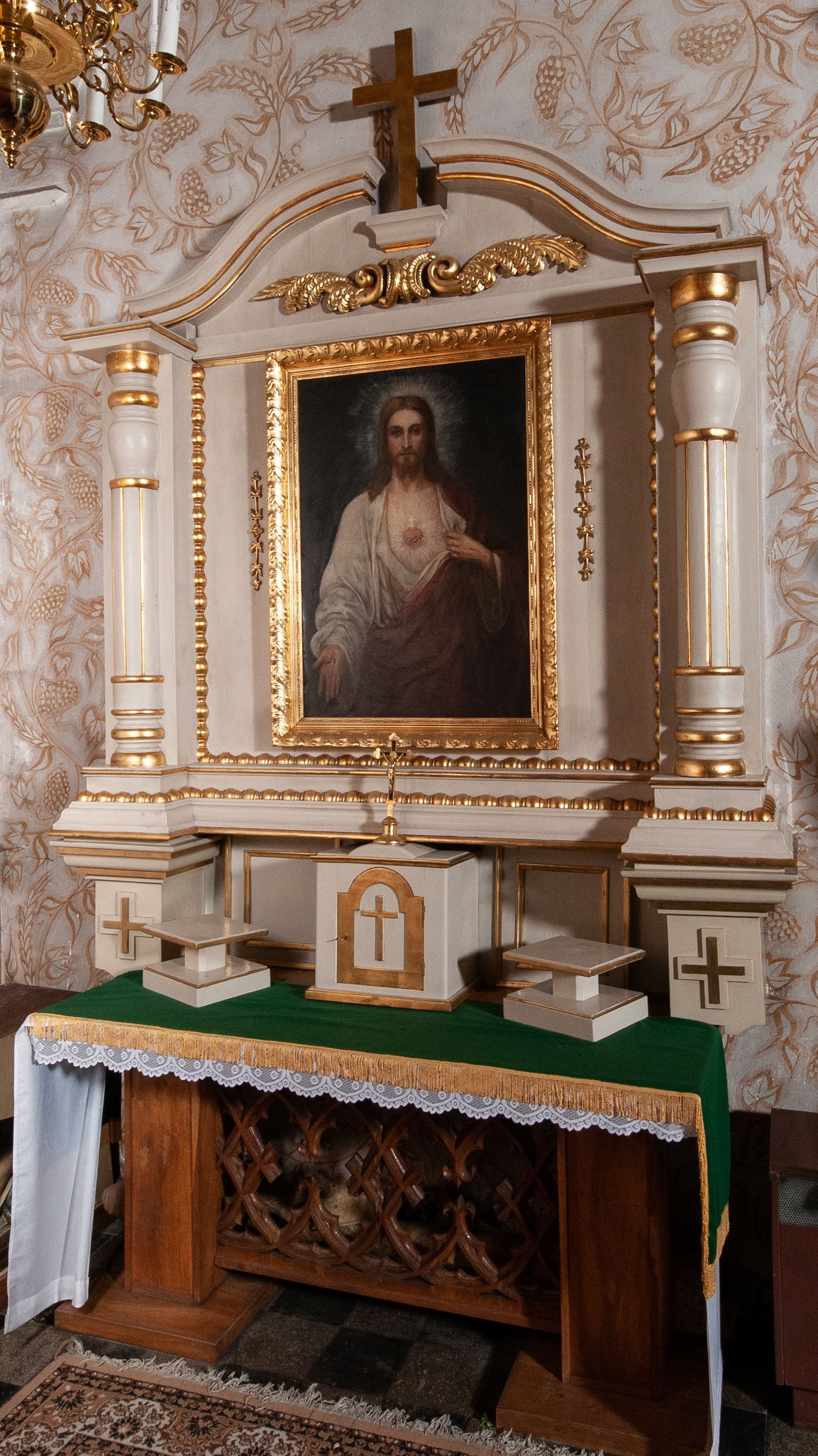 Ołtarz w kaplicy bocznej powstał prawdopodobnie około połowy XX wieku, nawiązuje do form neobarokowych. Reprezentuje typ uproszczony, aediculowy, czyli jednokondygnacyjnej, jednoosiowej struktury ujętej parą podpór dźwigających przerwane belkowanie. Niestety źródła archiwalne nie ujawniły twórcy tego retabulum. Ikonografia ołtarza poświęcona jest Najświętszemu Sercu Jezusowemu.