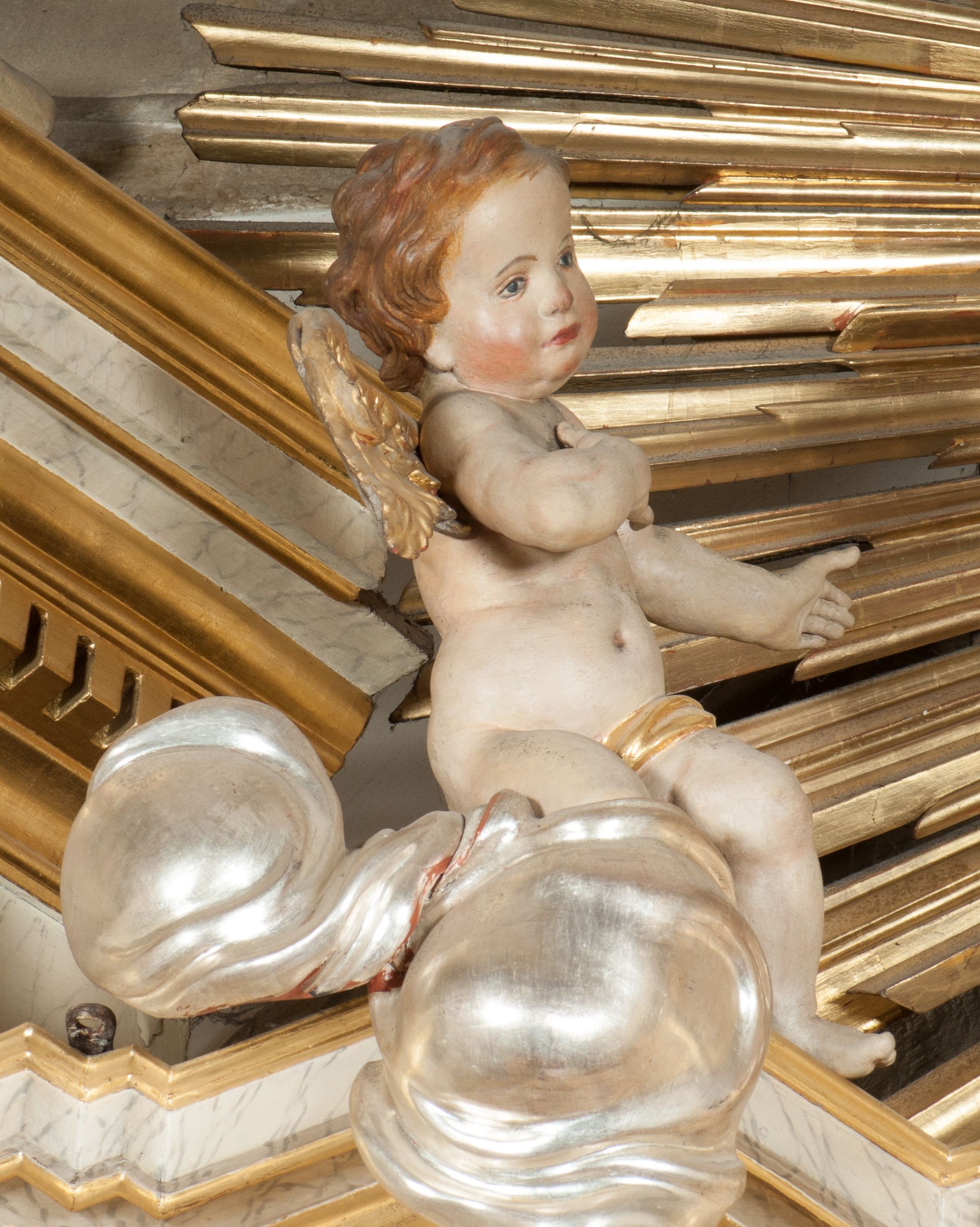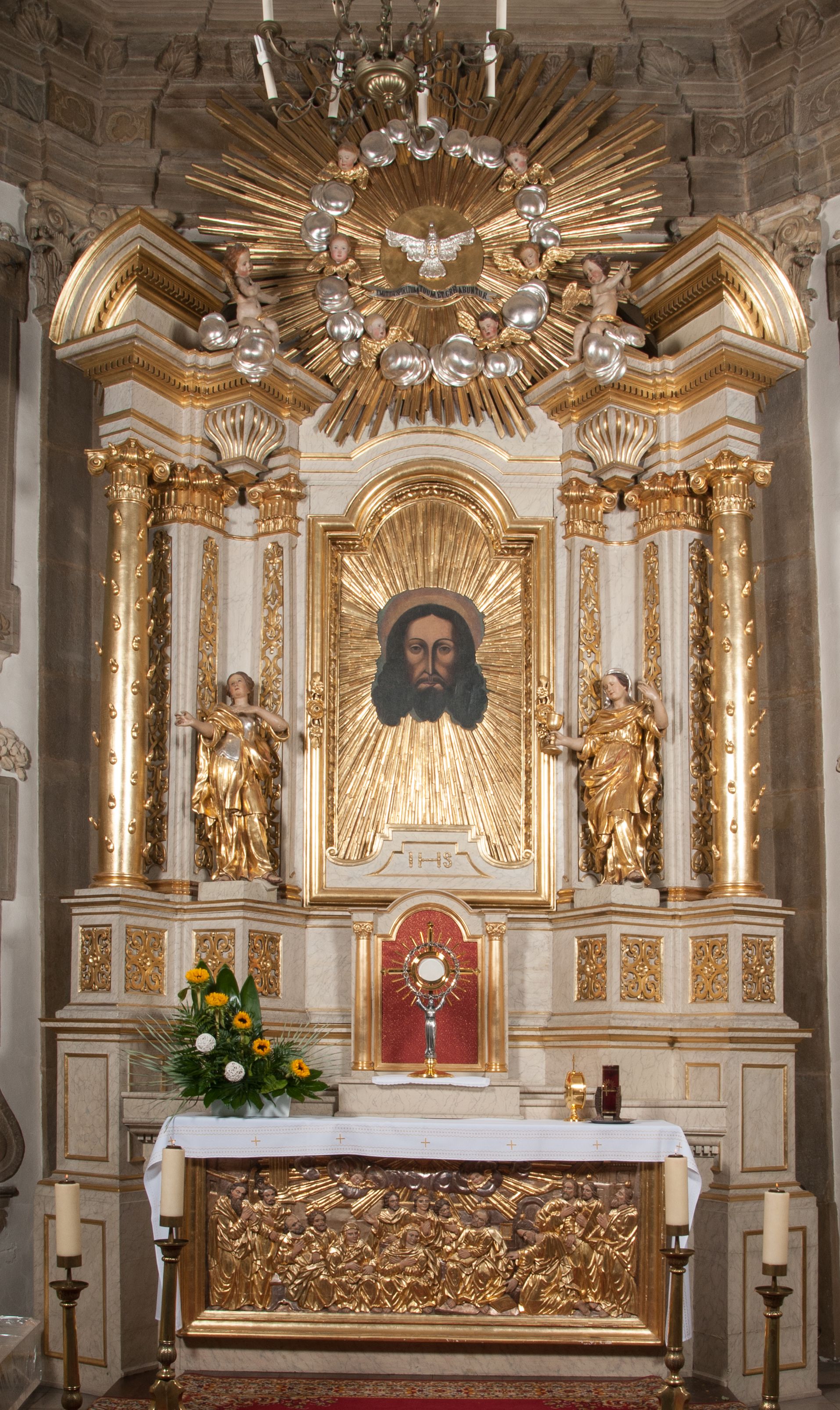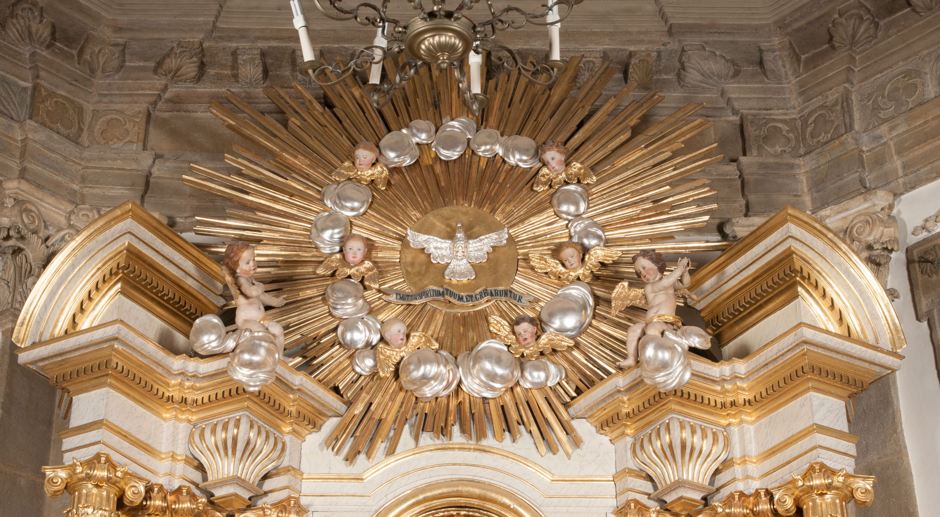 Zwieńczenie ołtarza w formie glorii promienistej z gołębicą Ducha Świętego pośrodku. Poniżej niej, na banderoli inskrypcja „EMITTE SPIRITUM TUUM ET CREABUNTUR”. Przedstawienie ujęte otokiem utworzonym z obłoków i uskrzydlonych główek. Po bokach, na częściach przerwanego belkowania, na obłokach siedzą putta. Są zwrócone do siebie i spoglądają lekko w dół. Mają uniesione ręce i są przepasane złotymi szarfami.