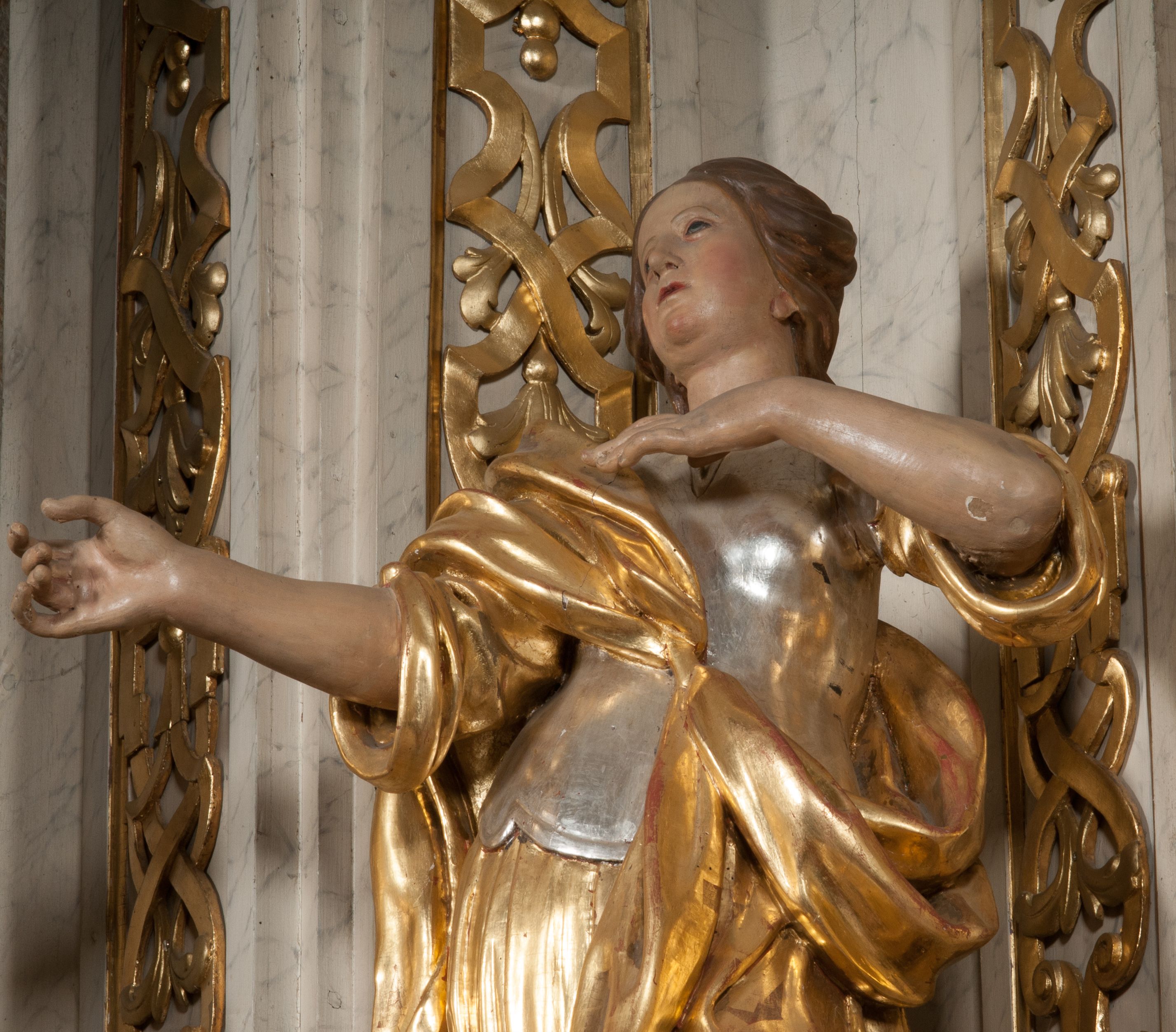 Struktura ołtarza dekorowana imitacją marmoryzacji za pomocą polichromii na kolor jasnoszary z ciemniejszymi żyłkami; profile, ornamenty, gloria, szaty świętych złocone; obłoki, gołębica, elementy strojów, fragmenty antepedium srebrzone; polichromia w partiach ciała postaci naturalistyczna.