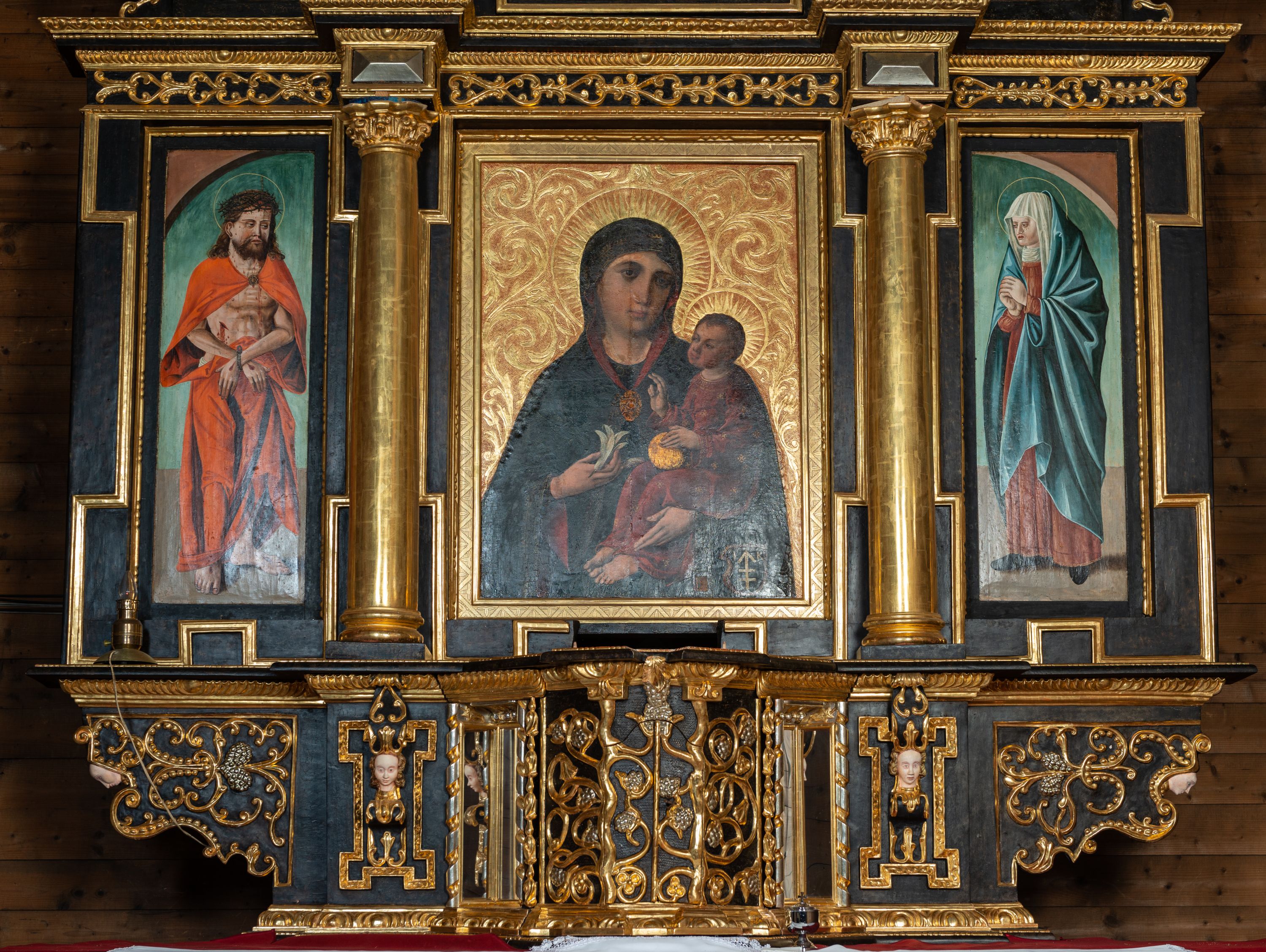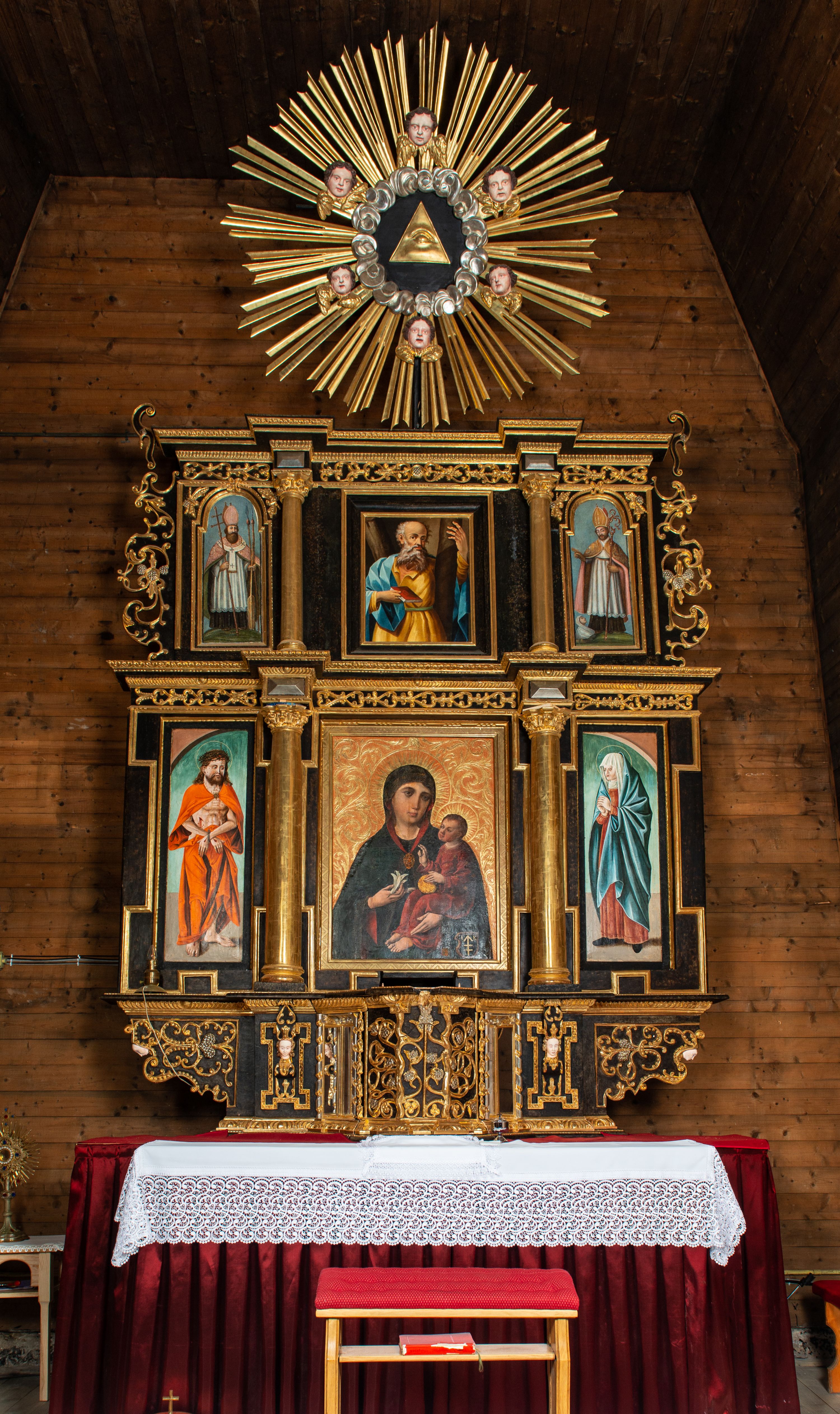 Ołtarz przyścienny, architektoniczny, trójosiowy, dwukondygnacjowy. Nastawa ołtarzowa ustawiona na prostopadłościennym stole ołtarzowym, zasłanym czerwonym materiałem. Predella na niskim cokoliku w formie półwałku, zamknięta u góry puklowanym gzymsem. W osi środkowej wmontowane tabernakulum ozdobione bujną, płaskorzeźbioną winną latoroślą. Po jego bokach ścianki z lustrami, flankowane parą spiralnie skręconych laskowań. W osiach bocznych predelli płyciny o uszatych narożach, w polu których znajdują się pilastry hermowe ze skierowanymi na wprost kobiecymi głowami. Na skrajach predelli konsolki, bogato dekorowane wicią, zawijającą się w wolutki, zdobioną perełkowaniem; na brzegu konsolki skierowana ku dołowi głowa. Pierwsza kondygnacja artykułowana parą kolumn o korynckich kapitelach, wspierających niepełne belkowanie, wyłamane na ich osi. W polu głównym obraz Matki Boskiej z Dzieciątkiem, w osiach bocznych wmontowane skrzydła tryptyku z przedstawieniami: Ecce Homo po lewej stronie oraz Matki Boskiej Bolesnej po prawej stronie. Każda z osi ujęta na brzegach obramowaniem w kształcie stojącego prostokąta o uszatych narożnikach. Fryz dekorowany symetryczną wicią roślinną, nad kolumnami srebrzone rauty. Druga kondygnacja mniejsza, flankowana analogicznymi kolumnami, wspierającymi podobne belkowanie. W polu głównym obraz św. Andrzeja w kształcie stojącego prostokąta. W lewej osi bocznej obraz św. Wojciecha, a w prawej św. Stanisława, oba zamknięte łukiem nadwieszonym. Po bokach kondygnacji uszy o wykroju okuciowym, zdobione wicią oraz podwieszonymi girlandami z owocami winogron. Nad ołtarzem zamocowana promienista gloria, w polu której znajduje się oko Opatrzności otoczone wieńcem z obłoków oraz sześcioma skrzydlatymi główkami anielskimi. Struktura malowana na kolor czarny, kolumny i ornamentyka złocone, detale srebrzone.