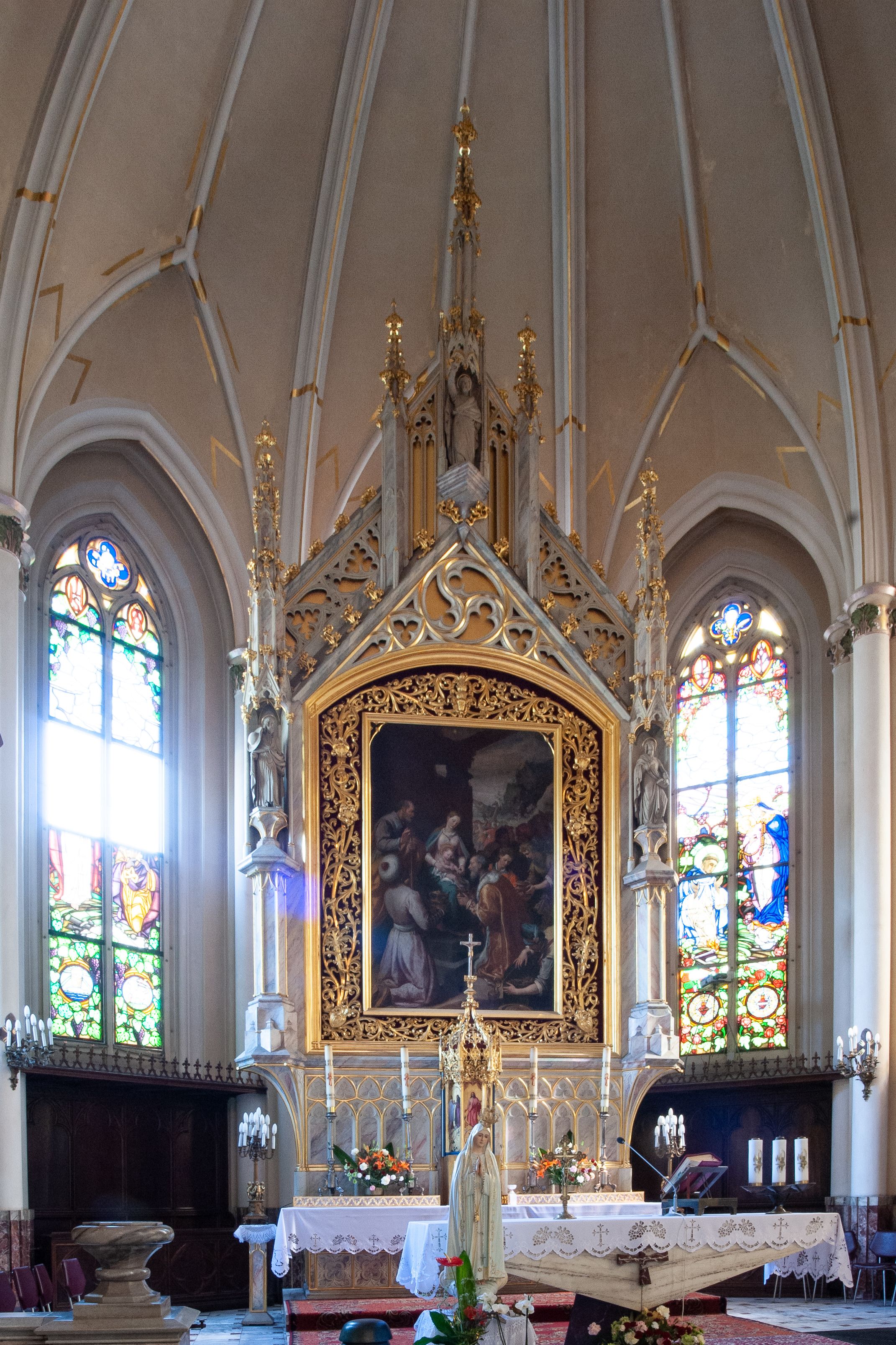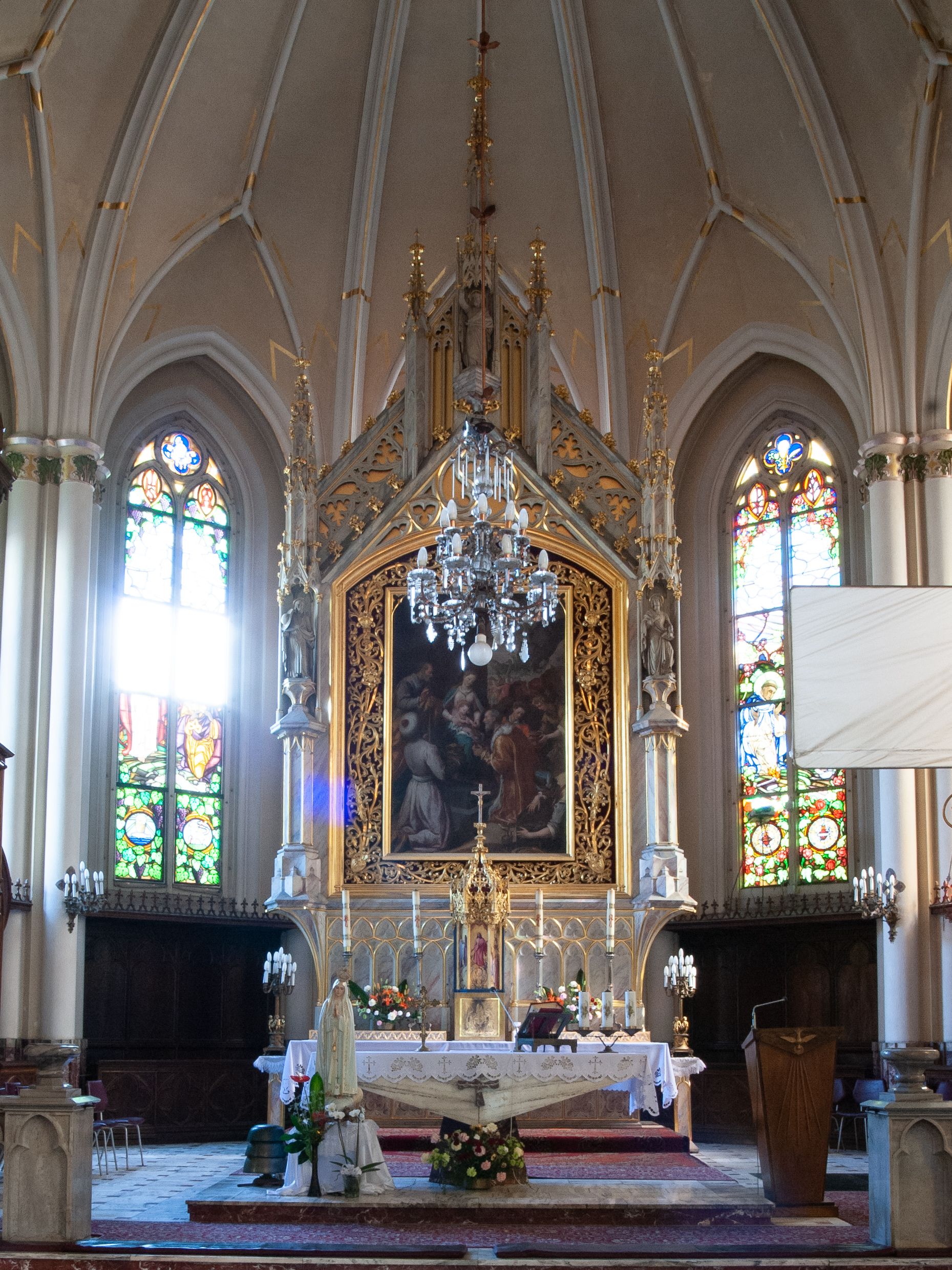 Ołtarz główny neogotyckiego kościoła, poświęconego w 1874 roku, przyścienny, architektoniczny, jednokondygnacyjny, jednoosiowy, ze zwieńczeniem, neogotycki, z bogatą dekoracją motywami maswerków, pinaklami, żabkami. W polu środkowy, obraz Santiegi di Tito Hołd Trzech Króli z 1597 roku.