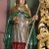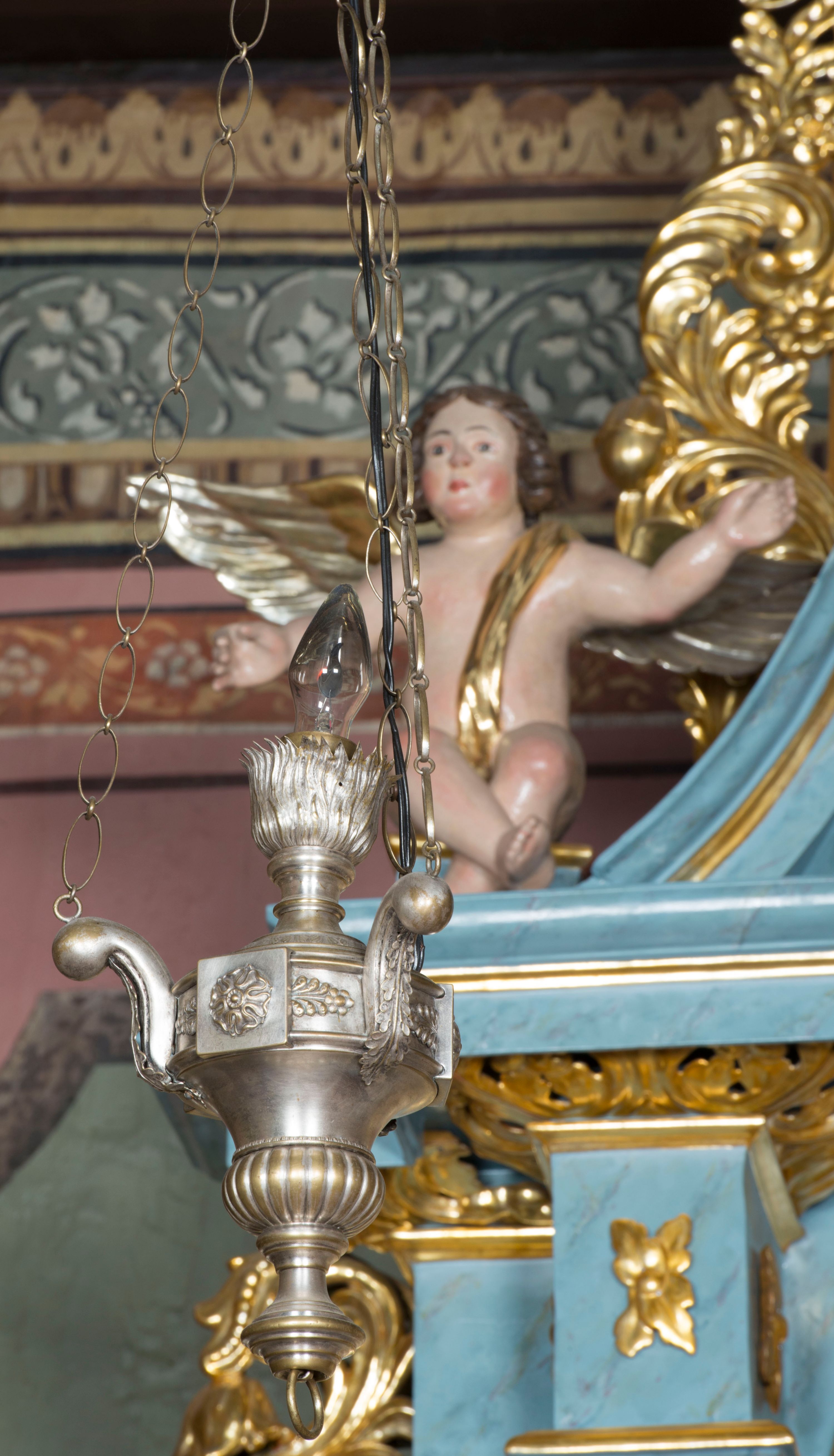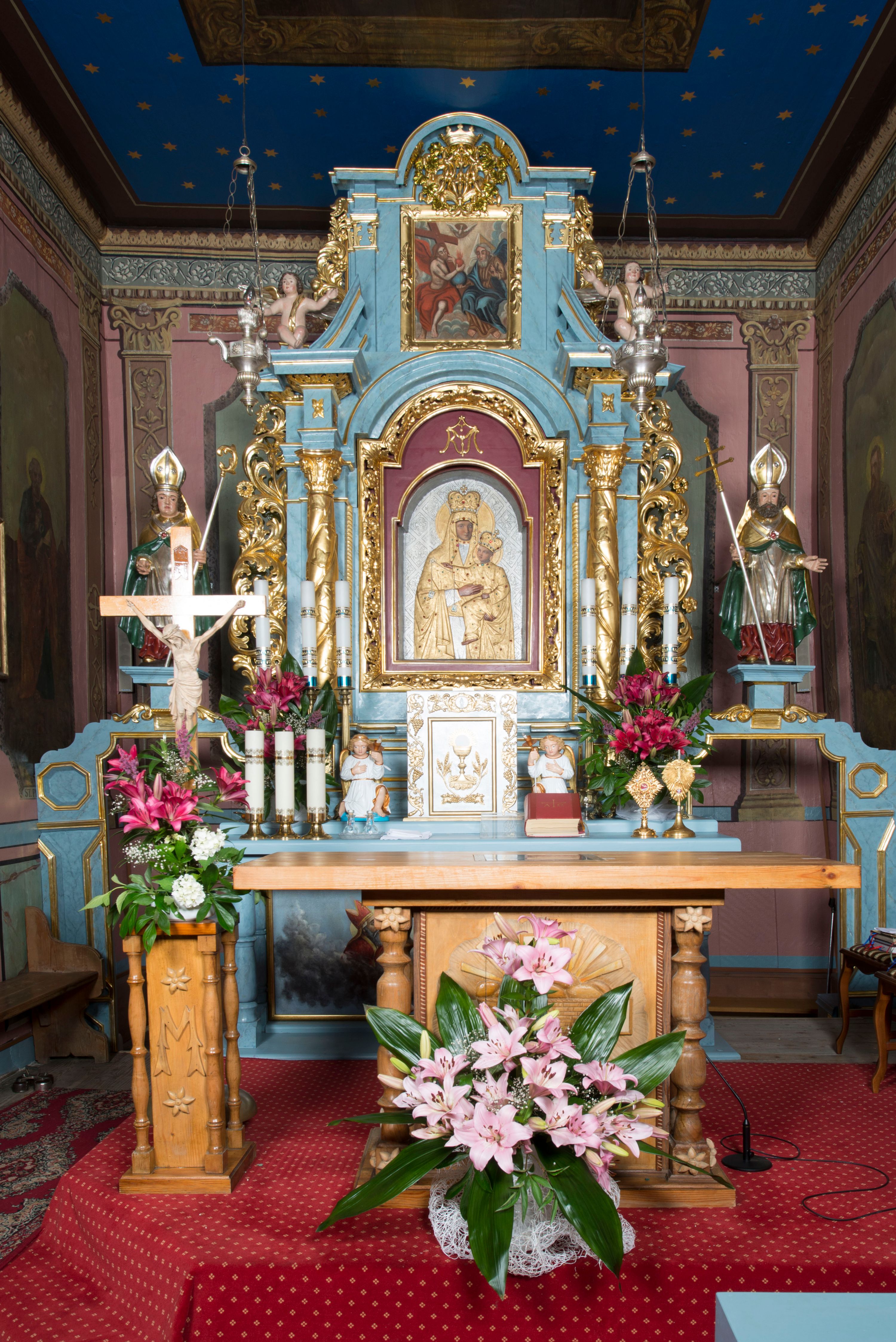 Całość struktury ołtarza malowana na jasnobłękitny odcień z marmoryzacją w odcieniach szarości. Profilowania, ornamenty i detal architektoniczny pozłacane.