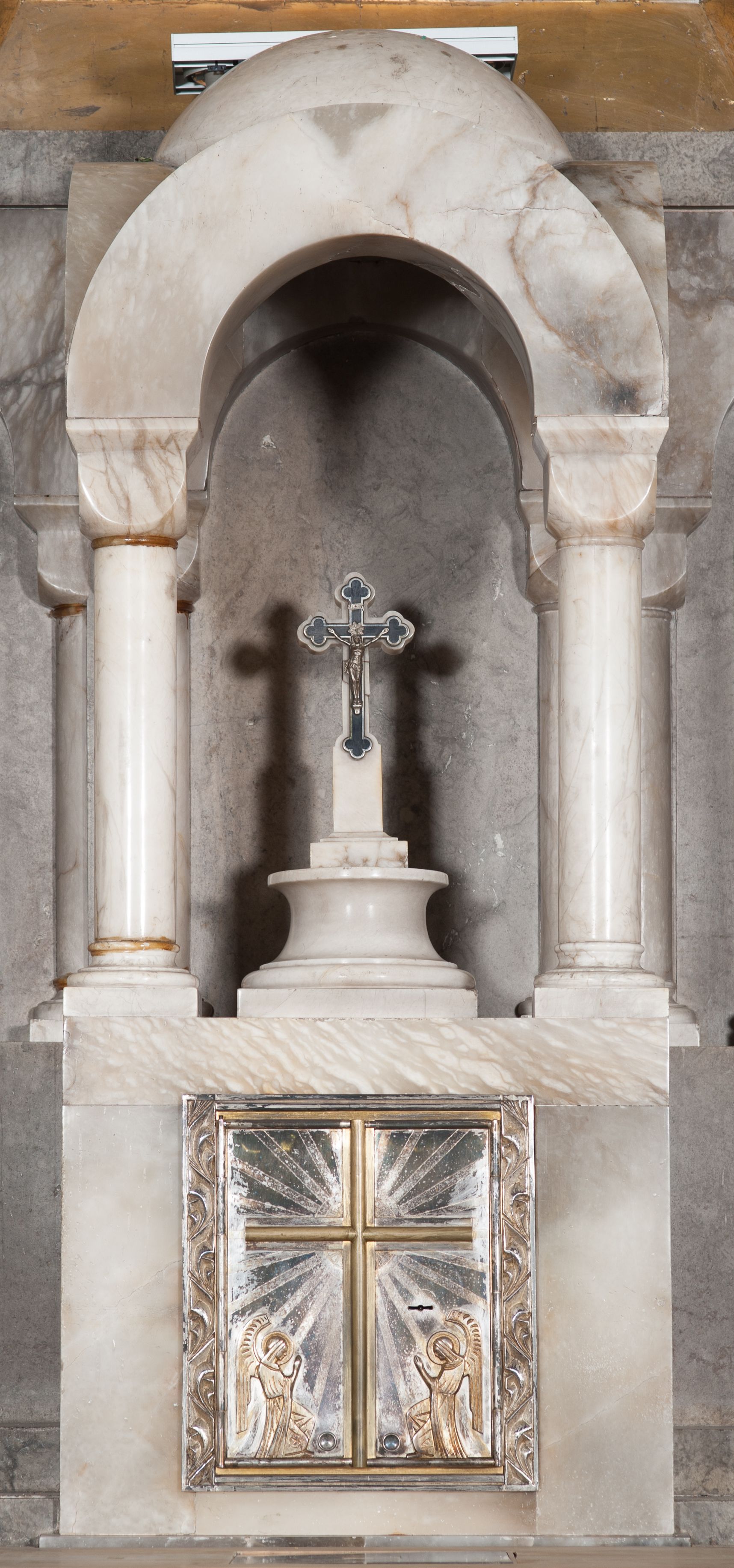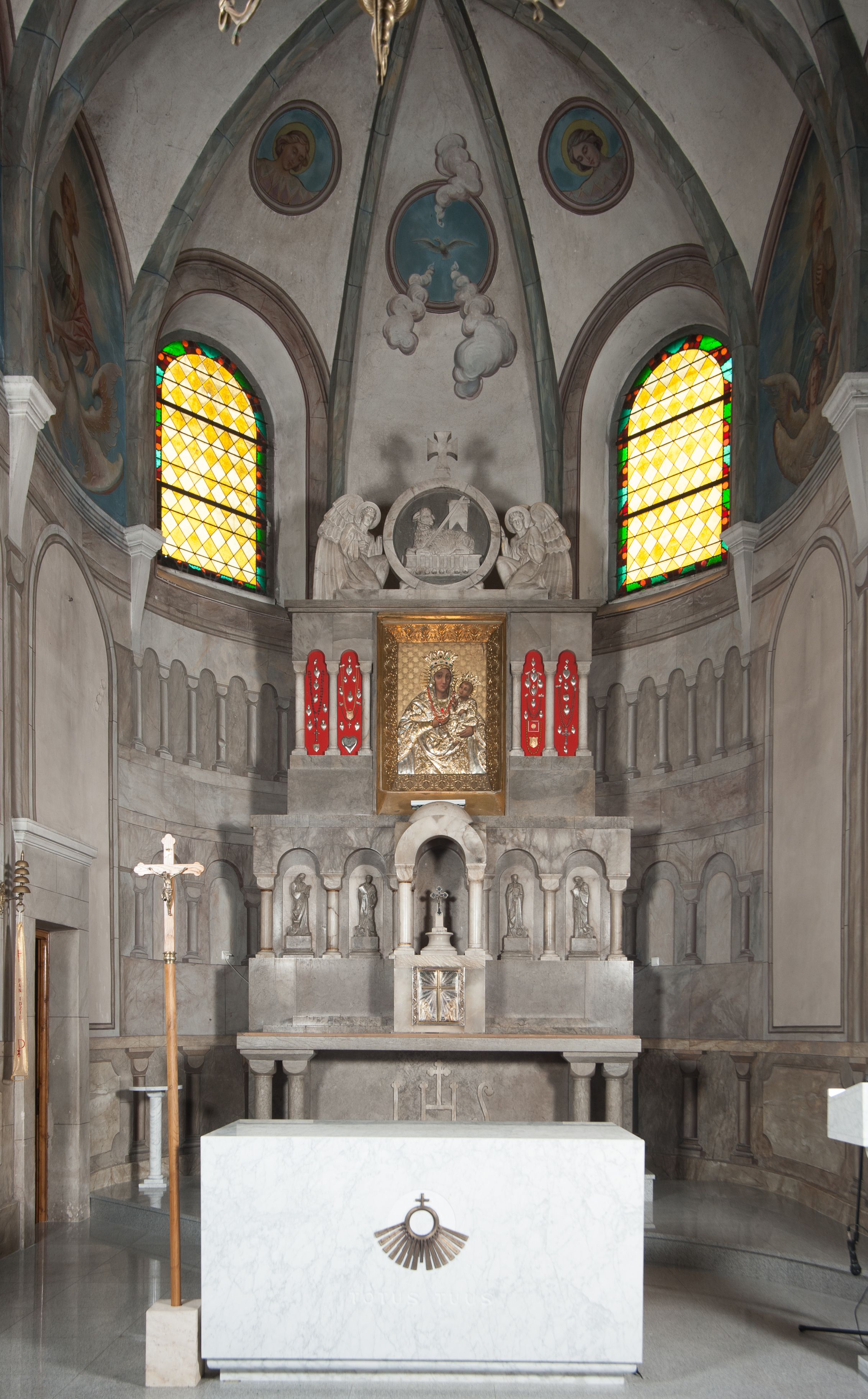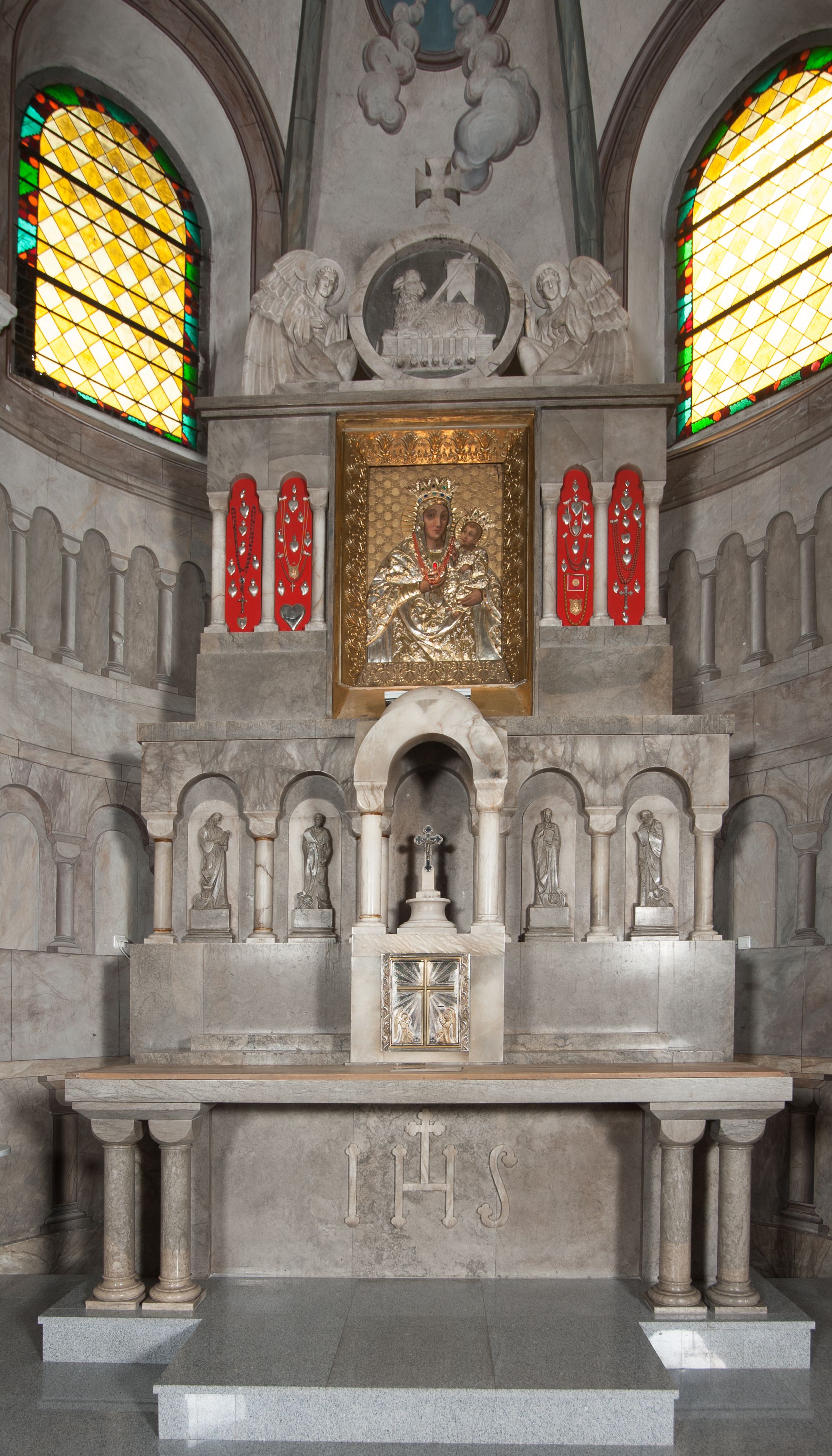 Ołtarz przyścienny, architektoniczny, pięcioosiowy, dwukondygnacyjny ze zwieńczeniem. Mensa kamienna, w formie stołu wsparta na parach kolumn o kostkowych kapitelach. Antepedium również kamienne, z umieszczonym w centrum monogramem IHS zwieńczonym krzyżem. Kondygnacja pierwsza artykułowana pięcioma arkadami ujętymi kolumienkami o kostkowych kapitelach. W arkadach umieszczone płaskorzeźbione postaci czterech ewangelistów: Jana, Marka, Łukasza i Mateusza. W osi środkowej prostopadłościenne, alabastrowe tabernakulum z tronem wystawienia nakrytym kamiennym baldachimem w formie kopuły wspartej na czterech kolumnach o kostkowych kapitelach. Na drzwiczkach umieszczony krzyż na tle glorii promienistej flankowany przez postaci klęczących aniołów. Kondygnacja druga artykułowana arkadami wspartymi na kolumnach o kostkowych kapitelach. W arkadach umieszczone dary wotywne. W osi środkowej znajduje się obraz Matki Boskiej z Dzieciątkiem w prostokątnej, złotej ramie. Struktura zwieńczona profilowanym gzymsem, ponad którym umieszczono płaskorzeźbione przedstawienie Baranka Apokaliptycznego ujętego medalionem zwieńczonym krzyżem oraz flankowanego przez postaci dwóch klęczących aniołów.