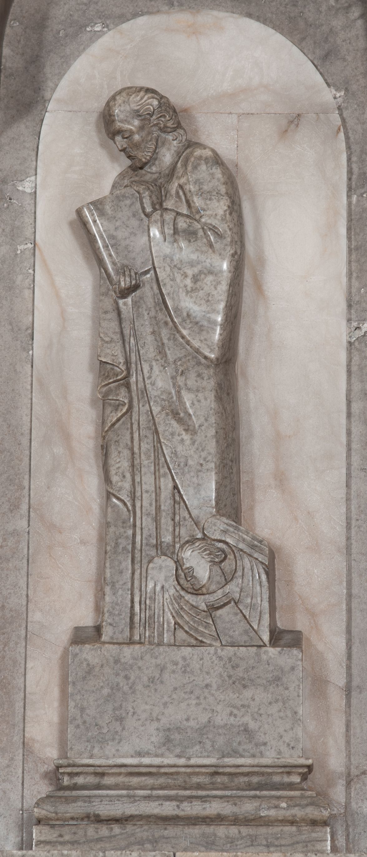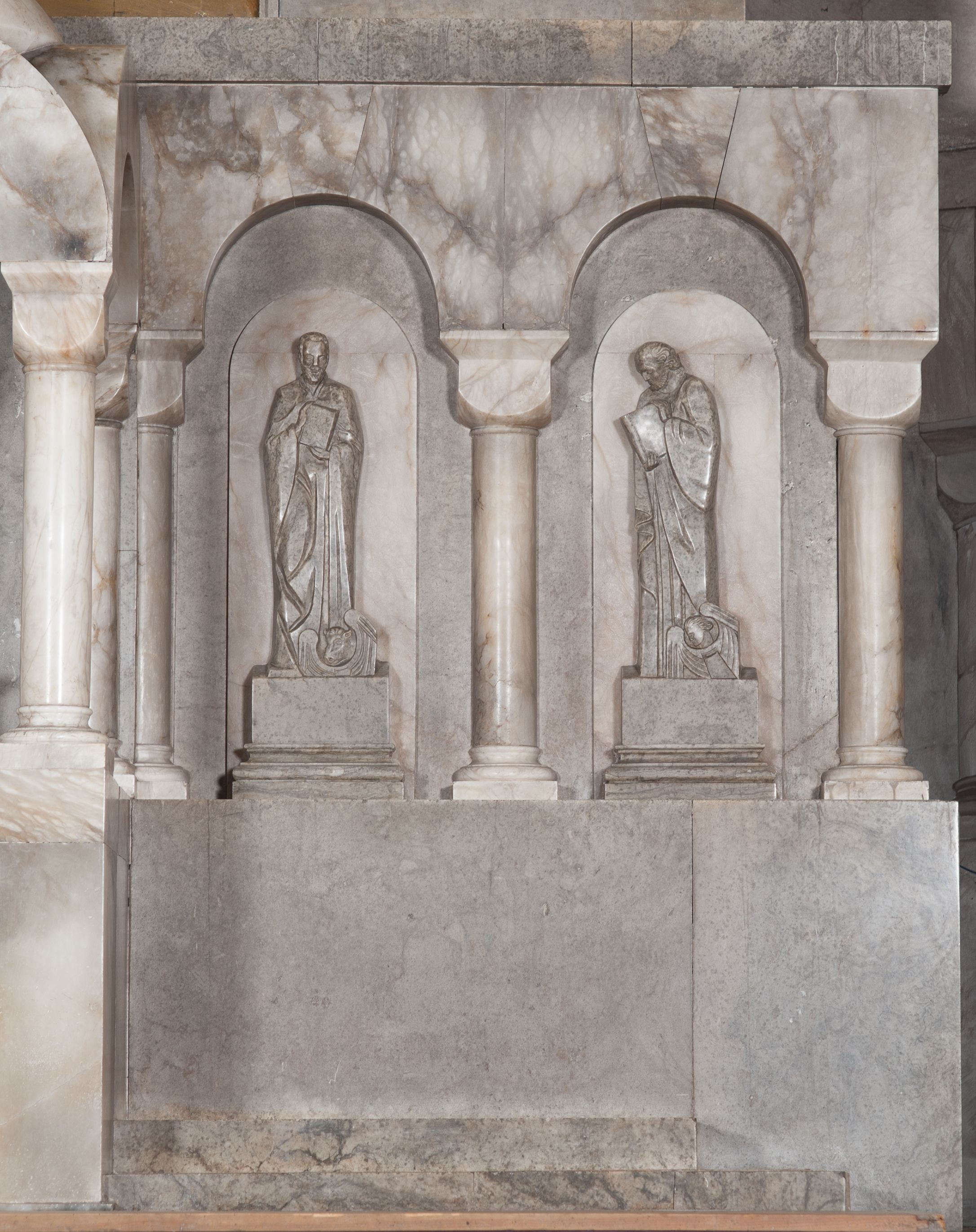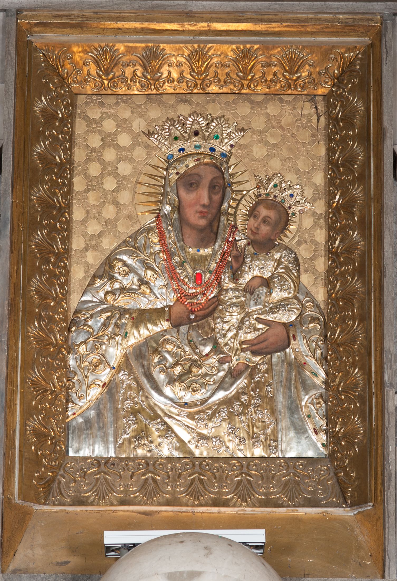 Ołtarz przyścienny, architektoniczny, pięcioosiowy, dwukondygnacyjny ze zwieńczeniem. Mensa kamienna, w formie stołu wsparta na parach kolumn o kostkowych kapitelach. Antepedium również kamienne, z umieszczonym w centrum monogramem IHS zwieńczonym krzyżem. Kondygnacja pierwsza artykułowana pięcioma arkadami ujętymi kolumienkami o kostkowych kapitelach. W arkadach umieszczone płaskorzeźbione postaci czterech ewangelistów: Jana, Marka, Łukasza i Mateusza. W osi środkowej prostopadłościenne, alabastrowe tabernakulum z tronem wystawienia nakrytym kamiennym baldachimem w formie kopuły wspartej na czterech kolumnach o kostkowych kapitelach. Na drzwiczkach umieszczony krzyż na tle glorii promienistej flankowany przez postaci klęczących aniołów. Kondygnacja druga artykułowana arkadami wspartymi na kolumnach o kostkowych kapitelach. W arkadach umieszczone dary wotywne. W osi środkowej znajduje się obraz Matki Boskiej z Dzieciątkiem w prostokątnej, złotej ramie. Struktura zwieńczona profilowanym gzymsem, ponad którym umieszczono płaskorzeźbione przedstawienie Baranka Apokaliptycznego ujętego medalionem zwieńczonym krzyżem oraz flankowanego przez postaci dwóch klęczących aniołów.
