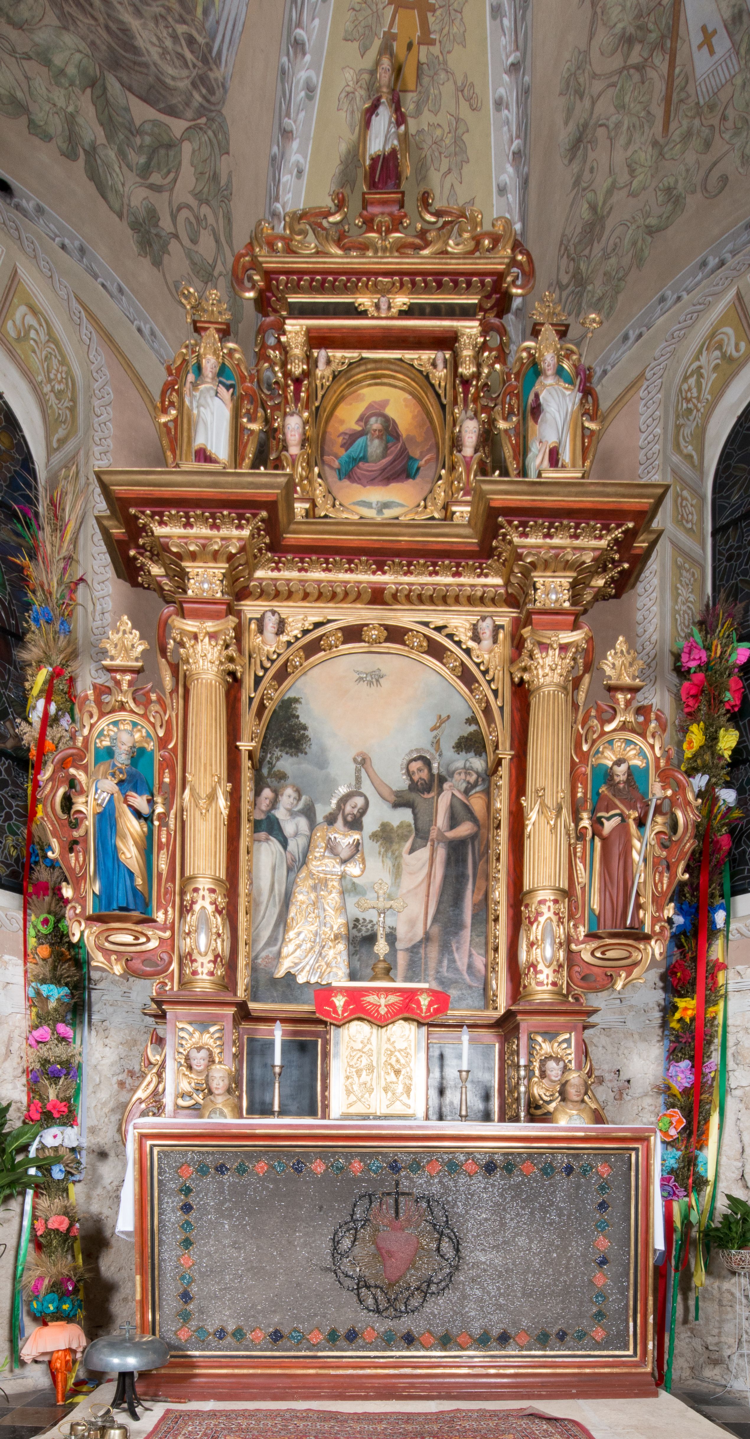 Nastawa ołtarzowa architektoniczna, jednoosiowa, dwukondygnacyjna, na cokole. Ołtarz murowany z kamienną mensą. Na lewym boku ołtarza drewniana wnęka na oleje święte z inskrypcją „OLEA SACRA”. Antepedium w formie leżącego prostokąta w profilowanej ramie, pole kompozycyjne dekorowane dookoła rzędem kolorowych rombów. W polu antepedium znajduje się haftowane koralikami przedstawienie gorejącego serca w koronie cierniowej z zatkniętym u góry krzyżykiem łacińskim. Tabernakulum w formie prostopadłościennej skrzynki. Drzwiczki dwuskrzydłowe, odlewane, w polach przedstawienie wici roślinnej oraz litery alfa i omega. Ściany boczne zdobione kaboszonem i ornamentem małżowinowo-chrząstkowym. Nastawa ustawiona jest na cokole. Pierwsza kondygnacja ujęta parą kolumn. Podpory dźwigają pełne belkowanie wyłamane nad polem środkowym, zamknięte silnie wysuniętym gzymsem. Pole obrazowe w formie arkady z obrazem przedstawiającym Chrzest Chrystusa, na zasuwie obraz Matki Boskiej Nieustającej Pomocy. Kondygnacja ujęta jest uszami z płytkimi niszami dla figur św. Piotra po lewej stronie i św. Pawła po prawej, zwieńczonymi akroterionami utworzonymi z ornamentu małżowinowo-chrząstkowego. Druga kondygnacja ustawiona jest na cokole, ujęta pilastrami hermowymi o kapitelach korynckich, dźwigającymi pełne belkowanie z silnie wystającym gzymsem. Pole obrazowe w formie owalu z przedstawieniem Boga Ojca i Gołębicy Ducha Świętego. Po bokach drugiej kondygnacji znajdują się nisze z figurami św. Stanisława po prawej stronie i nierozpoznanego świętego biskupa po lewej. Ołtarz zwieńczony jest cokołem z figurą św. Wojciecha.