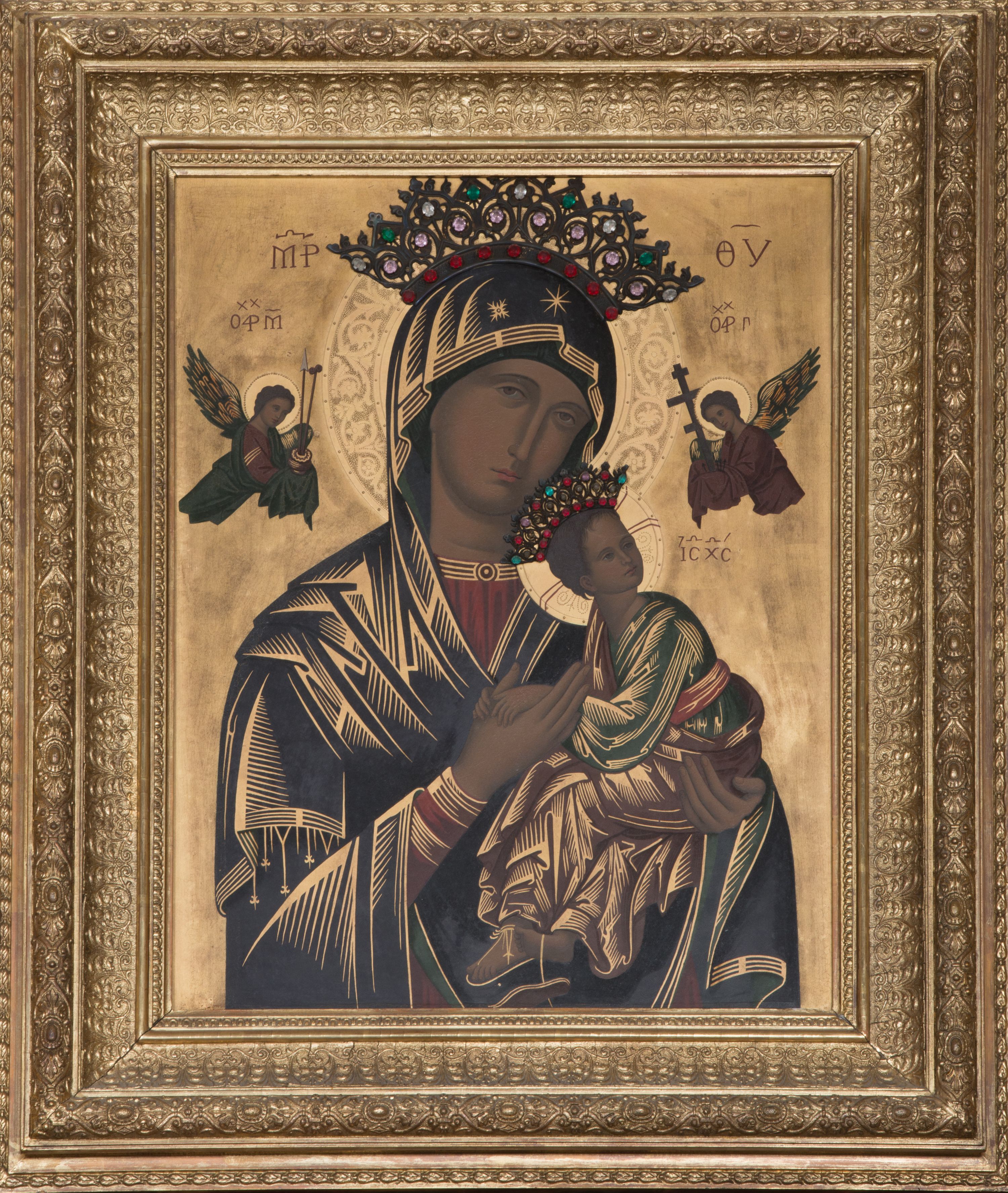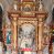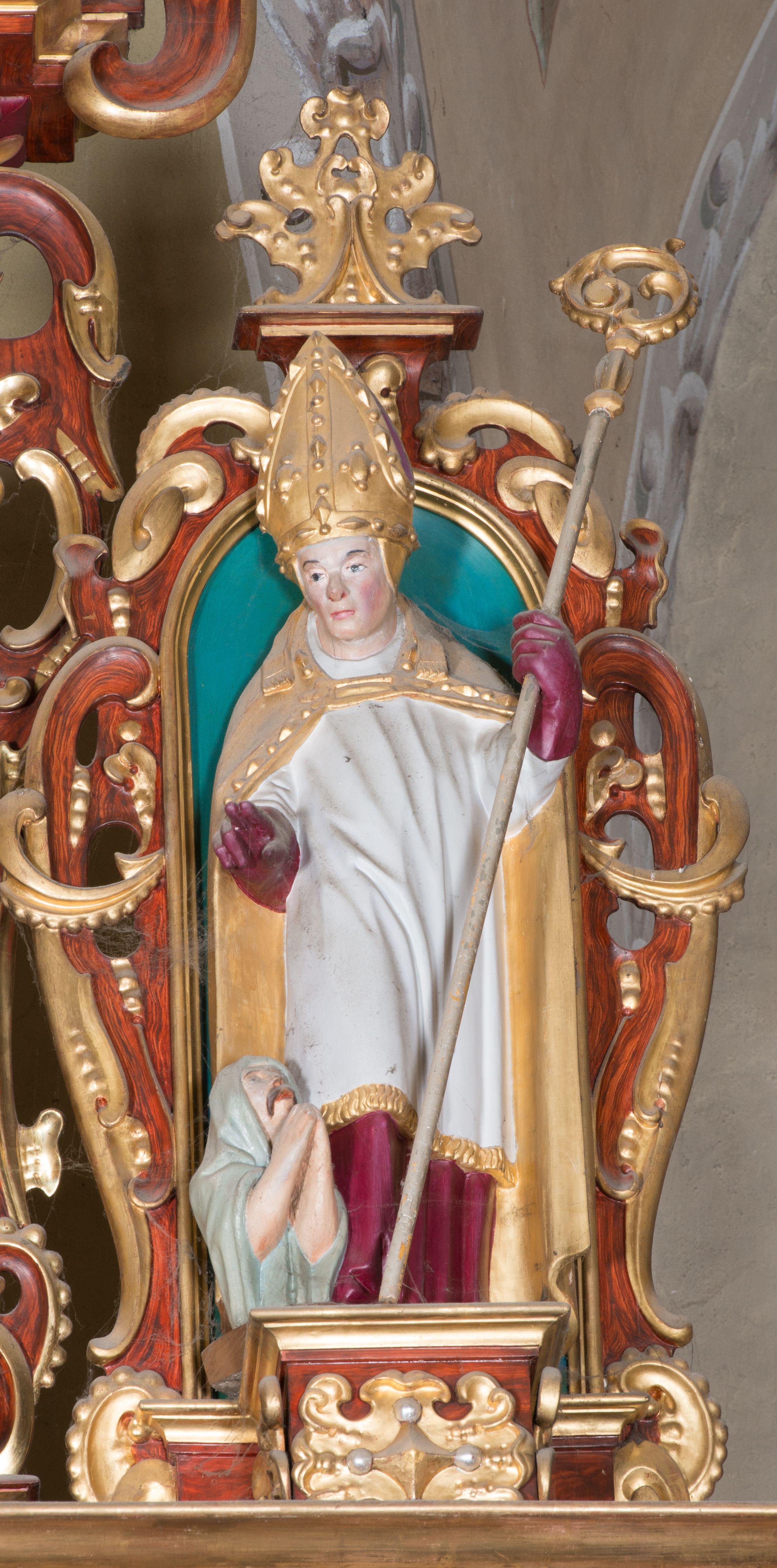 Nastawa polichromowana na czerwono z zielonymi i czarnymi elementami. Ornamentyka i kolumny złocone, kaboszony srebrzone.