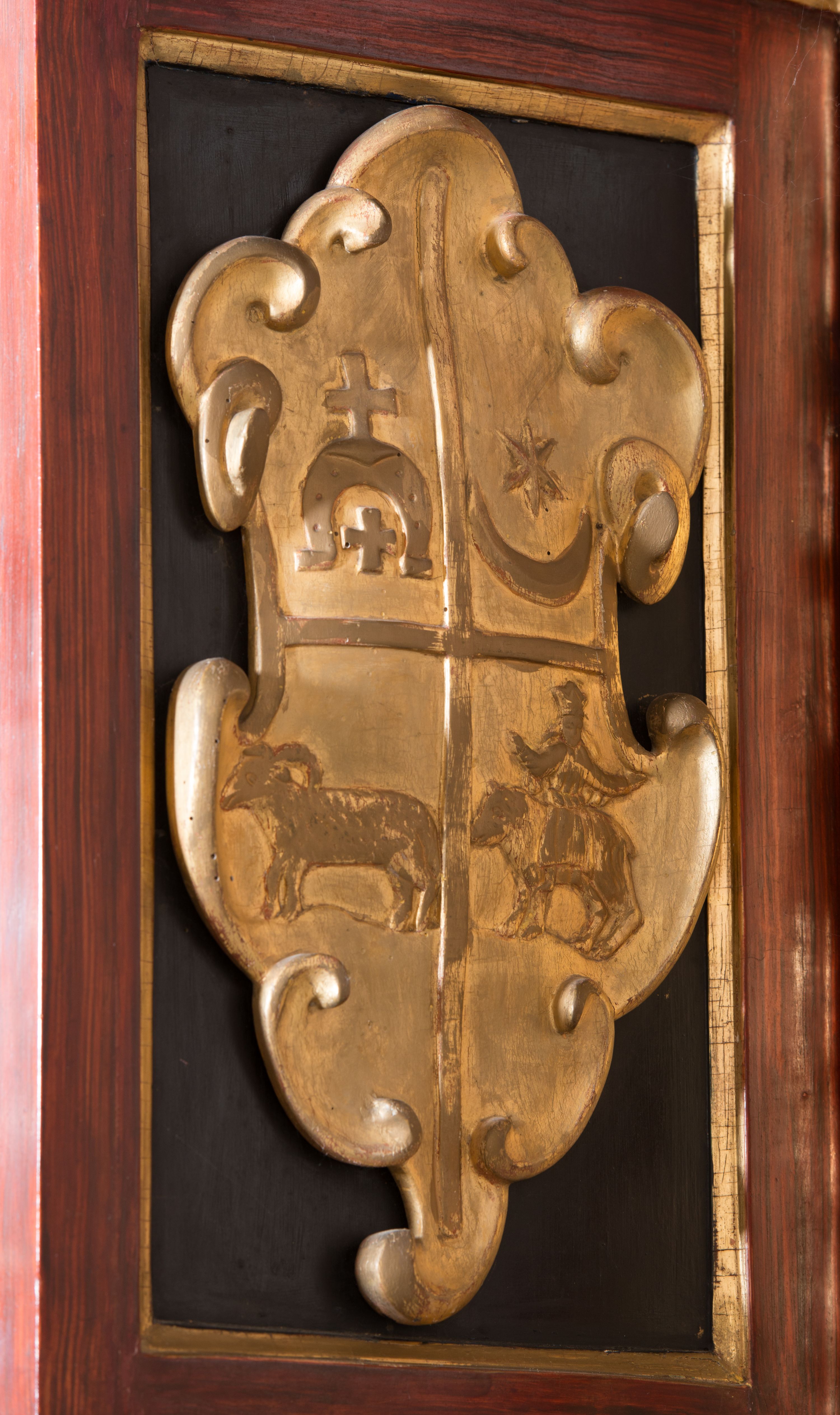 Cokoły kolumn pierwszej kondygnacji dekorowane są z frontu uskrzydlonymi główkami anielskimi, na zewnętrznych bokach kartuszami z tarczą herbową czteropolową z herbami: Lubicz, Leliwa, Junosza i Rawicz; od wewnątrz ornamentem małżowinowym z chrząstką i kaboszonem. Cokoły kolumn pierwszej kondygnacji w jednej trzeciej wysokości zdobione są ornamentem małżowinowym z kaboszonami, powyżej trzon otoczony jest podwiązaną tkaniną. W polu środkowym w przyłuczach arkady umieszczone są uskrzydlone główki anielskie; węgary od wewnątrz dekorowane są kaboszonami z małżowiną oraz rozetami, podłucze zaś rozetami. Fryz zdobiony jest kaboszonami z małżowiną; a gzyms dekoracją roślinno-geometryczną. Uszy z niszami utworzone są z ornamentu małżowinowo-chrząstkowego. Cokół drugiej kondygnacji dekorowany jest ornamentem małżowinowo-chrząstkowym i kaboszonem, a trzony kolumn utworzone są uskrzydlonych główek anielskich o stylizowanych na woluty skrzydłach. W czterech narożach pola obrazowego umieszczone są uskrzydlone główki anielskie. W polu fryzu znajduje się uskrzydlona główka anielska; gzyms dekorowany jest ornamentem roślinnym. Kondygnacja ujęta jest uszami z płaskiej małżowiny. Gzyms zakończony ażurowym ornamentem małżowinowo-chrząstkowym. Nisze z figurami otoczone są ornamentem małżowinowo-chrząstkowym i zwieńczone cokołami z palmetą.