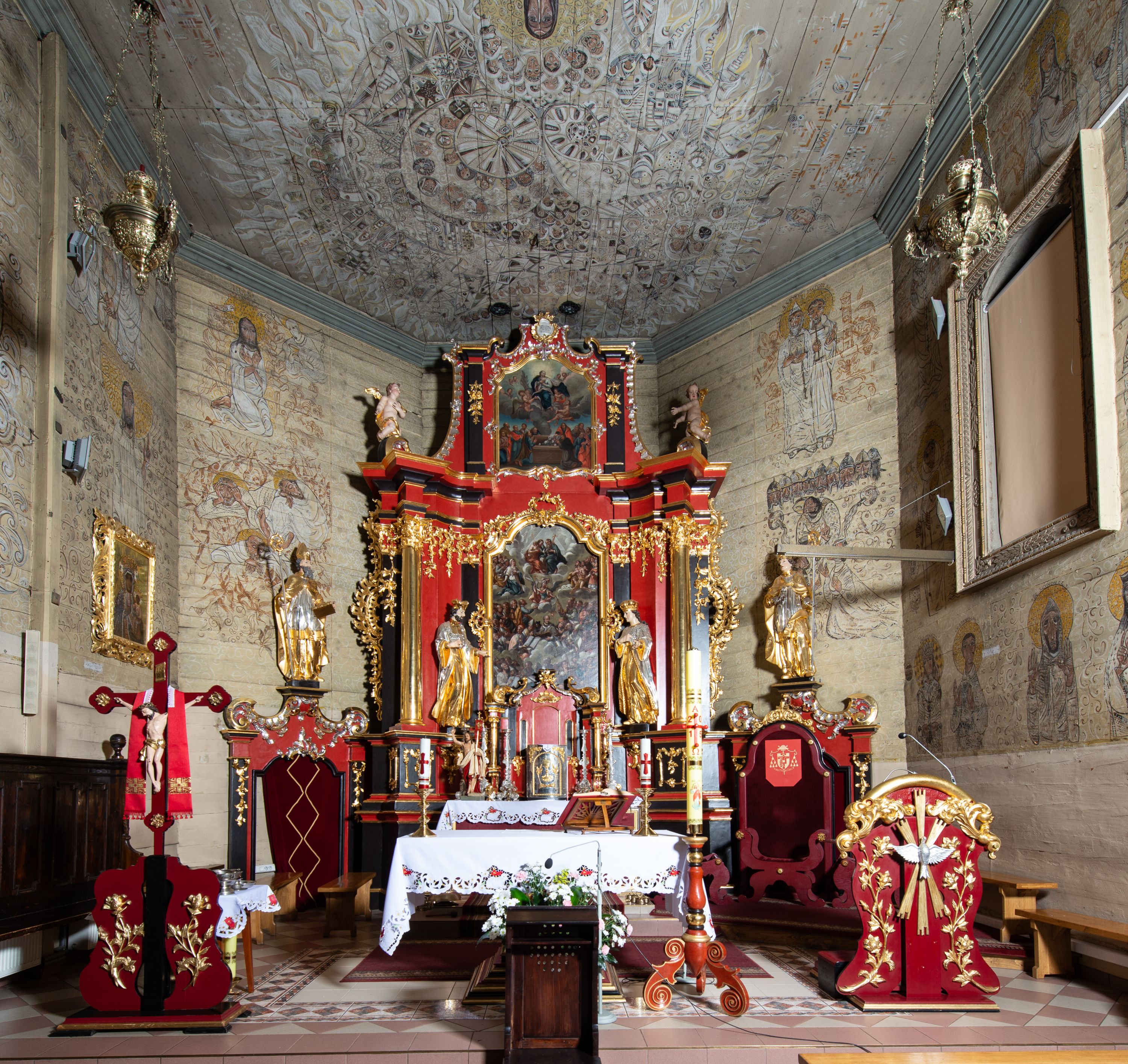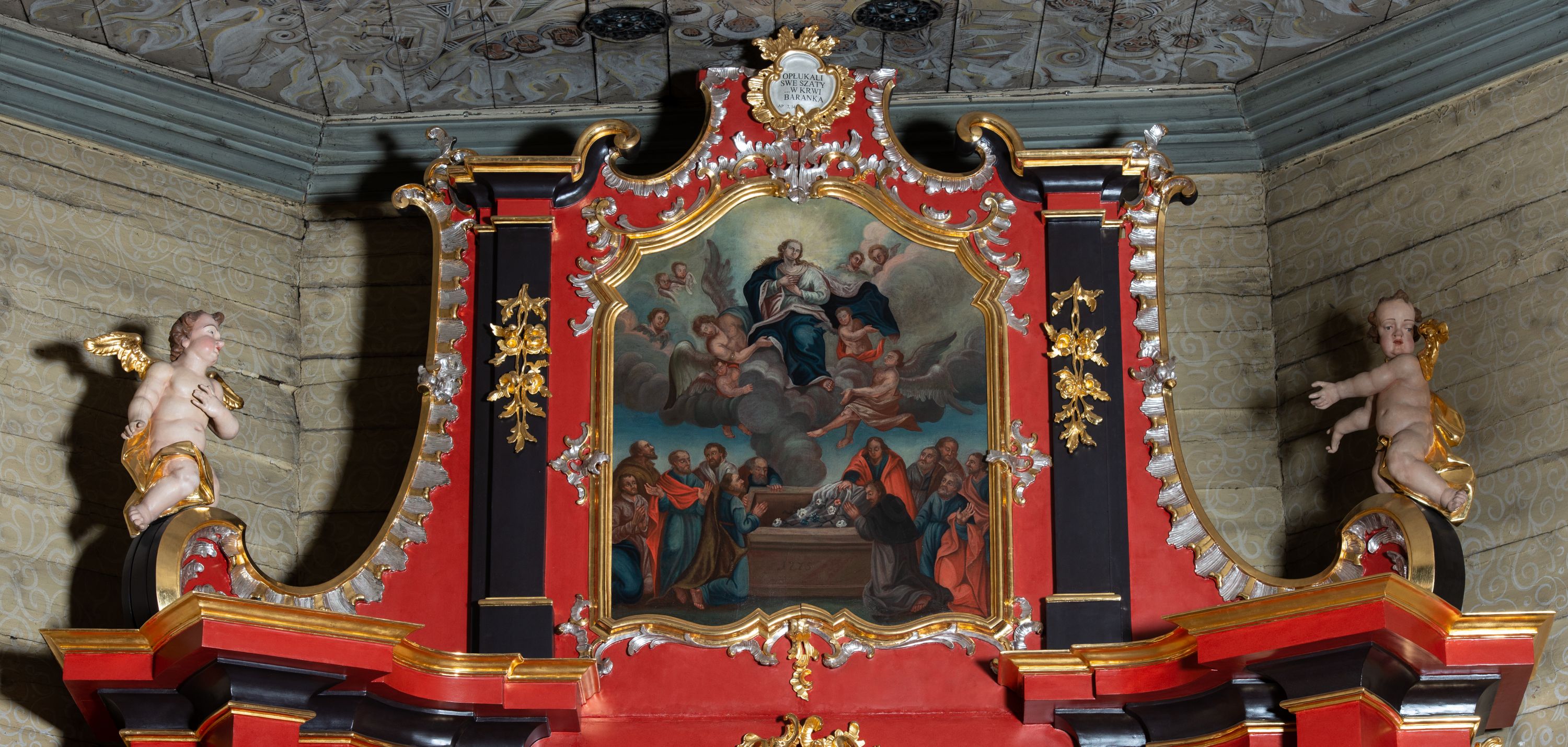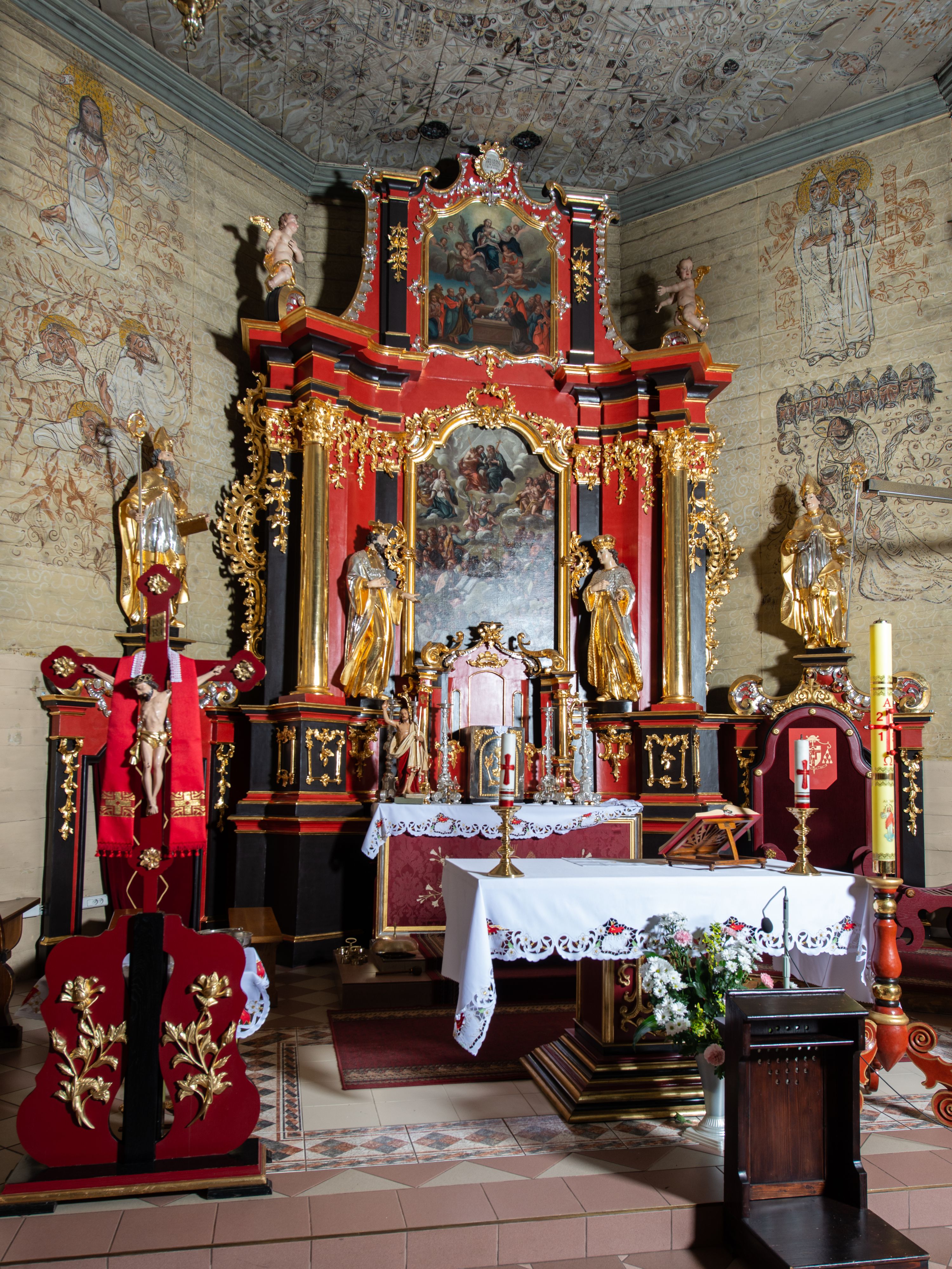 Pierwsza kondygnacja ujęta grupą zwielokrotnionych pilastrów, przed którymi stoją ustawione pod kątem cokoły z kolumnami o stylizowanych kapitelach kompozytowych, dźwigających pełne belkowanie, przerwane nad polem środkowym. Na tle pilastrów figury św. Jana Kantego po lewej stronie i św. Kazimierza po prawej. W polu środkowym obraz „Wszyscy Święci” ujęty profilowaną ramą w formie stojącego prostokąta, zamkniętego łukiem wklęsło-wypukłym z uskokami. Na zasuwie obraz przedstawiający Ukrzyżowanie Chrystusa. Druga kondygnacja w formie zbliżonej do kwadratu, flankowana przez zdwojone pilastry i spływy wolutowe, zamknięte szczytem z rocaille'owym kartuszem z napisem „OPŁUKALI / SWE SZATY / W KRWI / BARANKA / AP 7,14”. W polu obraz „Wniebowzięcie Najświętszej Marii Panny” ujęty profilowaną ramą w formie zbliżonej do kwadratu od dołu i od góry o wklęsło-wypukłym zarysie. Na zakończeniu spływów wolutowych usadzone dwie figury aniołów. Bramki w formie stojącego prostokąta ujętego parą pilastrów, dźwigających spływy wolutowe, podtrzymujące postumenty dla figur św. Stanisława po lewej stronie i św. Wojciecha po prawej. Przejścia w formie stojących prostokątów, zamkniętych stylizowanymi łukami segmentowymi nadwieszonymi. Całość dekorowana ornamentem rocaille'owym oraz różanymi zwisami w partii trzonów podpór, pierwsza kondygnacja flankowana rocaille'owymi, ażurowymi uszami. Struktura polichromowana w kolorze czerwonym, z malowanymi na czarno trzonami pilastrów i profilami, złoconymi kolumnami, profilami i ornamentyką oraz srebrzonymi detalami. Według dokumentacji konserwatorskiej na odwrociach baz kolumn znajdują się napisy „Leonora Olajassy żona organisty. 1887” oraz „Leonora Olajassy - organiścina. 1887”.