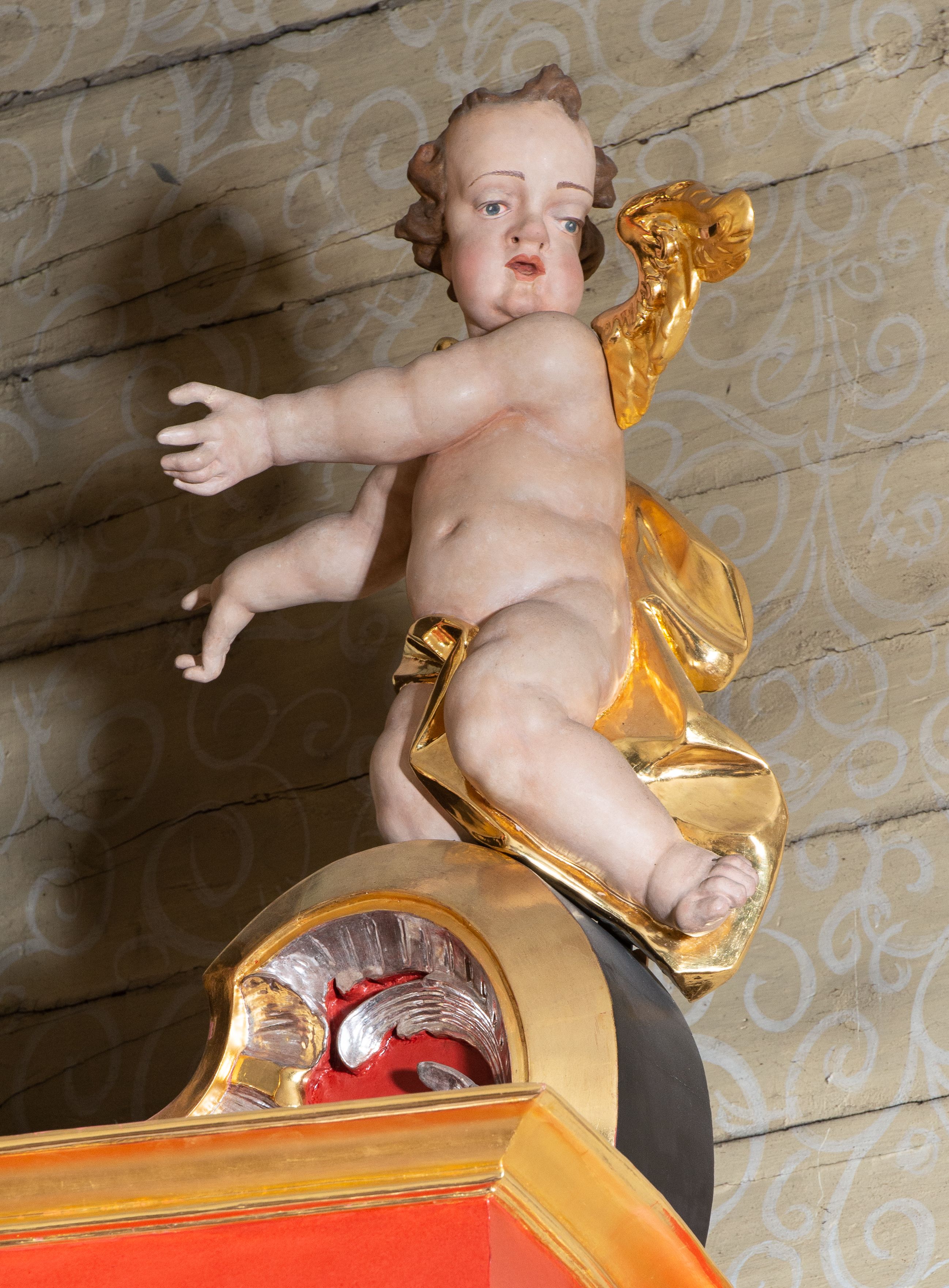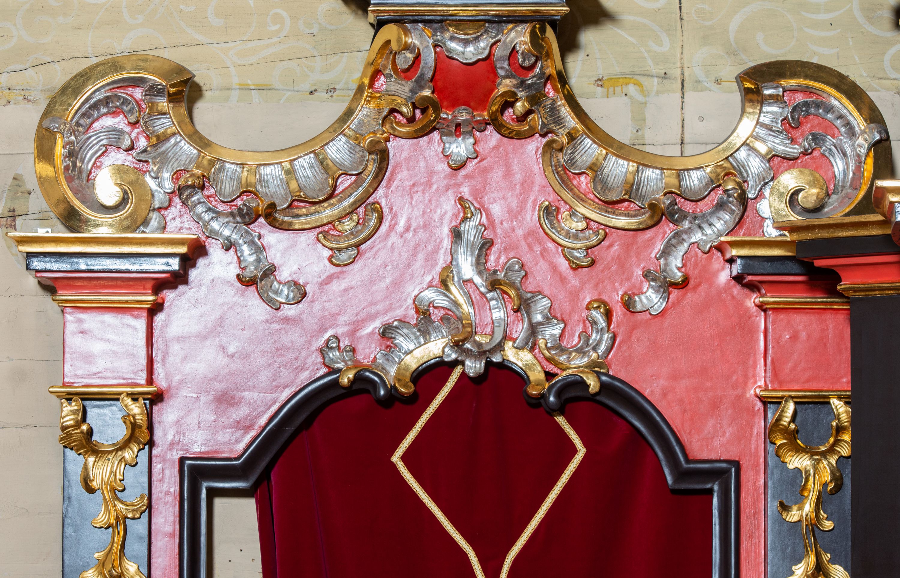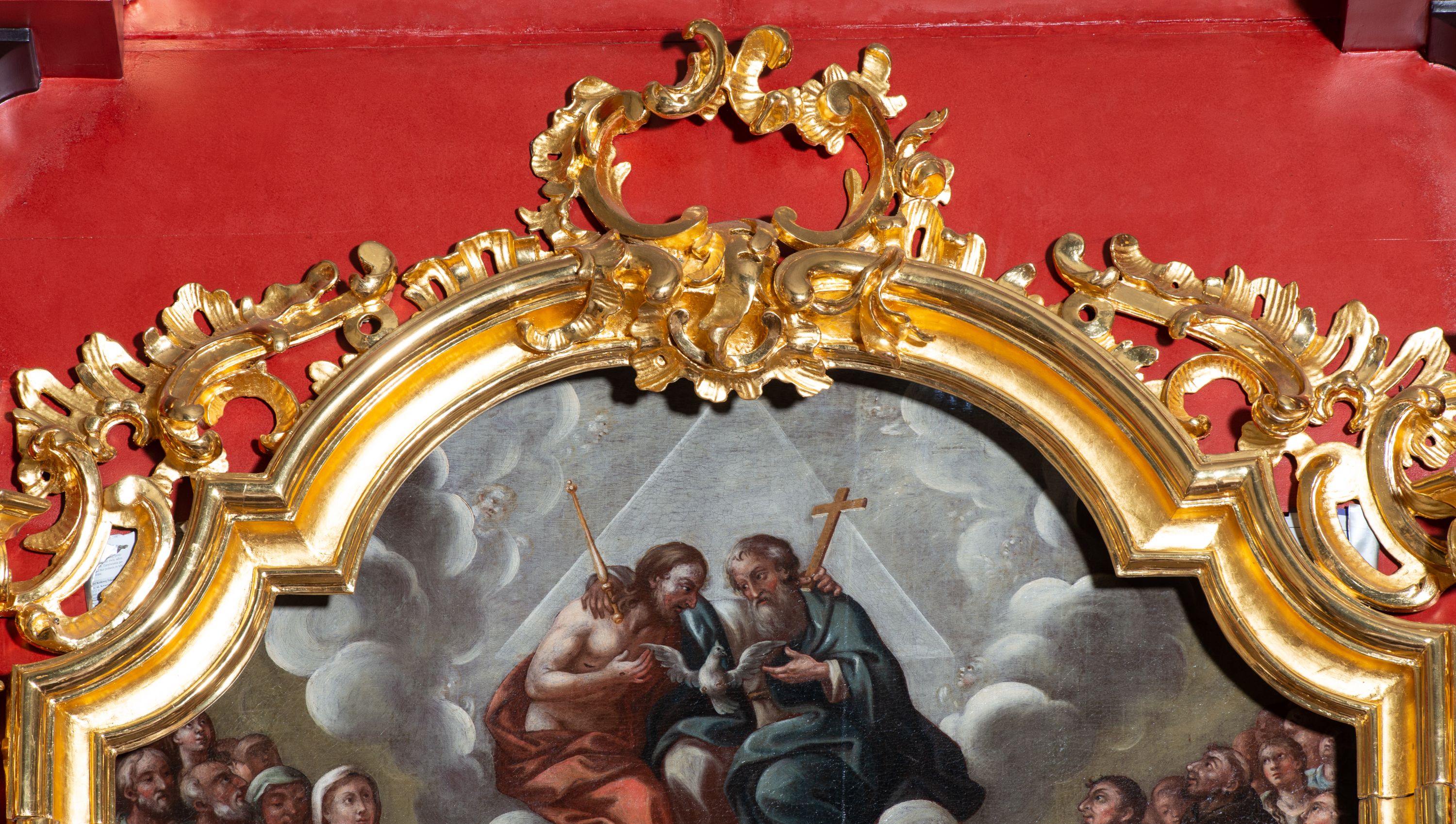 Pierwsza kondygnacja ujęta grupą zwielokrotnionych pilastrów, przed którymi stoją ustawione pod kątem cokoły z kolumnami o stylizowanych kapitelach kompozytowych, dźwigających pełne belkowanie, przerwane nad polem środkowym. Na tle pilastrów figury św. Jana Kantego po lewej stronie i św. Kazimierza po prawej. W polu środkowym obraz „Wszyscy Święci” ujęty profilowaną ramą w formie stojącego prostokąta, zamkniętego łukiem wklęsło-wypukłym z uskokami. Na zasuwie obraz przedstawiający Ukrzyżowanie Chrystusa. Druga kondygnacja w formie zbliżonej do kwadratu, flankowana przez zdwojone pilastry i spływy wolutowe, zamknięte szczytem z rocaille'owym kartuszem z napisem „OPŁUKALI / SWE SZATY / W KRWI / BARANKA / AP 7,14”. W polu obraz „Wniebowzięcie Najświętszej Marii Panny” ujęty profilowaną ramą w formie zbliżonej do kwadratu od dołu i od góry o wklęsło-wypukłym zarysie. Na zakończeniu spływów wolutowych usadzone dwie figury aniołów. Bramki w formie stojącego prostokąta ujętego parą pilastrów, dźwigających spływy wolutowe, podtrzymujące postumenty dla figur św. Stanisława po lewej stronie i św. Wojciecha po prawej. Przejścia w formie stojących prostokątów, zamkniętych stylizowanymi łukami segmentowymi nadwieszonymi. Całość dekorowana ornamentem rocaille'owym oraz różanymi zwisami w partii trzonów podpór, pierwsza kondygnacja flankowana rocaille'owymi, ażurowymi uszami. Struktura polichromowana w kolorze czerwonym, z malowanymi na czarno trzonami pilastrów i profilami, złoconymi kolumnami, profilami i ornamentyką oraz srebrzonymi detalami. Według dokumentacji konserwatorskiej na odwrociach baz kolumn znajdują się napisy „Leonora Olajassy żona organisty. 1887” oraz „Leonora Olajassy - organiścina. 1887”.