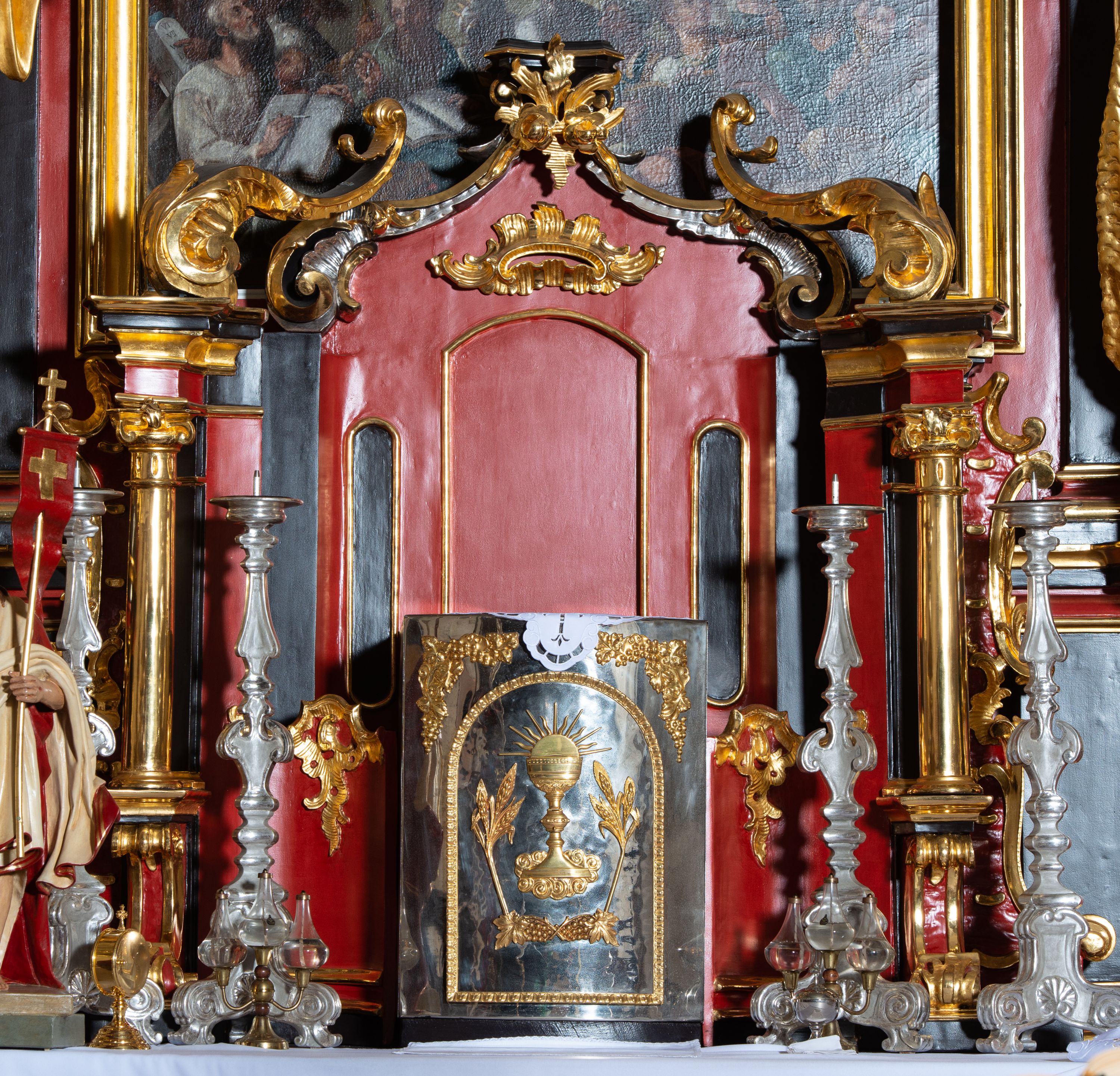 Nastawa architektoniczna, dwukondygnacyjna, jednoosiowa z bramkami, na dwustrefowym cokole. Ołtarz kamienny, prostopadłościenny, w drewnianej obudowie, mensa drewniana z marmurowym portatylem. Antepedium w formie leżącego prostokąta ujętego profilowaną ramą; pole wyłożone tkaniną o kwiatowym wzorze z haftowanym medalionem w glorii z monogramem IHS; ujęty gałązkami lilii. Tabernakulum w formie drewnianej skrzynki z wypukłym frontem, obite srebrzoną blachą. Drzwiczki w kształcie stojącego prostokąta zamkniętego łukiem półkolistym, obwiedzione ramą. W polu aplikacja kielicha z hostią w glorii, ujętego kłosami zbóż; w przyłuczach ornament roślinny. Tabernakulum w architektonicznej obudowie tworzącej tron wystawienia; ujęte parą postumentów dekorowanych rocaille'owymi płycinami oraz parą filarów, przed którymi stoi para kolumn na postumentach utworzonych z ornamentalnych konsol. Podpory dźwigają belkowanie, wyłamane pośrodku, przerwane nad tabernakulum. Za tabernakulum niewielka ścianka zamknięta szczytem utworzonym z dwóch spływów wolutowych. Ze szczytu na belkowanie spływają ornamentalne woluty. Tron ujęty rocaille'owymi uszami.