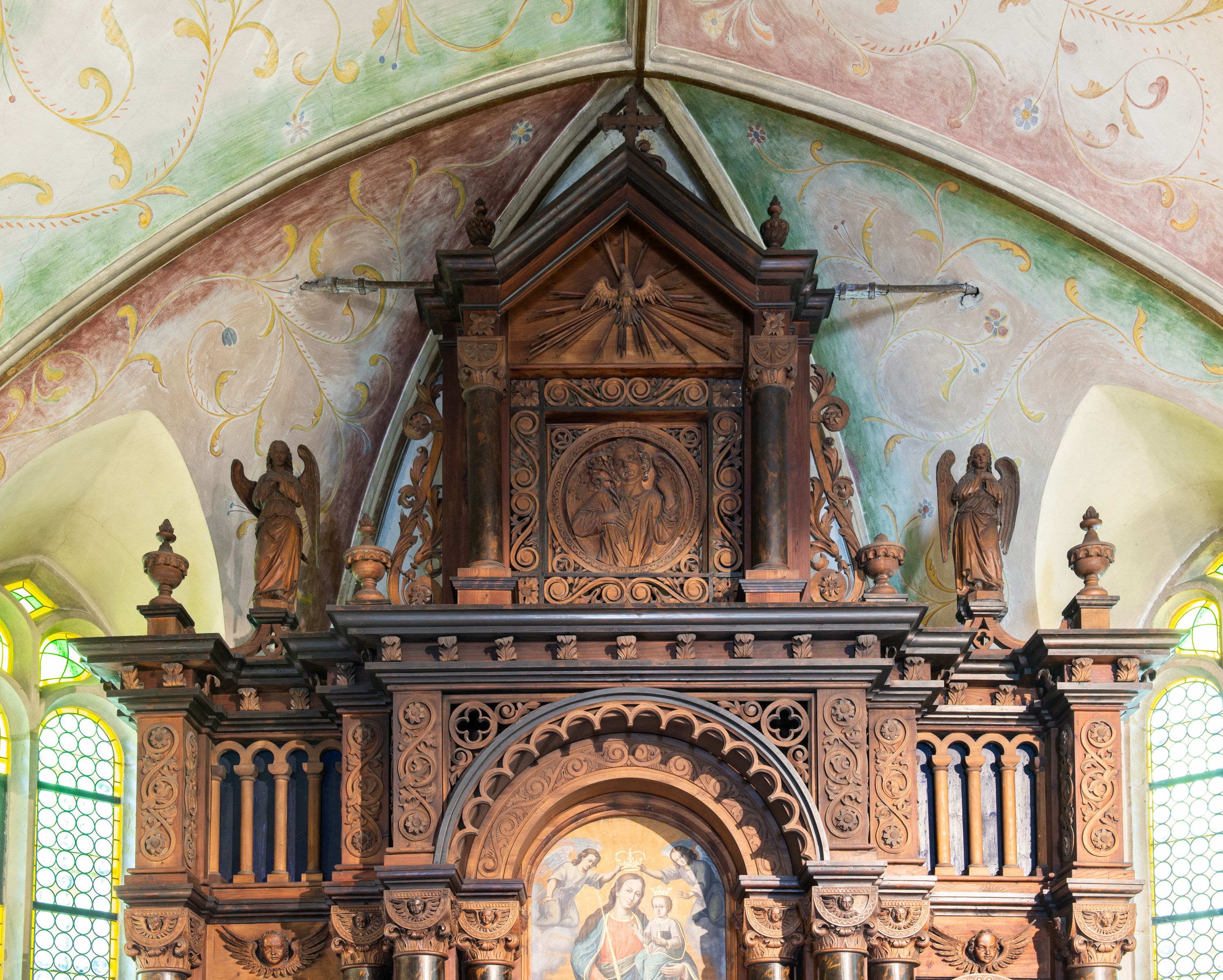 Ołtarz architektoniczny, jednokondygnacyjny, trójosiowy, ze zwieńczeniem. Ołtarz prostopadłościenny, kamienny, ustawiony na podstawie, w drewnianej obudowie. Mensa drewniana z marmurowym portatylem. Tabernakulum w formie prostopadłościennej metalowej skrzynki w drewnianej obudowie. Metalowe drzwiczki zdobi motyw kielicha eucharystycznego. Tabernakulum ujęte jest po bokach parą wolnostojących kolumienek wspierających wysunięte ponad nimi, wieńczące je belkowanie z wysokim fryzem. W partii belkowania nad drzwiczkami arkada dekorowana koronką i maswerkowymi rozetami w przyłuczach. Na belkowaniu tron wystawienia, na którym ustawiony krucyfiks. Osadzona na cokole nastawa ołtarza ma formę trójprzelotowego łuku triumfalnego. Część środkowa w kształcie półkolistej arkady wspartej na dwóch parach kolumn, z których wewnętrzne są cofnięte względem zewnętrznych. Arkady artykułujące osie boczne są mniejsze, ujmuje je po jednej parze kolumn wspierających zryzalitowane cokoły flankujące pola wypełnione fryzem arkadkowym. Zwieńczenie ołtarza ujmuje para kolumn wspierających gzyms w formie trójkątnego przyczółka. Pola cokołów retabulum zdobi stylizowana ornamentyka roślinna, kapitele kolumn oraz zwieńczenia arkad osi bocznych motywy uskrzydlonych główek anielskich. Krawędź łuku arkady części środkowej obiega fryz arkadkowy. W przyłuczach arkady ażurowe maswerki. Gzyms wieńczący kondygnację retabulum ujmuje motyw konsolek w formie liści akantu. Zwieńczenie flankowane parą ażurowych uszaków w postaci ornamentu roślinnego, parą figur aniołów oraz dwiema parami wazonów. Pole przyczółka wypełnia płaskorzeźbione przedstawienie gołębicy Ducha Świętego na tle promienistej glorii. Po jego bokach znajduje się para wazonów, szczyt jest w formie krzyża. Zwieńczenie flankują dwie figury aniołów ujęte po bokach dwoma parami wazonów.