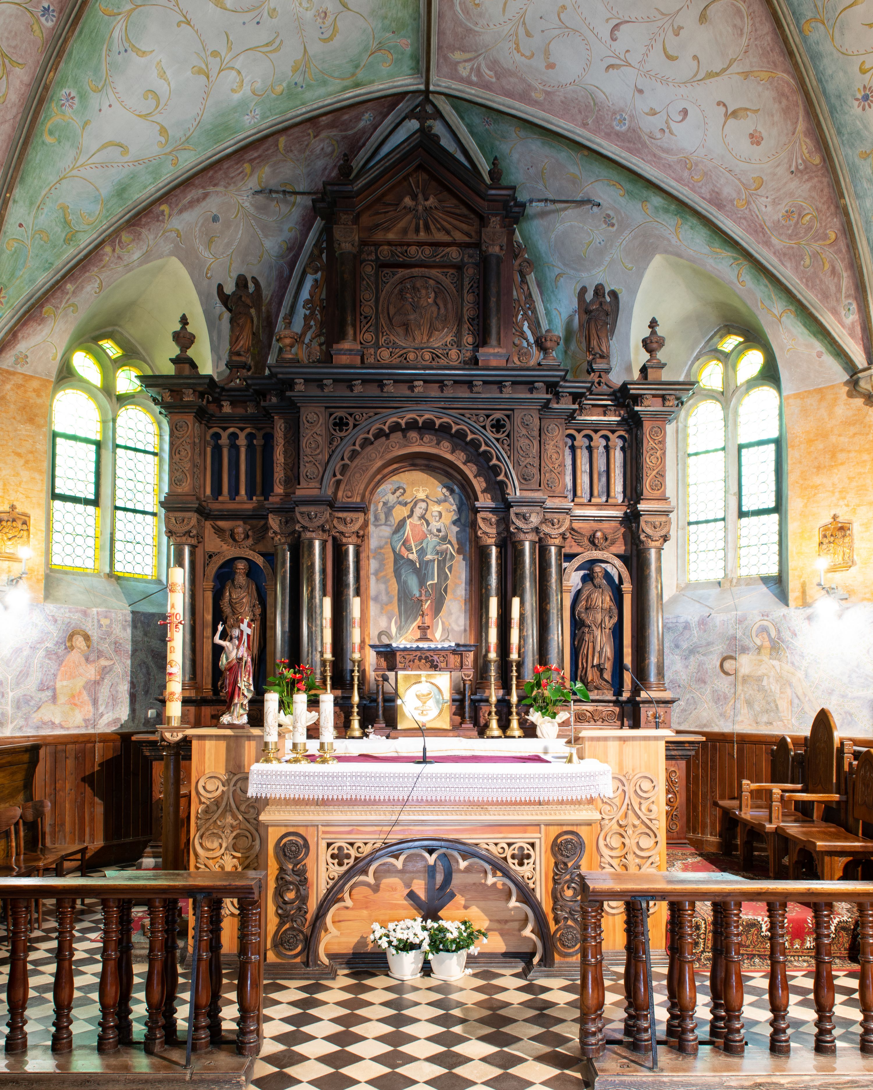 Struktura retabulum utrzymana w kolorze drewna, trzony kolumn i część detali architektonicznych marmoryzowane, tła osi bocznych polichromowane w kolorze ciemnoniebieskim.