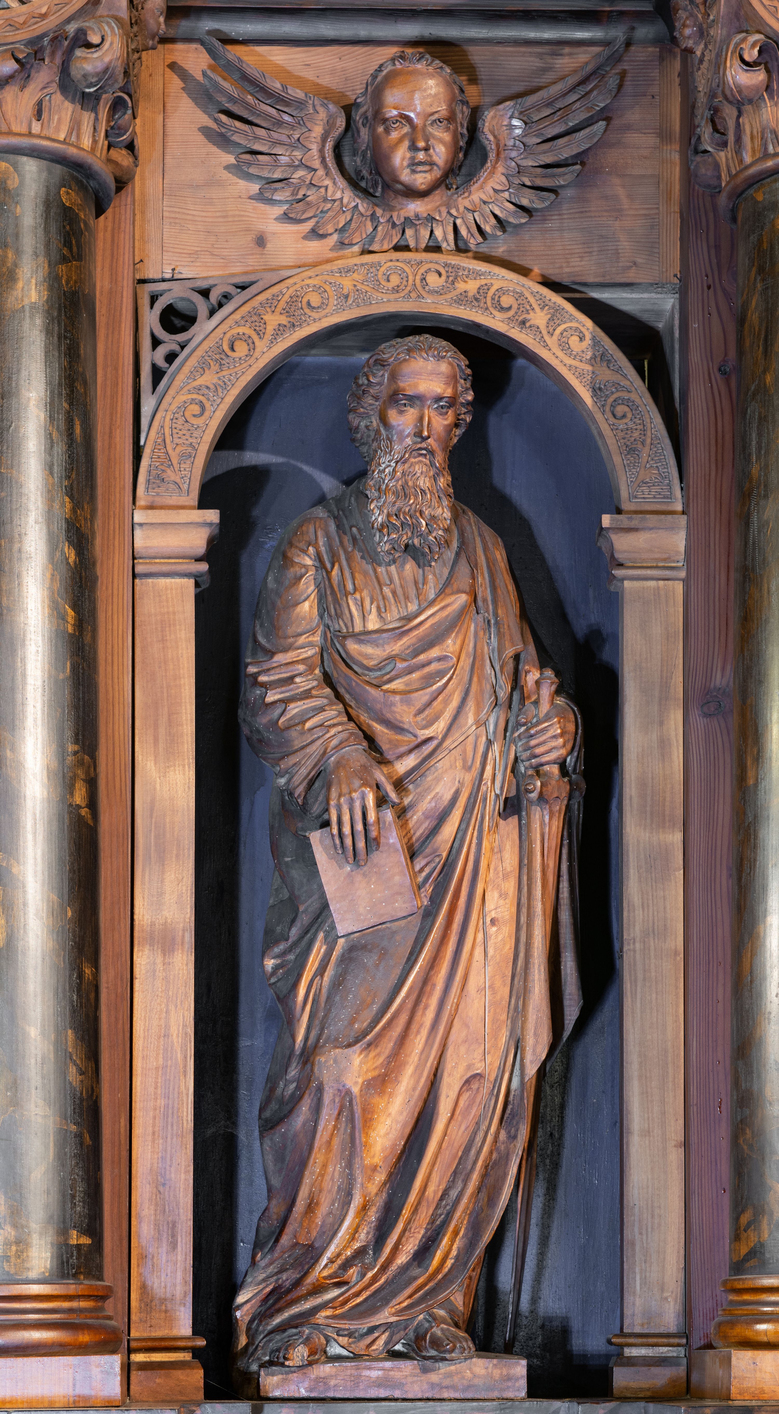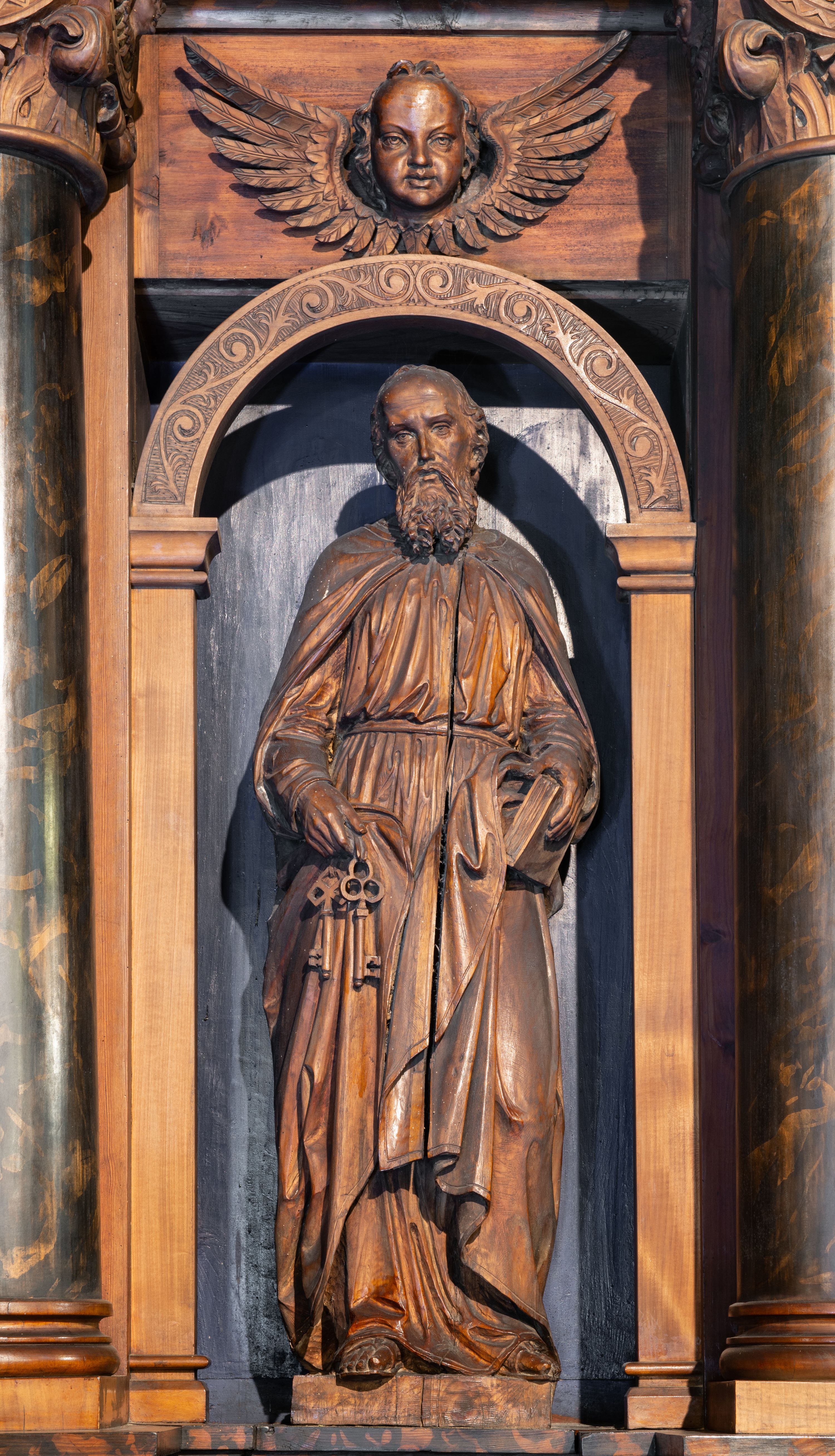 Pole części środkowej w kształcie stojącego prostokąta zamkniętego półkoliście z obrazem Madonny z Dzieciątkiem. W niszach osi bocznych są figury św. Piotra po prawej stronie i św. Pawła po lewej. Kształt pola zwieńczenia jest zbliżony do kwadratu ujętego szerokim obramieniem zdobionym parami S-kształtnych wolut. W środku znajduje się tondo z płaskorzeźbionym przedstawieniem anioła trzymającego kwiat lilii.