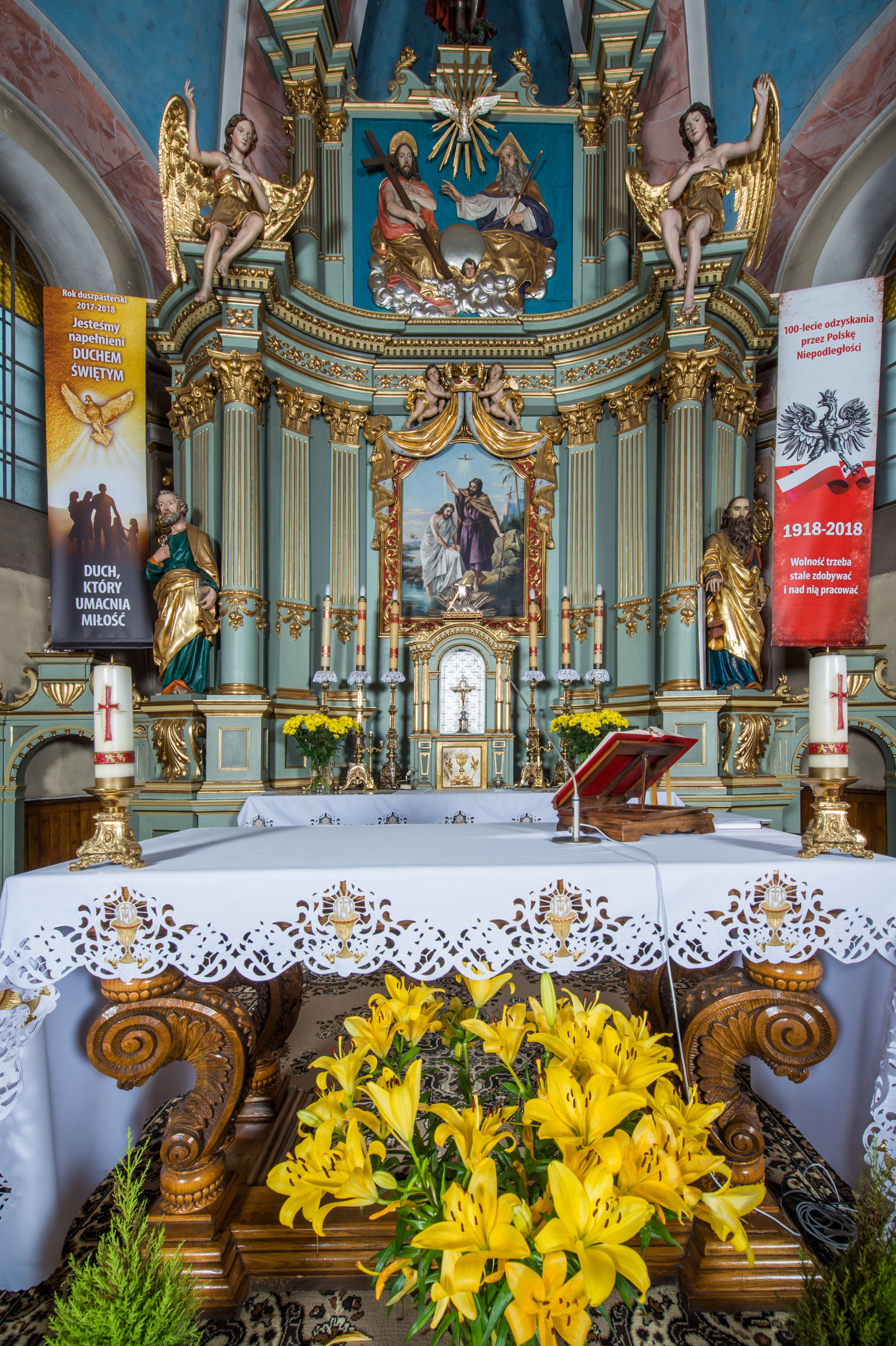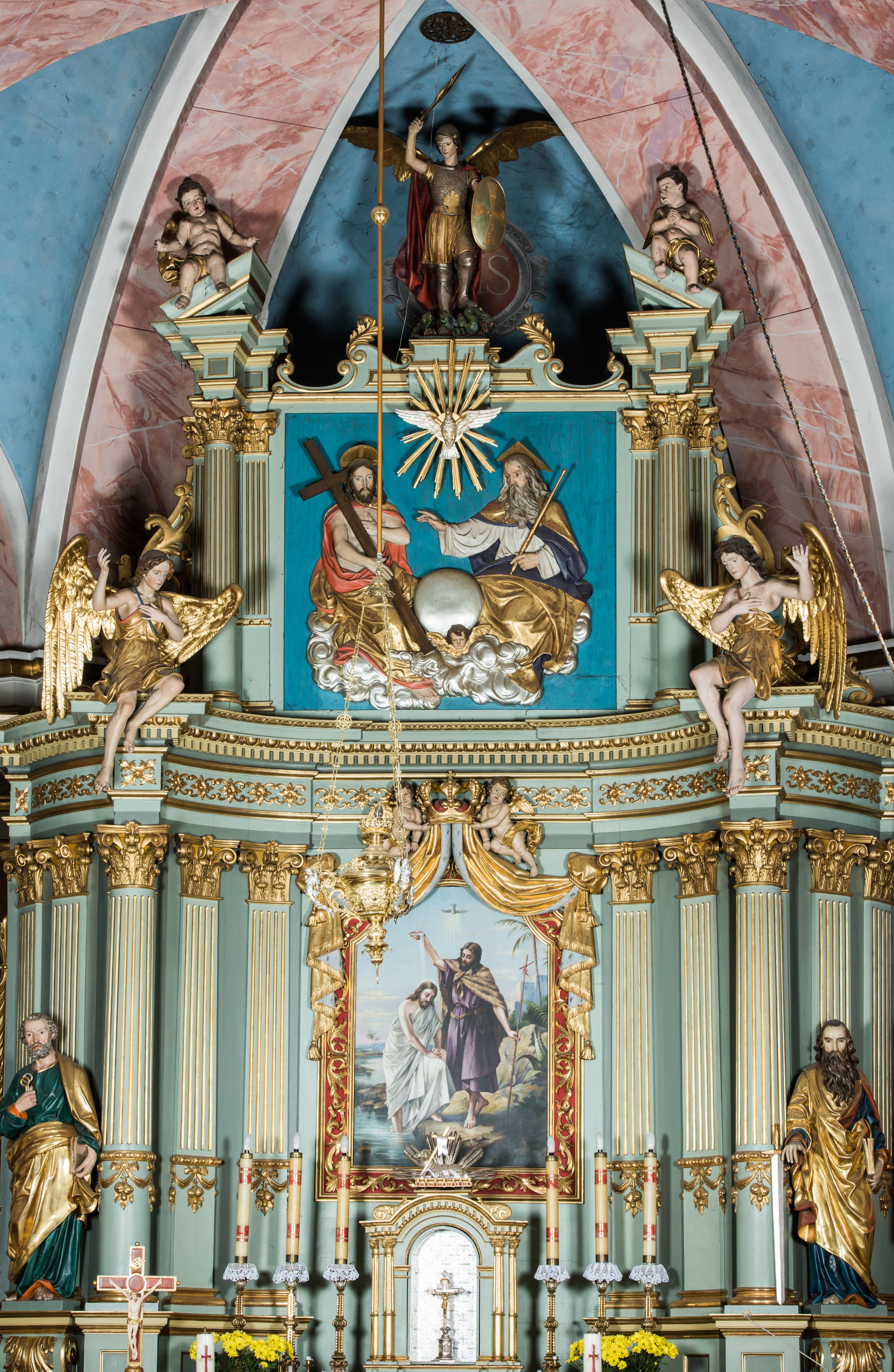 Ołtarz główny uzyskał formę przyściennej, dwukondygnacyjnej, neoklasycystycznej nastawy wzniesionej na rzucie elipsy z bocznymi bramkami. Stipes ołtarzowy uzyskał kształt leżącego prostopadłościanu podtrzymującego drewnianą mensę z portatylem. Jego lico dekorowane jest trzema równoległymi płycinami utworzonymi ze złoconych, profilowanych listew. Na mensie ustawiono prostopadłościenne tabernakulum w formie skrzynki flankowane parą pilastrów podtrzymujących nastawę tronu eucharystycznego. Ujmują go po bokach pary złoconych kolumn z korynckimi kapitelami podtrzymujące belkowanie wygięte na osi półkoliście. Na zwieńczeniu tabernakulum ustawiono leżącego na zamkniętej księdze z siedmioma pieczęciami srebrnego baranka apokaliptycznego na tle srebrzonych promieni. Pomiędzy kolumnami w polu zainstalowano obrotowy bęben z dwiema półkolistymi niszami. Retabulum zostało wsparte na wysokim cokole. Dolną kondygnację artykułują zwielokrotnione pilastry o kanelowanych trzonach i złoconych, kompozytowych głowicach oraz dwie wysunięte do przodu kanelowane kolumny o kapitelach kompozytowych. Podpory podtrzymują szeroki architraw wklęsło-wypukły dekorowany motywami roślinnymi oraz perełkami i ząbkami, wyłamany na przedłużeniu kolumn. W miejscu wyłamań usytuowano siedzących dwóch uskrzydlonych aniołów. Po bokach kolumn na konsolach ustawiono figury św. Piotra i św. Pawła. Boki ołtarza zamykają ażurowe wici roślinne pełniące rolę zredukowanych uszaków. W polu środkowym retabulum umieszczono prostokątne obramienie utworzone z dekoracyjnej ramy zdobionej wicią roślinną oraz podwieszonego u jej góry paludamentum z koroną podtrzymywaną przez dwa aniołki. W środku zainstalowano obraz Matki Boskiej Śnieżnej, a na zasuwie przedstawienie Chrztu Chrystusa w Jordanie. Zwieńczenie nastawy uzyskało kształt leżącego prostokąta flankowanego po bokach parą kanelowanych pilastrów o korynckich głowicach, na tle których ustawiono dwie kolumny podtrzymujących przerwane belkowanie z przerwanym przyczółkiem. Na osi zwieńczenia na postumencie ustawiono rzeźbę św. Michała Archanioła, a na przyczółkach rzeźby dwóch siedzących aniołów. W polu między pilastrami i kolumnami znalazło się płaskorzeźbione przedstawienie Trójcy Przenajświętszej. Dwie flankujące retabulum bramki ozdobiono dwoma aniołkami siedzącymi na ich zwieńczeniu na postumencie. Struktura całości pomalowane jest na zielono, ornamenty i profile wyzłocono, a rzeźby otrzymały naturalistyczną polichromię.