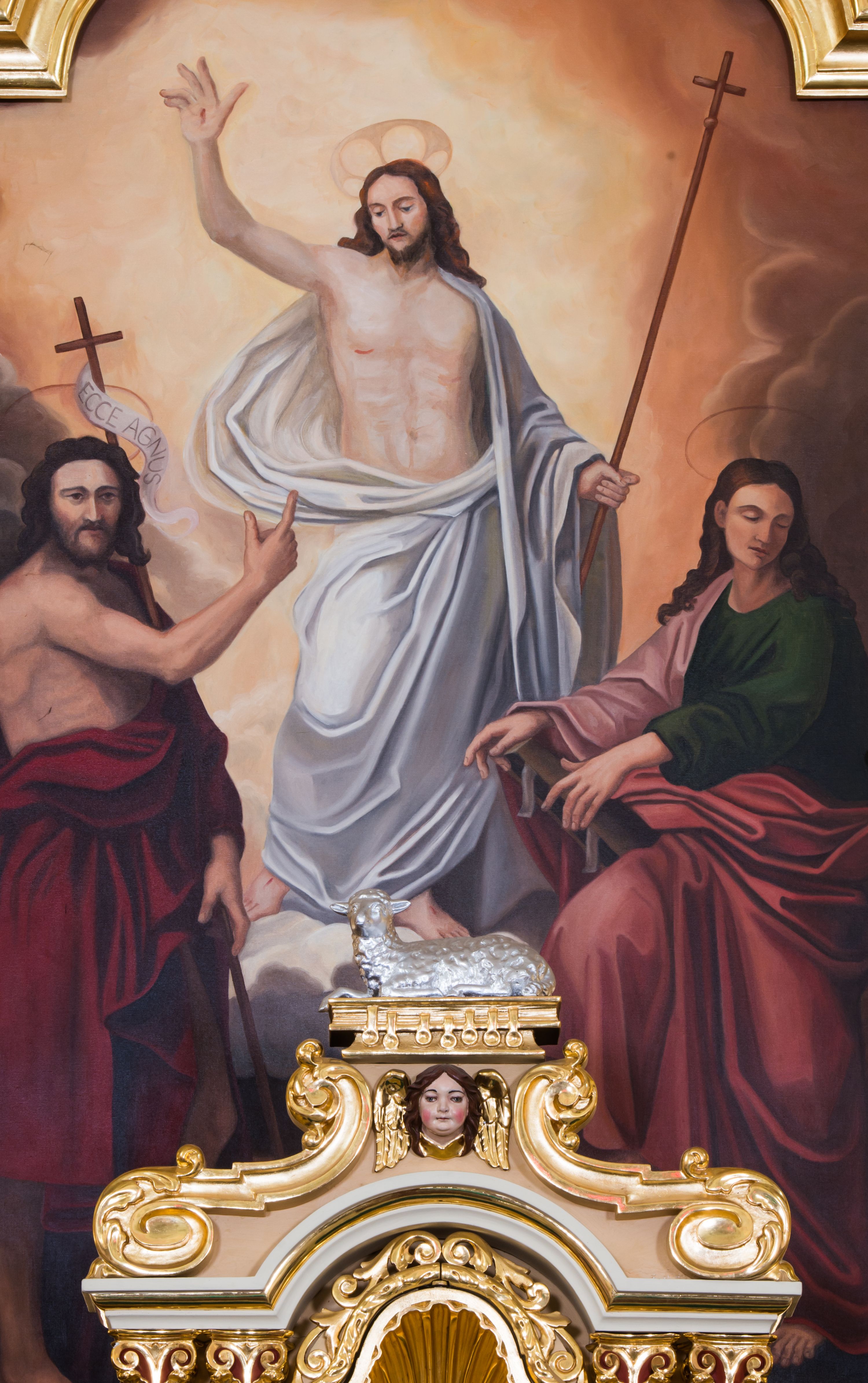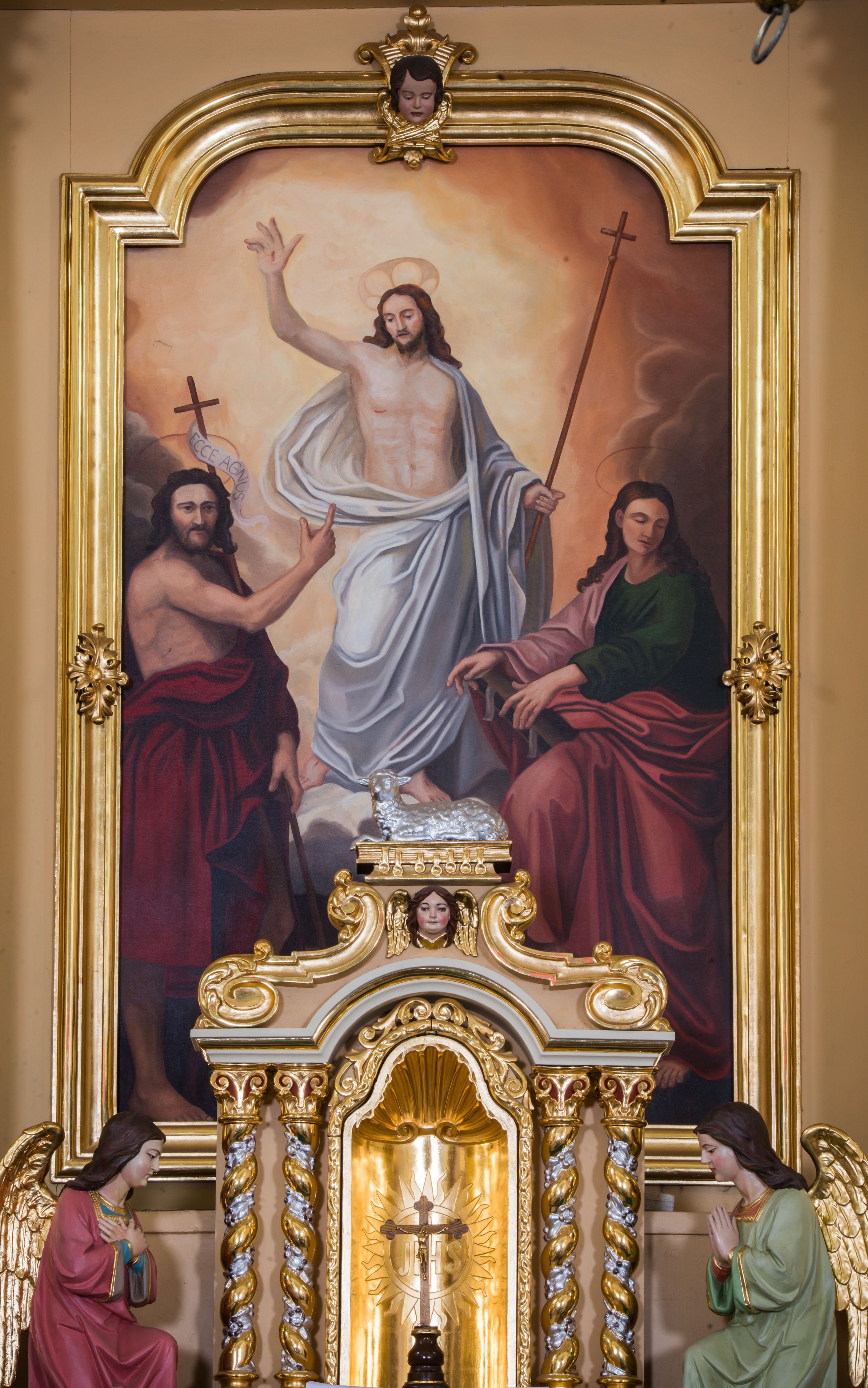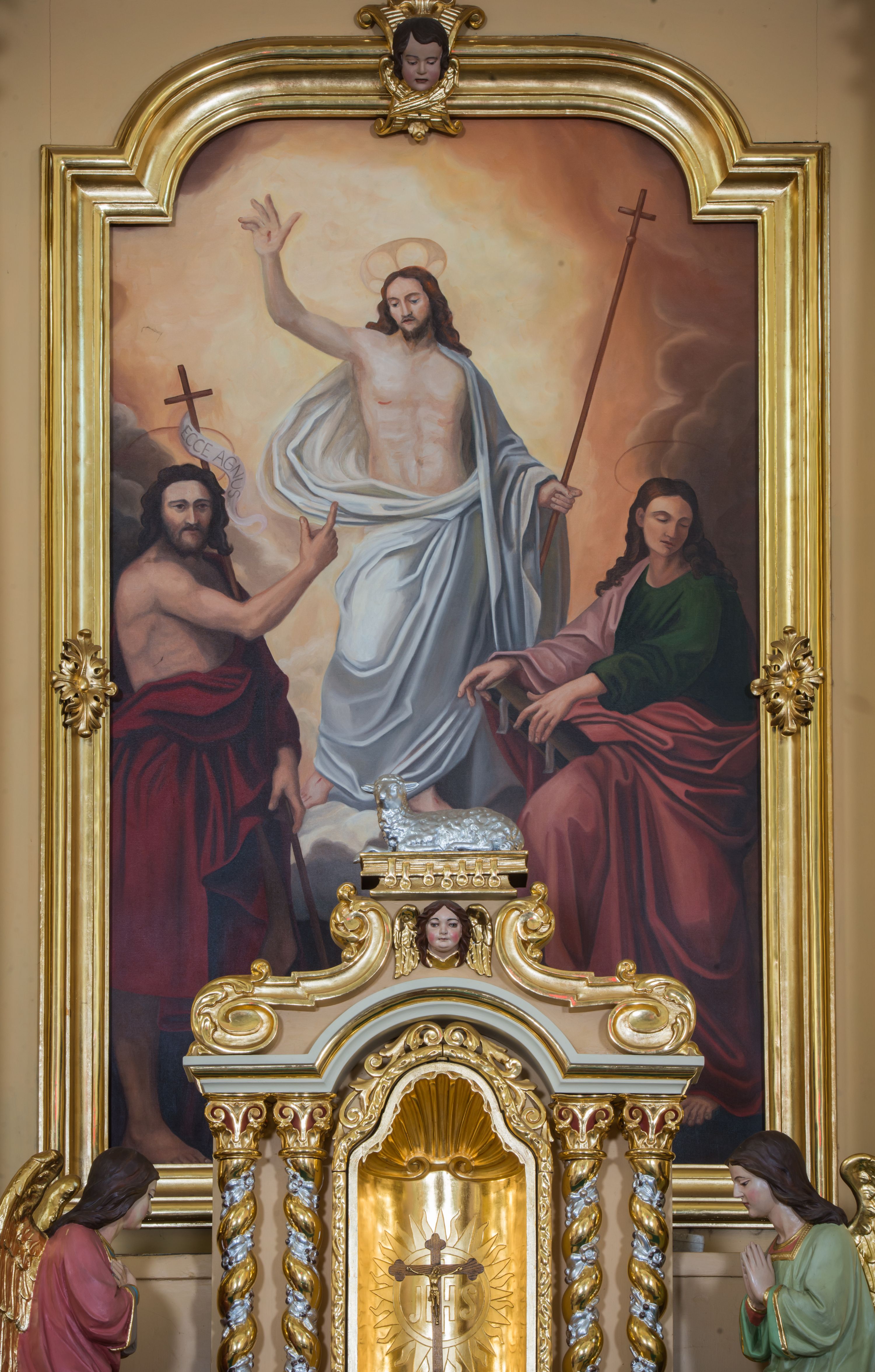 Jednokondygnacyjna nastawa ze zwieńczeniem uzyskała architektoniczną strukturę wzbogaconą o flankujące ją bramkami. Współczesny marmurowy stipes ołtarzowy wspierający mensę uzyskał formę prostopadłościanu z licem artykułowanym dwiema półkolumienkami. Na mensie ustawiono tabernakulum w formie drewnianej skrzynki, obitej trybowaną blachą. Drzwiczki uzyskały kształt stojącego prostokąta zamkniętego łukiem półkolistym. W ich polu wyobrażono kielich z hostią w glorii, ujęty trybowanym winnym gronem i aplikowanymi kłosami zbóż. Z dwóch stron drzwiczek widnieje trybowana dekoracja w postaci winnego grona. Na tabernakulum usytuowano tron wystawienia, w postaci obrotowej niszy ujętej dwiema parami kolumienek podtrzymujących gzyms wyłamany pośrodku na kształt łuku odcinkowego oraz cokół z figurką baranka na księdze z siedmioma pieczęciami, podtrzymywany przez dwa spływy wolutowe. Tabernakulum ujęte zostało dwoma postumentami dekorowanymi z przodu rozetami. Ustawiono na nich figury klęczących aniołów. Nastawa ujęta została dwiema parami kolumn o kapitelach kompozytowych ustawionych na cokołach dekorowanych płycinami z ornamentem roślinnym, podtrzymujących pełne belkowanie z silnie wysuniętym gzymsem, oraz zewnętrzną parą cofniętych w tył kolumn. W polu głównym usytuowano obraz z przedstawieniem Zmartwychwstałego Chrystusa ze św. Janem Chrzcicielem i św. Janem Ewangelistą, ujęty profilowaną ramą w formie stojącego prostokąta zamkniętego łukiem odcinkowych nadwieszonym. Kondygnacja ujęta została po bokach uszami utworzonymi z karbowanej wstęgi i akantu. Zwieńczenie nastawy ustawiono na schodkowym, zwężającym się cokole, dekorowanym medalionem z monogramem Marii oraz anthemionami. Ujmują je dwie pary kolumienek o kapitelach kompozytowych podtrzymujących gzyms wyłamujący się po środku na kształt łuku półkolistego, dekorowany wicią roślinną. W polu zwieńczenia znalazł się obraz w formie stojącego owalu z przedstawieniem Dzieciątka Jezus prezentującego krzyż, ujęty profilowaną ramą dekorowaną ornamentem roślinnym. Zwieńczenie flankują stojące na gzymsie figury św. Józefa z Dzieciątkiem i Symeona z Dzieciątkiem. Nastawę flankują znajdujące się przy ścianie para kolumn i para półkolumn ustawionych na dwustrefowych cokołach, dźwigających pełne belkowanie, na którym siedzą dwa putta. Pomiędzy cokołem nastawy i zewnętrznych podpór ulokowano wygięte listwy tworzące bramki, na których stoją figury św. Piotra i św. Pawła. Struktura retabulum jest polichromowana w kolorze beżowym, z białymi i czerwonymi profilami i płycinami. Kolumny, ornamentyka i profile zostały pozłocone.