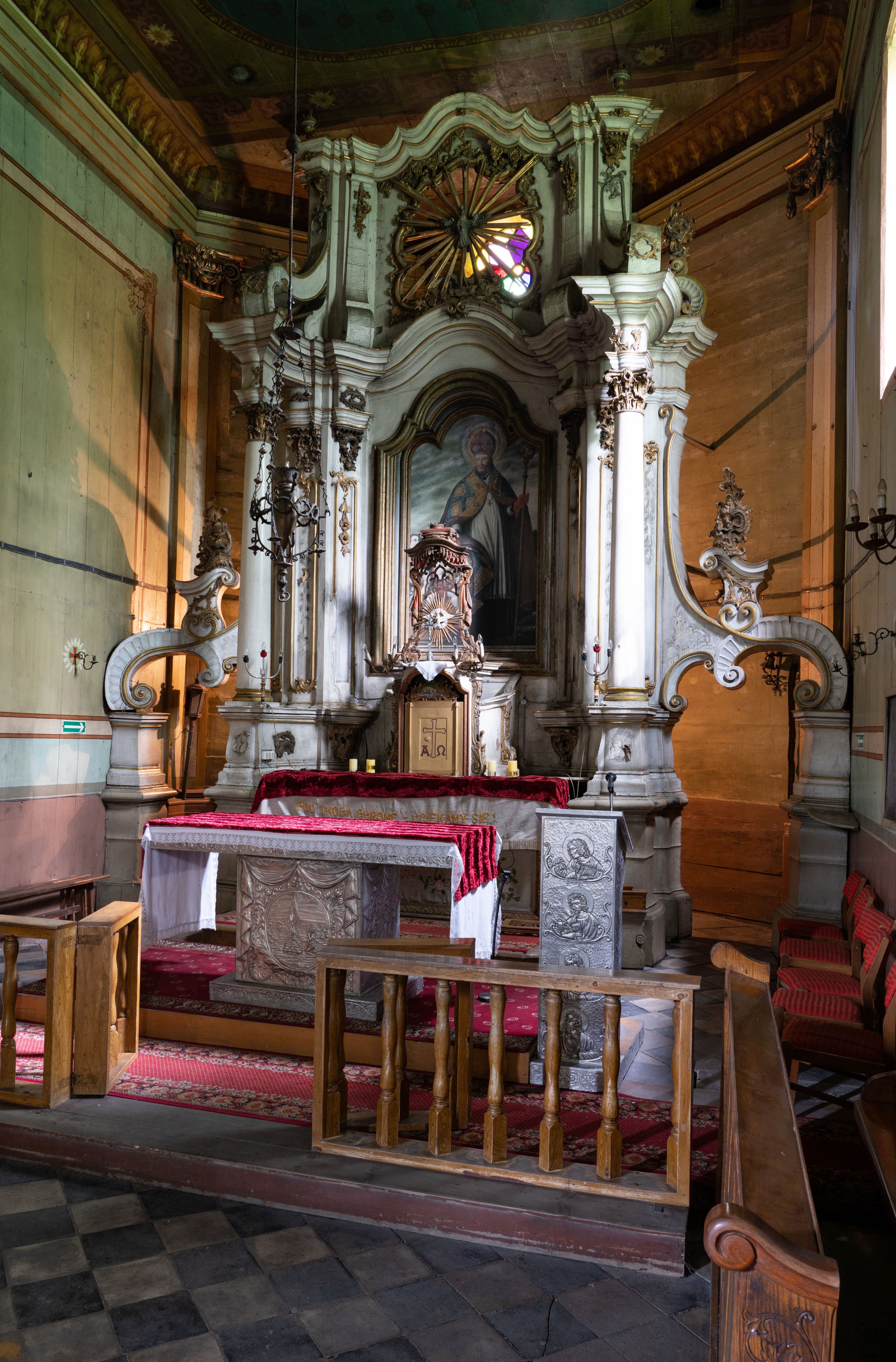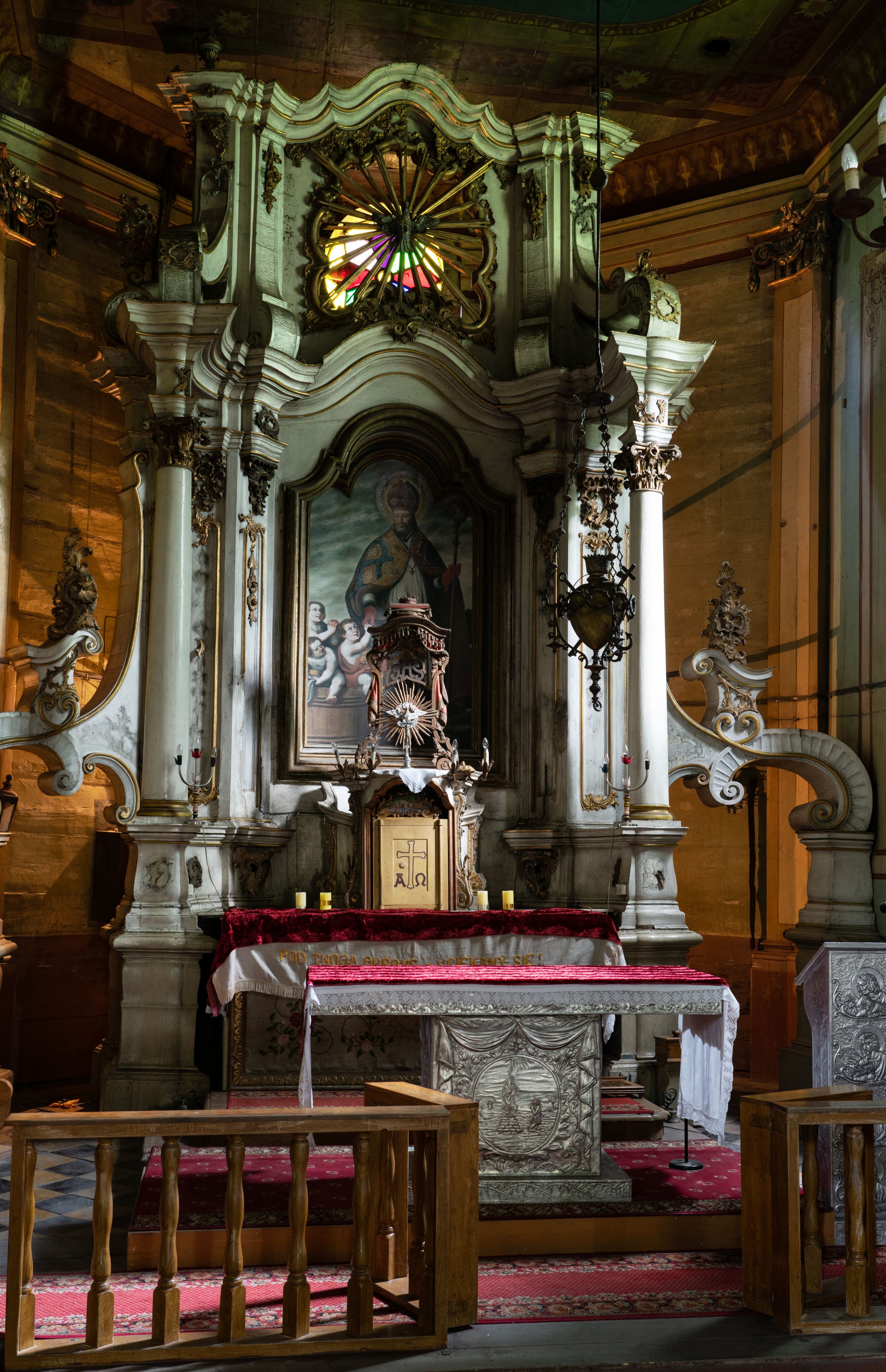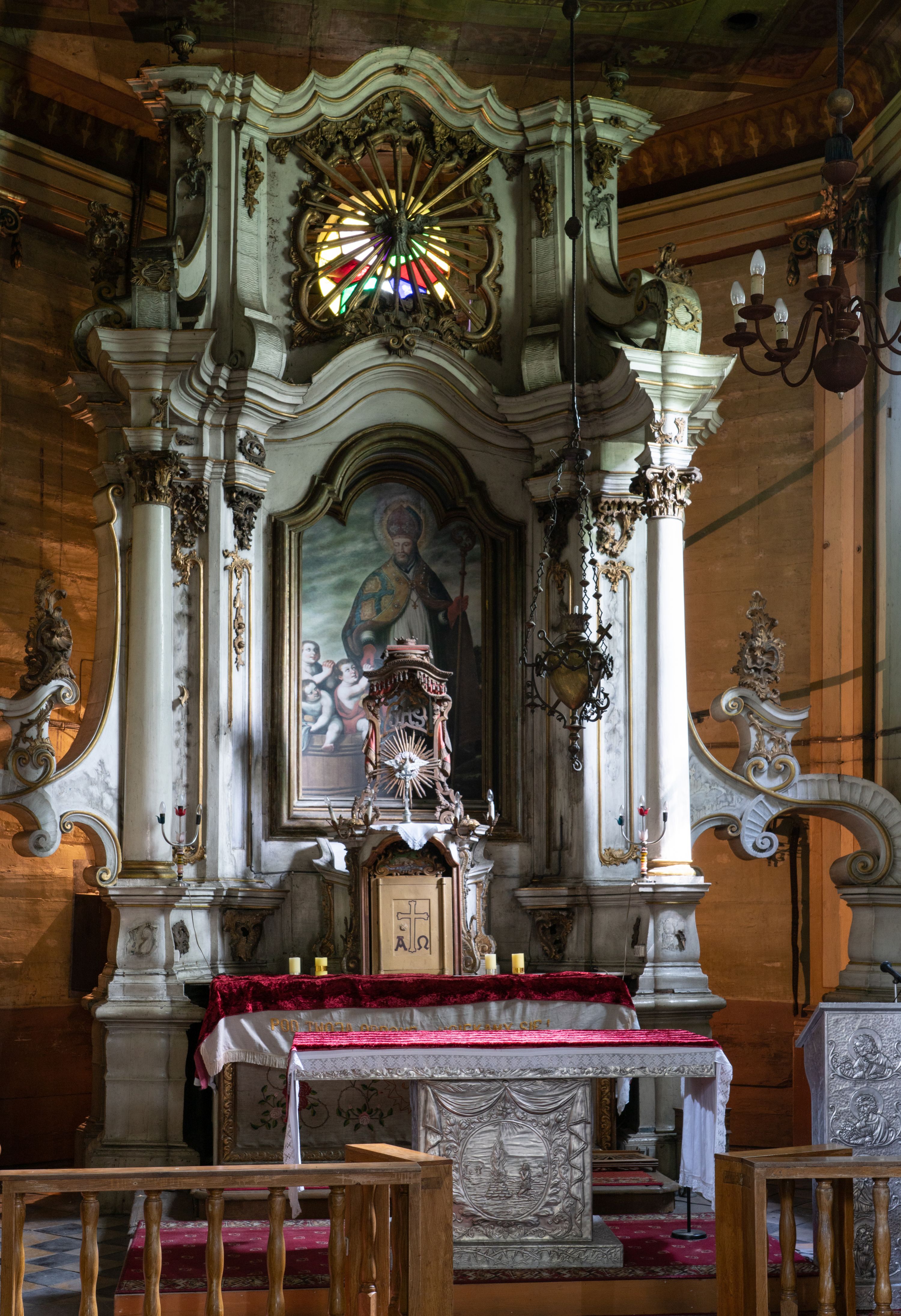 Kamienny ołtarz zamknięto w drewnianej obudowie, nakrywając go drewnianą mensą z portatylem. Stipes ołtarzowy uzyskał kształt prostopadłościanu. Antepedium ujęte zostało złoconą ramą dekorowaną rocaille’m. W jego polu umieszczono haftowaną tkaninę z medalionem w centrum z przedstawieniem w glorii chrystogramu "IHS", flankowany przez wić różaną. Na mensie ołtarza usytuowano tabernakulum w formie stojącego prostopadłościanu o płaskim froncie i wklęsłych bokach pozbawionych cokołu. Drzwiczki wprawiono w płaską niszę zwieńczoną profilowanym łukiem odcinkowym, nadwieszonym. U góry tabernakulum flankuje para sakramentek. Na tabernakulum usytuowano tron eucharystyczny utworzony z dwóch ażurowych spływów wolutowych podtrzymujących baldachim z lambrekinem. Na baldachimie na czerwonej poduszce spoczywa płaska, złocona korona otwarta. Retabulum ołtarzowe wzniesiono na planie półowalu i polichromowano je na biało. Jest to architektoniczna, jednokondygnacyjna, jednoosiowa struktura ze zwieńczeniem. Po bokach flankują ją bramki ustawione na dwustrefowym, tralkowym, wklęsło-wypukłym cokole. Łuki bramek tworzą fantazyjnie wygięte dwie woluty. Kondygnacja została ujęta dwiema parami pilastrów zwróconych delikatnie do wewnątrz oraz silnie wysuniętą do przodu parą kolumn o kapitelach kompozytowych. Podpory dźwigają pełne belkowanie o wklęsło-wypukłej linii. Nad polem środkowym belkowanie jest połączone gzymsem przyjmującym formę łuku falistego i wyłamane na osiach podpór. Kondygnację ujmują spływy wolutowe połączone z łukowato wygiętymi wolutami podtrzymywanymi przez wysokie tralkowe cokoły, tworząc bramki ołtarza. Bramki zwieńczono fantazyjnie wygiętymi impostami podtrzymującymi ornament rocalliowy. W polu środkowym umieszczono wielkoformatowe zdjęcie znajdującego się tu pierwotnie obrazu św. Mikołaja, ujęte profilowaną, złoconą ramą w formie stojącego prostokąta zamkniętego łukiem półkolistym nadwieszonym z uskokiem. Zwieńczenie uzyskało formę leżącego prostokąta flankowanego parą pilastrów zwróconych do wewnątrz oraz parą pilastrów zwróconych na zewnątrz, których trzony przechodzą w spływy wolutowe opadające na belkowanie. Pilastry dźwigają niepełne, wklęsło-wypukłe belkowanie przyjmujące nad polem formę łuku falistego. W polu zwieńczenia znalazło się przedstawienie gołębicy Ducha Świętego z ażurowymi promieniami na tle owalnego okna prezbiterium, ujęte w fantazjną, wklęsło-wypukłą, profilowaną i złoconą ramę. Pilastry kondygnacji ozdobiono kapitelami z rocaille, a ich trzony udekorowano złoconymi, rokokowymi panneau ze zwisami utworzonymi z rocaille, rozet i liści. Na ich tle usytuowano pierwotnie figury św. Kazimierza Królewicza i św. Augustyna (obecnie przeniesione do krypty nowego kościoła). Rzeźby stały na górnej strefie cokołu na wspornikach z rocaille. W przyłuczach i na belkowaniu znalazły się ornamenty roślinne. Także trzony pilastrów zwieńczenia dekorowane są złoconymi zwisami z rocaille i kwiatów. Pole wokół promieni z gołębicą Ducha Świętego również ozdobiono fragmentami rocaille.