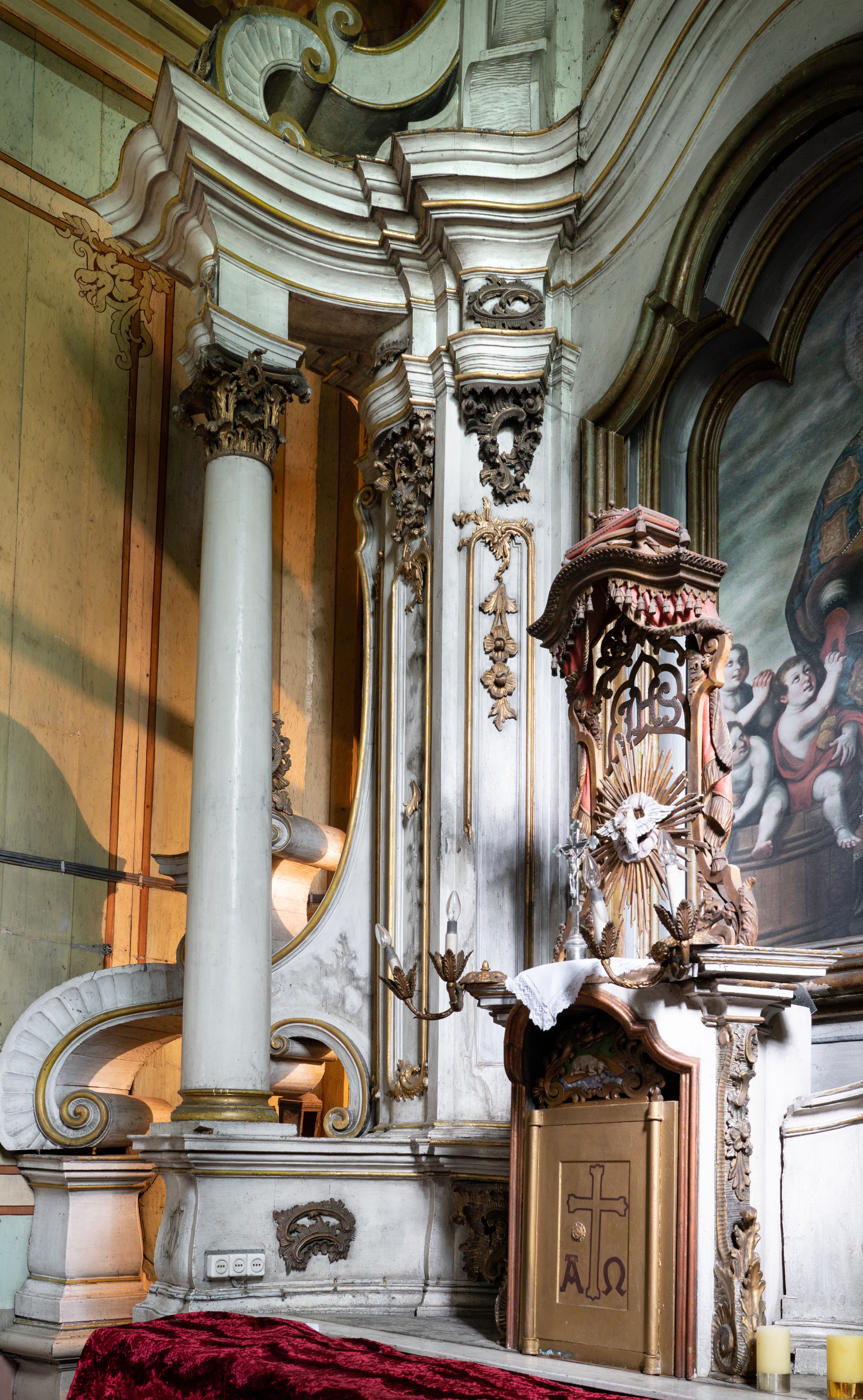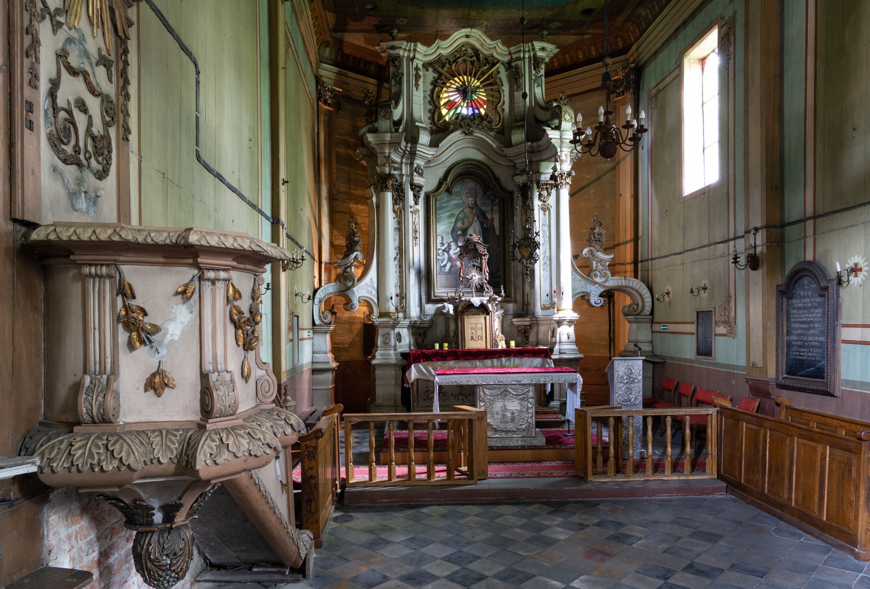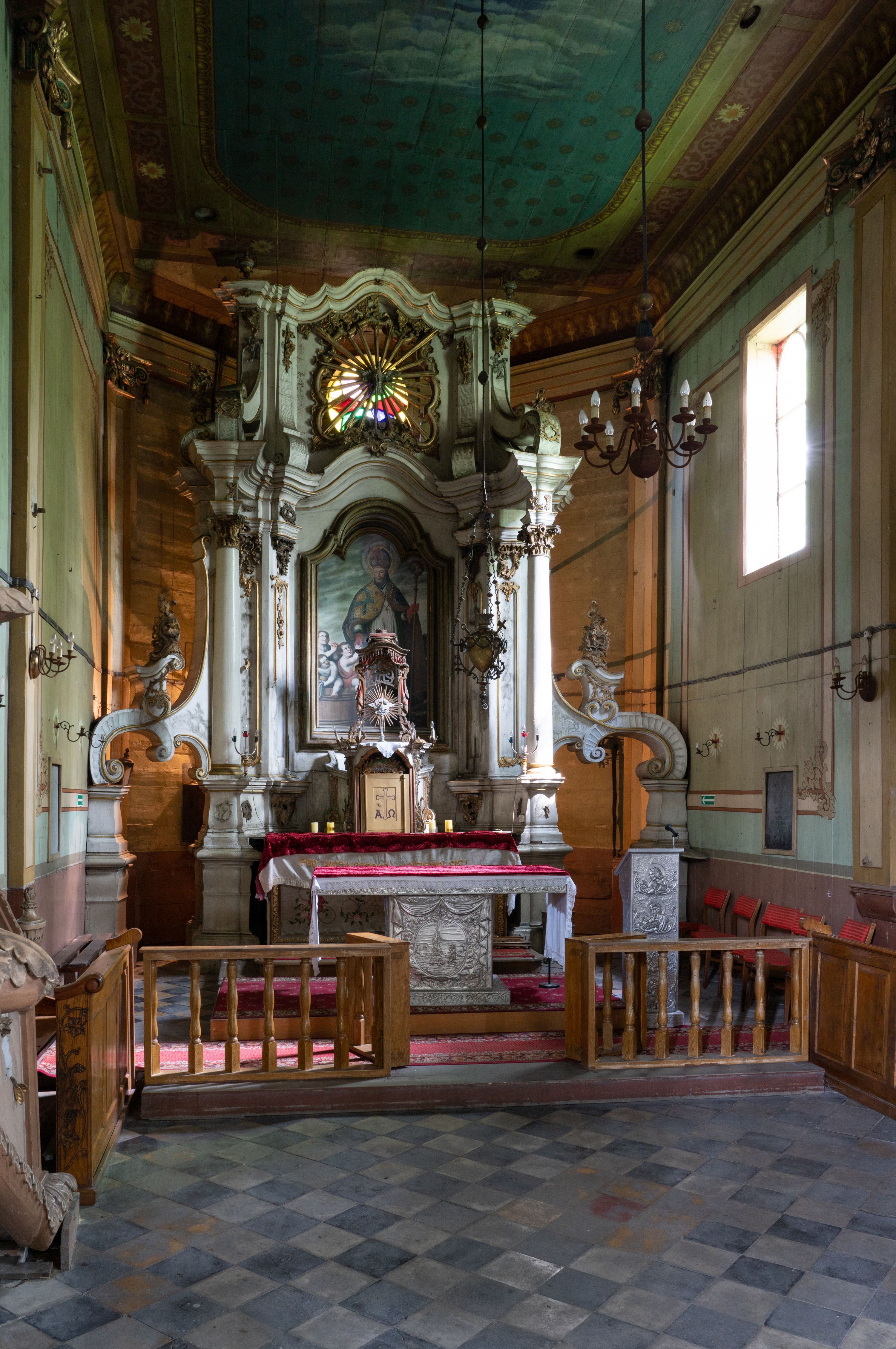 Kamienny ołtarz zamknięto w drewnianej obudowie, nakrywając go drewnianą mensą z portatylem. Stipes ołtarzowy uzyskał kształt prostopadłościanu. Antepedium ujęte zostało złoconą ramą dekorowaną rocaille’m. W jego polu umieszczono haftowaną tkaninę z medalionem w centrum z przedstawieniem w glorii chrystogramu "IHS", flankowany przez wić różaną. Na mensie ołtarza usytuowano tabernakulum w formie stojącego prostopadłościanu o płaskim froncie i wklęsłych bokach pozbawionych cokołu. Drzwiczki wprawiono w płaską niszę zwieńczoną profilowanym łukiem odcinkowym, nadwieszonym. U góry tabernakulum flankuje para sakramentek. Na tabernakulum usytuowano tron eucharystyczny utworzony z dwóch ażurowych spływów wolutowych podtrzymujących baldachim z lambrekinem. Na baldachimie na czerwonej poduszce spoczywa płaska, złocona korona otwarta. Retabulum ołtarzowe wzniesiono na planie półowalu i polichromowano je na biało. Jest to architektoniczna, jednokondygnacyjna, jednoosiowa struktura ze zwieńczeniem. Po bokach flankują ją bramki ustawione na dwustrefowym, tralkowym, wklęsło-wypukłym cokole. Łuki bramek tworzą fantazyjnie wygięte dwie woluty. Kondygnacja została ujęta dwiema parami pilastrów zwróconych delikatnie do wewnątrz oraz silnie wysuniętą do przodu parą kolumn o kapitelach kompozytowych. Podpory dźwigają pełne belkowanie o wklęsło-wypukłej linii. Nad polem środkowym belkowanie jest połączone gzymsem przyjmującym formę łuku falistego i wyłamane na osiach podpór. Kondygnację ujmują spływy wolutowe połączone z łukowato wygiętymi wolutami podtrzymywanymi przez wysokie tralkowe cokoły, tworząc bramki ołtarza. Bramki zwieńczono fantazyjnie wygiętymi impostami podtrzymującymi ornament rocalliowy. W polu środkowym umieszczono wielkoformatowe zdjęcie znajdującego się tu pierwotnie obrazu św. Mikołaja, ujęte profilowaną, złoconą ramą w formie stojącego prostokąta zamkniętego łukiem półkolistym nadwieszonym z uskokiem. Zwieńczenie uzyskało formę leżącego prostokąta flankowanego parą pilastrów zwróconych do wewnątrz oraz parą pilastrów zwróconych na zewnątrz, których trzony przechodzą w spływy wolutowe opadające na belkowanie. Pilastry dźwigają niepełne, wklęsło-wypukłe belkowanie przyjmujące nad polem formę łuku falistego. W polu zwieńczenia znalazło się przedstawienie gołębicy Ducha Świętego z ażurowymi promieniami na tle owalnego okna prezbiterium, ujęte w fantazjną, wklęsło-wypukłą, profilowaną i złoconą ramę. Pilastry kondygnacji ozdobiono kapitelami z rocaille, a ich trzony udekorowano złoconymi, rokokowymi panneau ze zwisami utworzonymi z rocaille, rozet i liści. Na ich tle usytuowano pierwotnie figury św. Kazimierza Królewicza i św. Augustyna (obecnie przeniesione do krypty nowego kościoła). Rzeźby stały na górnej strefie cokołu na wspornikach z rocaille. W przyłuczach i na belkowaniu znalazły się ornamenty roślinne. Także trzony pilastrów zwieńczenia dekorowane są złoconymi zwisami z rocaille i kwiatów. Pole wokół promieni z gołębicą Ducha Świętego również ozdobiono fragmentami rocaille.