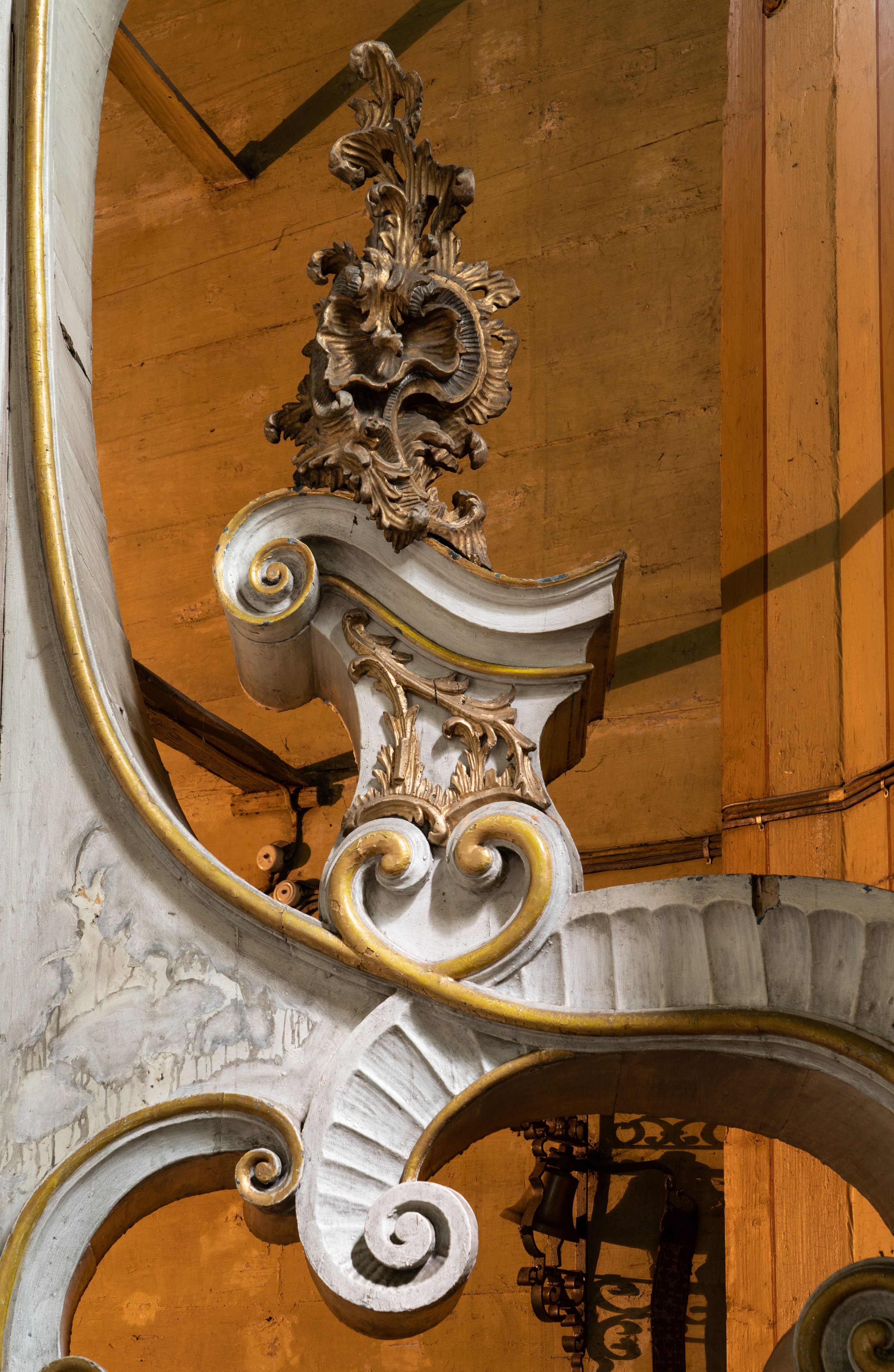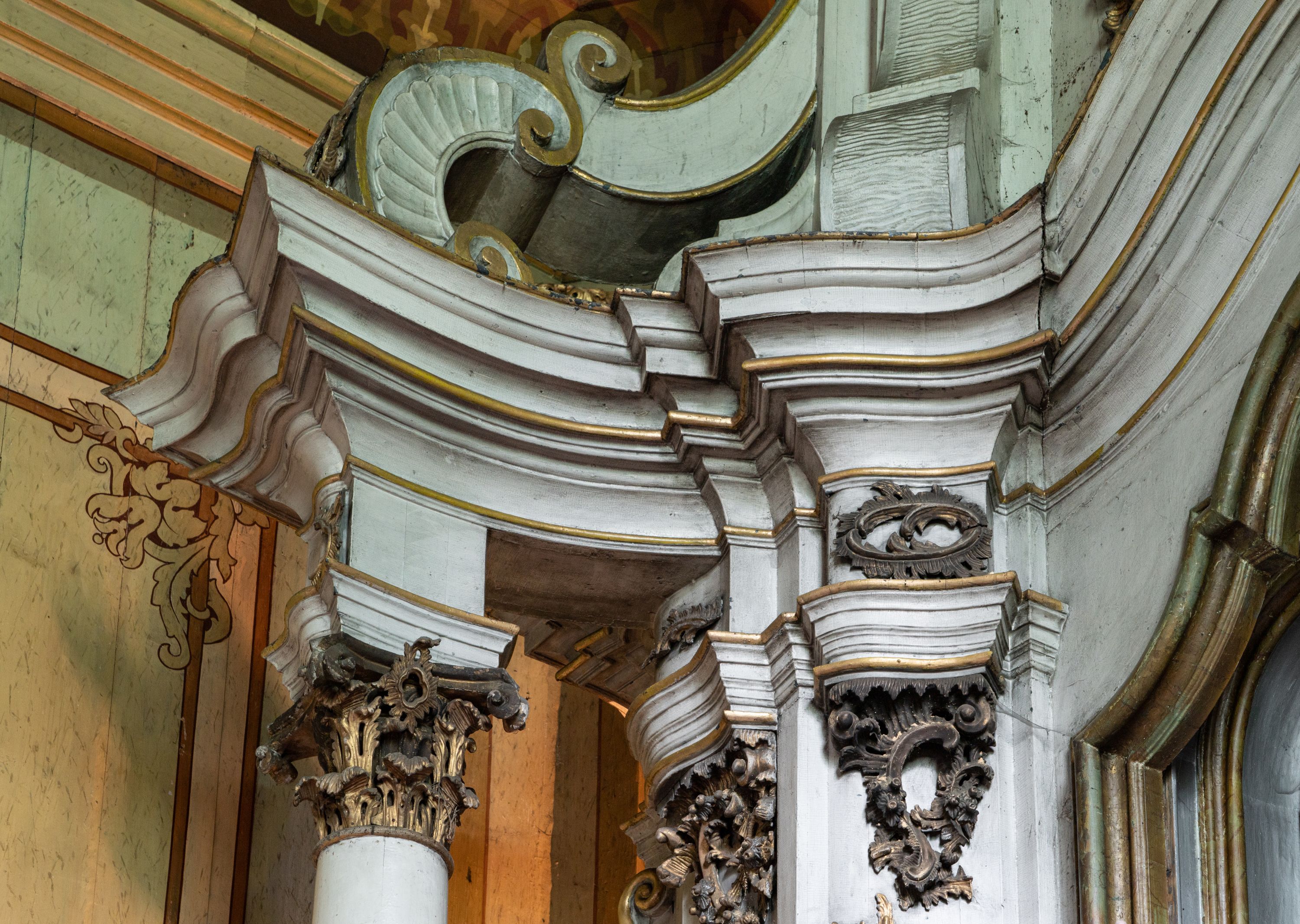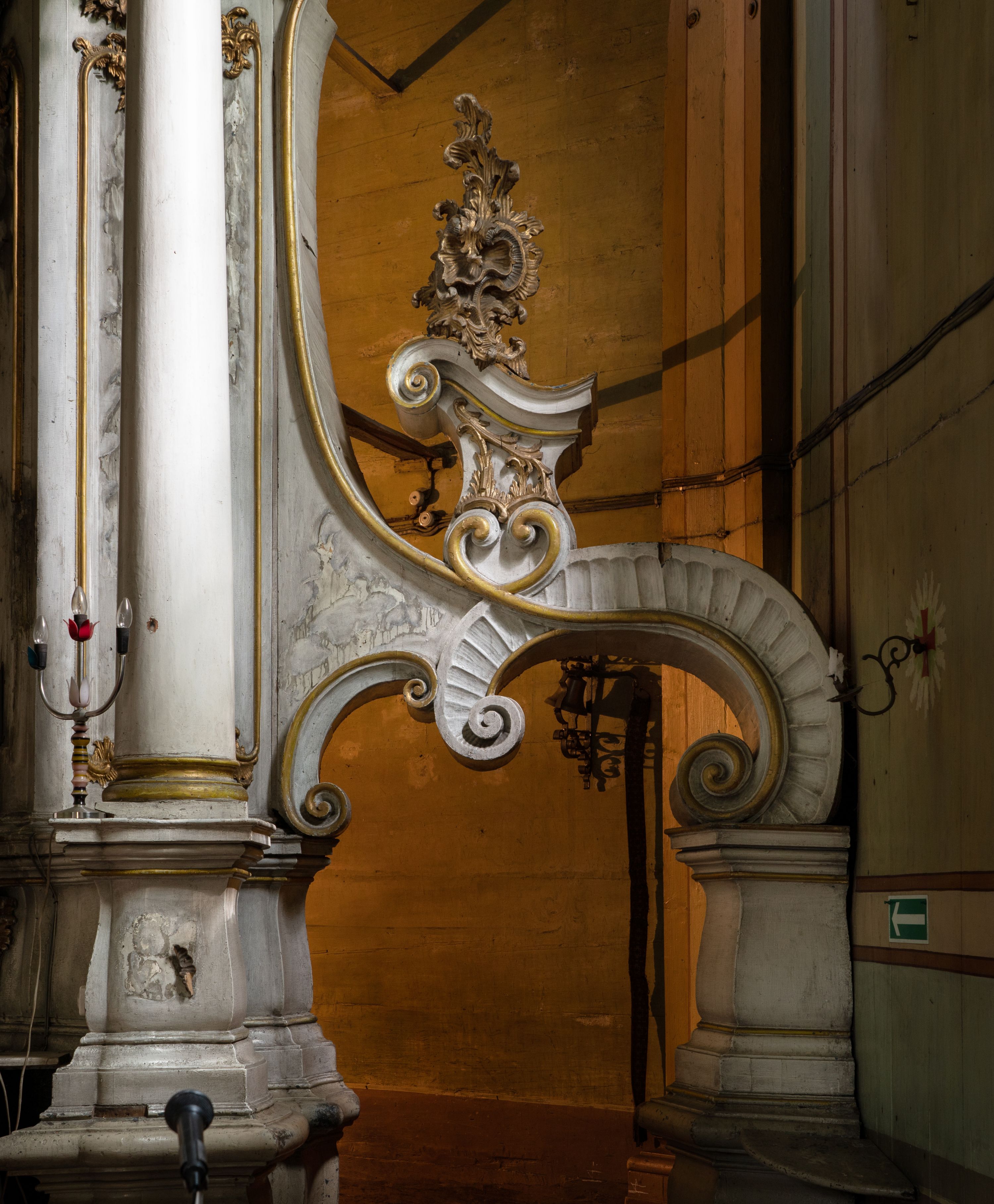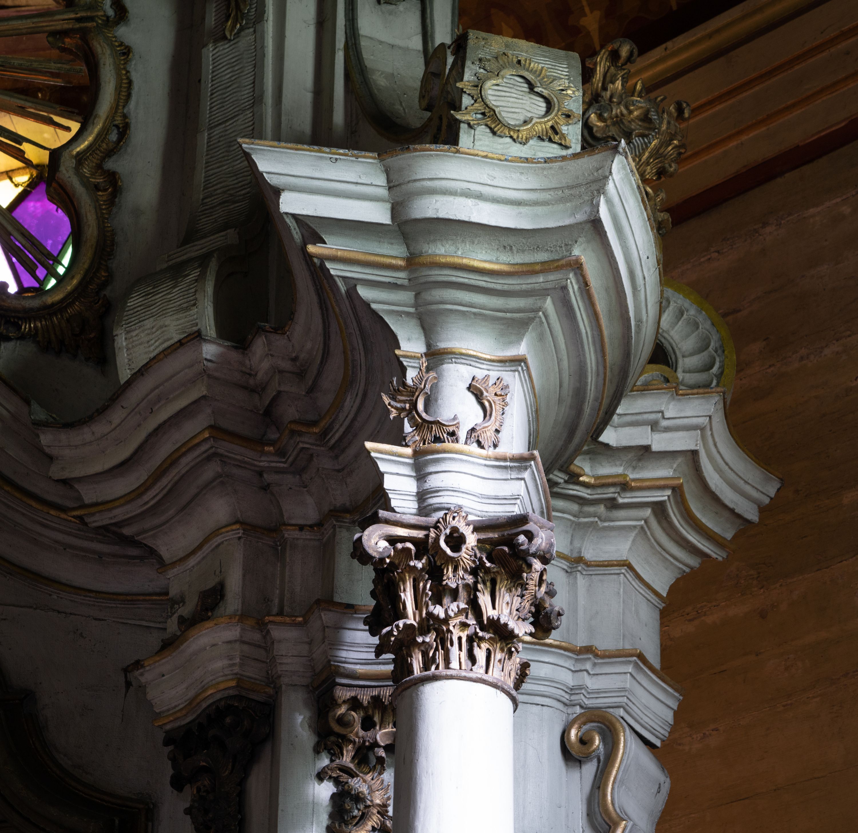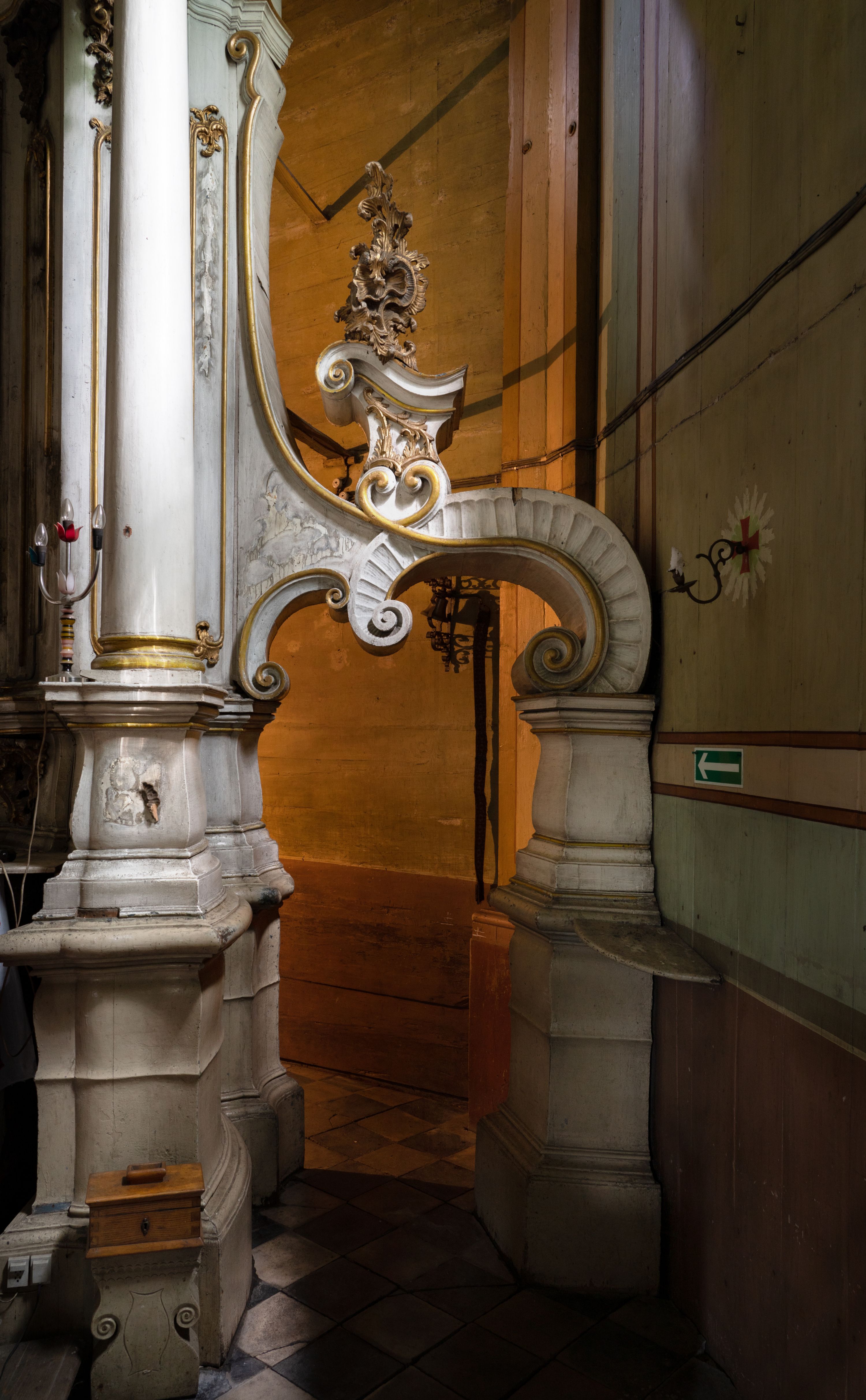 Zły. Konstrukcja została mocno uszkodzona przez drewnojady. Widać spuchnienie drewna i jego spudrowanie, a także liczne ubytki w ornamentach. Występują przetarcia i uszkodzenia polichromii. Struktura bardzo mocno zabrudzona.