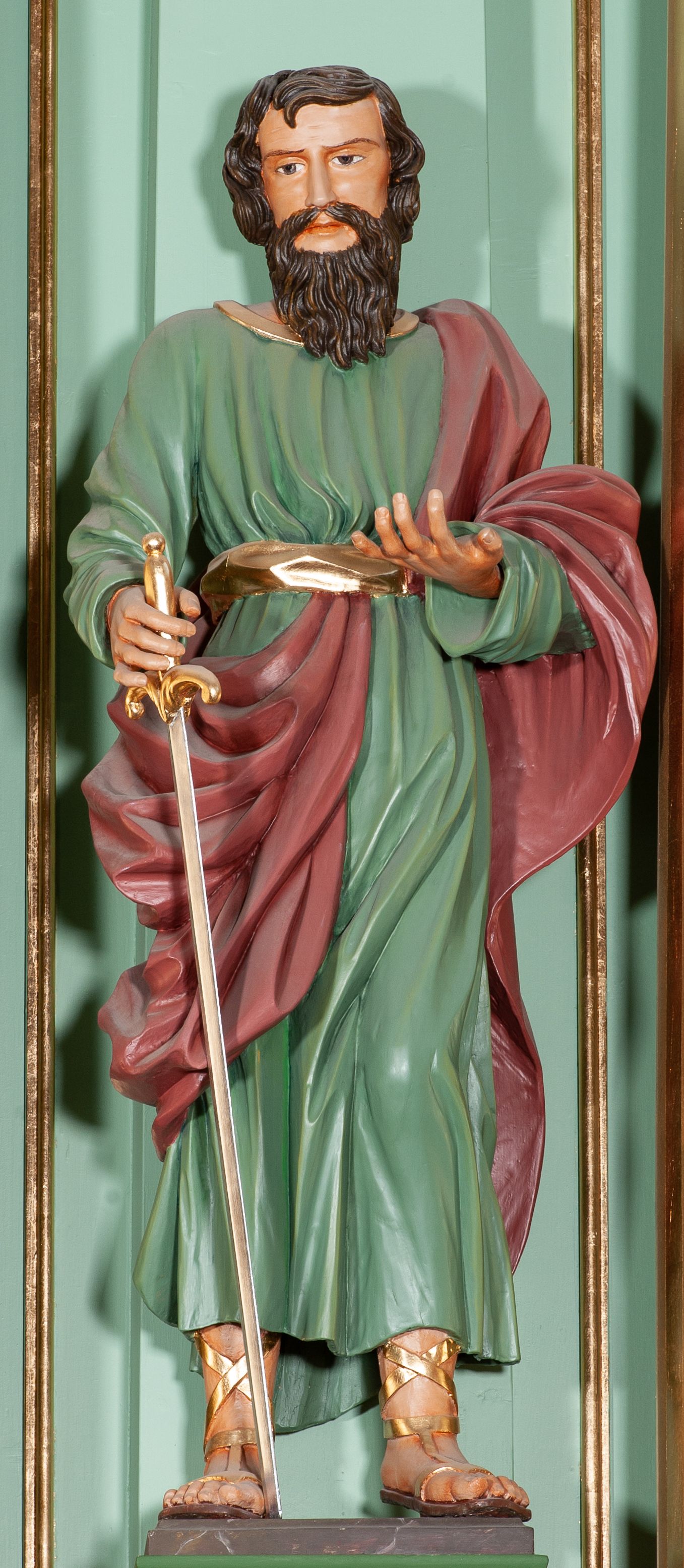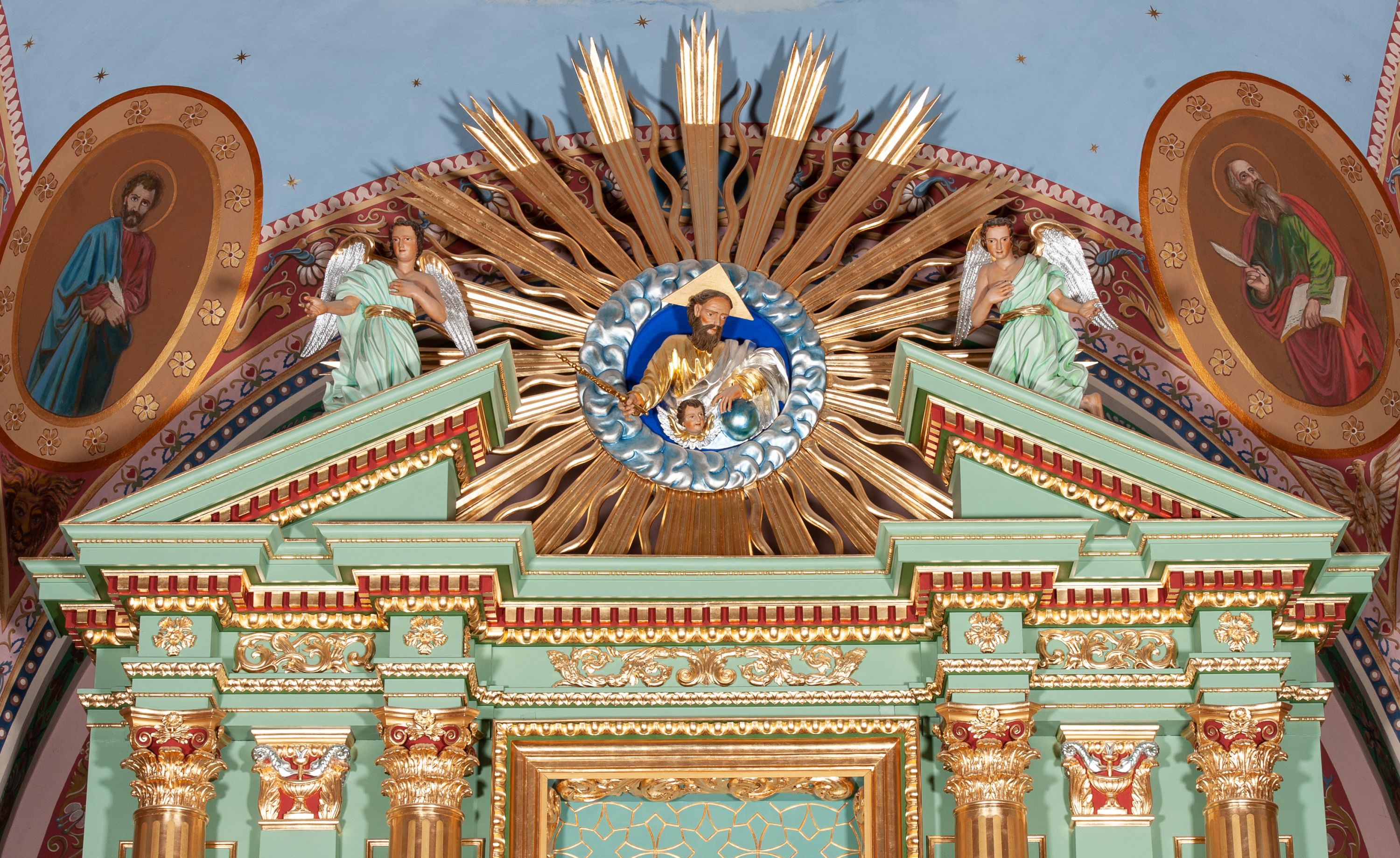 Nastawa polichromowana na kolor jasnozielony z ciemnozielonymi detalami; kolumny, ornamentyka oraz detale architektoniczne złocone.