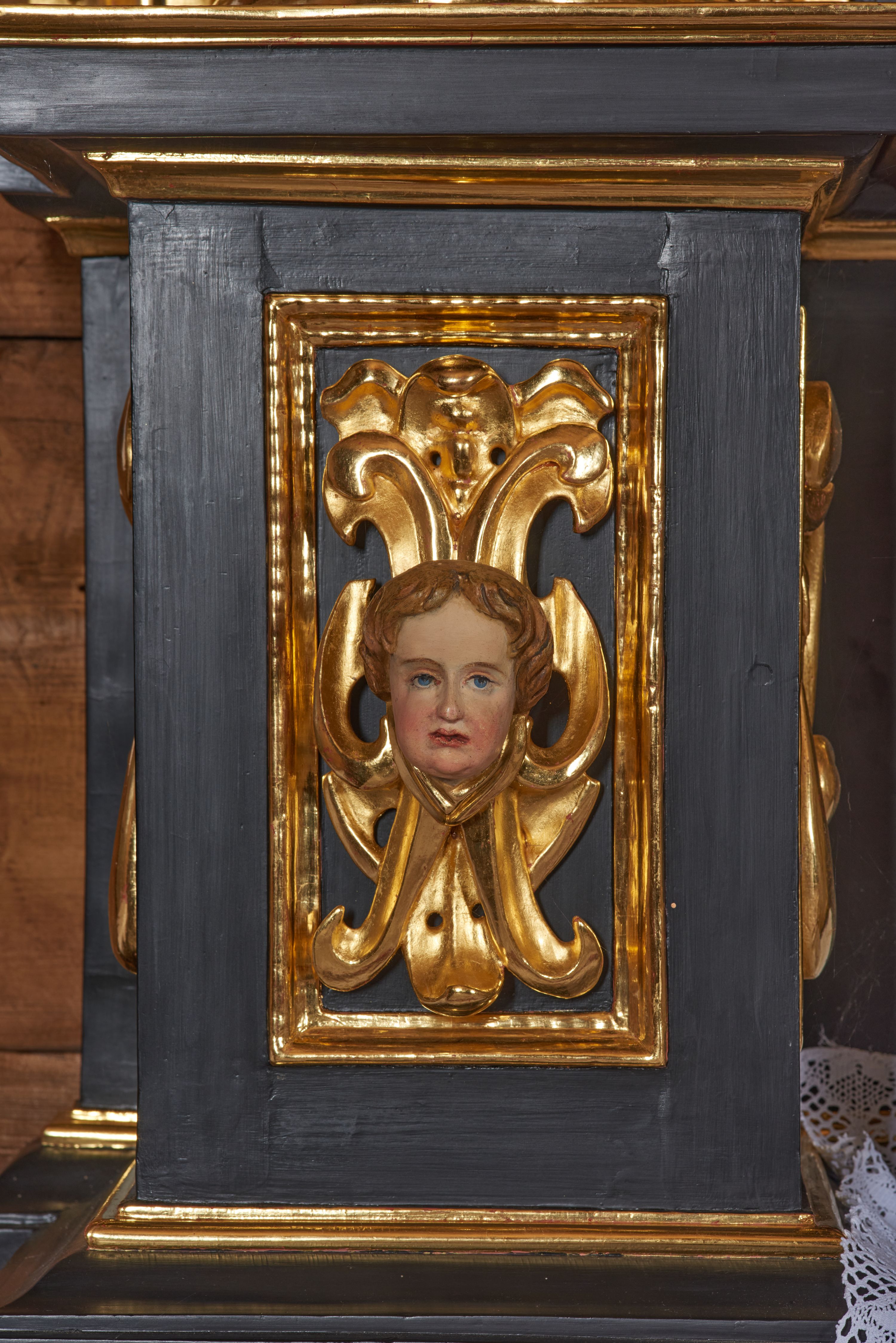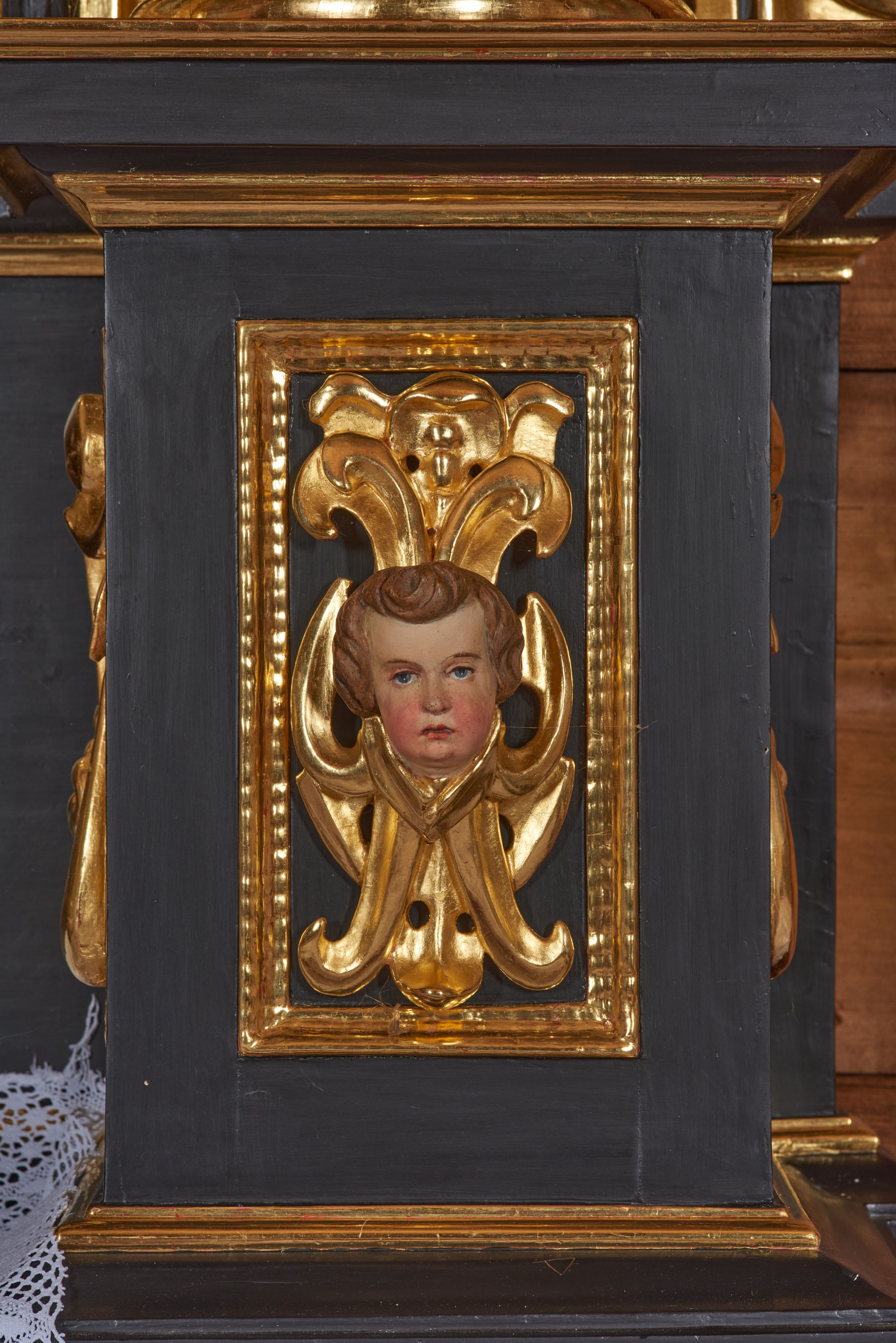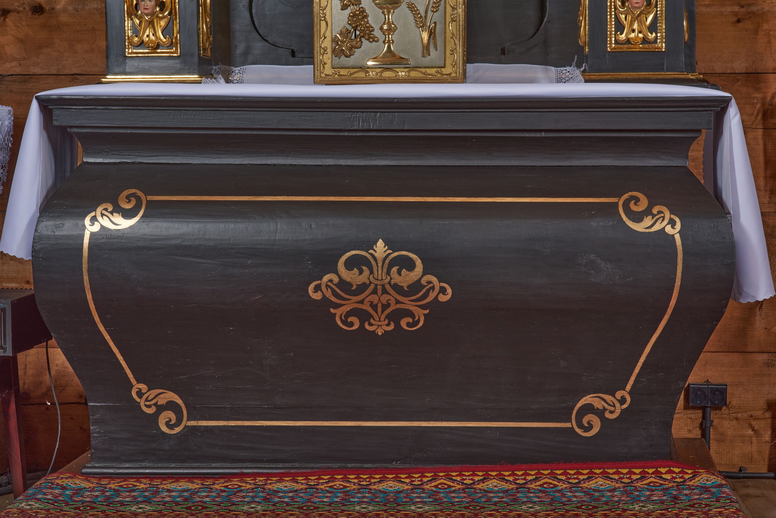 Ołtarz został wykonany około połowy XVII wieku. Nastawa jest obficie zdobiona ornamentem małżowinowo-chrząstkowym. Za datowaniem tym przemawia również prosta struktura ołtarzowa w kolorze czarnym (nawiązująca do popularnych wyrobów z marmuru dębnickiego), charakterystyczne główki aniołków skierowane na wprost z podwieszonymi chustami oraz prosty, trójkątny, przerwany przyczółek. Ołtarz w ciągu wieków przeszedł wiele zmian, m.in. wymieniono schodkowe tabernakulum (do dziś zachowane w kaplicy), zmieniono również obrazy pierwotnie umieszczone w polu głównym, predelli czy rzeźby ze zwieńczenia.