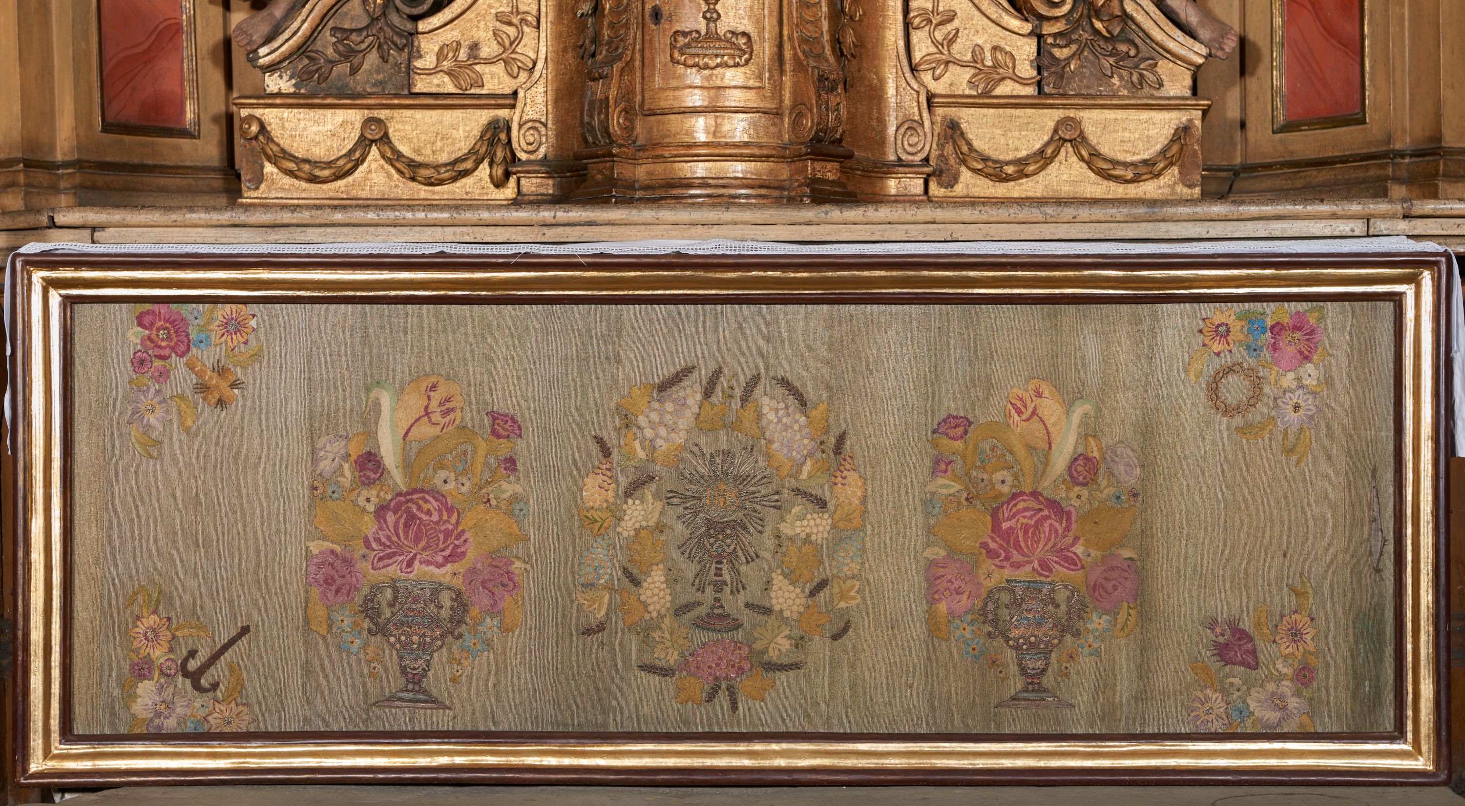 Ołtarz kamienny, prostopadłościenny, z kamienną mensą oraz antepedium w formie leżącego prostokąta z tkaniny, ujętym profilowaną, drewnianą i złoconą ramą. Na ołtarzu ustawione tabernakulum z tronem wystawienia.