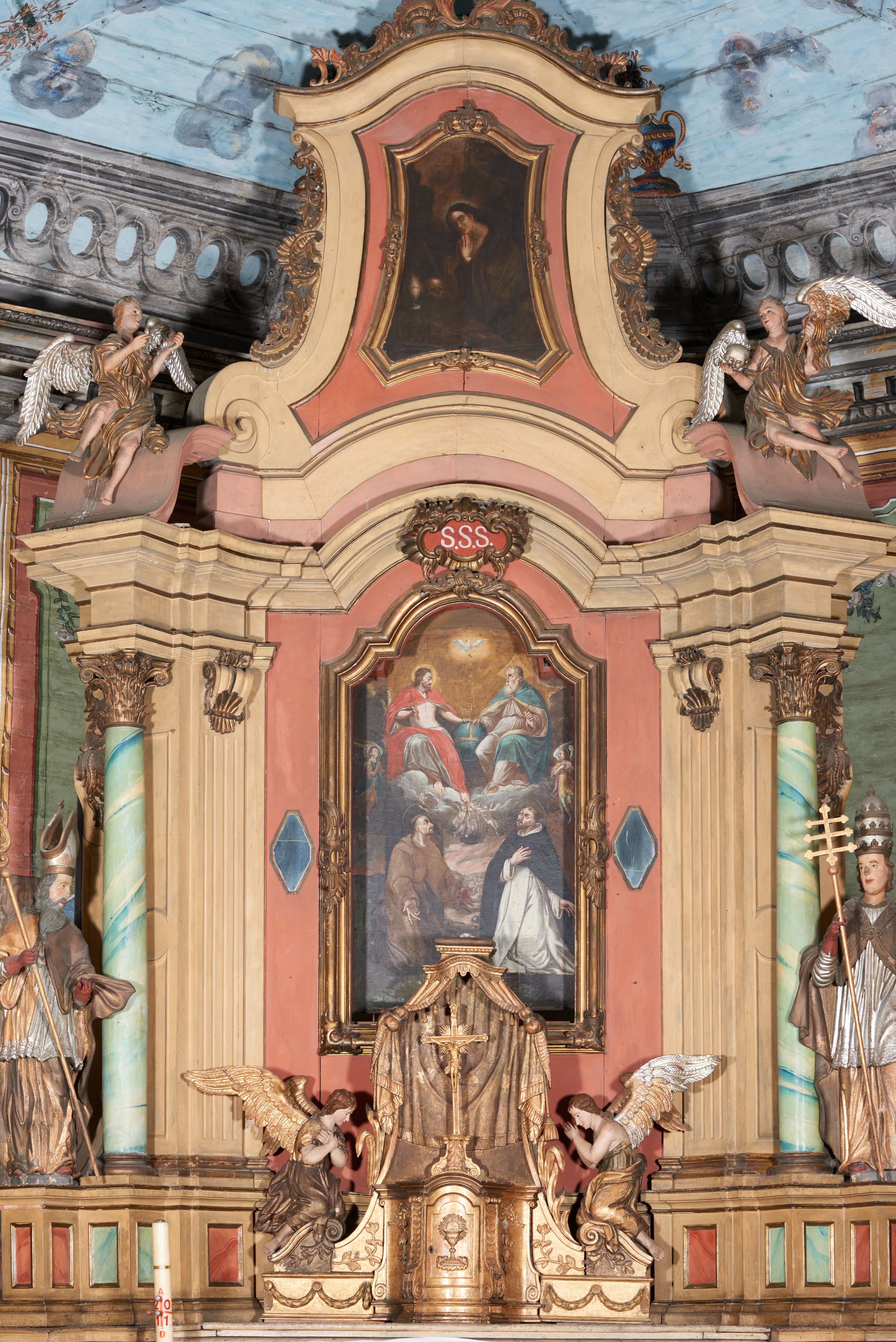 Nastawa architektoniczna, jednoosiowa, jednokondygnacyjna ze zwieńczeniem, ustawiona na dwustrefowym cokole ze skrajnie wyłamanymi pod kątem trzema parami prostopadłościanów. Retabulum ujęte ustawionymi pod kątem na zewnątrz filarami, opilastrowanymi po wewnętrznej stronie oraz stojącą przed nimi parą kolumn o kapitelach kompozytowych. Na skrajnie wyłamanych fragmentach cokołu ustawione figury świętego biskupa i świętego papieża. Podpory dźwigają pełne belkowanie połączone nad polem głównym wyłącznie gzymsem wyłamanym na kształt łuku odcinkowego nadwieszonego. Na osi kolumn, na belkowaniu fragmenty przerwanego falistego przyczółka, skierowane do wewnątrz, na których znajdują się dwie figury siedzących aniołów. W polu głównym wnęka w formie stojącego prostokąta zamkniętego łukiem półkolistym nadwieszonym z uskokiem, ujęta profilowaną ramą dekorowaną rocaille'm. W niej zamontowany obraz Trójcy Świętej ze św. Franciszkiem i św. Dominikiem. Ponad wnęką rokokowy kartusz z napisem w polu: „S[anctus] S[anctus] S[anctus]”. Po bokach wnęki dwa pola w kształcie rombów o ściętych kątach z wprawionymi lustrami. Zwieńczenie w formie zbliżonej do trapezu ujętego spływami wolutowymi, zamkniętego fragmentem falistego gzymsu, dekorowane z trzech stron rocaille'm. W polu zwieńczenia płycina o tej samej formie, wewnątrz obraz św. Marii Magdaleny w kształcie zbliżonym do trapezu o ściętych dolnych narożach, ujęty profilowaną ramą dekorowaną rocaille'm. Struktura polichromowana w odcieniach beżu, partiami zaś różu i jasnej czerwieni; płyciny cokołu i trzony kolumn polichromowane na sposób imitujący marmoryzację w odcieniach zieleni, niektóre płyciny również czerwieni. Profile i ornamentyka złocone.