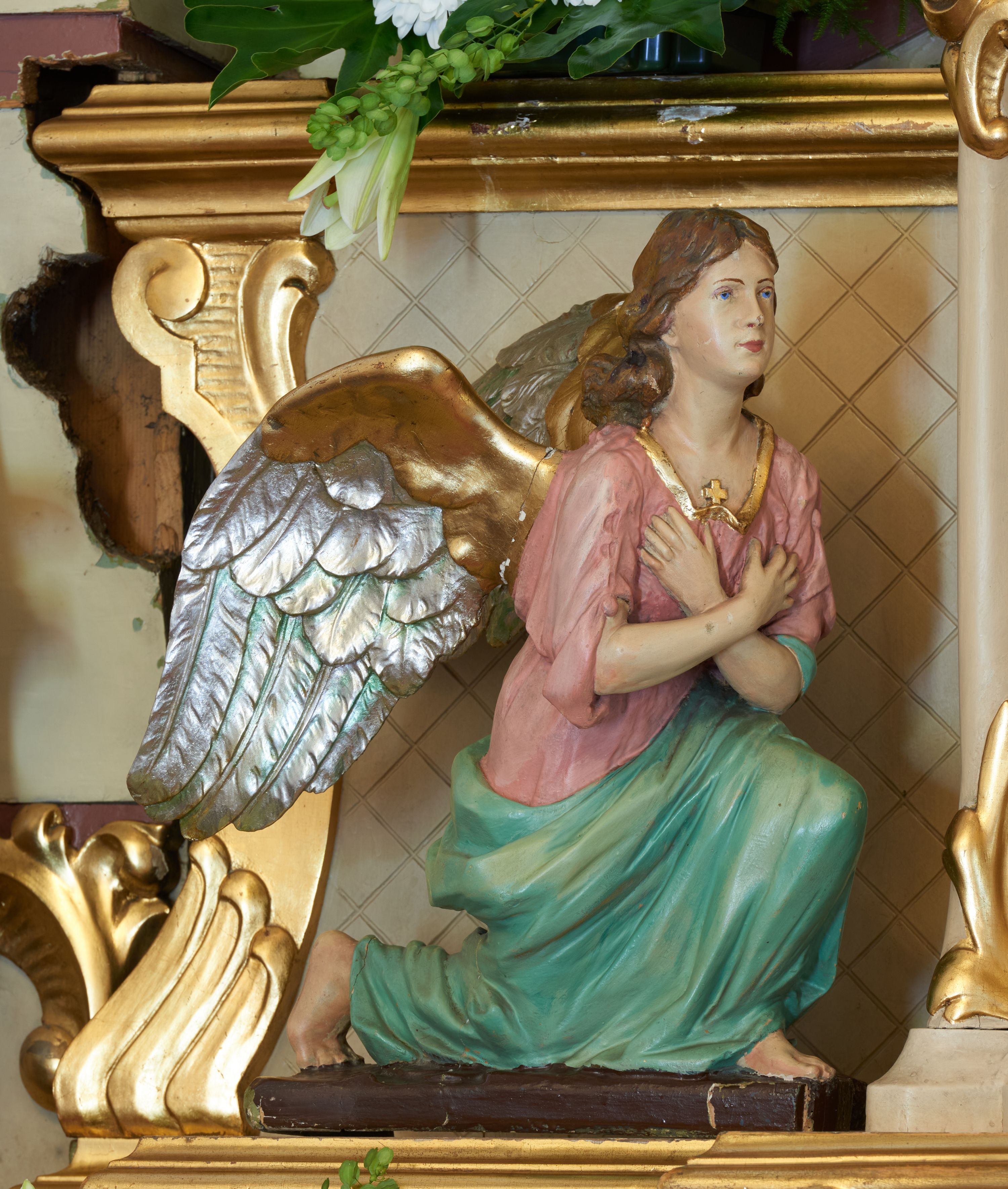 Ołtarz drewniany, zbliżony do prostopadłościanu, zwężający się ku dołowi, zakończony profilowanym gzymsem. Antependium dekorowane płycinami. Mensa drewniana.