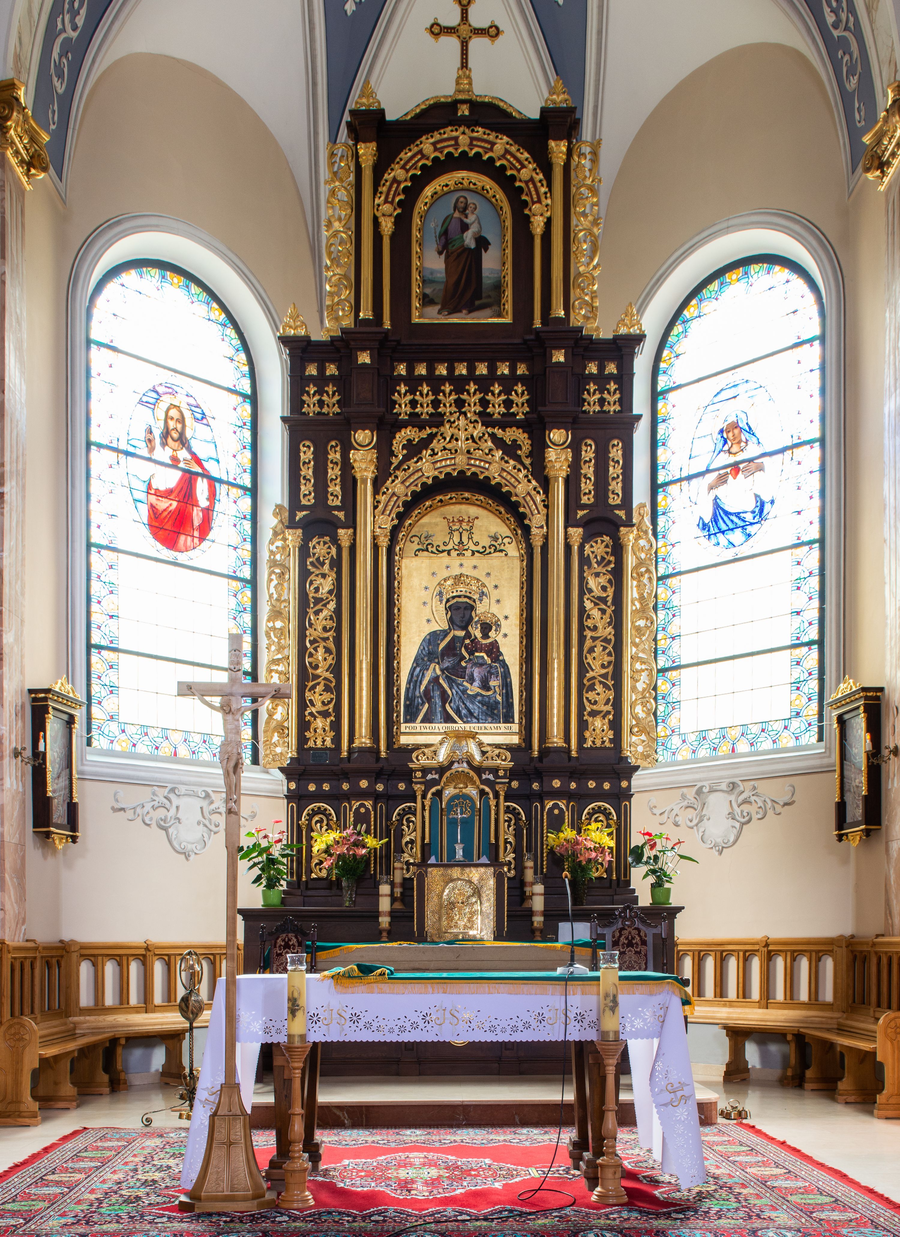 Ołtarz architektoniczny, trójosiowy, dwukondygnacyjny ze zwieńczeniem, ujęty ażurowymi uszami utworzonymi z akantu oraz wstęgi regencyjnej. Mensa prostopadłościenna; antepedium drewniane z dekoracją płycinową, artykułowane pilastrami o kanelowanych trzonach. Centralna płycina w kształcie stojącego prostokąta zamkniętego od góry i dołu łukiem wyniesionym; w jej wnętrzu złocony krzyż. Tabernakulum dwukondygnacyjne, jednodrzwiczkowe z tronem wystawienia ujętym złoconymi kolumienkami dźwigającymi srebrzony baldachim w formie kopuły flankowanej akantowymi wolutami. Arkada ujmująca tron wystawienia o wykroju trójliścia, w podniebiu dekorowana złoconą muszą palmetową, poniżej której złocony monogram IHS na niebieskim tle. Drzwiczki tabernakulum złocone z umieszczonym centralnie kielichem z hostią ujętym płyciną w kształcie stojącego prostokąta zamkniętego półkoliście. Nastawa na wysokim, dwukondygnacyjnym cokole o podziałach architektonicznych. Kondygnacja druga artykułowana zwielokrotnionymi pilastrami o trzonach dekorowanych maswerkiem, pomiędzy którymi półkoliste arkadki wypełnione akantem, ujęte wąskimi, złoconymi kolumienkami. Cokół zwieńczony fryzem dekorowanym rozetkami i profilowanym gzymsem. W polu głównym ołtarza nisza w kształcie stojącego prostokąta zamkniętego łukiem półkolistym ujęta smukłymi, złoconymi kolumienkami wspierającymi bogato dekorowaną ornamentem roślinnym, kostkowaniem i rozetkami arkadę. W polu obraz przedstawiający Matkę Boską z Dzieciątkiem na złoconym tle. Oś środkowa ołtarza wyższa i szersza od bocznych, ujęta złoconymi kolumnami o korynckich kapitelach dźwigających pełne, wyłamane na osiach kolumn, belkowanie. Fryz dekorowany liśćmi akantu oraz rozetkami. Osie boczne ujęte mniejszymi, złoconymi kolumienkami, dźwigającymi półkolisty łuk. W niszach pomiędzy nimi złocona, dekoracja akantowa o pasowym przebiegu. Kondygnacja druga ujęta złoconymi kolumienkami o korynckich kapitelach oraz ażurowymi uszami utworzonymi z akantu oraz wstęgi regencyjnej, zwieńczona równoramiennym krzyżem dekorowanym rozetkami. W polu obraz w kształcie stojącego prostokąta przedstawiający św. Józefa z Dzieciątkiem Jezus. Obraz ujęty półkolistą arkadą bogato dekorowaną ornamentem roślinnym, rozetkami oraz fryzem arkadkowym, wspartą na smukłych, złoconych kolumienkach. Struktura ołtarza malowana w kolorze ciemnobrązowym, ornamentyka oraz detale elementów architektonicznych złocone.