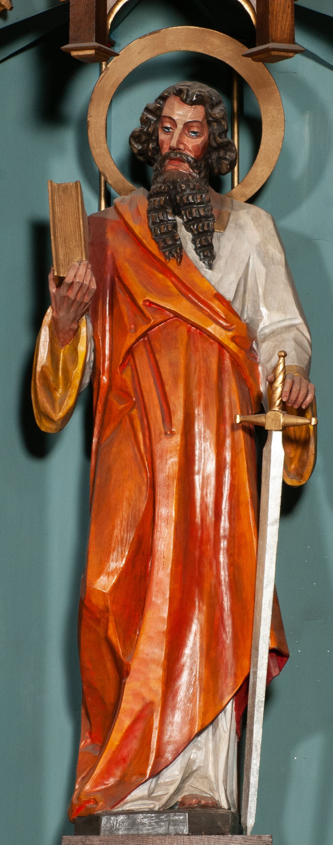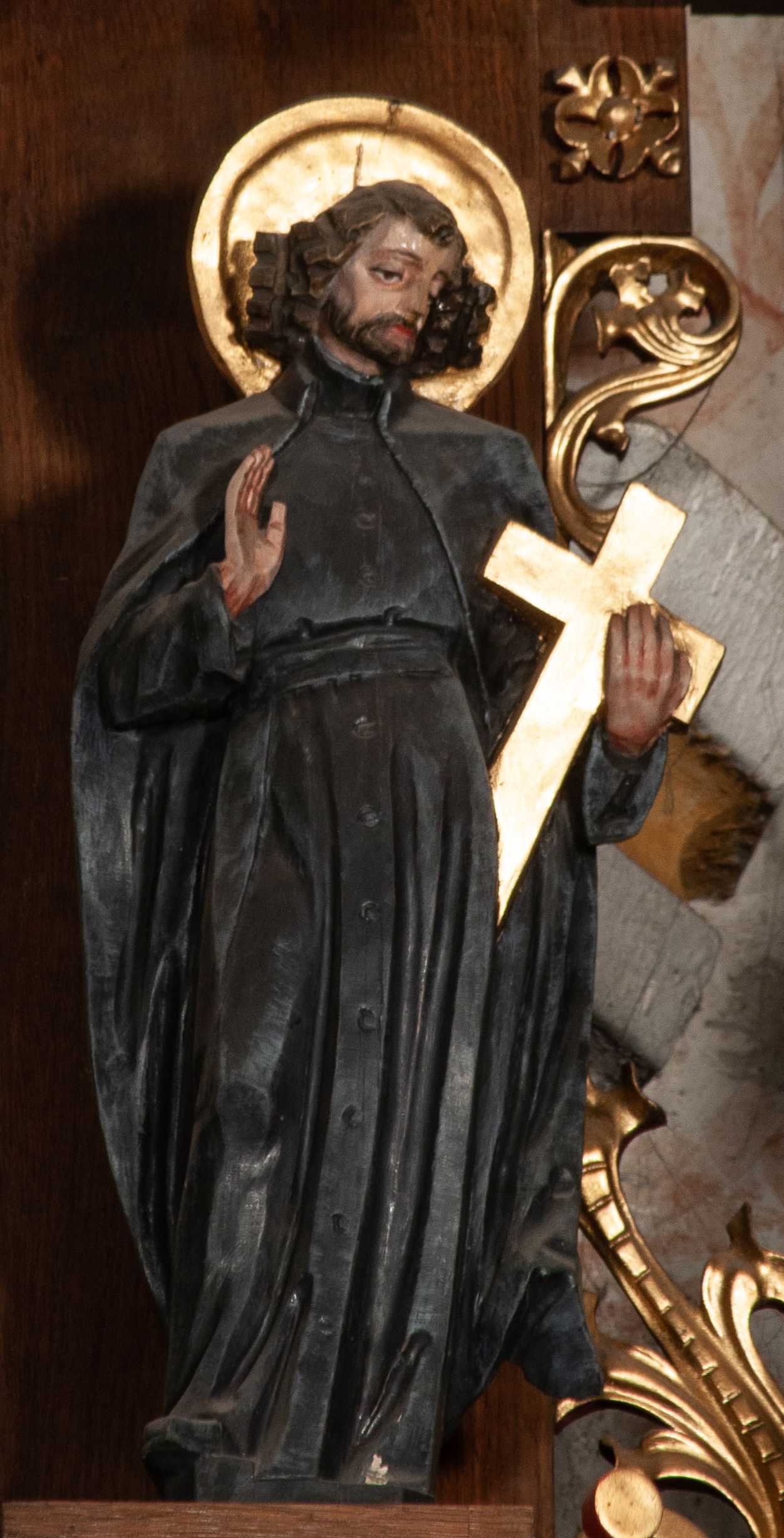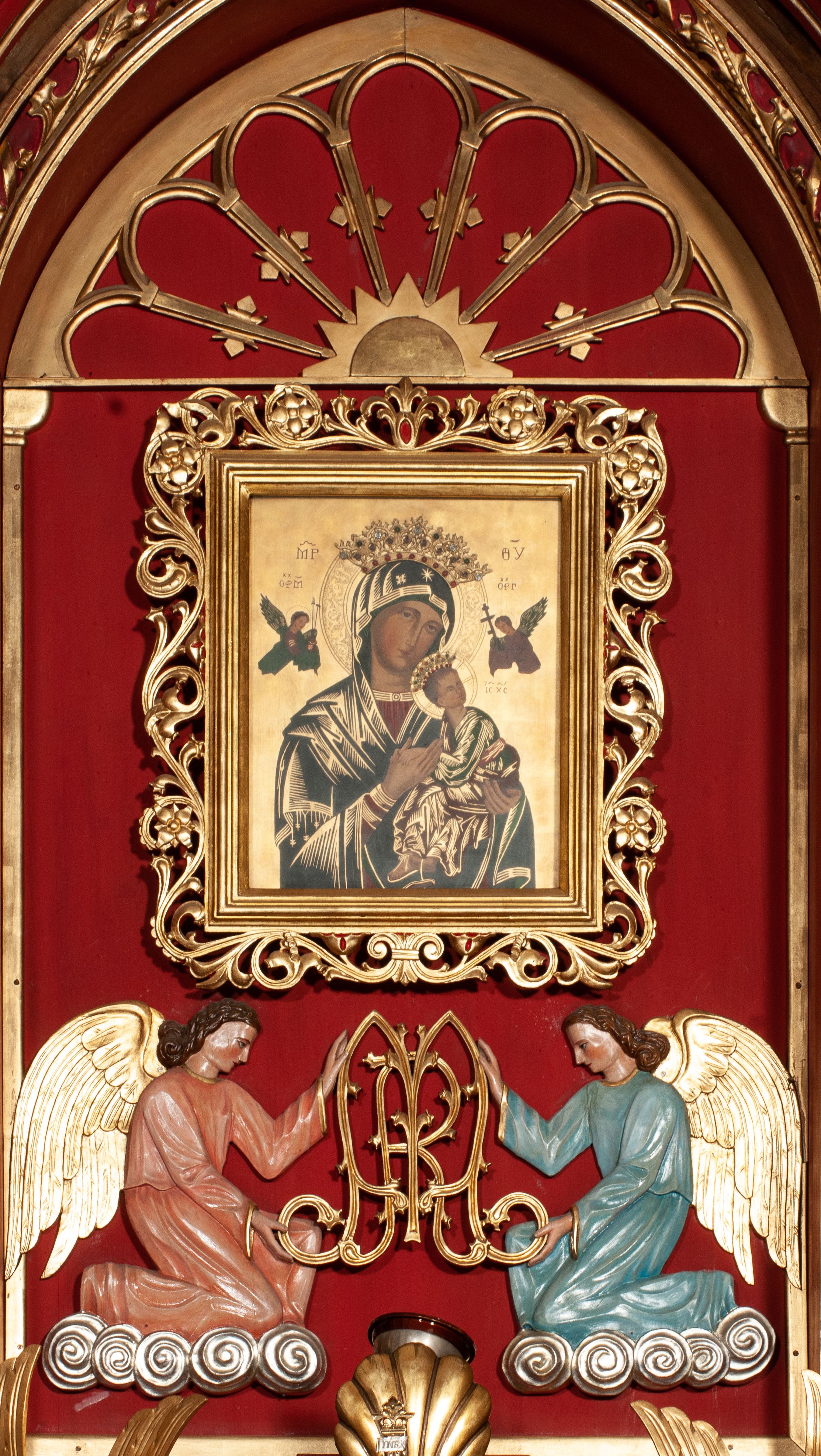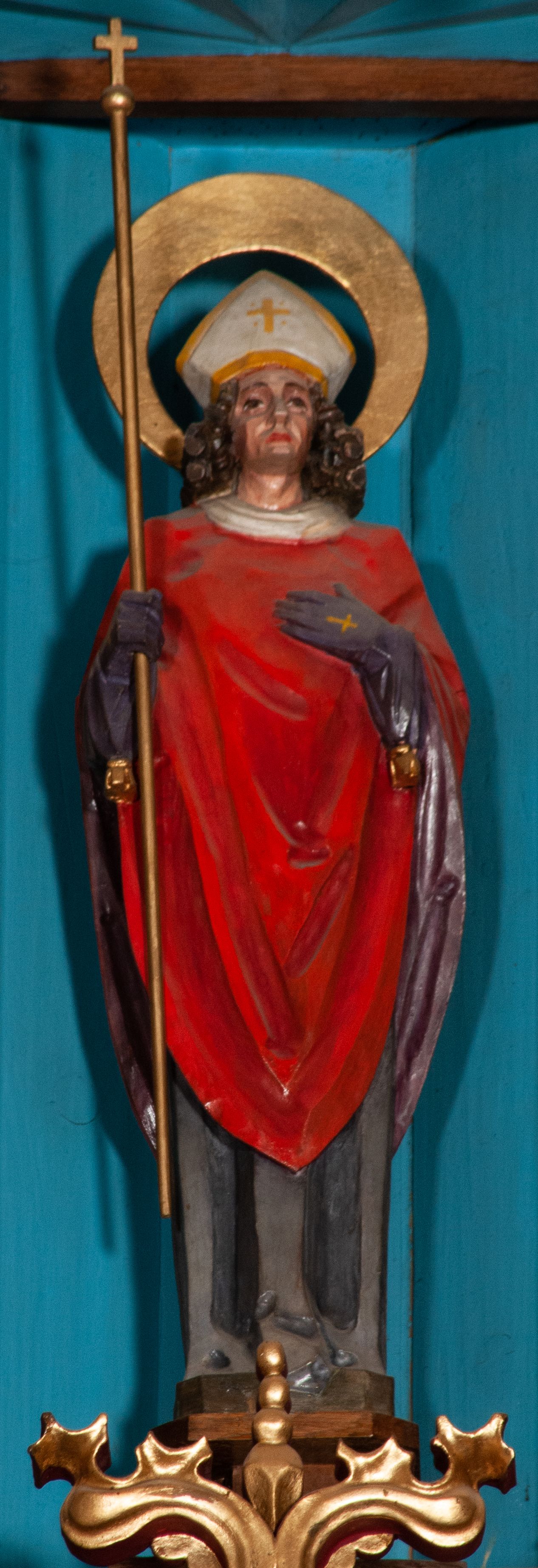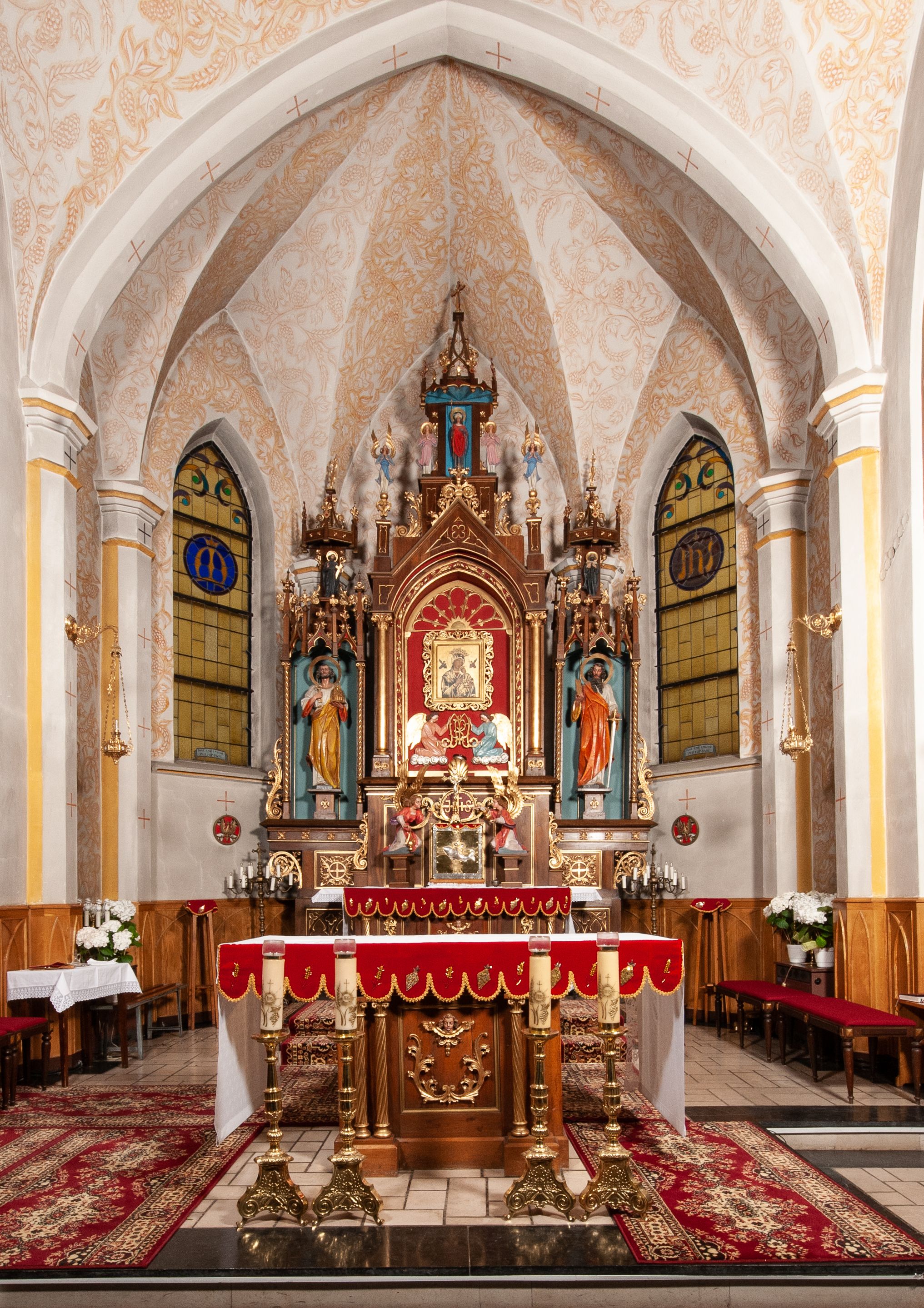 Nastawa ołtarzowa o trzech oddzielnych niszach, nakrytych gotycyzującymi baldachimami z pinaklami, ozdobionymi żabkami. Oś środkowa w formie niszy zamkniętej ostrołukowo z wimpergą wspartą na smukłych, złoconych kolumienkach o kapitelach kompozytowych. Wimperga ze złoconymi, profilowanymi płycinami, zwieńczona rzeźbionymi liśćmi akantu i wolutami. Na przedłużeniu kolumn postumenty z figurami aniołów w biało niebieskich szatach, ze złotymi, wydłużonymi skrzydłami. Na osi na postumencie, pod gotycyzującym baldachimem figura świętego biskupa w czerwonej szacie z krzyżem w dłoni pomiędzy dwoma aniołami w białych i różowych szatach. W niszy, na czerwonym tle obraz Matki Boskiej Nieustającej Pomocy w prostej ramie z dekoracją w formie wici roślinnej. Poniżej dwa płaskorzeźbione anioły trzymające ażurowy monogram maryjny. Anioły o pozłacanych skrzydłach, na chmurach, w różowej i niebieskiej szacie. Osie boczne w formie aediculi z gotycyzującym baldachimem. W niszach figury, po lewej św. Piotra, a po prawej św. Pawła. Aedicule ujęte są smukłymi, skręconymi kolumnami z kapitelami wolutowymi oraz roślinnym uszakiem z perełkowaniem. Nad nimi imposty, na których rzeźby osłaniane baldachimami, po lewej świętego w habicie jezuity, a po prawej św. Jana Kantego. Drewno bejcowane na ciemny brąz, z nakładanymi elementami dekoracyjnymi złoconymi.