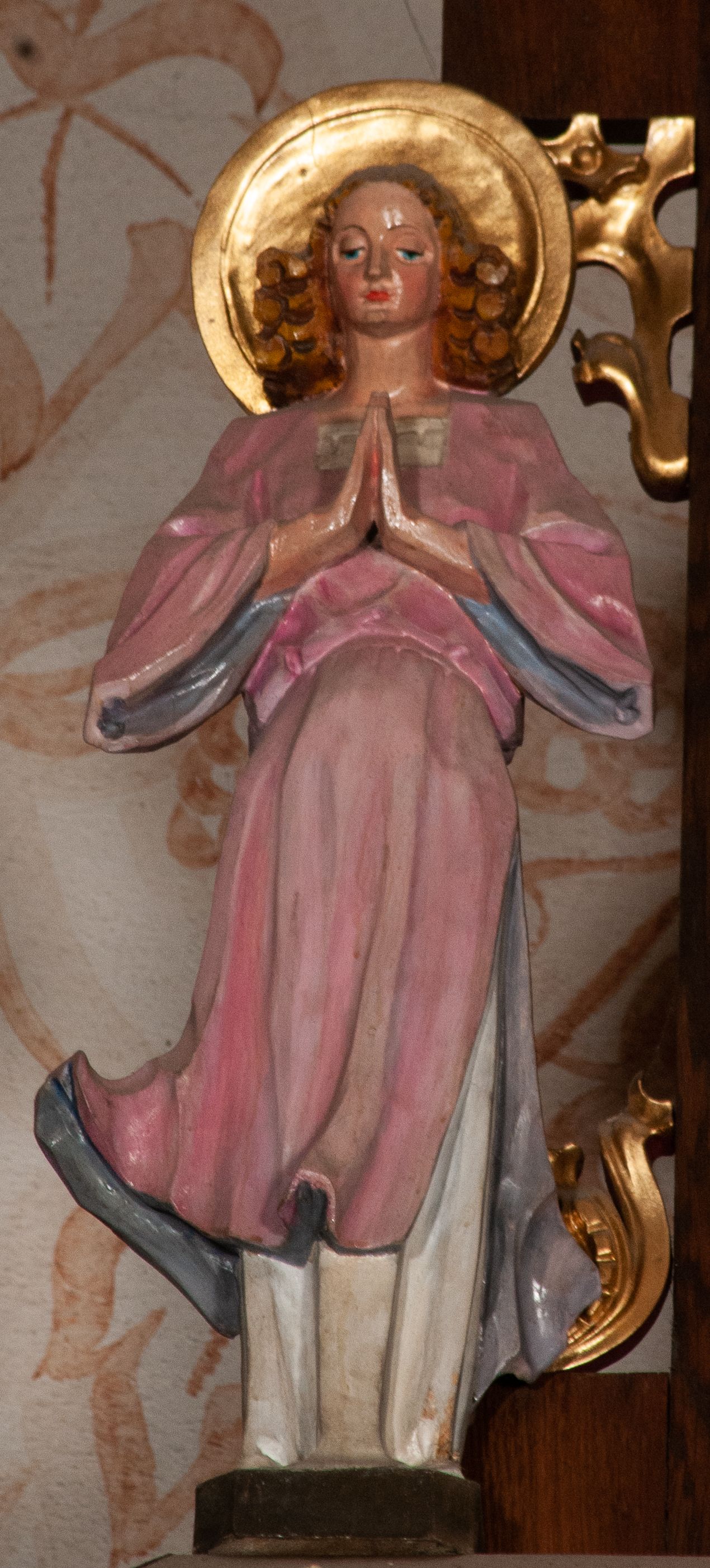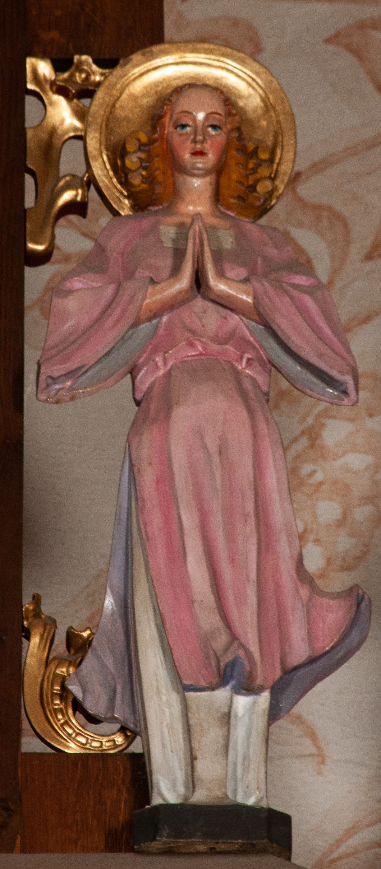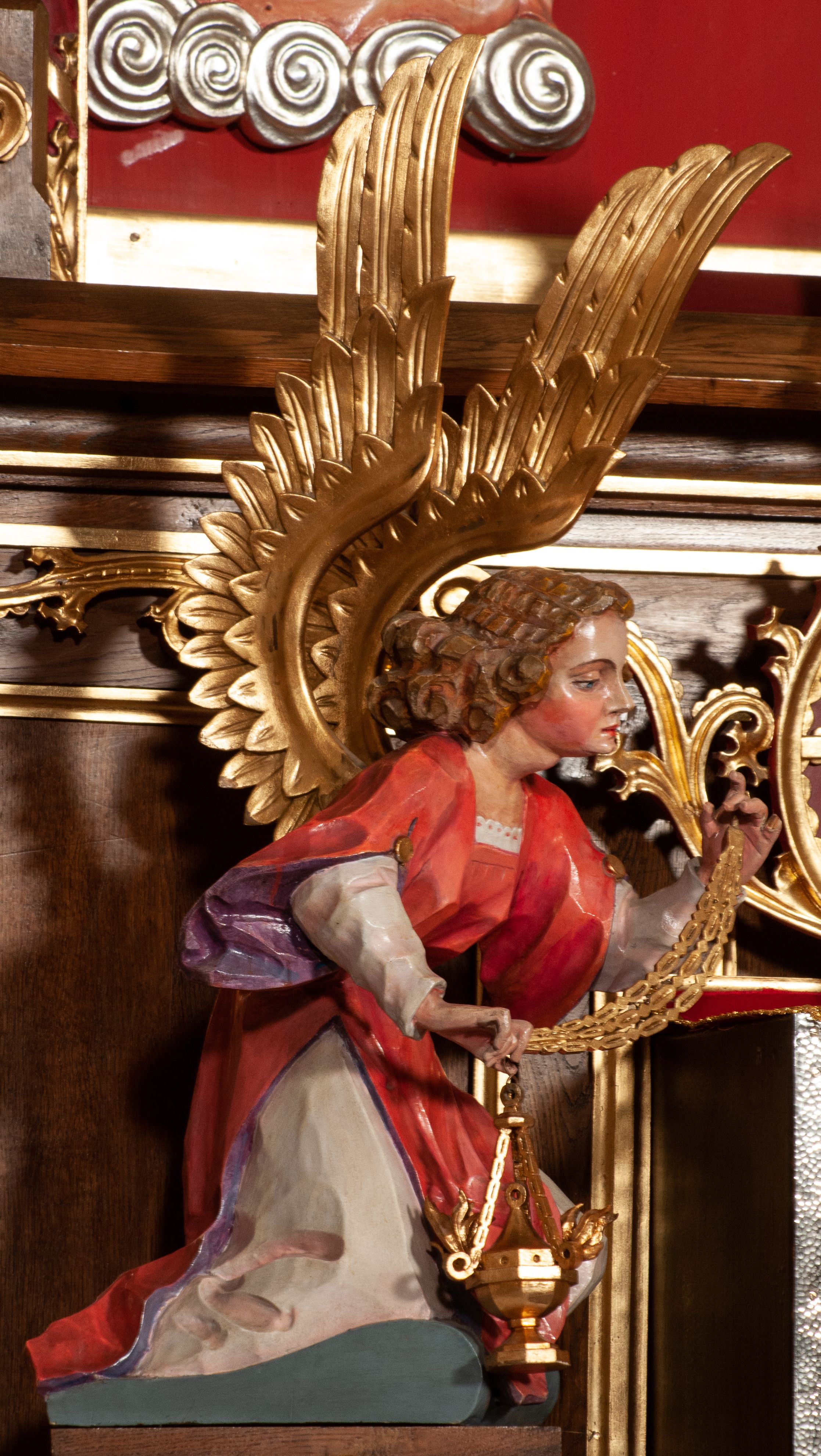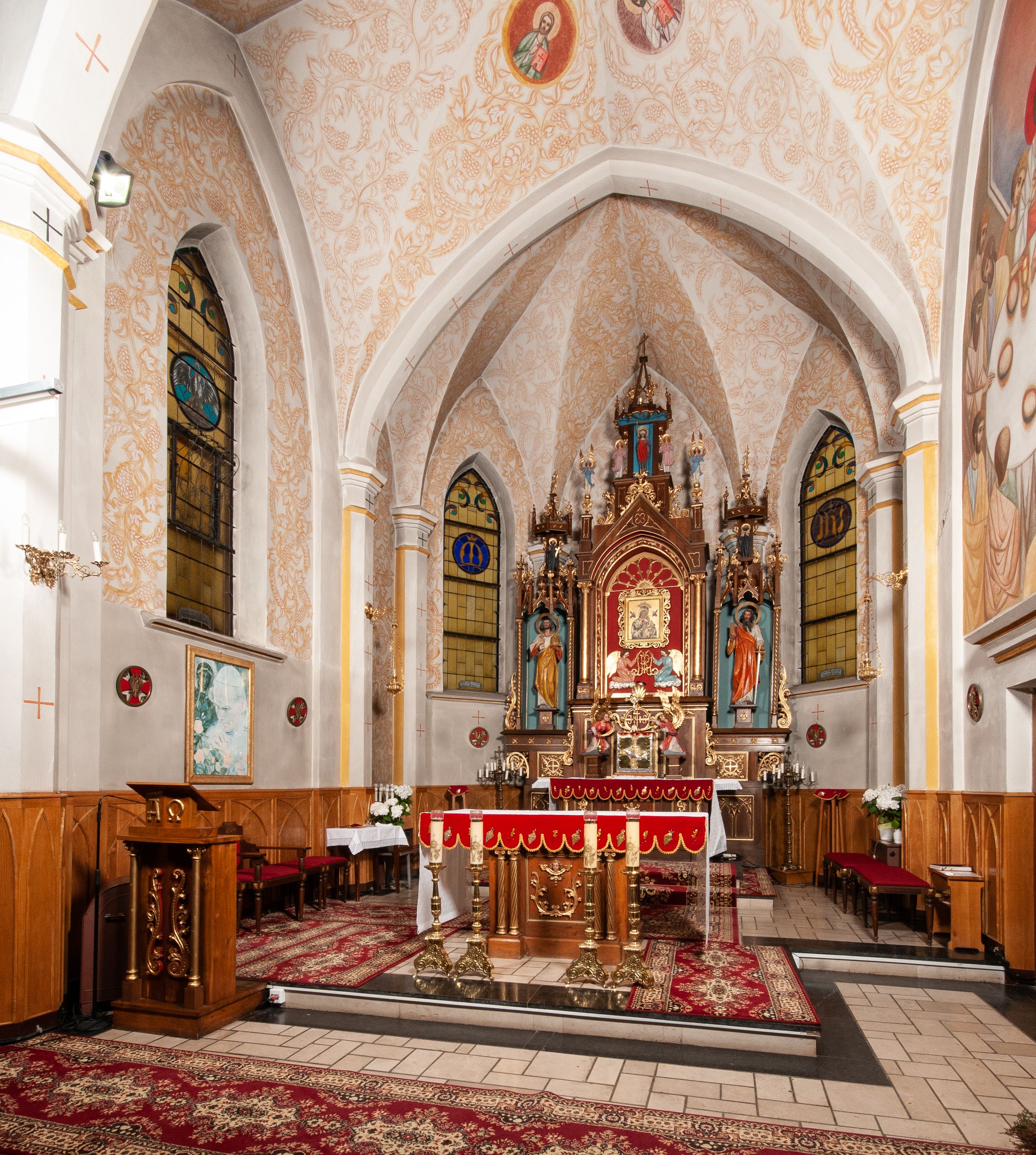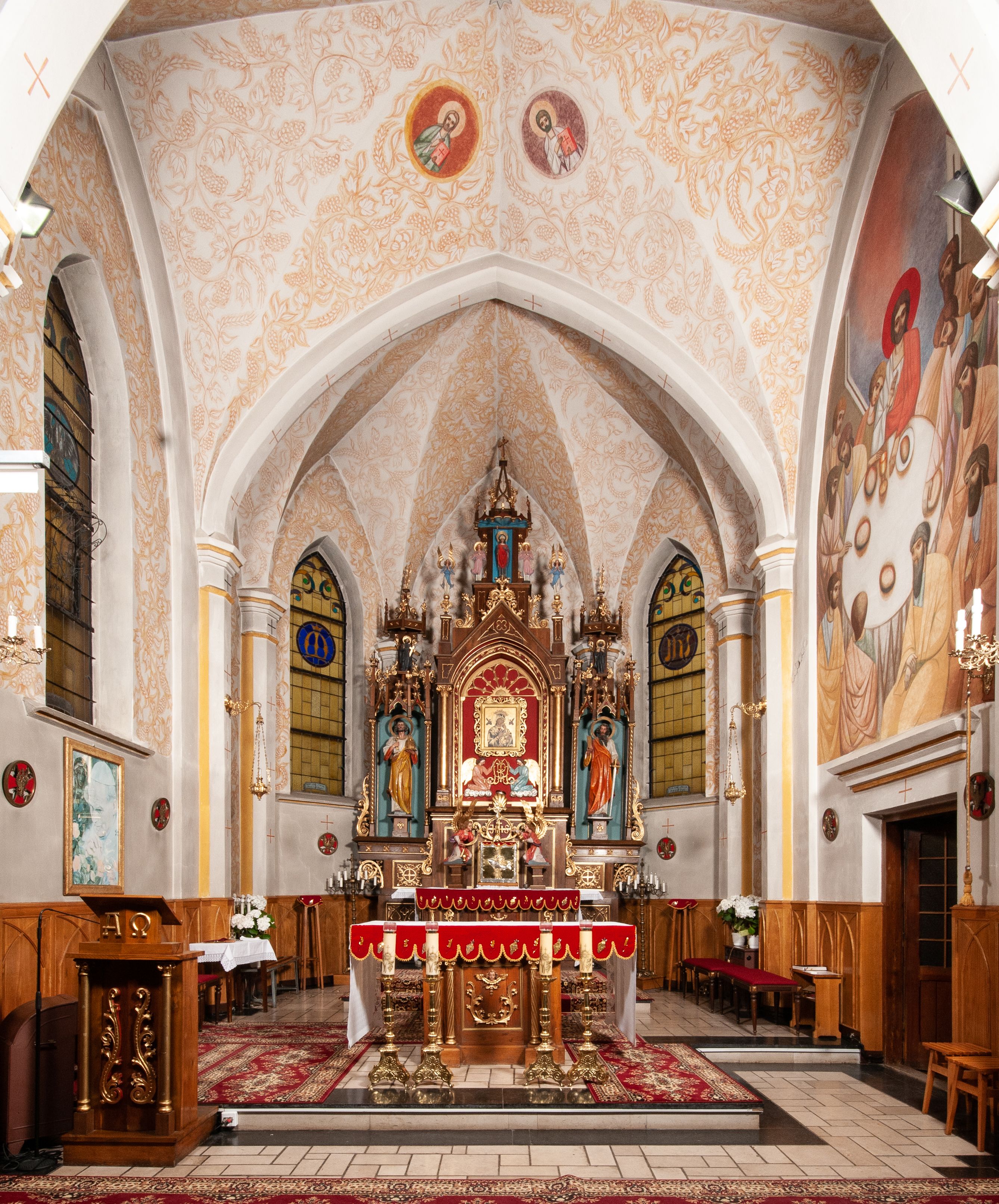 Ołtarz jednokondygnacyjny na wysokim, schodkowym cokole, trójosiowy, z wysuniętą mensą ołtarzową. Płyciny cokołu zdobione dekoracją w formie ostrołukowych maswerków i rozet w kwadratowej ramie. Antepedium flankowane parą kolumn ustawionych na wysokich cokołach i kanelowanych, skręconych trzonach z kompozytowymi kapitelami. W polu dwie prostokątne płyciny i kwadratowa pośrodku ze stylizowaną wicią roślinną i małą uskrzydloną główką aniołka. Tabernakulum proste, w kształcie prostopadłościennej skrzynki, o złotych drzwiczkach z wytłaczaną formą równoramiennego krzyża i wypukłą srebrną rybą oraz koszem z chlebem. Po obu stronach, na niewysokich postumentach dwa klęczące anioły z wysokimi skrzydłami, w biało różowych szatach z fioletowym podbiciem (skrzydła stylizowane na husarskie). Anioł po lewej z kadzielnicą, a anioł po prawej z kielichem.