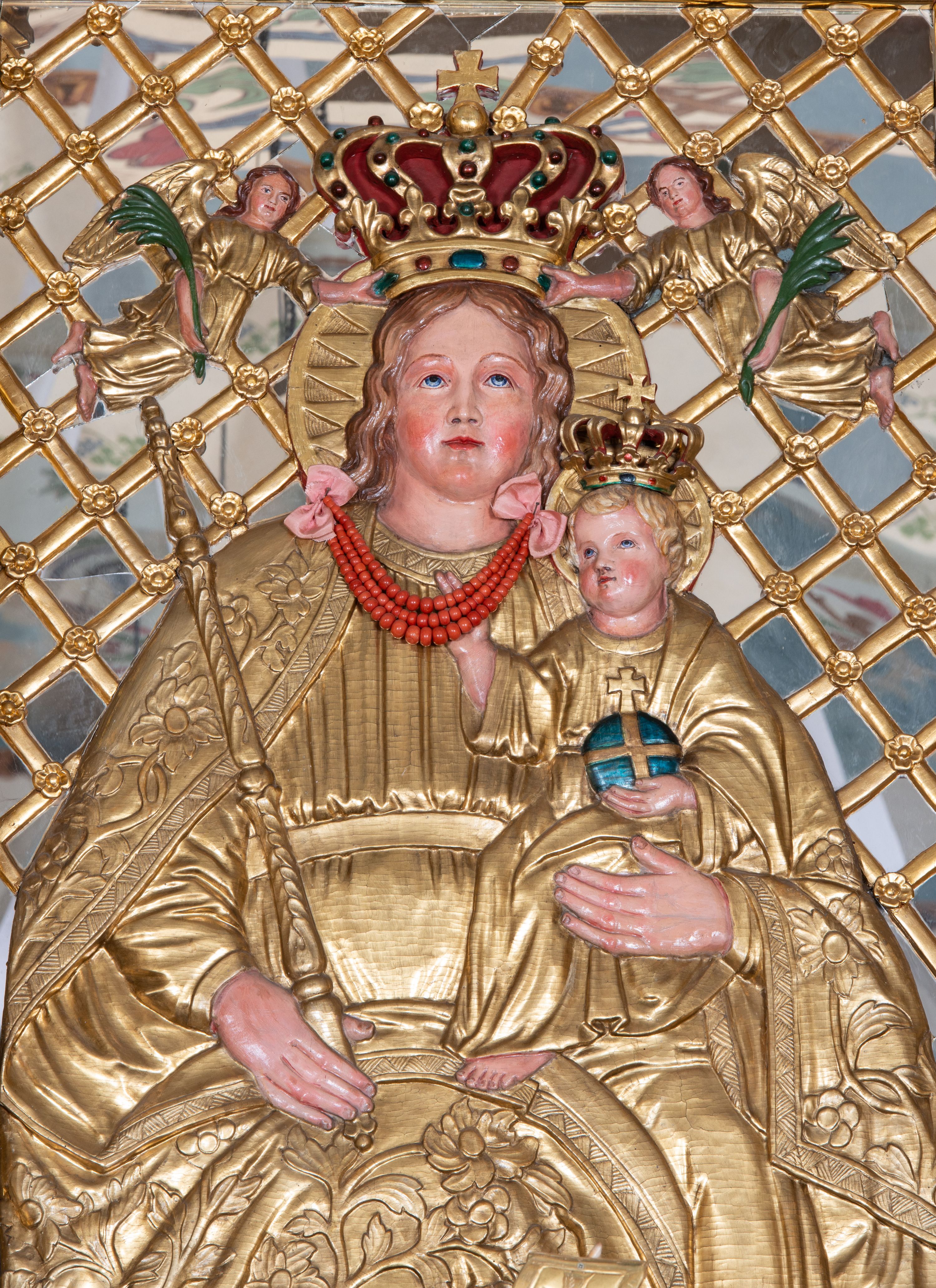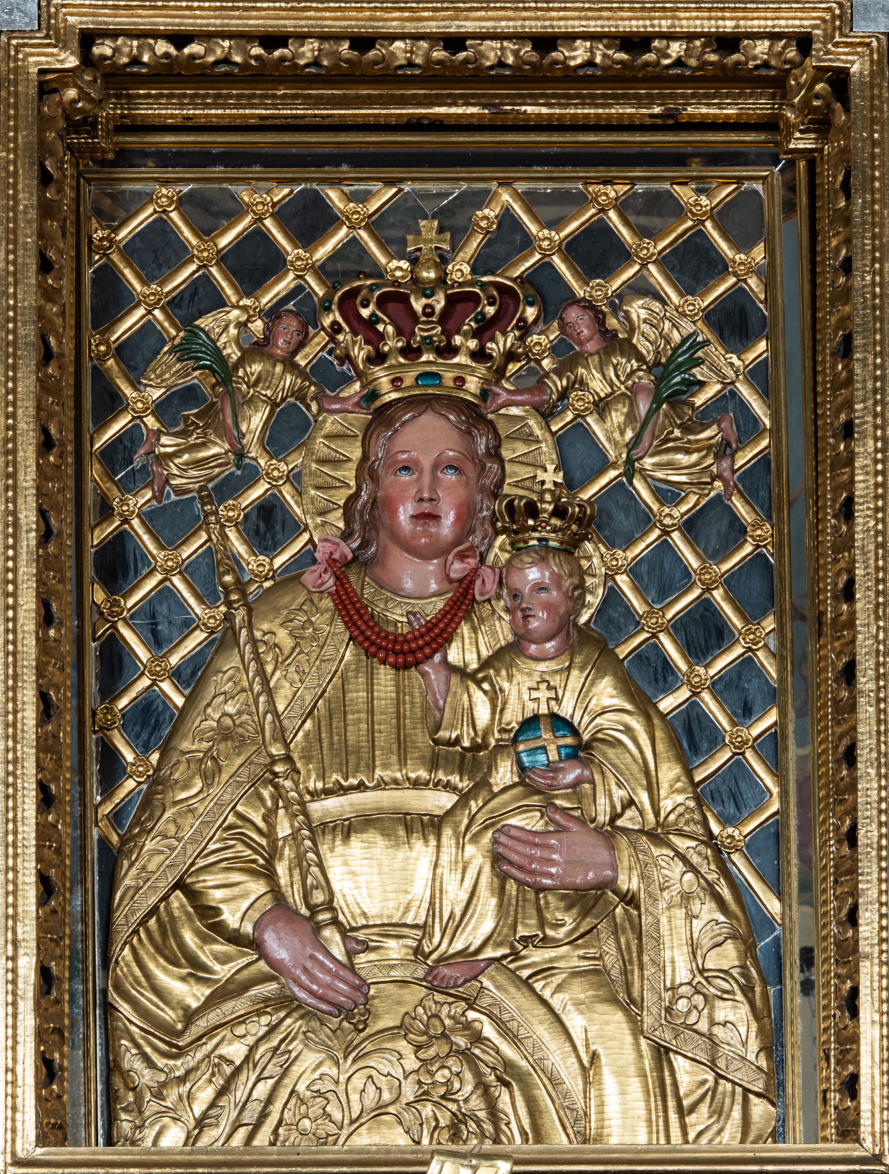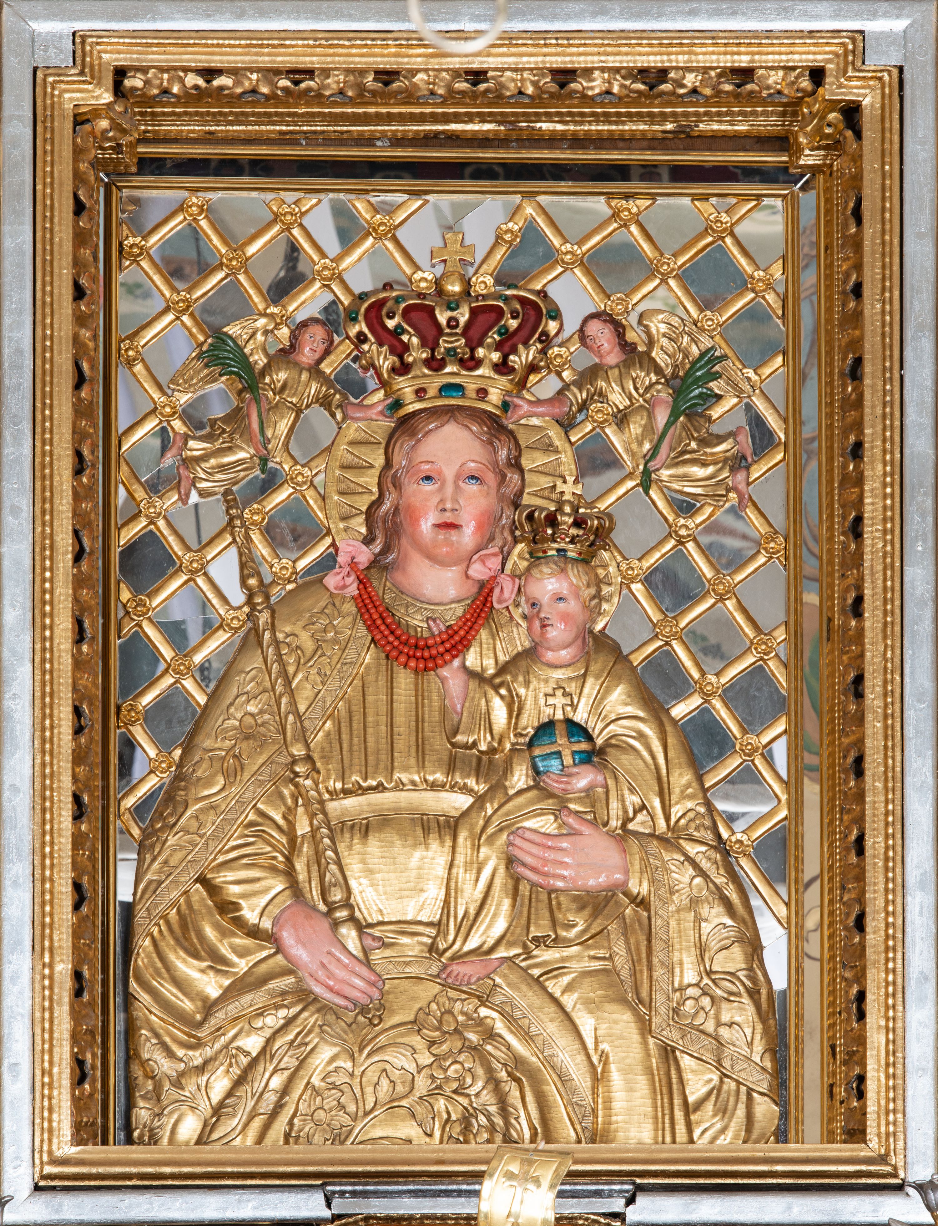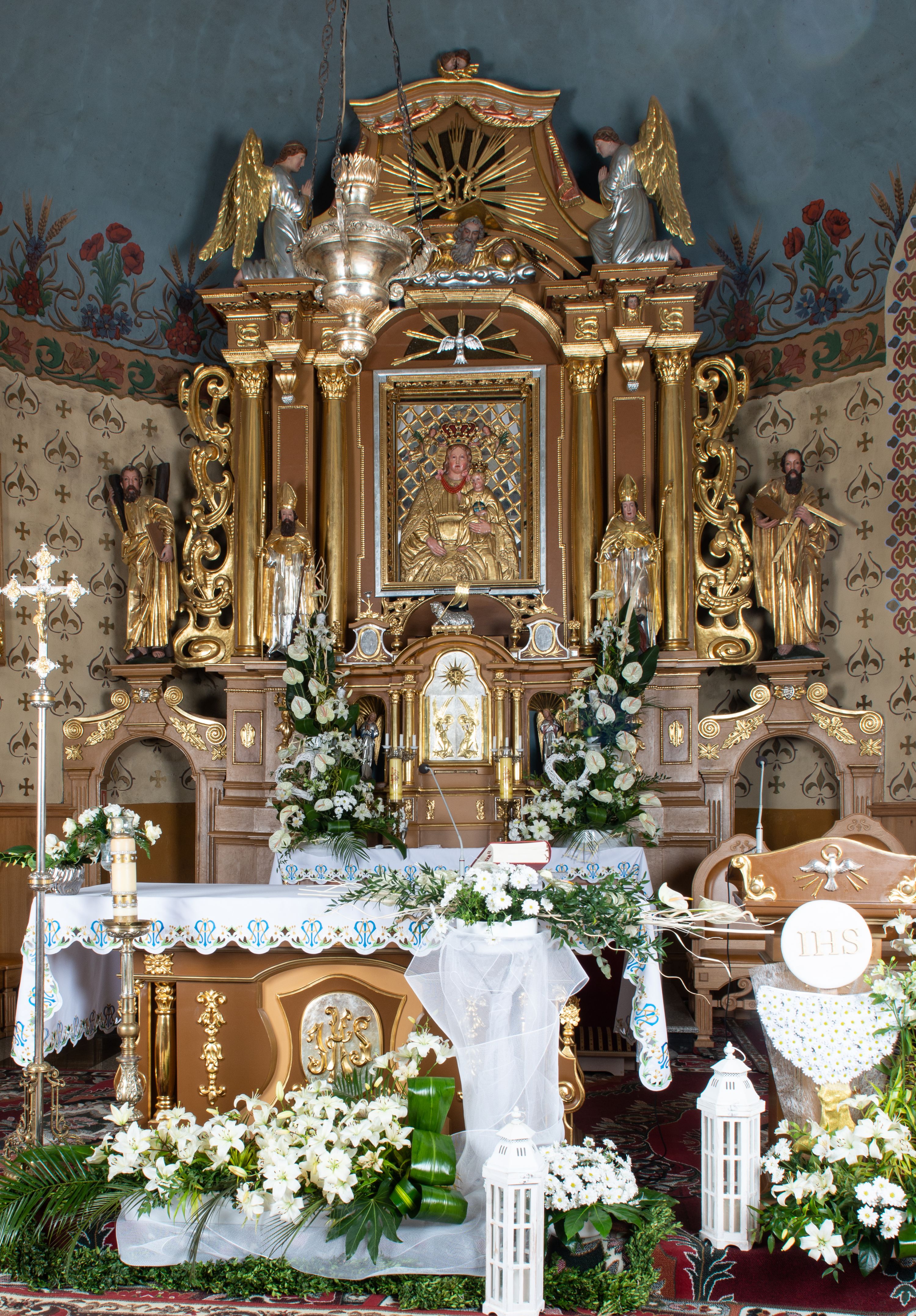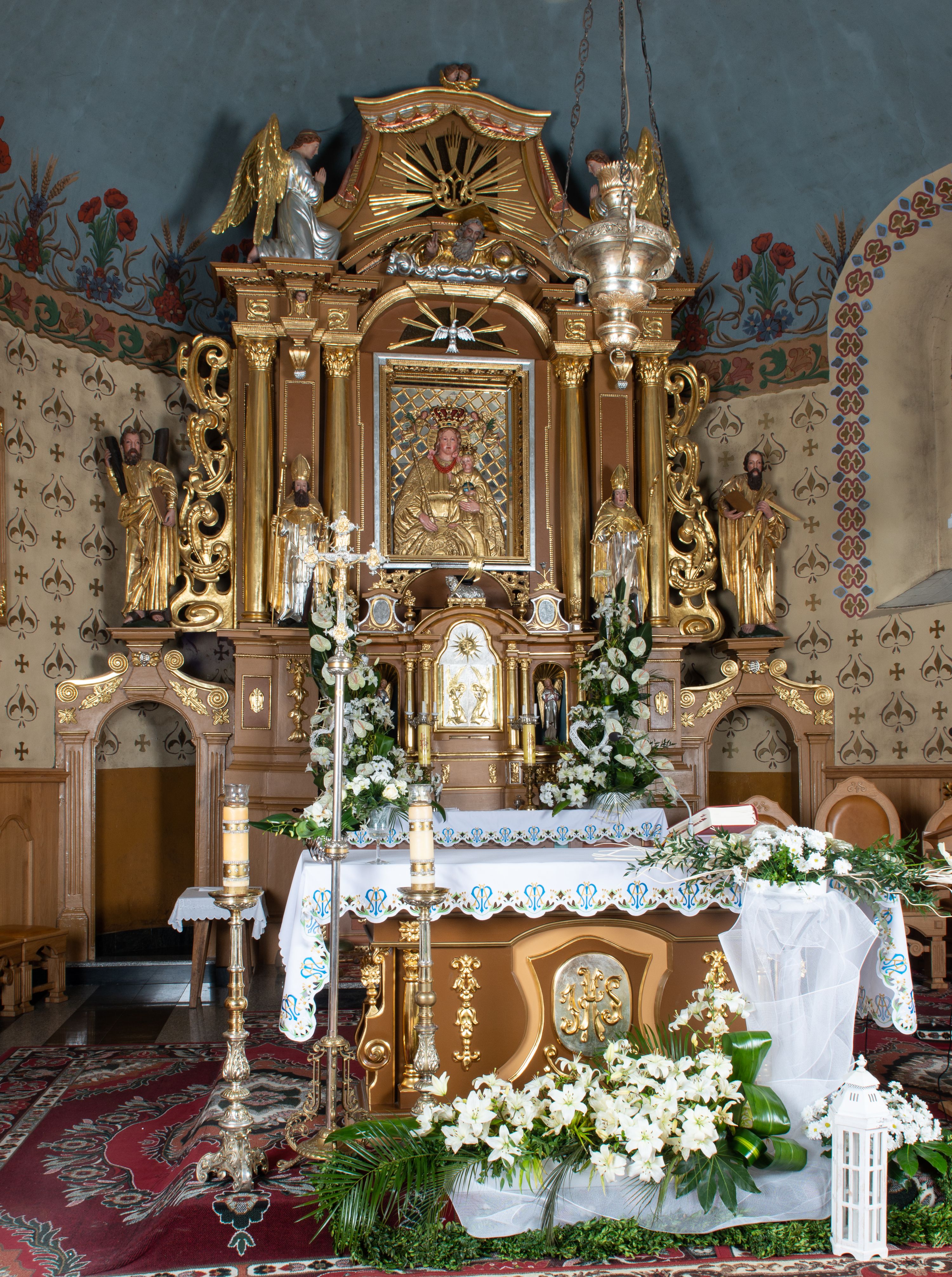 Kondygnacja ujęta jest dwiema parami kolumn o kapitelach kompozytowych oraz stojącą między nimi parą filarów. Podpory dźwigają pełne belkowanie o silnie wysuniętym gzymsie, wyłamane na osiach bocznych, z podwieszonymi szyszkami na tle filarów; przerwane nad polem środkowym. W centrum pole w formie stojącego prostokąta ujęte ramą dekorowaną ornamentem roślinnym z płaskorzeźbionym przedstawieniem Matki Boskiej z Dzieciątkiem. Na zasuwie obrazy: „Najświętsze Serce Pana Jezusa”, „Zwiastowanie” oraz „Św. Mikołaj”. Nad bramkami oraz pomiędzy kolumnami ustawione są rzeźby. Od lewej kolejno: św. Andrzej, św. Wojciech, św. Stanisław i na końcu po prawej św. Tomasz. Nad polem głównym znajduje się przeszklony prześwit w formie półkola z rzeźbioną gołębicą Ducha Świętego na tle glorii. Powyżej pole zamknięte półkoliście fragmentem gzymsu z rzeźbionym popiersiem błogosławiącego Boga Ojca pośród obłoków. Zwieńczenie w formie zbliżonej do stojącego prostokąta o wklęsłych bokach z gzymsem i z podwieszonym lambrekinem oraz kotarami spływającymi na boki. W polu przeszklony prześwit w formie kwadratu zamkniętego łukiem nadwieszonym z rzeźbionym monogramem Marii na tle glorii. Po bokach zwieńczenia ustawione są dwie duże figury klęczących aniołów.