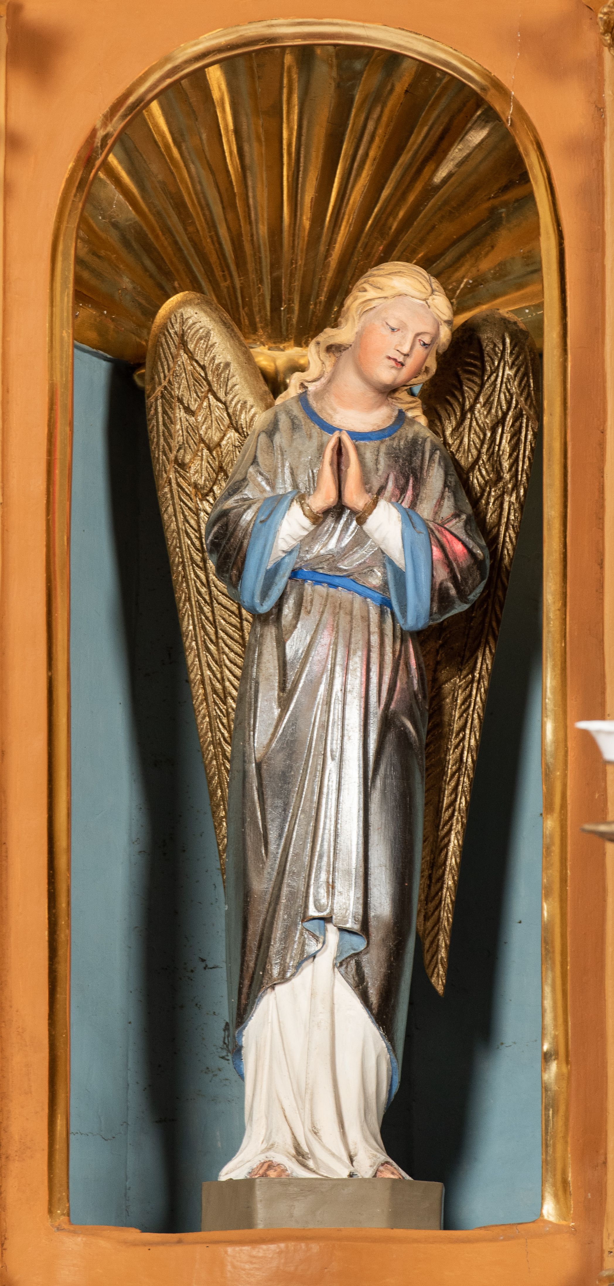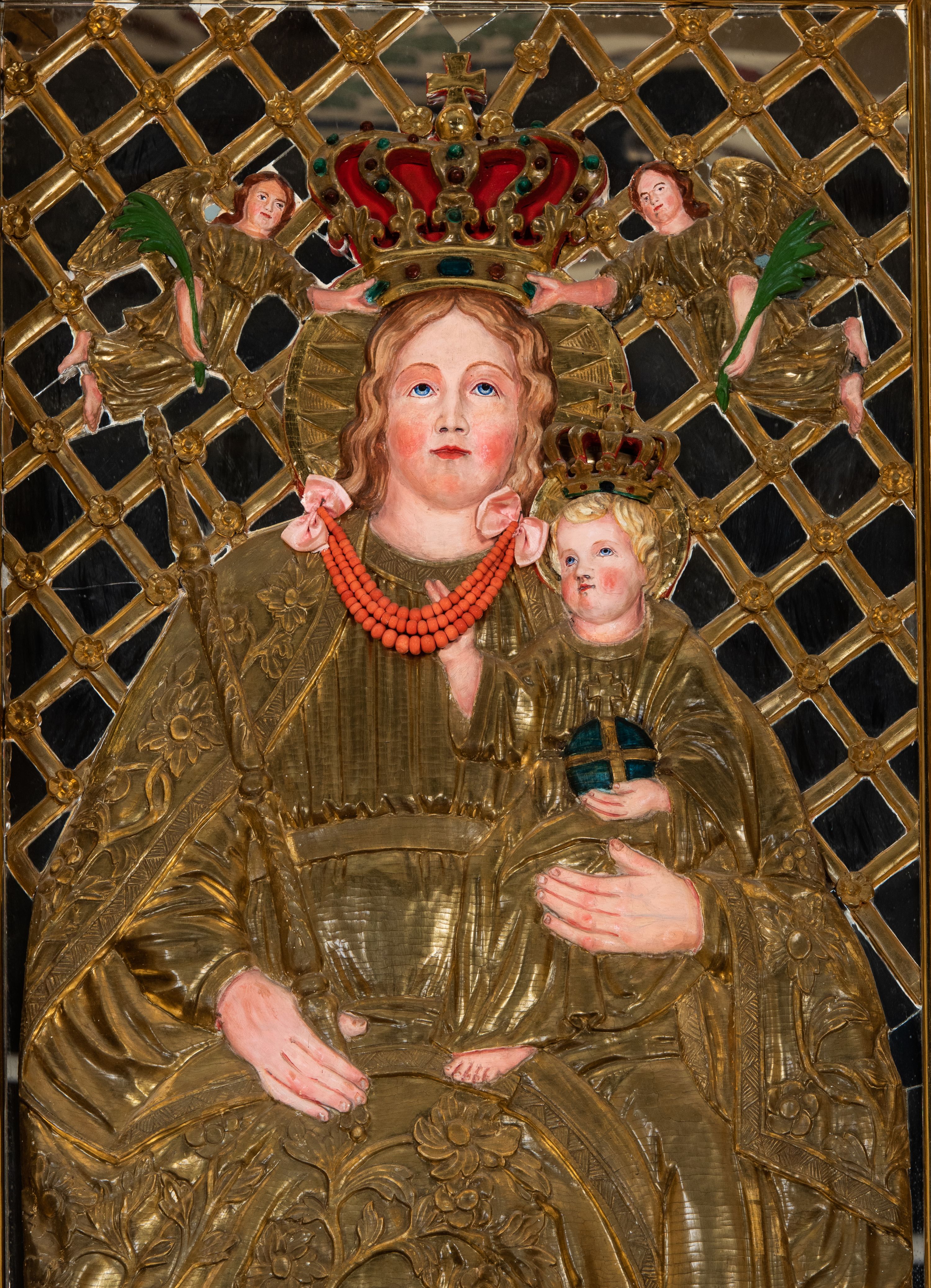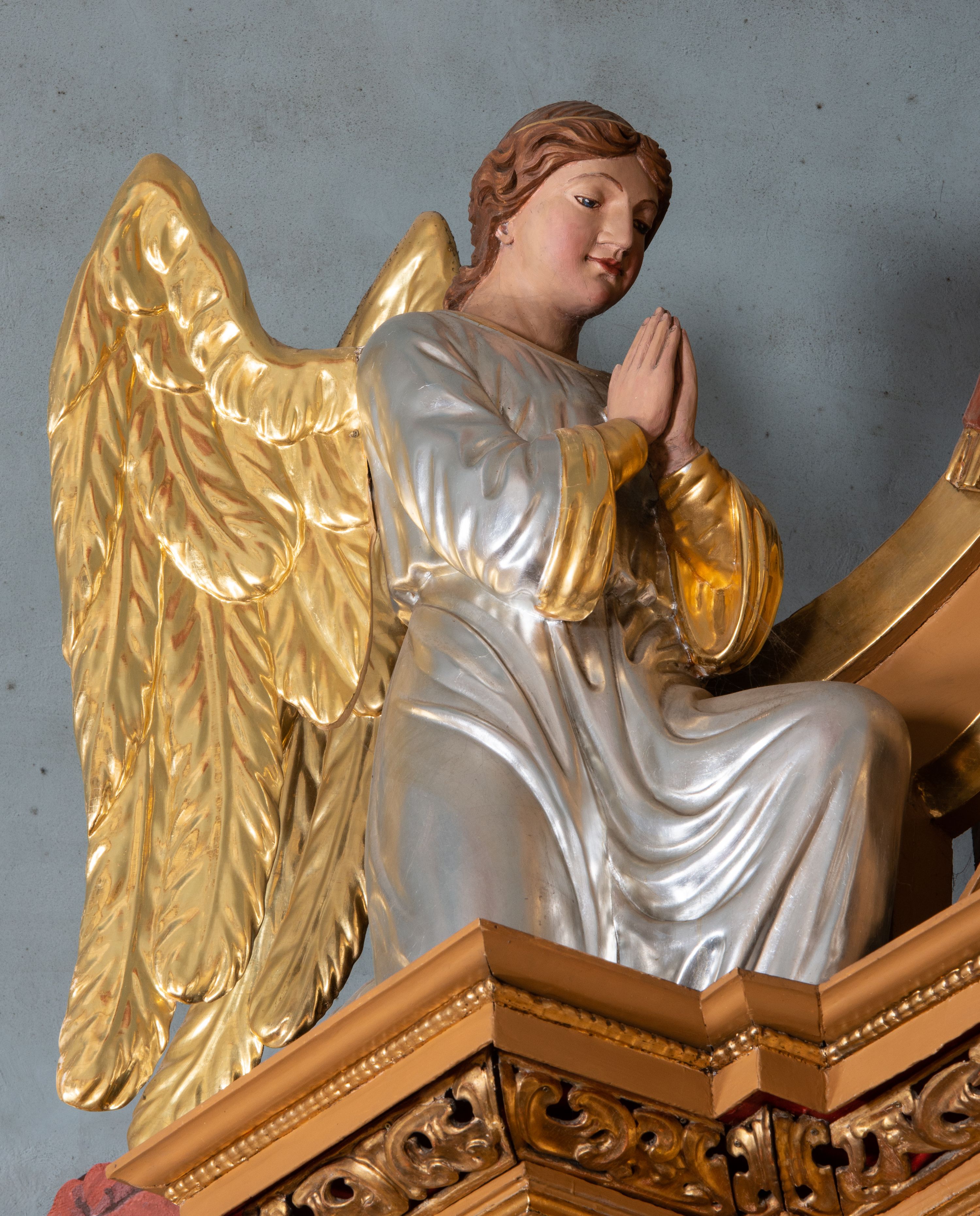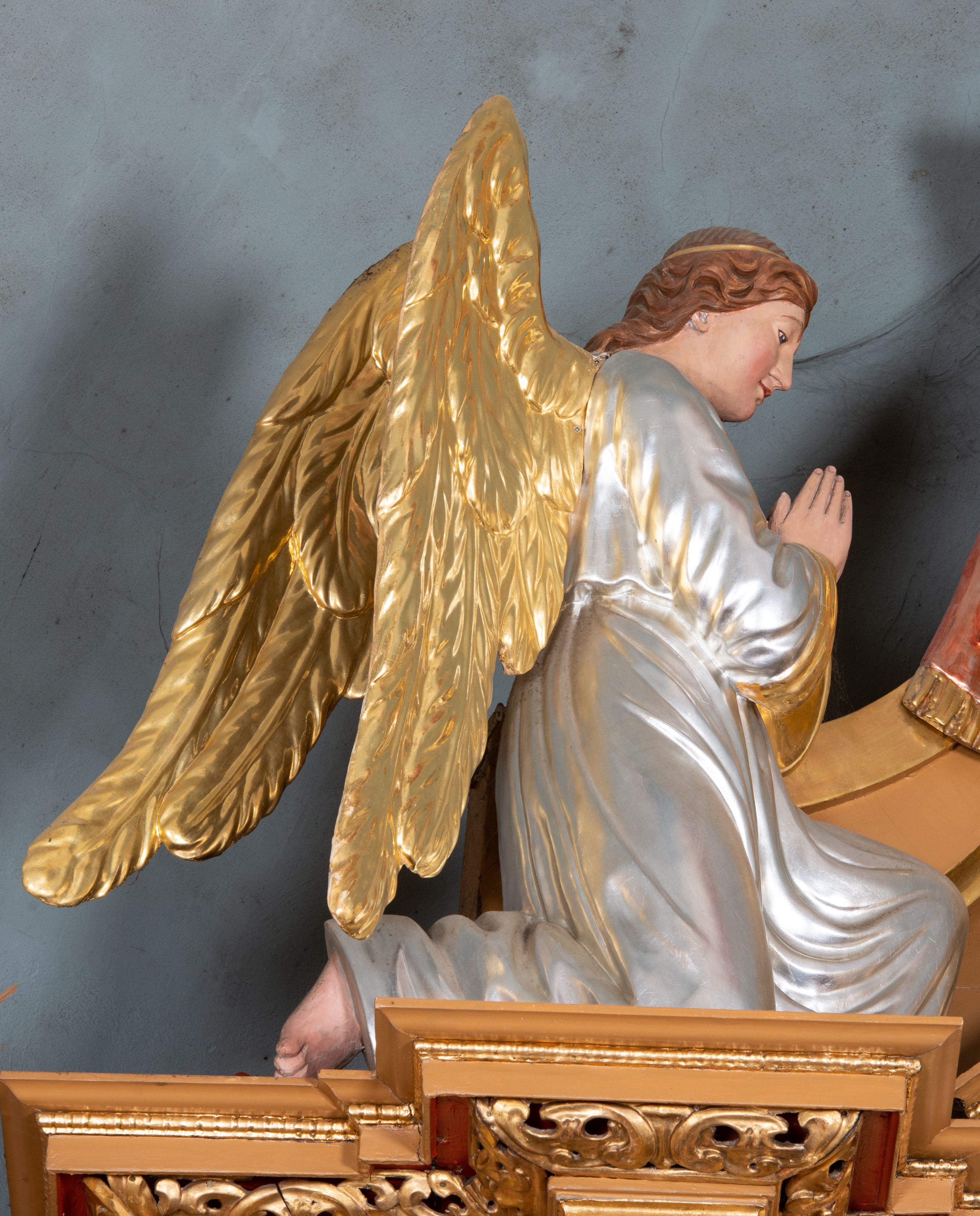 Kondygnacja ujęta jest dwiema parami kolumn o kapitelach kompozytowych oraz stojącą między nimi parą filarów. Podpory dźwigają pełne belkowanie o silnie wysuniętym gzymsie, wyłamane na osiach bocznych, z podwieszonymi szyszkami na tle filarów; przerwane nad polem środkowym. W centrum pole w formie stojącego prostokąta ujęte ramą dekorowaną ornamentem roślinnym z płaskorzeźbionym przedstawieniem Matki Boskiej z Dzieciątkiem. Na zasuwie obrazy: „Najświętsze Serce Pana Jezusa”, „Zwiastowanie” oraz „Św. Mikołaj”. Nad bramkami oraz pomiędzy kolumnami ustawione są rzeźby. Od lewej kolejno: św. Andrzej, św. Wojciech, św. Stanisław i na końcu po prawej św. Tomasz. Nad polem głównym znajduje się przeszklony prześwit w formie półkola z rzeźbioną gołębicą Ducha Świętego na tle glorii. Powyżej pole zamknięte półkoliście fragmentem gzymsu z rzeźbionym popiersiem błogosławiącego Boga Ojca pośród obłoków. Zwieńczenie w formie zbliżonej do stojącego prostokąta o wklęsłych bokach z gzymsem i z podwieszonym lambrekinem oraz kotarami spływającymi na boki. W polu przeszklony prześwit w formie kwadratu zamkniętego łukiem nadwieszonym z rzeźbionym monogramem Marii na tle glorii. Po bokach zwieńczenia ustawione są dwie duże figury klęczących aniołów.