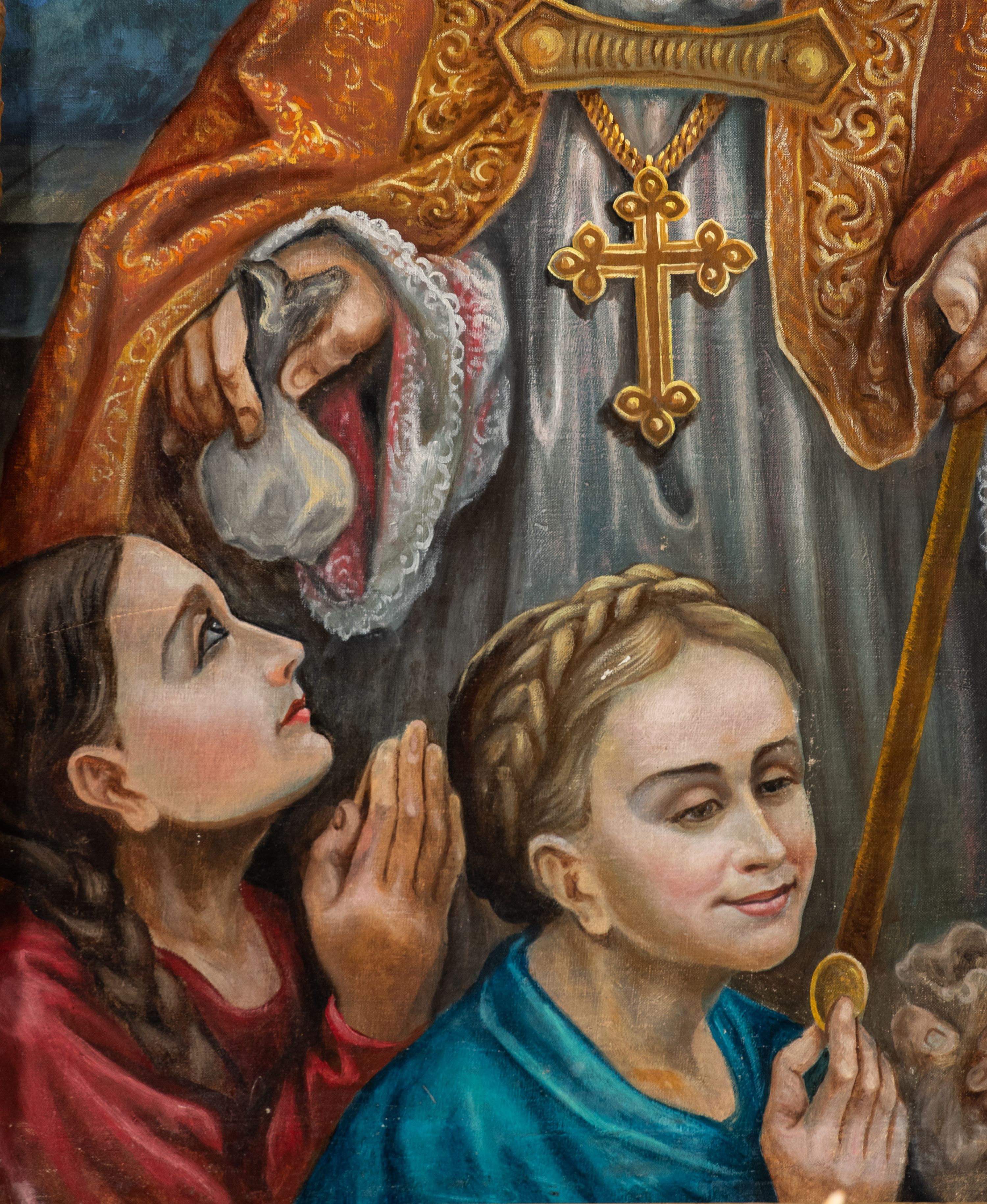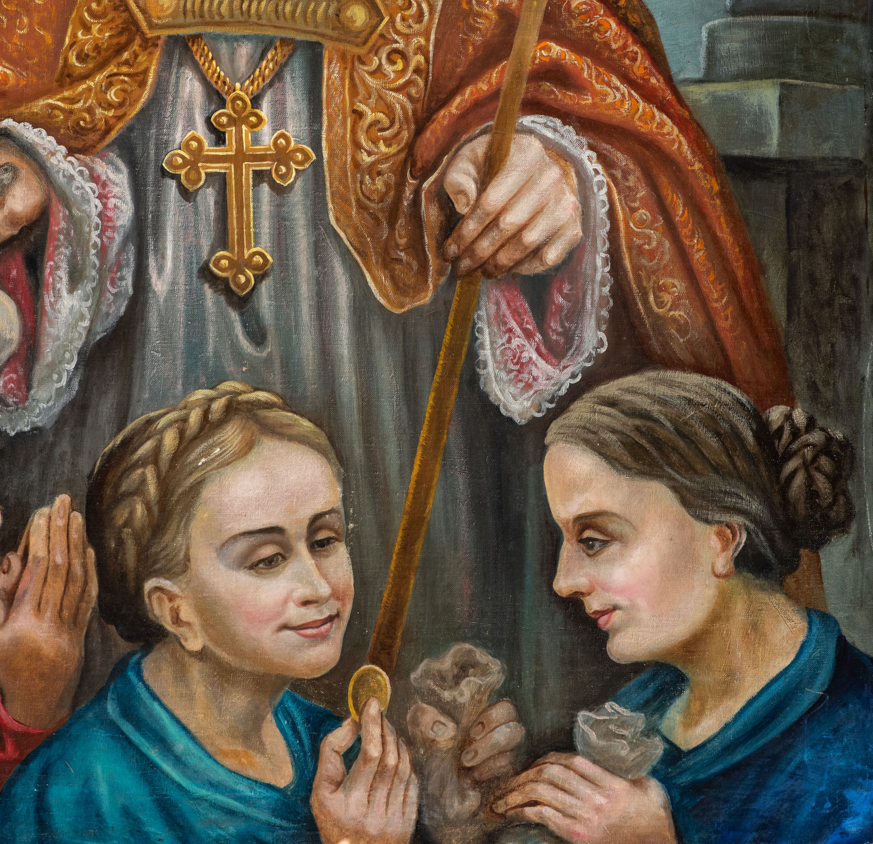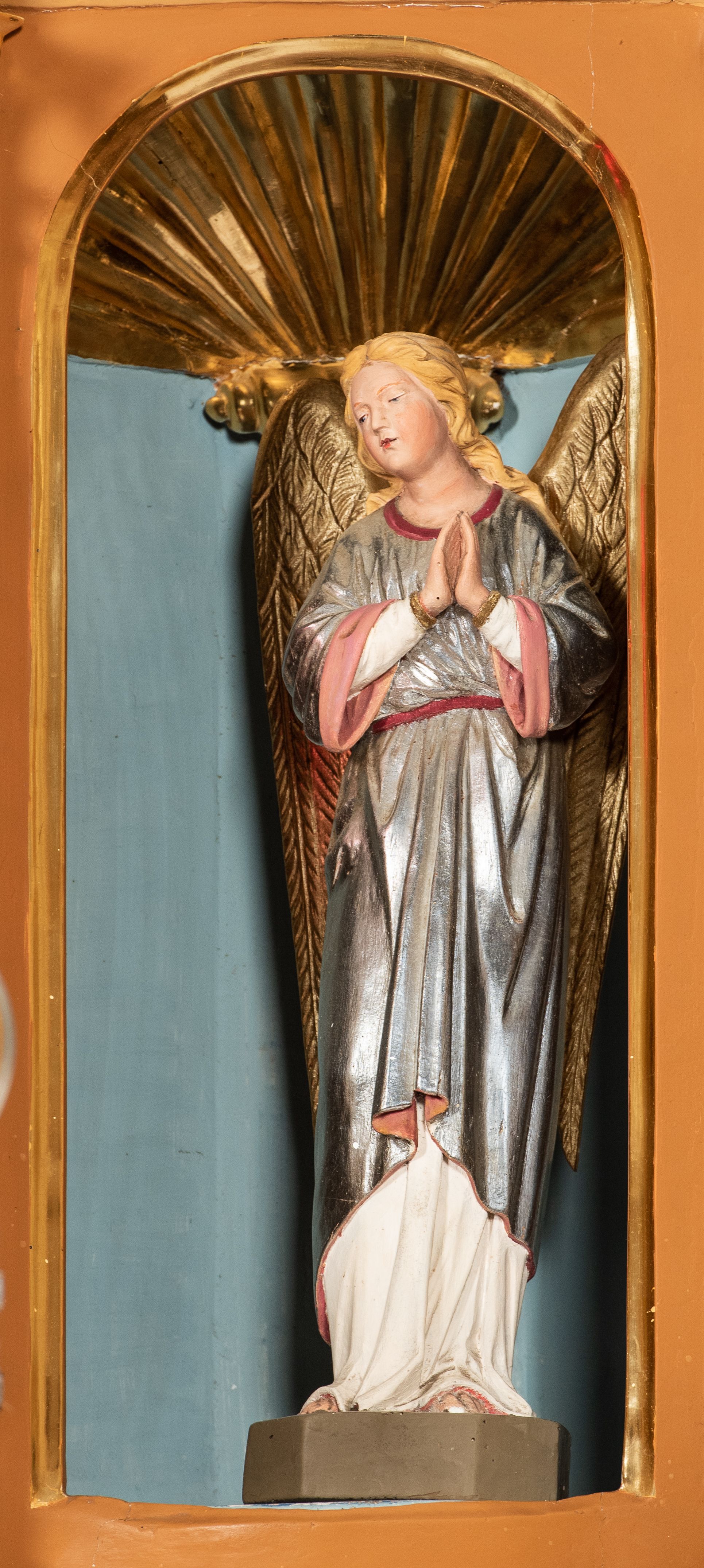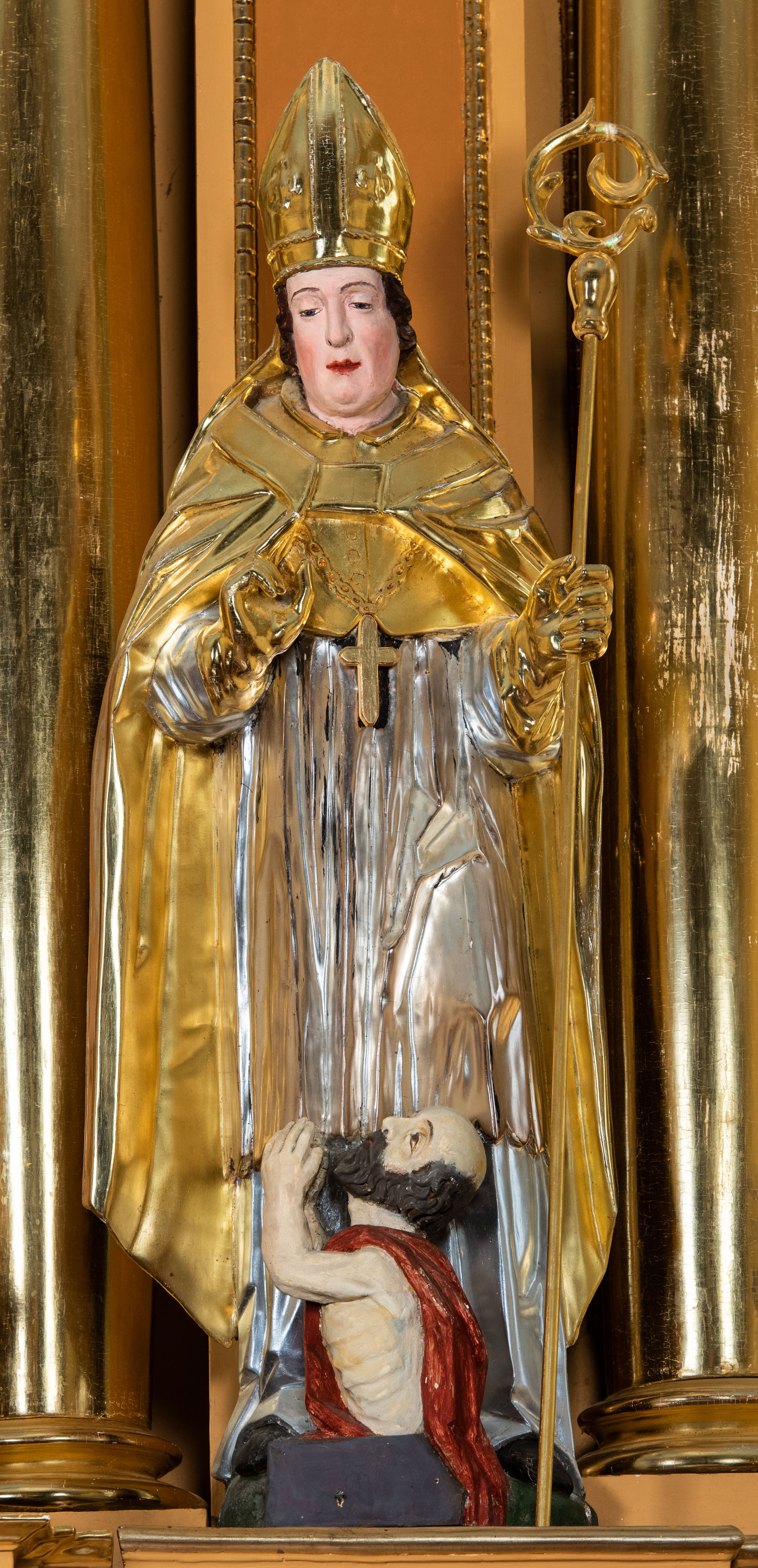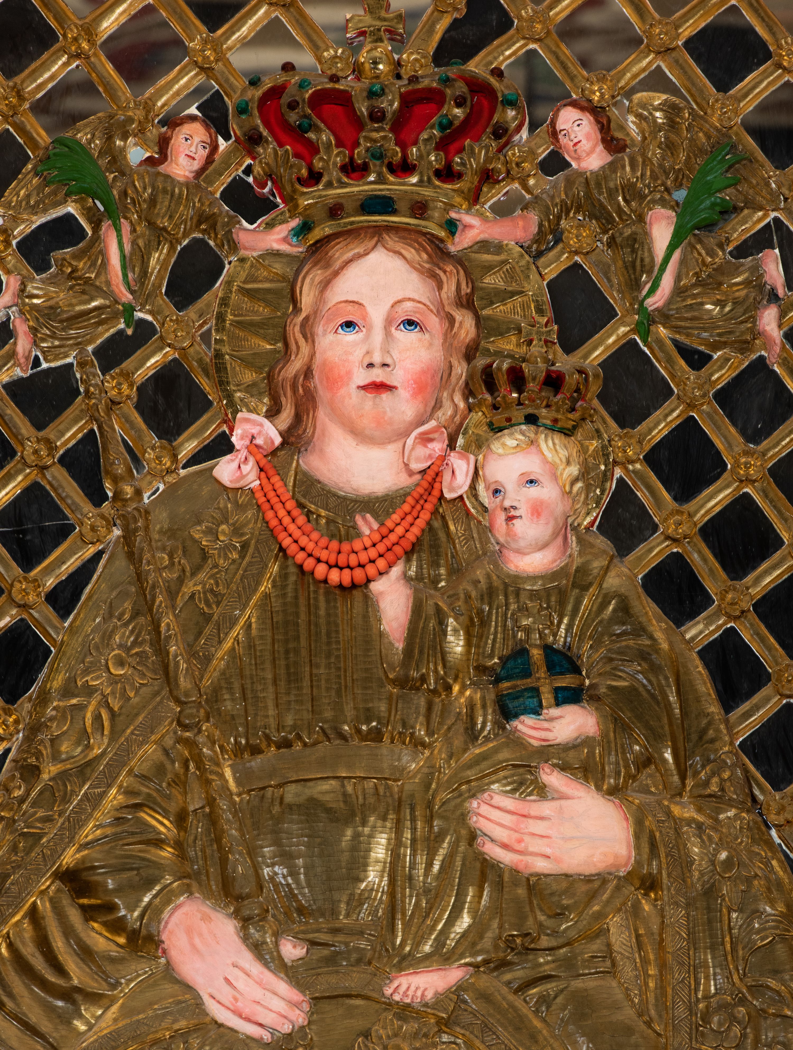 Kondygnacja ujęta jest dwiema parami kolumn o kapitelach kompozytowych oraz stojącą między nimi parą filarów. Podpory dźwigają pełne belkowanie o silnie wysuniętym gzymsie, wyłamane na osiach bocznych, z podwieszonymi szyszkami na tle filarów; przerwane nad polem środkowym. W centrum pole w formie stojącego prostokąta ujęte ramą dekorowaną ornamentem roślinnym z płaskorzeźbionym przedstawieniem Matki Boskiej z Dzieciątkiem. Na zasuwie obrazy: „Najświętsze Serce Pana Jezusa”, „Zwiastowanie” oraz „Św. Mikołaj”. Nad bramkami oraz pomiędzy kolumnami ustawione są rzeźby. Od lewej kolejno: św. Andrzej, św. Wojciech, św. Stanisław i na końcu po prawej św. Tomasz. Nad polem głównym znajduje się przeszklony prześwit w formie półkola z rzeźbioną gołębicą Ducha Świętego na tle glorii. Powyżej pole zamknięte półkoliście fragmentem gzymsu z rzeźbionym popiersiem błogosławiącego Boga Ojca pośród obłoków. Zwieńczenie w formie zbliżonej do stojącego prostokąta o wklęsłych bokach z gzymsem i z podwieszonym lambrekinem oraz kotarami spływającymi na boki. W polu przeszklony prześwit w formie kwadratu zamkniętego łukiem nadwieszonym z rzeźbionym monogramem Marii na tle glorii. Po bokach zwieńczenia ustawione są dwie duże figury klęczących aniołów.