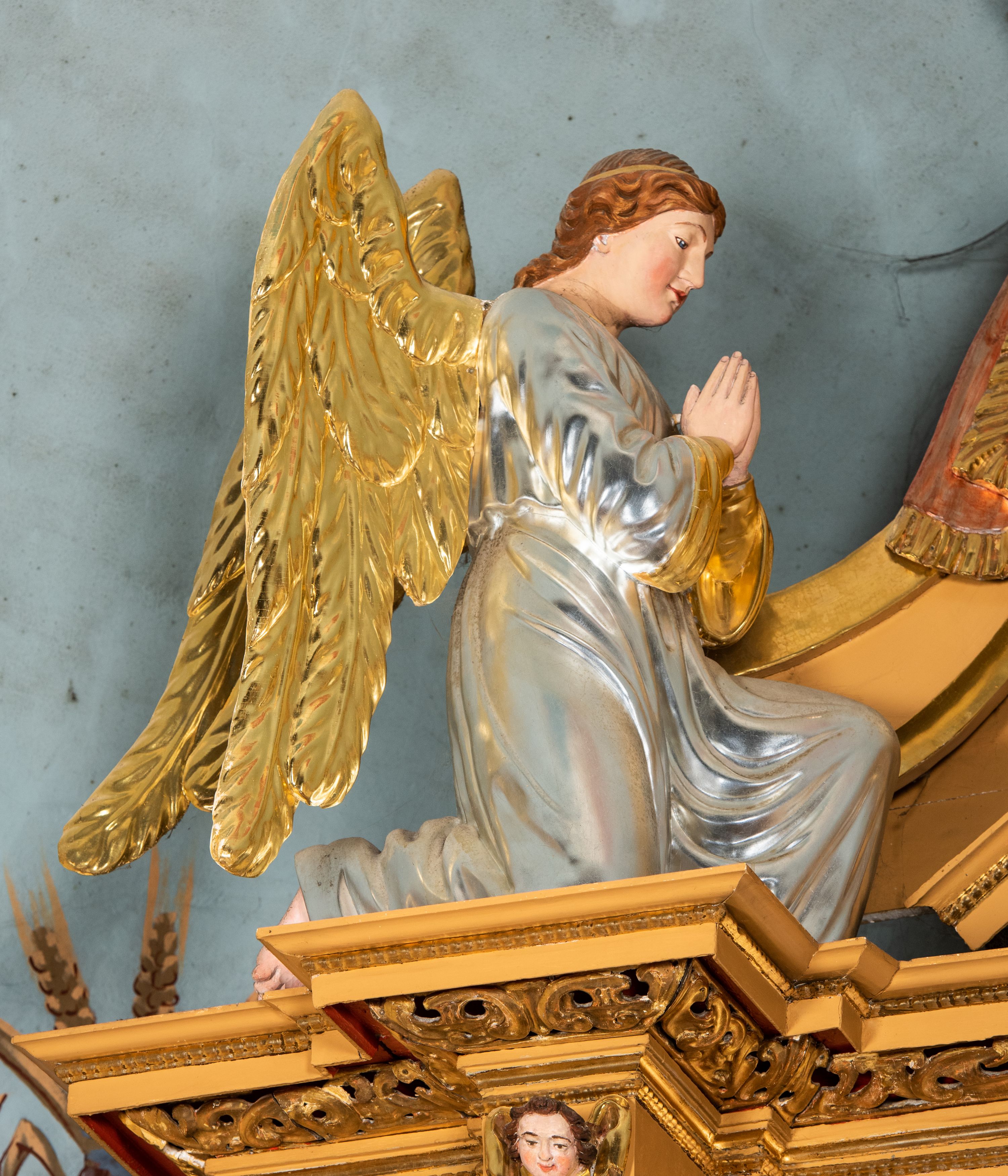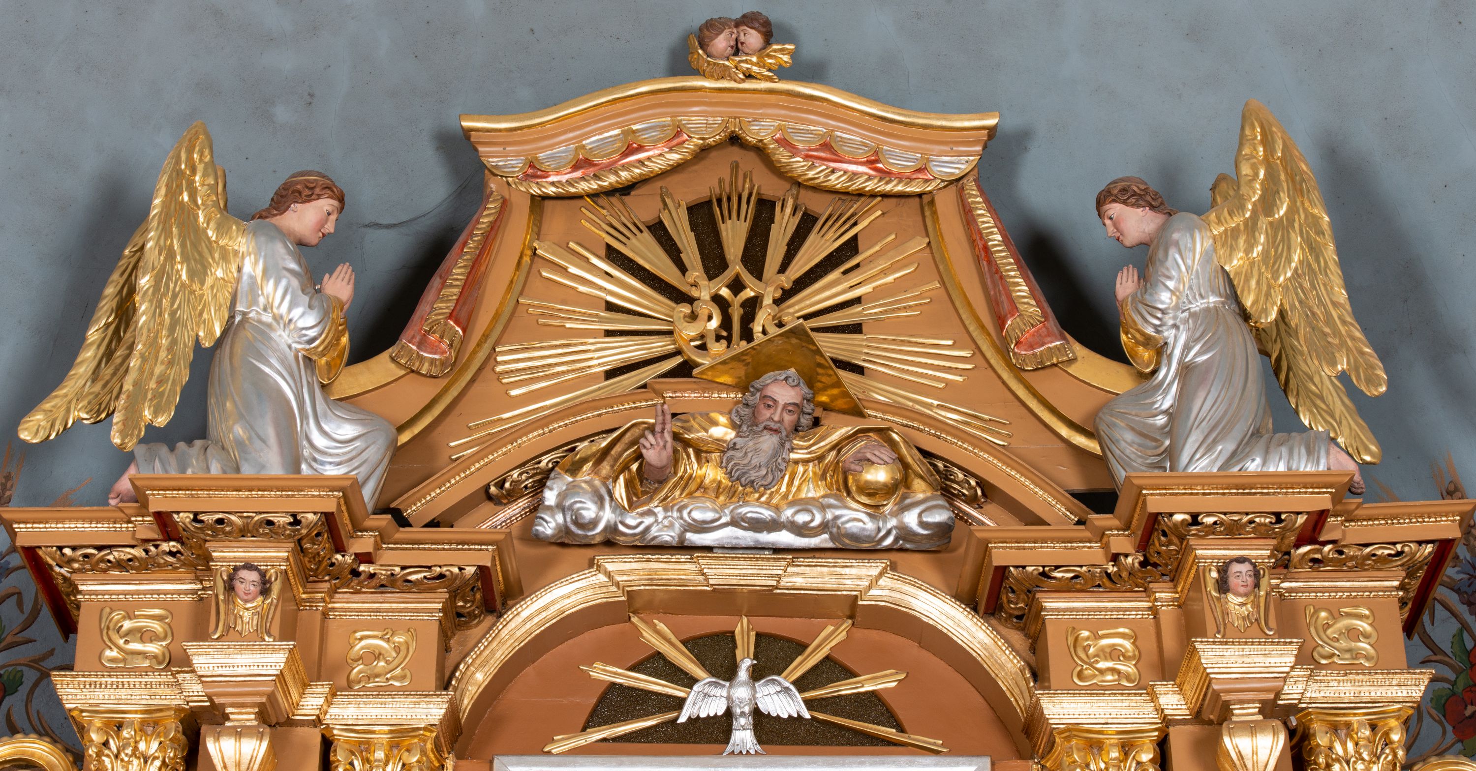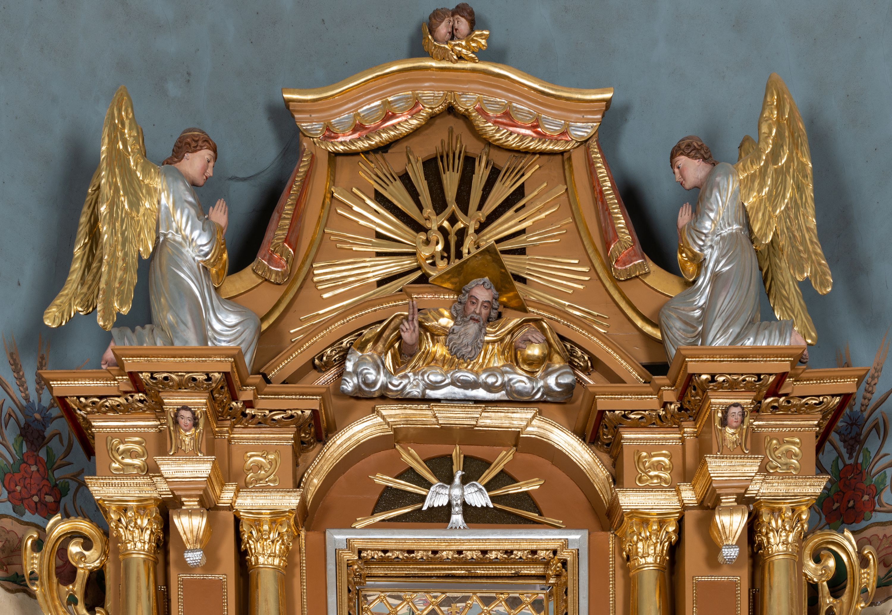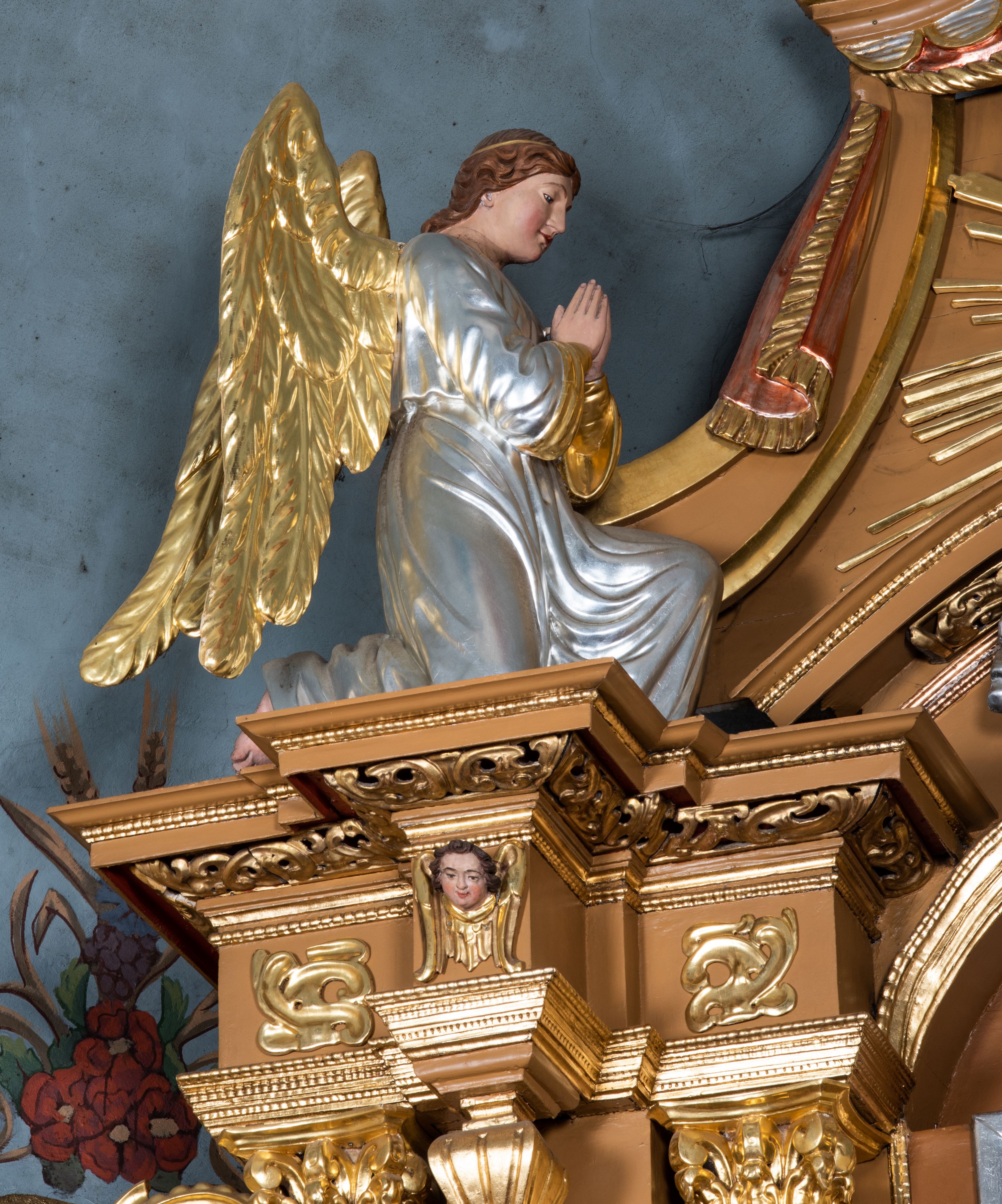 Całość ołtarza oprócz tabernakulum dekorowana jest ornamentem małżowinowo-chrząstkowym. Uszy flankujące kondygnację utworzone są również z ornamentu małżowinowo-chrząstkowego. Na zamknięciu zwieńczenia znajdują się dwie uskrzydlone główki anielskie skierowane na wprost z podwieszonymi u szyi chustami. Struktura ołtarza polichromowana jest w kolorze brązowym ze złoconymi kolumnami, ornamentyką i profilami, detale srebrzone.