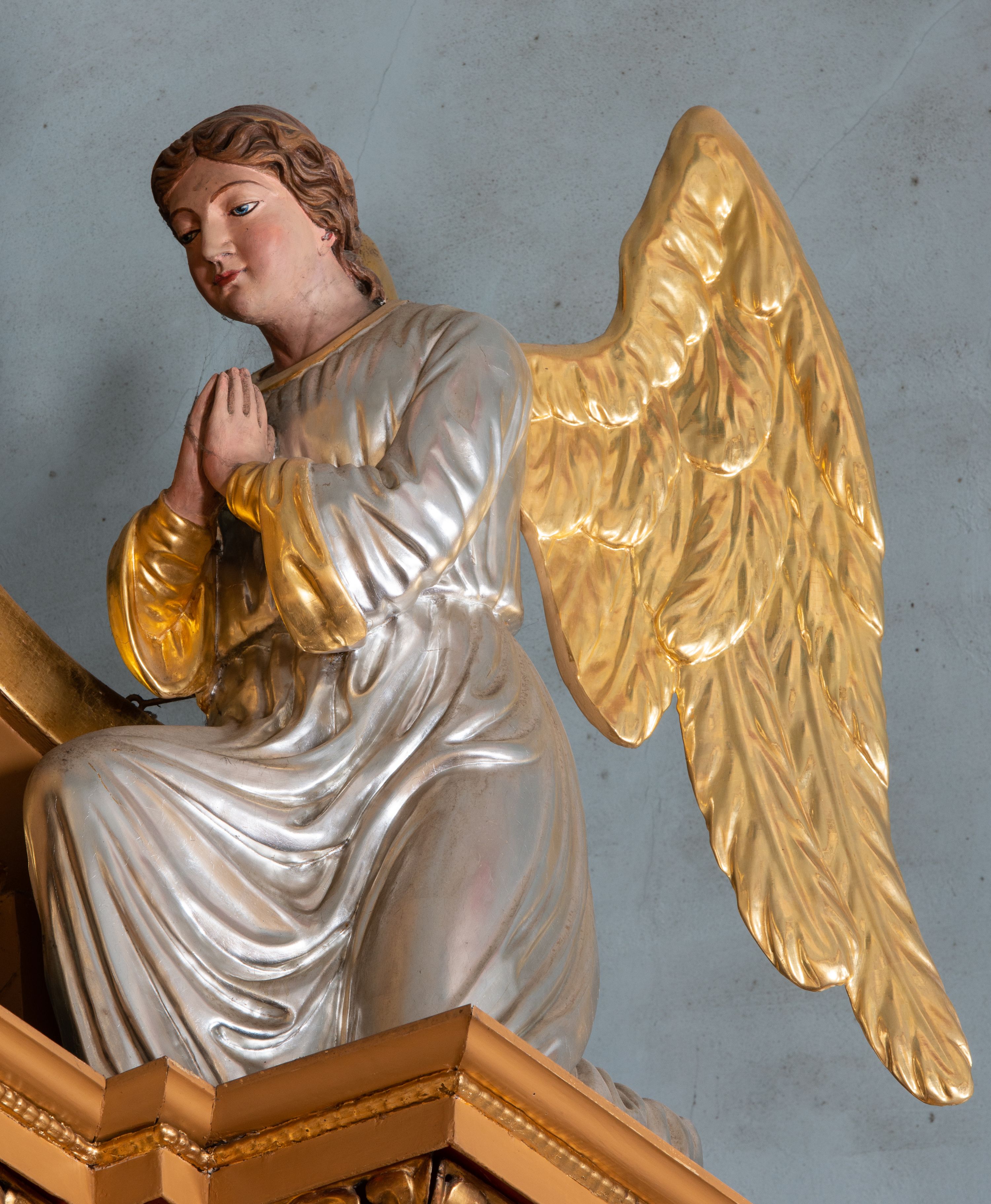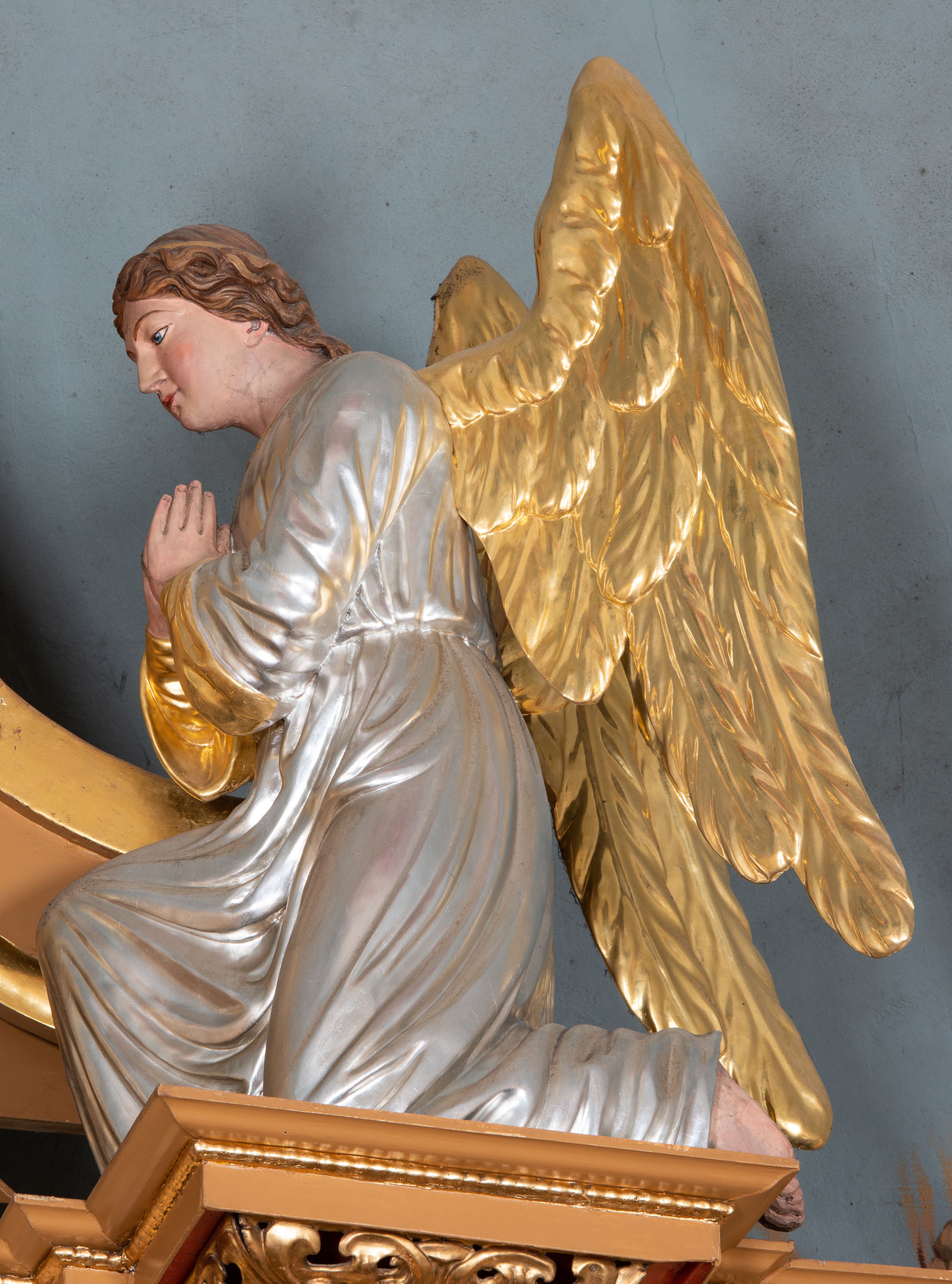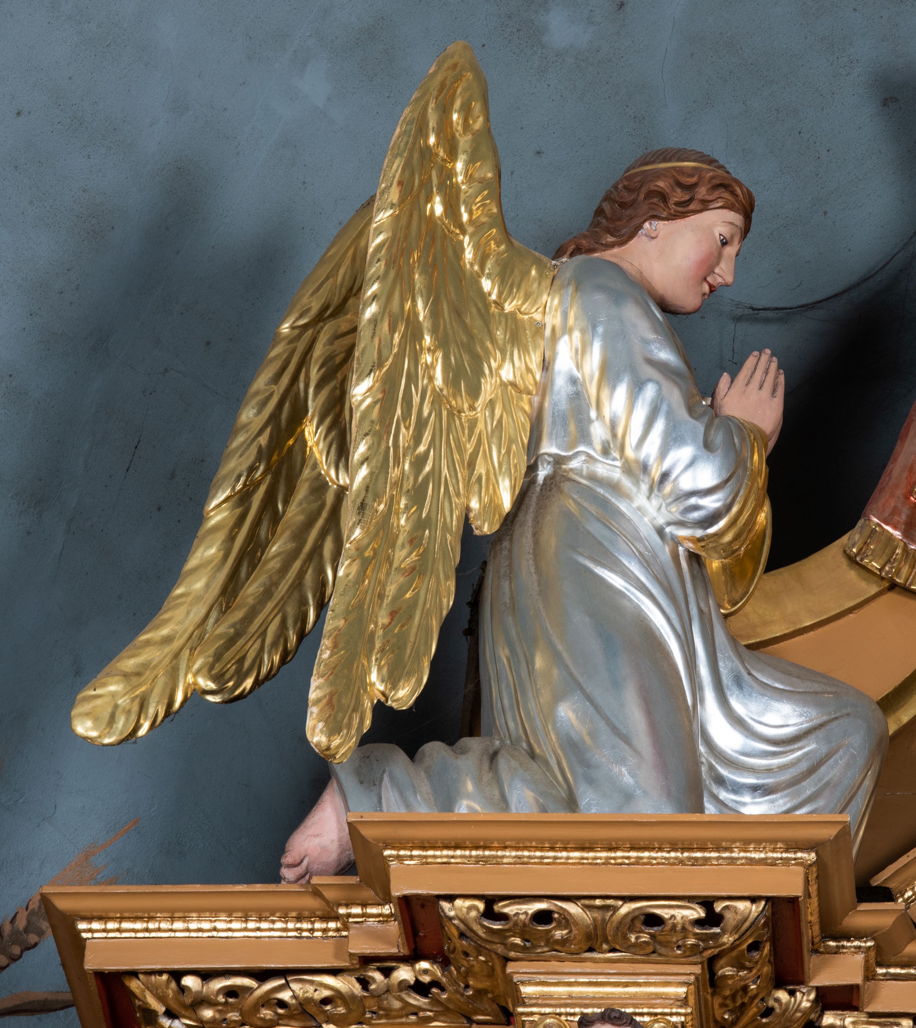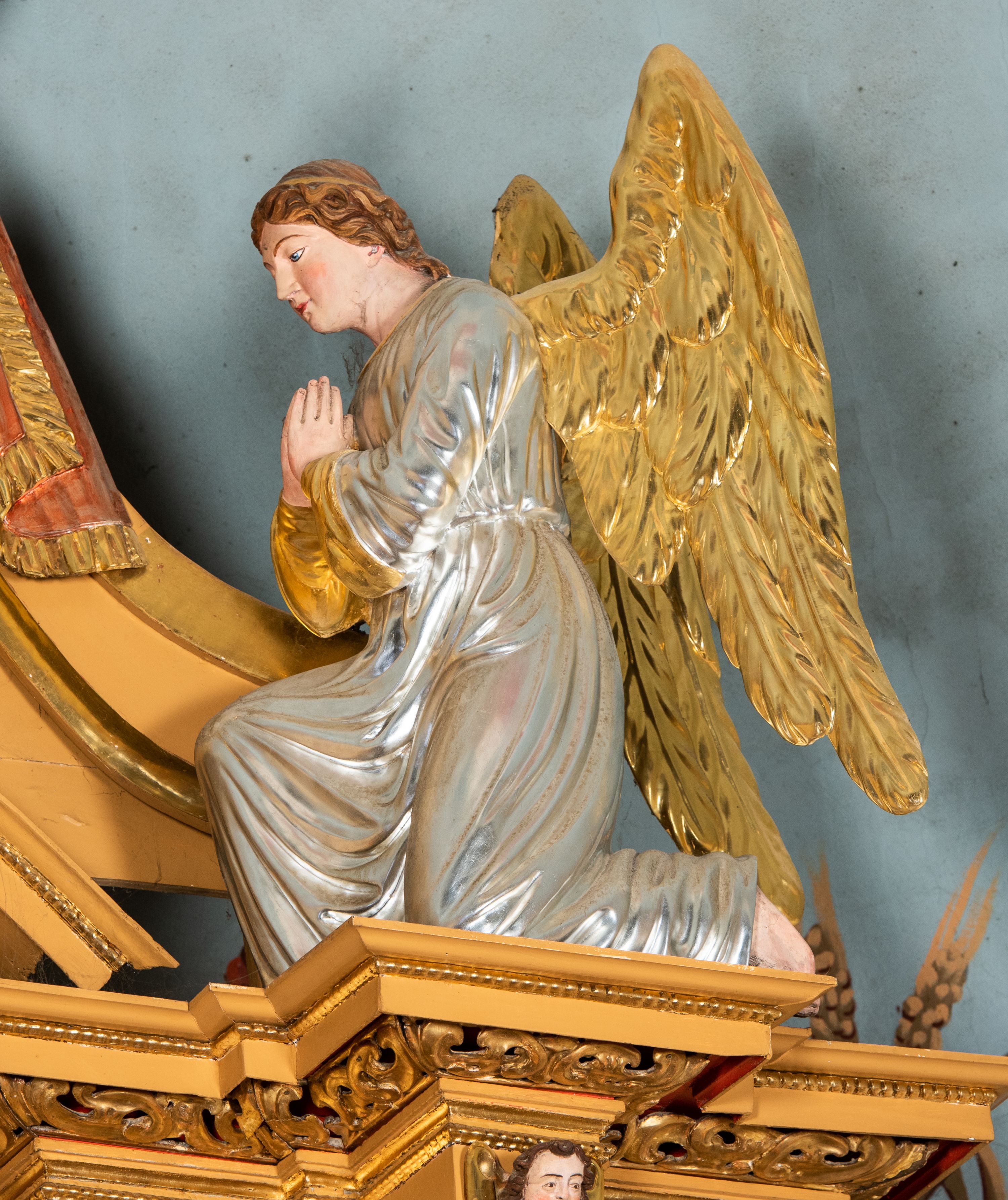 Całość ołtarza oprócz tabernakulum dekorowana jest ornamentem małżowinowo-chrząstkowym. Uszy flankujące kondygnację utworzone są również z ornamentu małżowinowo-chrząstkowego. Na zamknięciu zwieńczenia znajdują się dwie uskrzydlone główki anielskie skierowane na wprost z podwieszonymi u szyi chustami. Struktura ołtarza polichromowana jest w kolorze brązowym ze złoconymi kolumnami, ornamentyką i profilami, detale srebrzone.