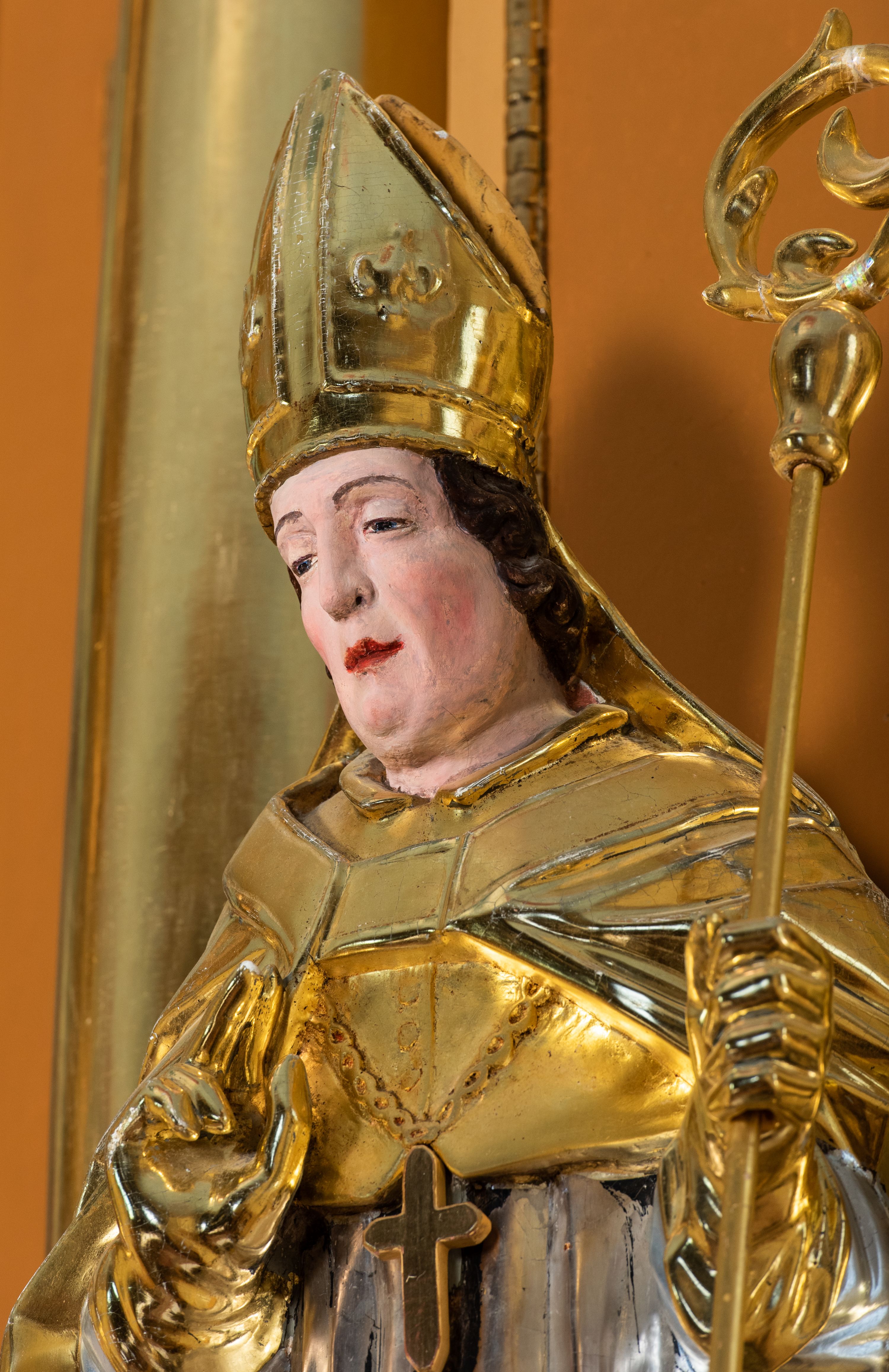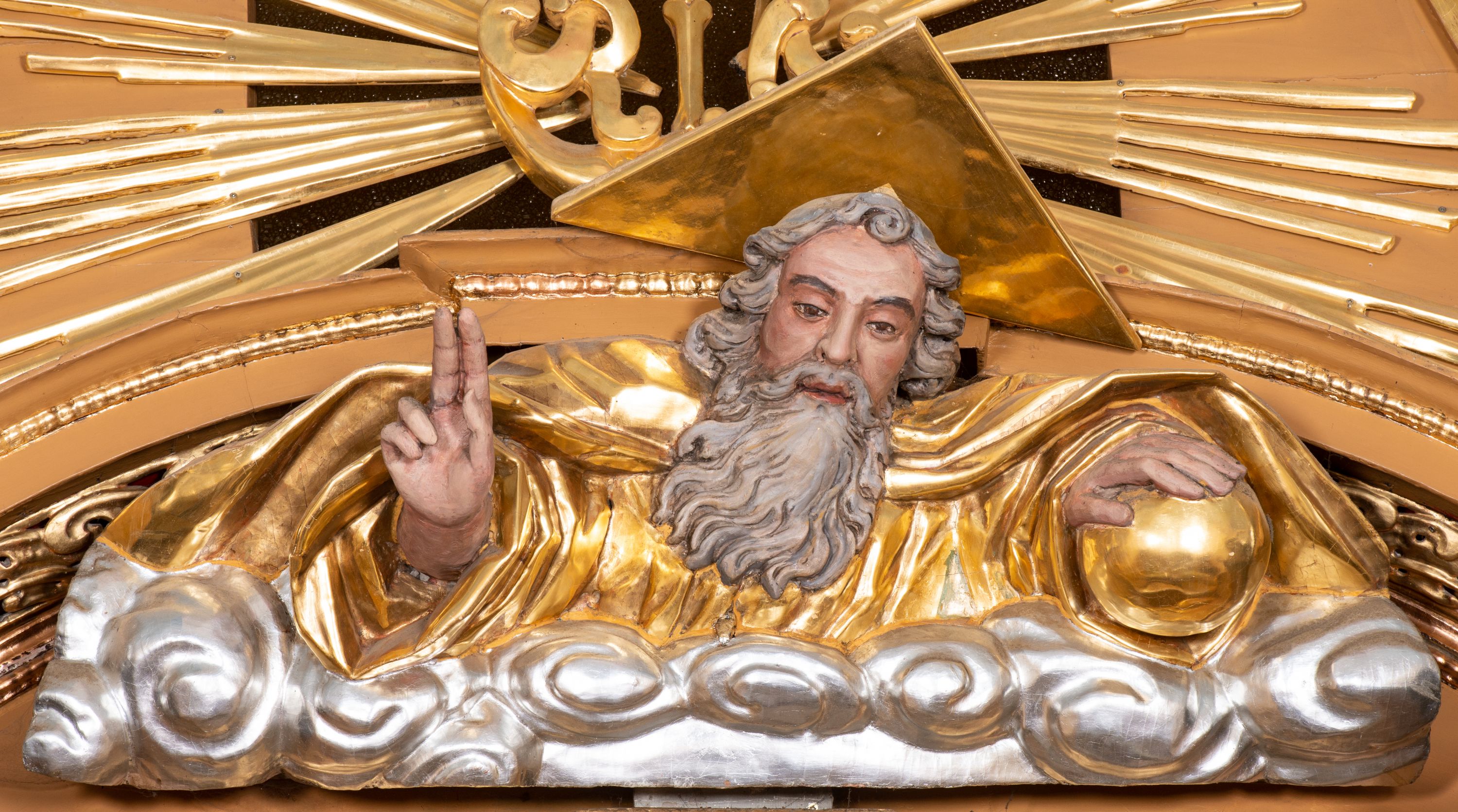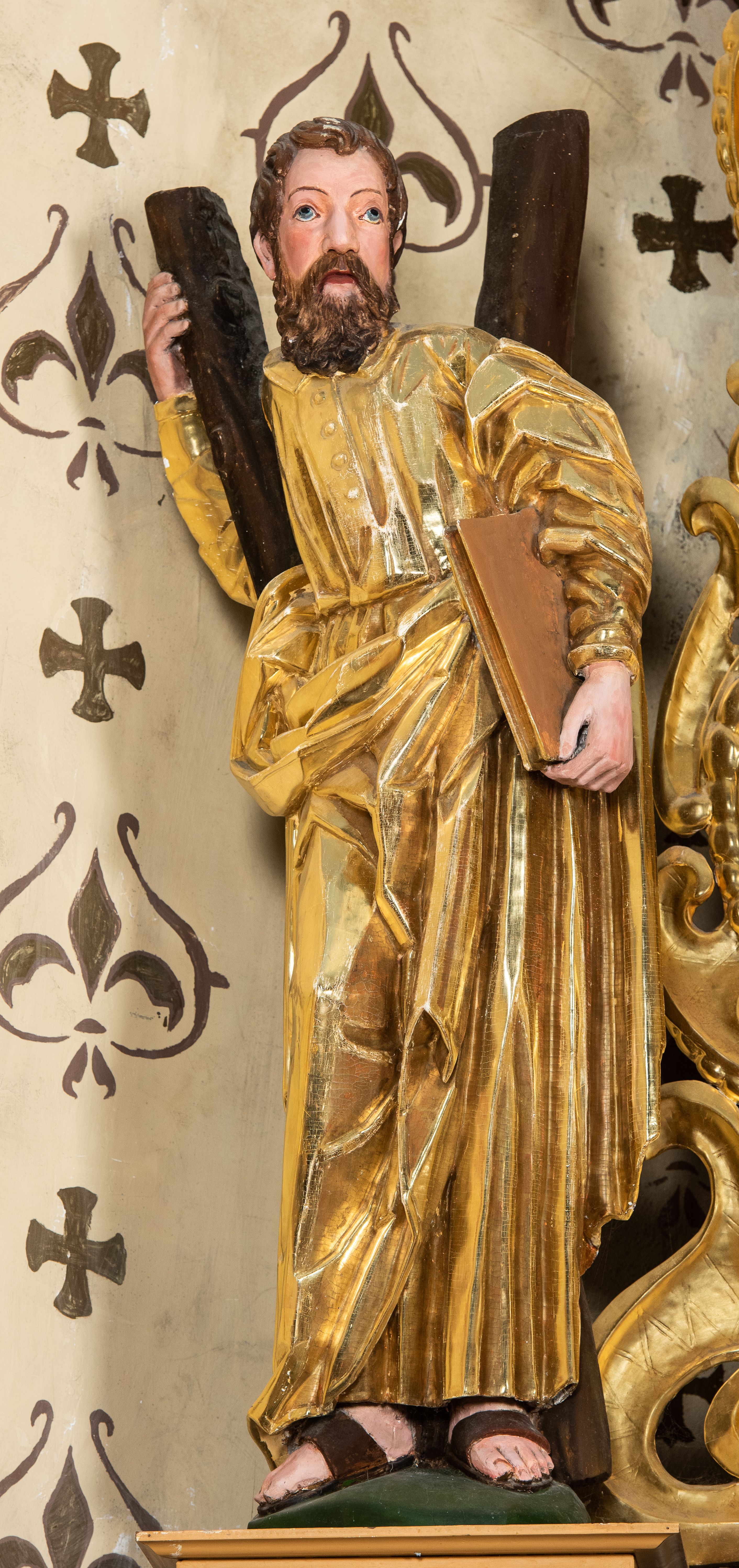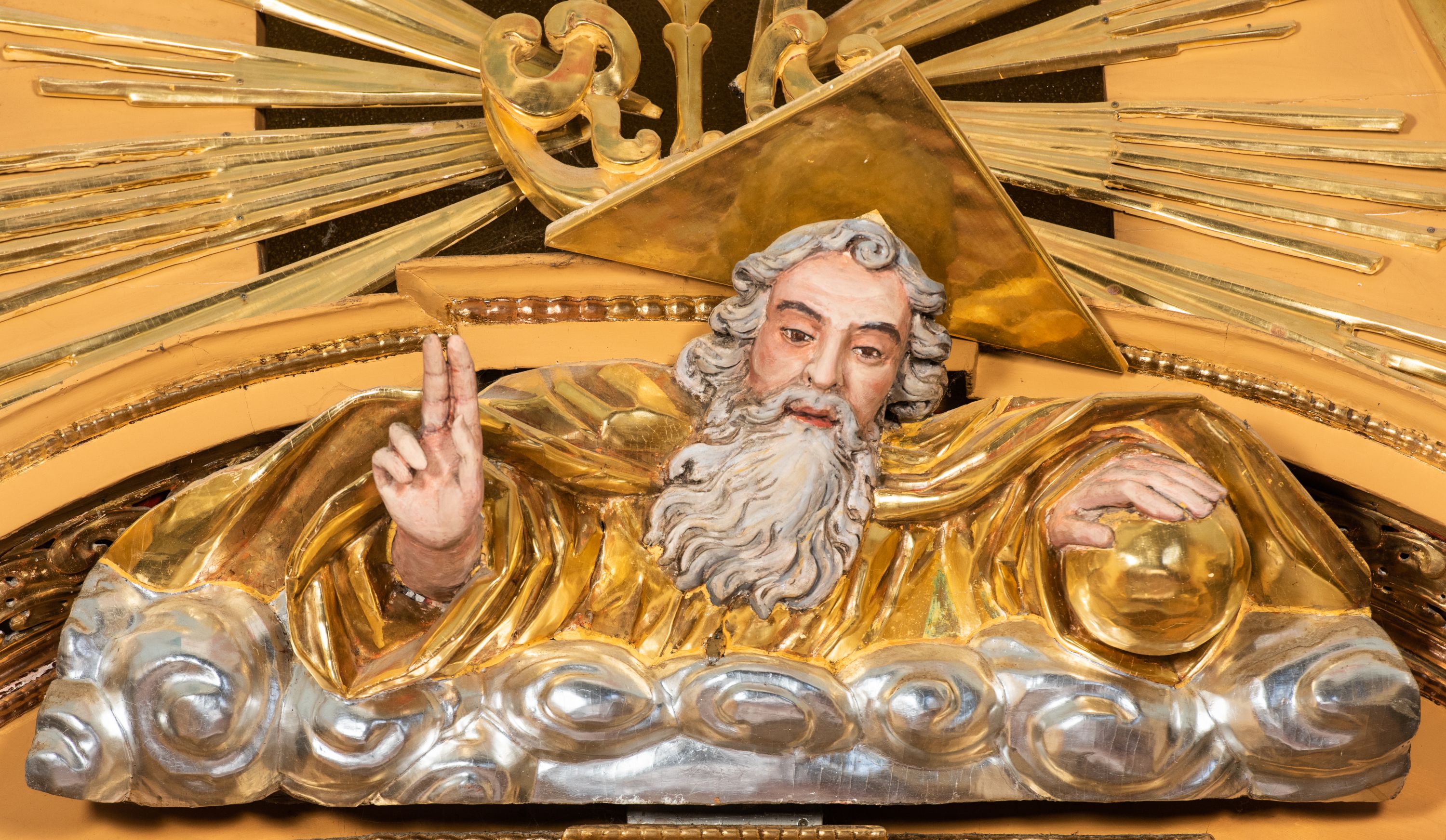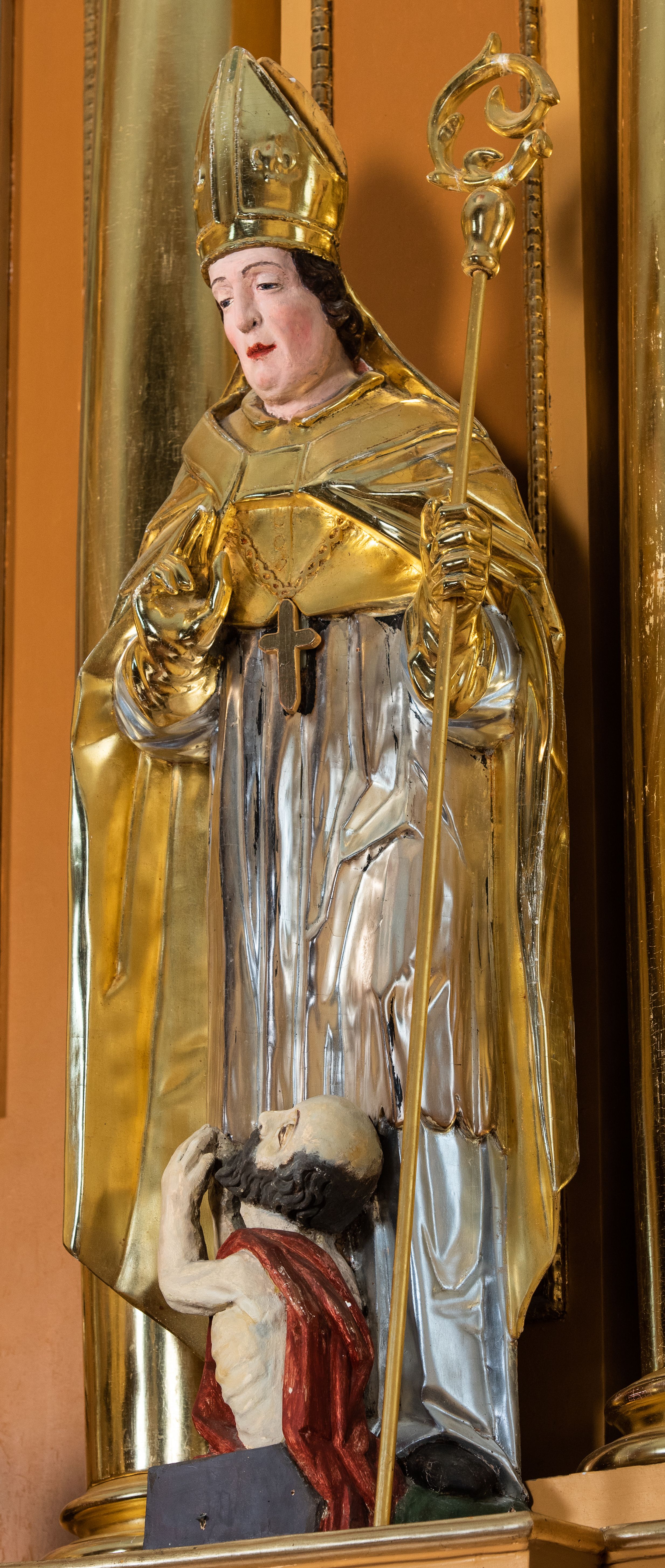 Całość ołtarza oprócz tabernakulum dekorowana jest ornamentem małżowinowo-chrząstkowym. Uszy flankujące kondygnację utworzone są również z ornamentu małżowinowo-chrząstkowego. Na zamknięciu zwieńczenia znajdują się dwie uskrzydlone główki anielskie skierowane na wprost z podwieszonymi u szyi chustami. Struktura ołtarza polichromowana jest w kolorze brązowym ze złoconymi kolumnami, ornamentyką i profilami, detale srebrzone.