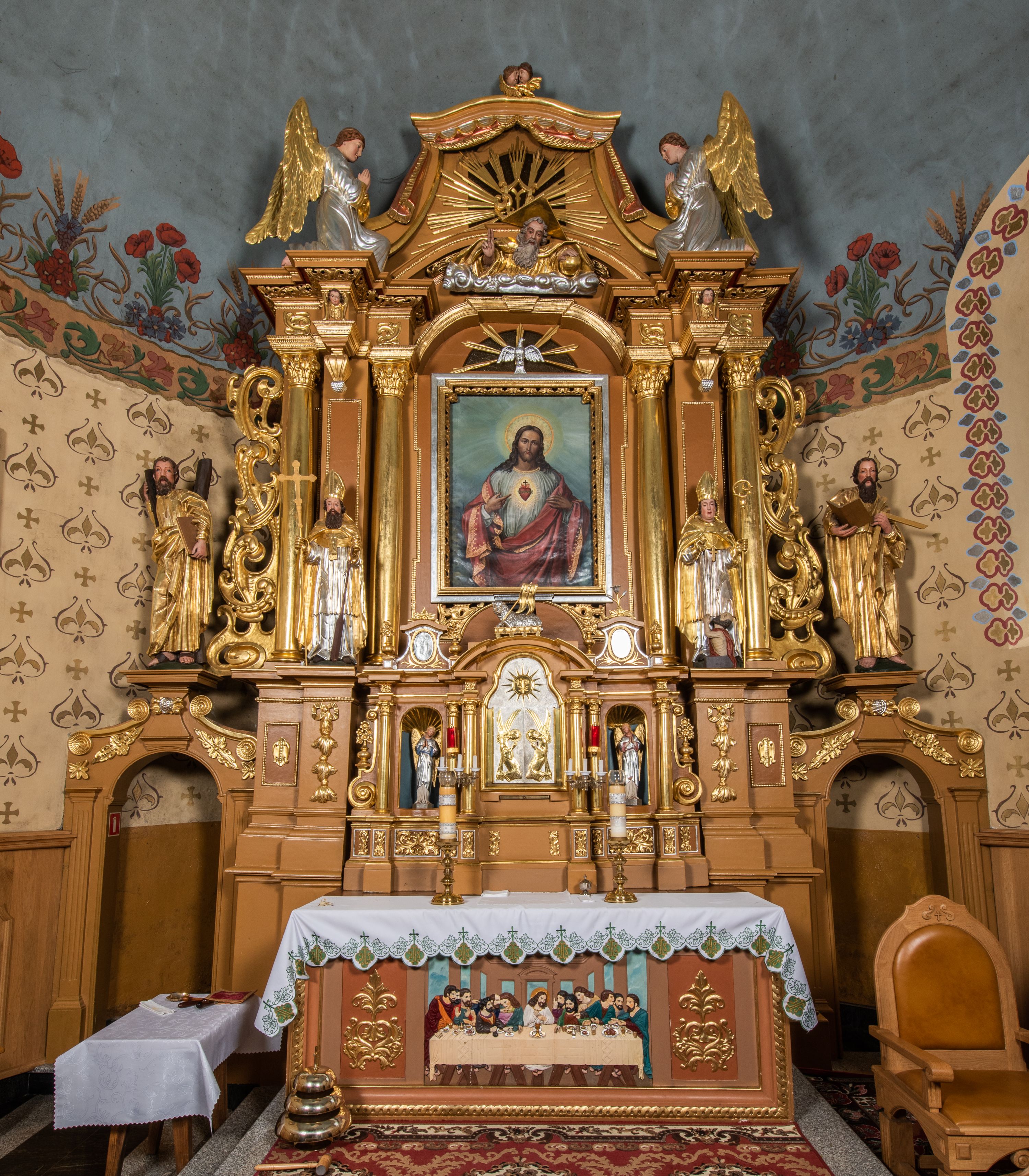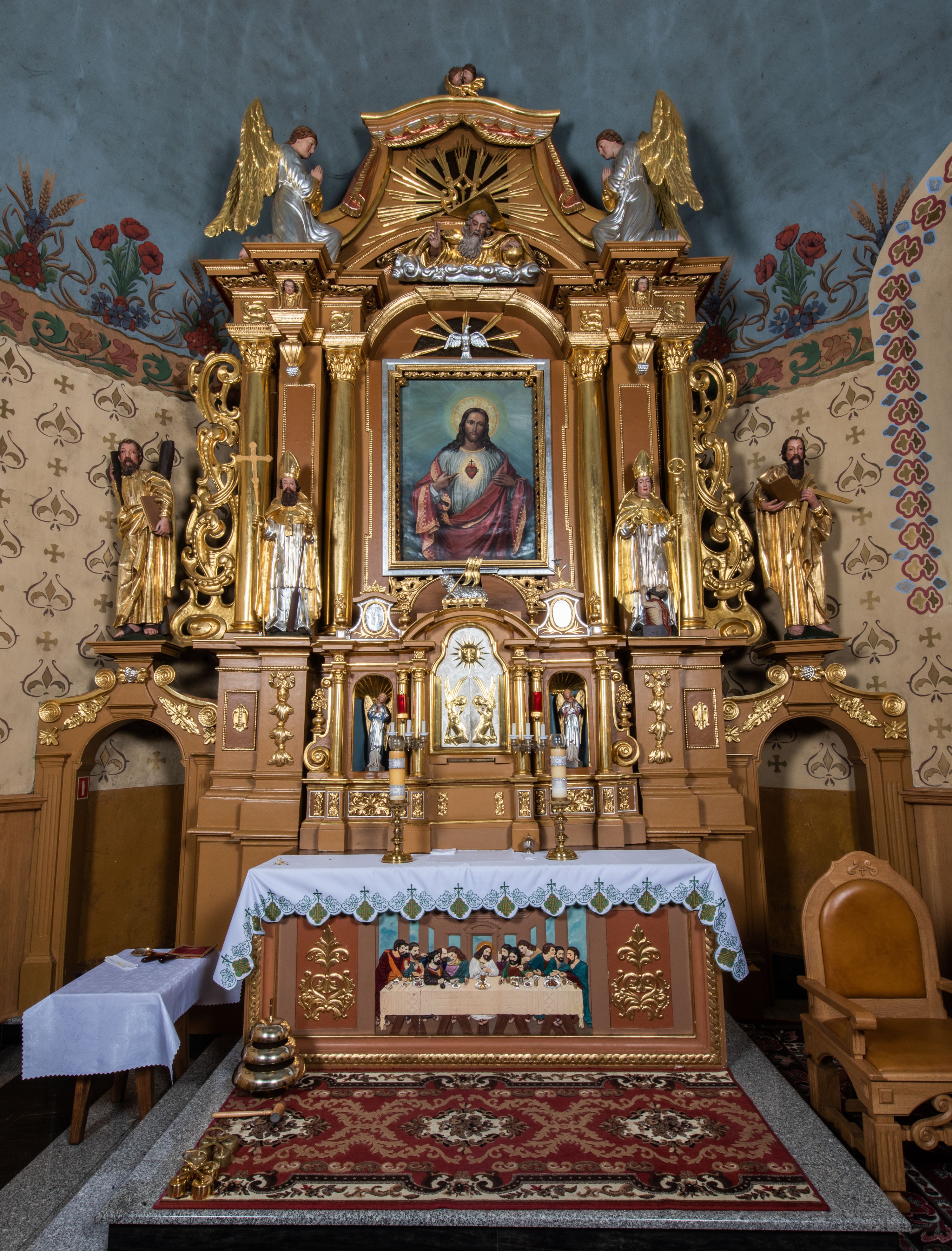 Nastawa ołtarzowa architektoniczna, jednoosiowa, jednokondygnacyjna z bramkami i zwieńczeniem, ustawiona na wysokim, dwustrefowym cokole. Ołtarz prostopadłościenny, murowany, umieszczony w drewnianej obudowie. Antependium ujęte ramą dekorowaną plecionką, podzielone na trzy pola: w środkowym płaskorzeźbione przedstawienie Ostatniej Wieczerzy według Leonarda da Vinci, a po bokach ornament roślinny o wertykalnym układzie.