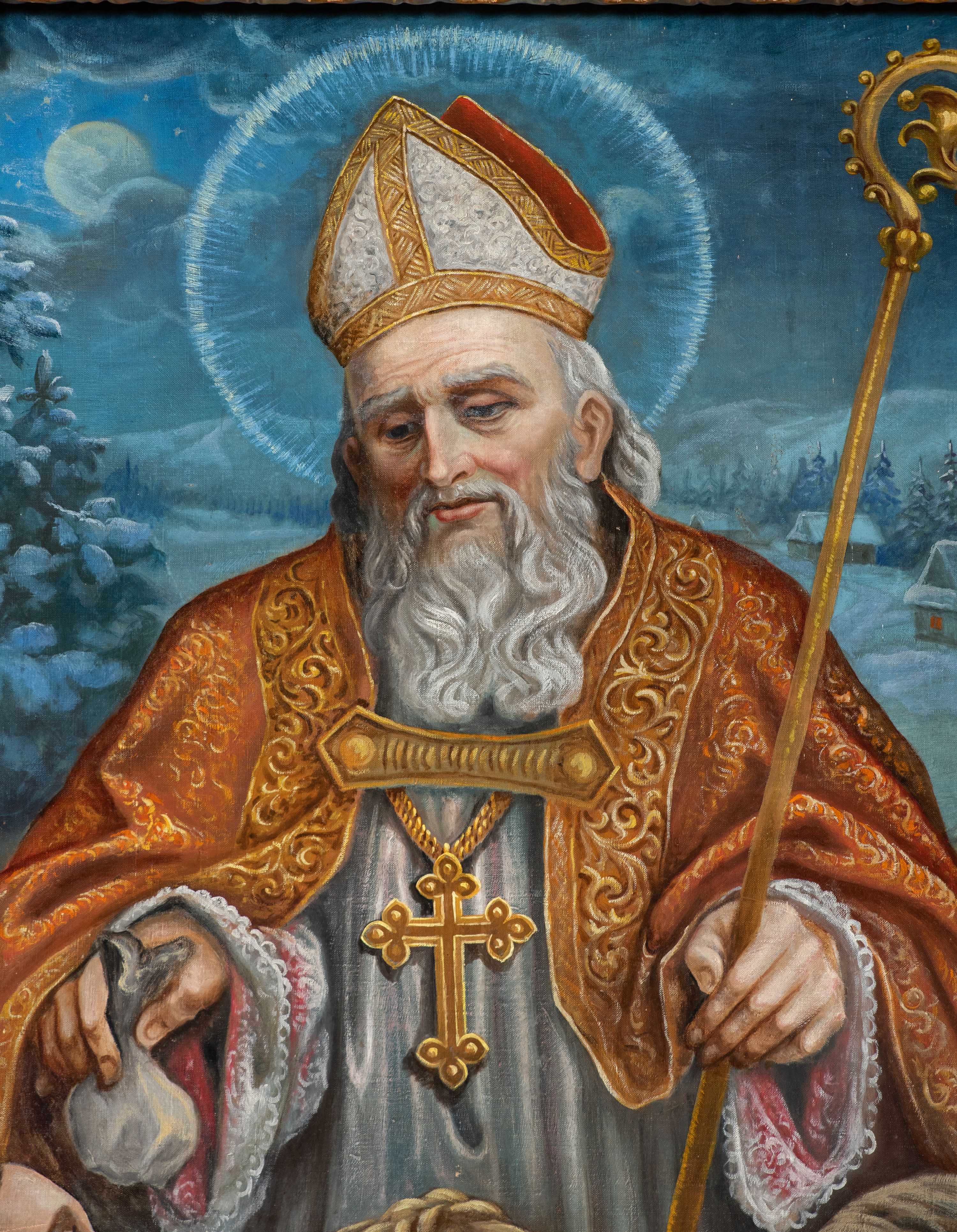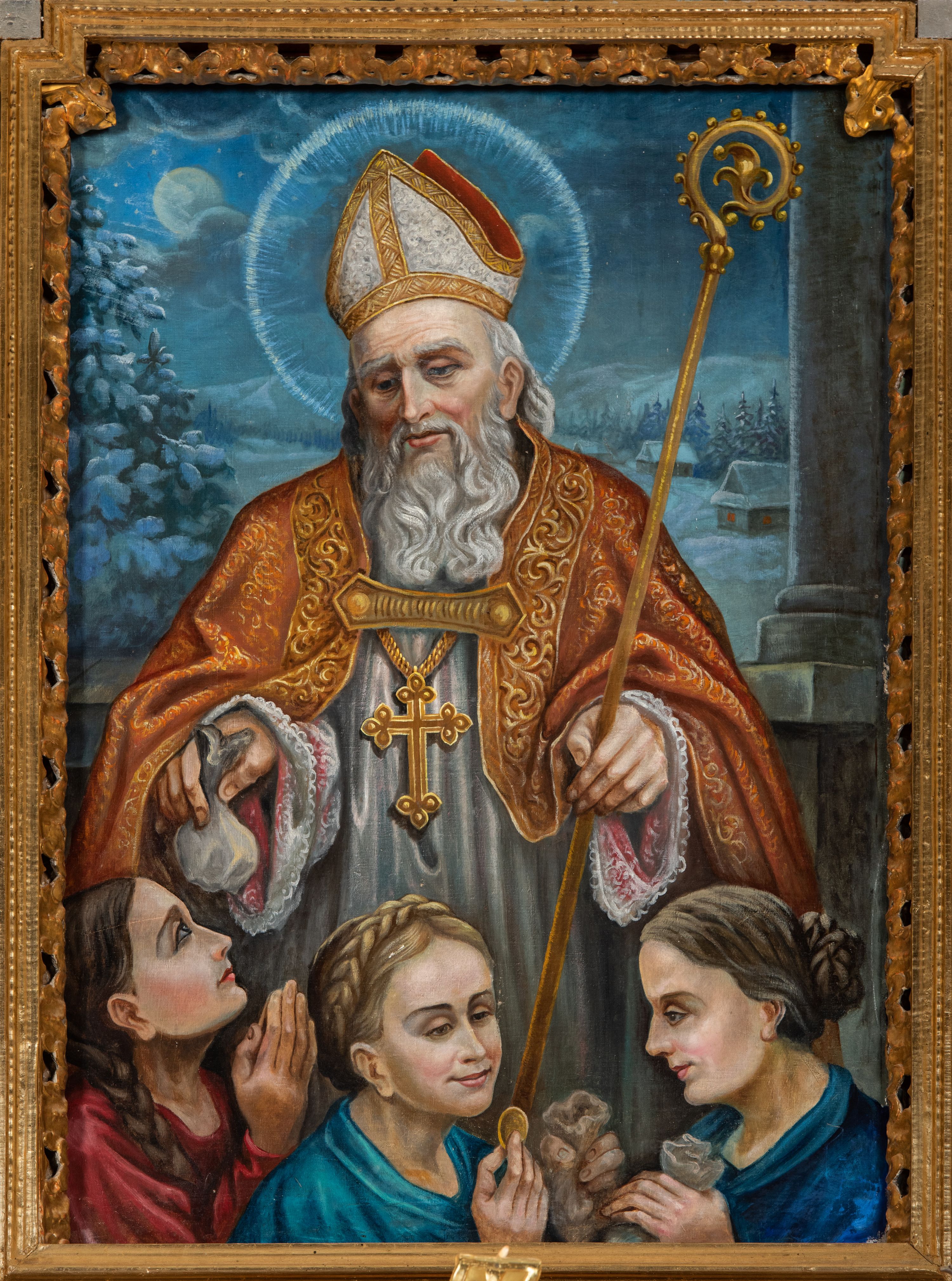 W dotychczasowych badaniach nad wyposażeniem kościoła św. Mikołaja w Sidzinie, wobec braku dokumentów archiwalnych ustalających wykonawców, nie podjęto próby wskazania choćby kręgu potencjalnych autorów nastawy ołtarzowej. Ołtarz wykonano około 1825 roku w stylu klasycystycznym z wykorzystaniem elementów z drugiej lub trzeciej ćwierci XVII wieku. Z poprzedniego kościoła w Sidzinie przeniesiono z pewnością rzeźby świętych biskupów i apostołów, a także uszy ołtarza ozdobione ornamentem małżowinowo-chrząstkowym. Ołtarz reprezentuje typ aediculowy, czyli jednokondygnacyjnej, jednoosiowej struktury ujętej parą podpór dźwigających przerwane belkowanie ze zwieńczeniem. Struktura opiera się na wzorach wykształconych w sztuce nowożytnej. Nastawa jest posadowiona na wysokim cokole z polem głównym flankowanym podporami.