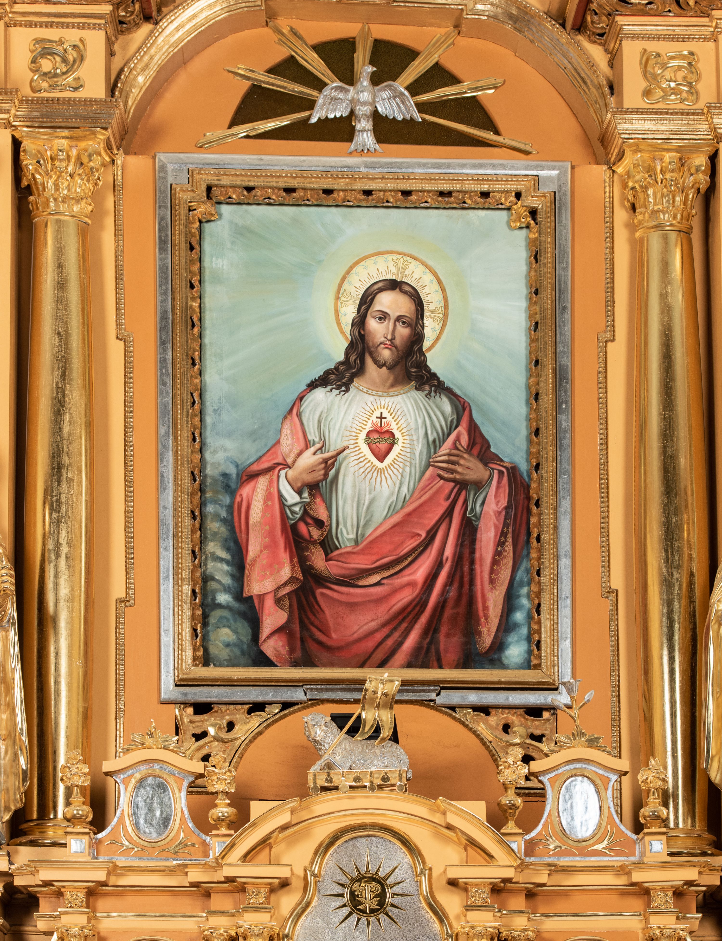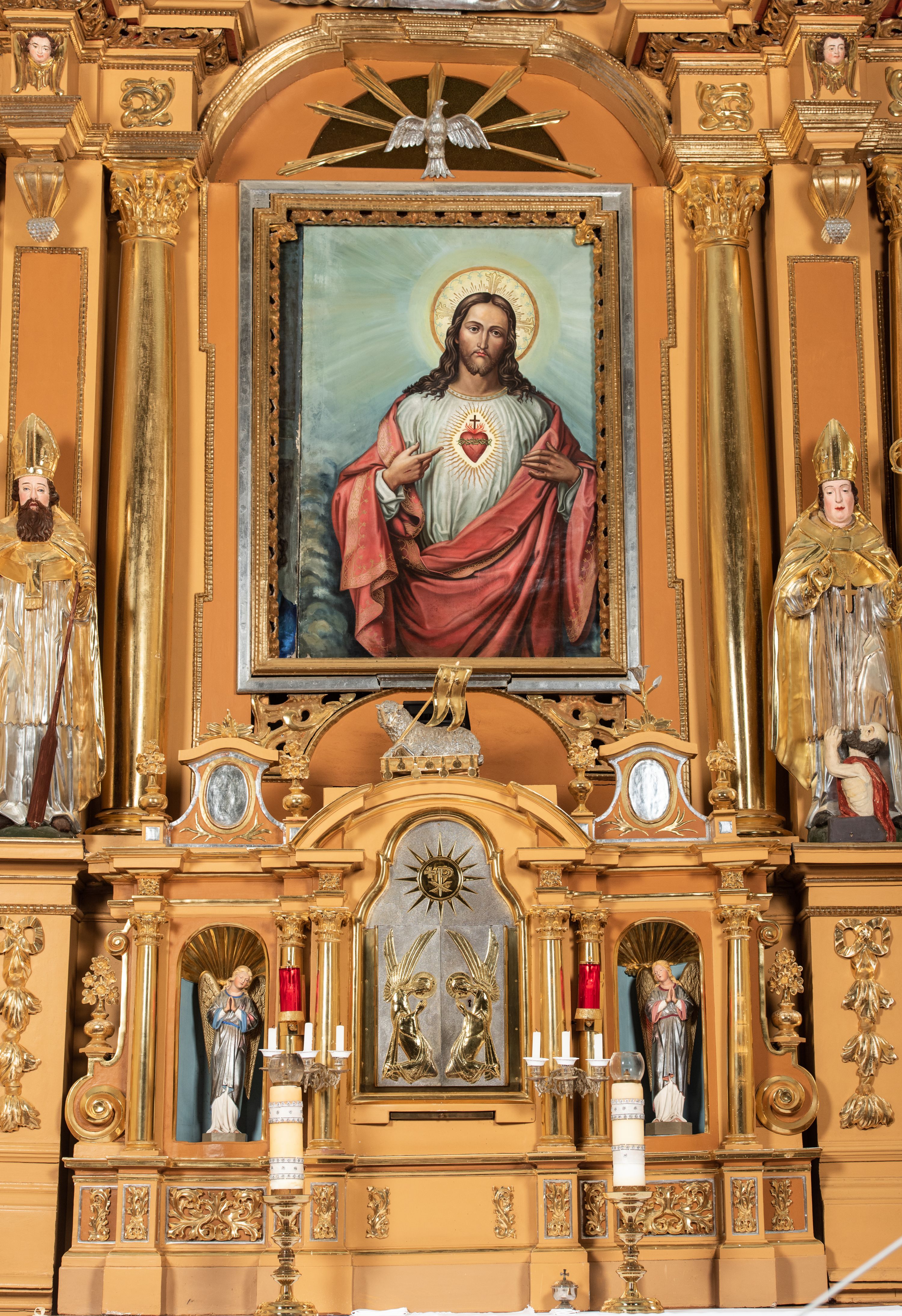 Tabernakulum architektoniczne, jednokondygnacyjne, trójosiowe, ustawione na zdwojonym na cokole z dwoma zwieńczeniami na osiach skrajnych. Osie wydzielone są parami kolumn o kapitelach kompozytowych, oś środkowa wysunięta do przodu. Podpory dźwigają pełne belkowanie wyłamane na ich linii, przerwane nad polem środkowym, gdzie kolumny dźwigają przerwany półkolisty przyczółek połączony z łukiem gzymsu, nad nim ustawiona jest rzeźba Baranka leżącego na księdze z siedmioma pieczęciami. W polu środkowym dwuskrzydłowe drzwiczki do metalowego tabernakulum ujęte ramą w formie stojącego prostokąta, zamkniętego łukiem nadwieszonym z długim uskokiem. Na drzwiczkach znajdują się dwa aplikowane klęczące anioły, powyżej Chrismo w medalionie, otoczonym glorią. W osiach bocznych są nisze zamknięte konchami z figurkami aniołów, zamknięte zwieńczeniami w formie stojących prostokątów z falistym gzymsem i gałązkami lilii na szczycie; w polu srebrzone, owalne medaliony. Po bokach kondygnacji na wolutowych uszach oraz po bokach zwieńczeń znajdują się wazony ze słonecznikami. Cokół zdobiony jest ornamentem akantowym.
