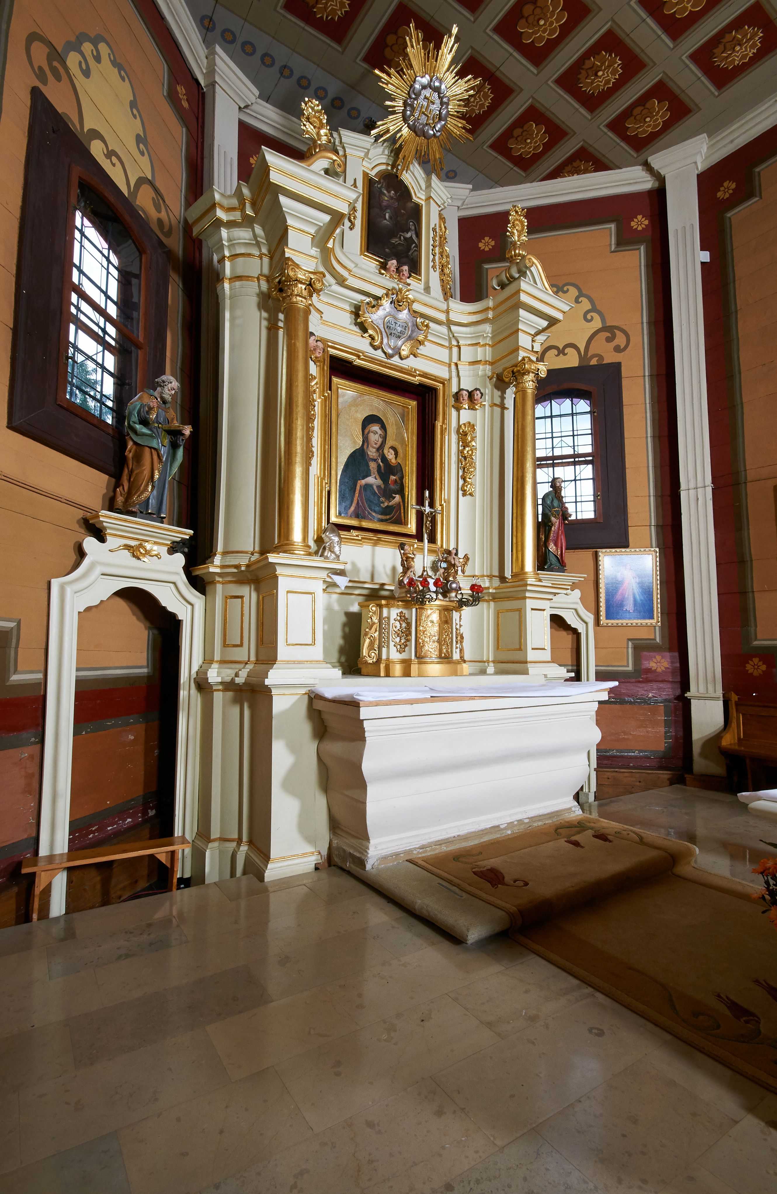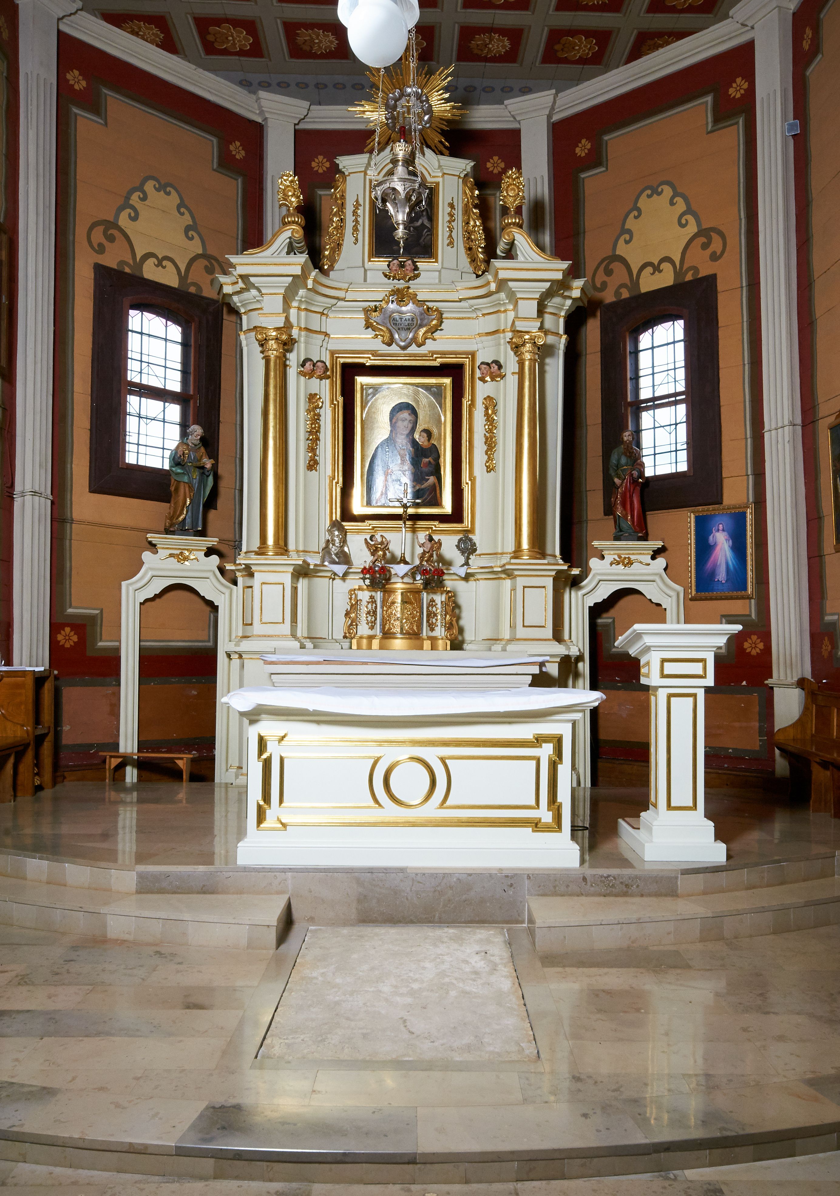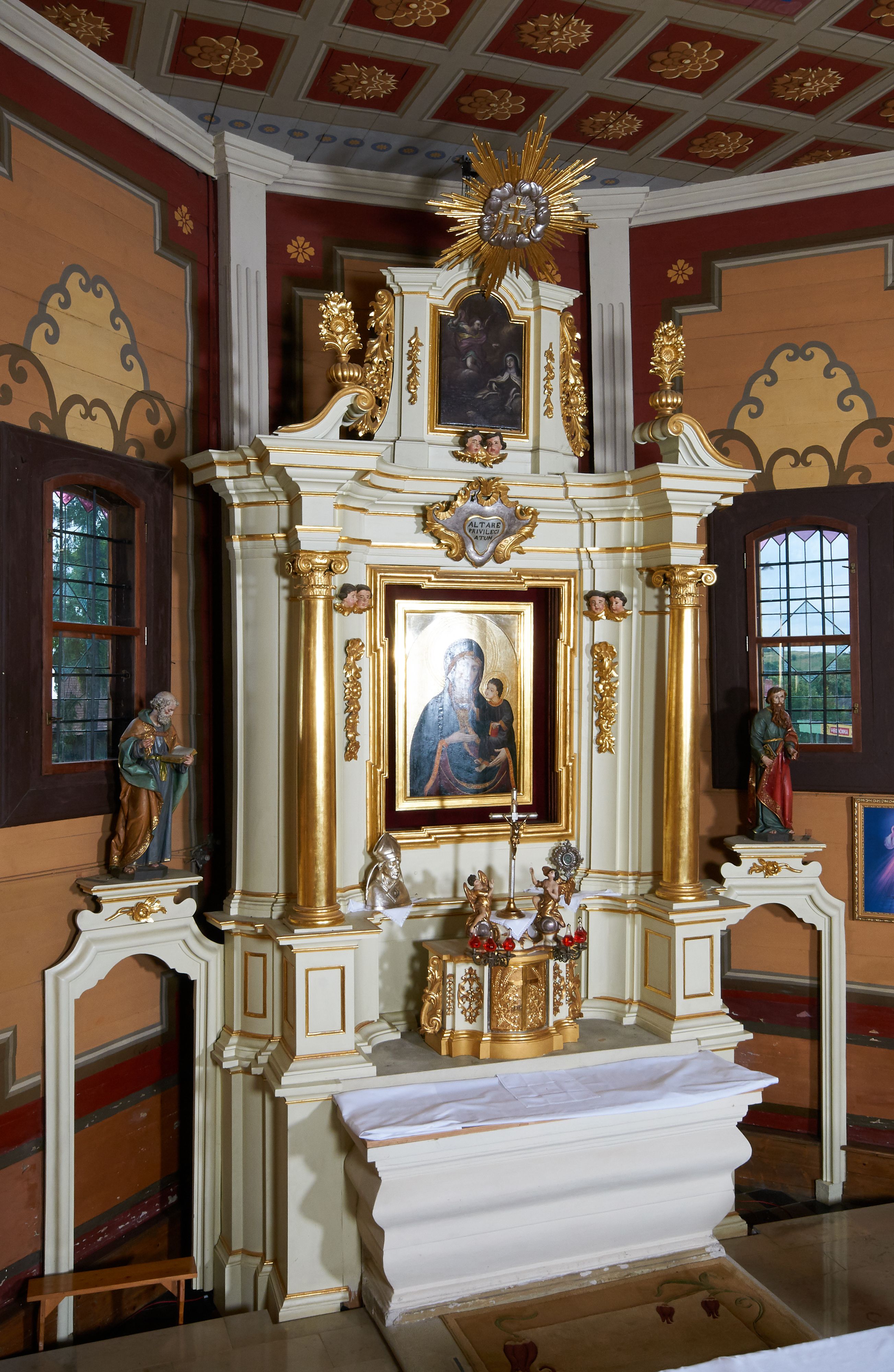 Ołtarz główny powstał zapewne podczas jednej z osiemnastowiecznych renowacji świątyni. Prawdopodobnie rozpoczęty w 1781 roku remont trwał kilka lat, bowiem jeszcze podczas wizytacji w 1783 roku nie podjęto się opisu kościoła i jego wyposażenia ze względu na trwające prace. Wtedy zapewne kościół uzyskał obecny, rokokowy wystrój: trzy ołtarze oraz ambonę. W polu głównym umieszczony jest obraz Matki Boskiej Piekarskiej, na zasuwach obrazy „Koronacja Matki Boskiej” oraz „Św. Mikołaj”, a w zwieńczeniu, obraz przedstawiający Ekstazę św. Teresy.
